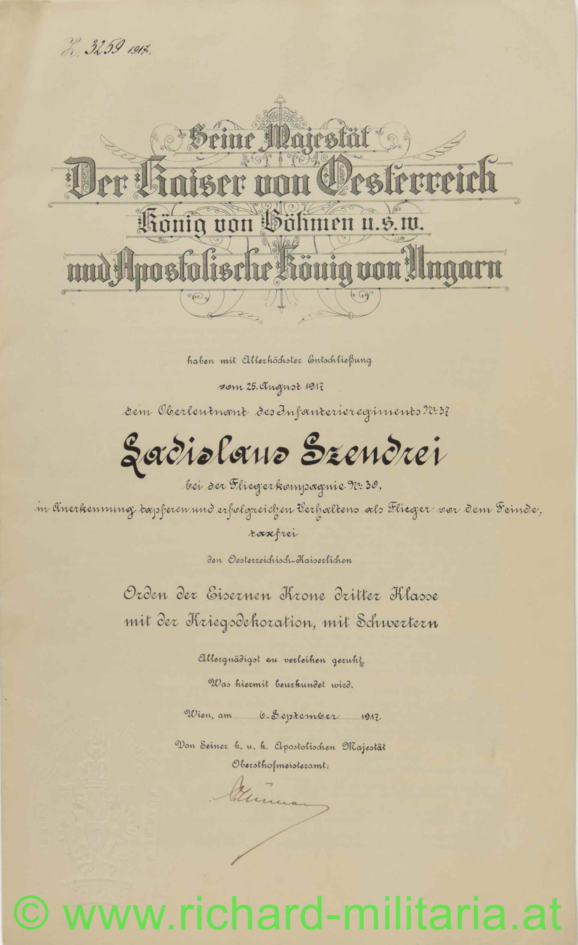 Urkunde - Orden der Eisernen Krone 3. Klasse - Olt. Szendrei Fliegerkomp.- No. 30