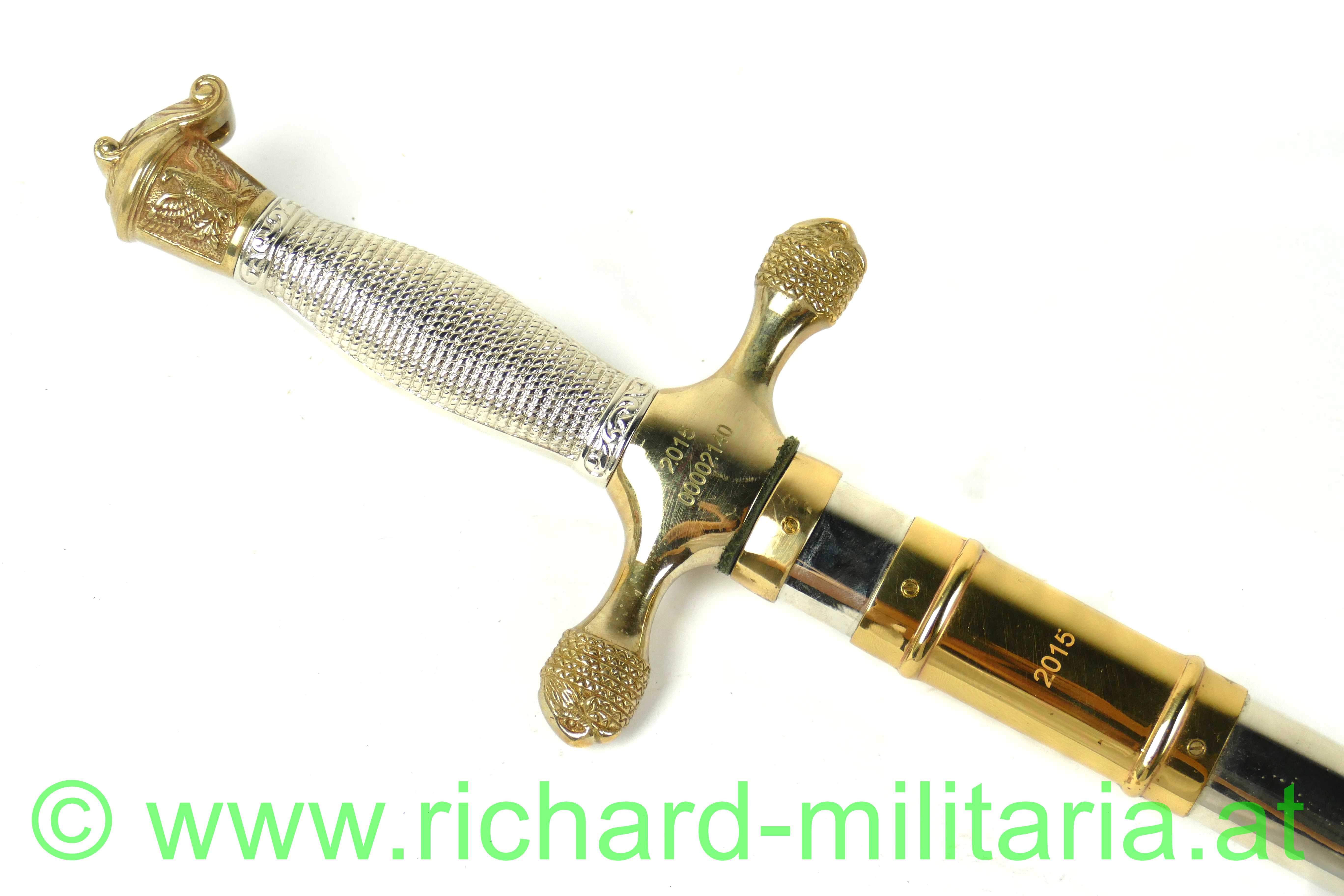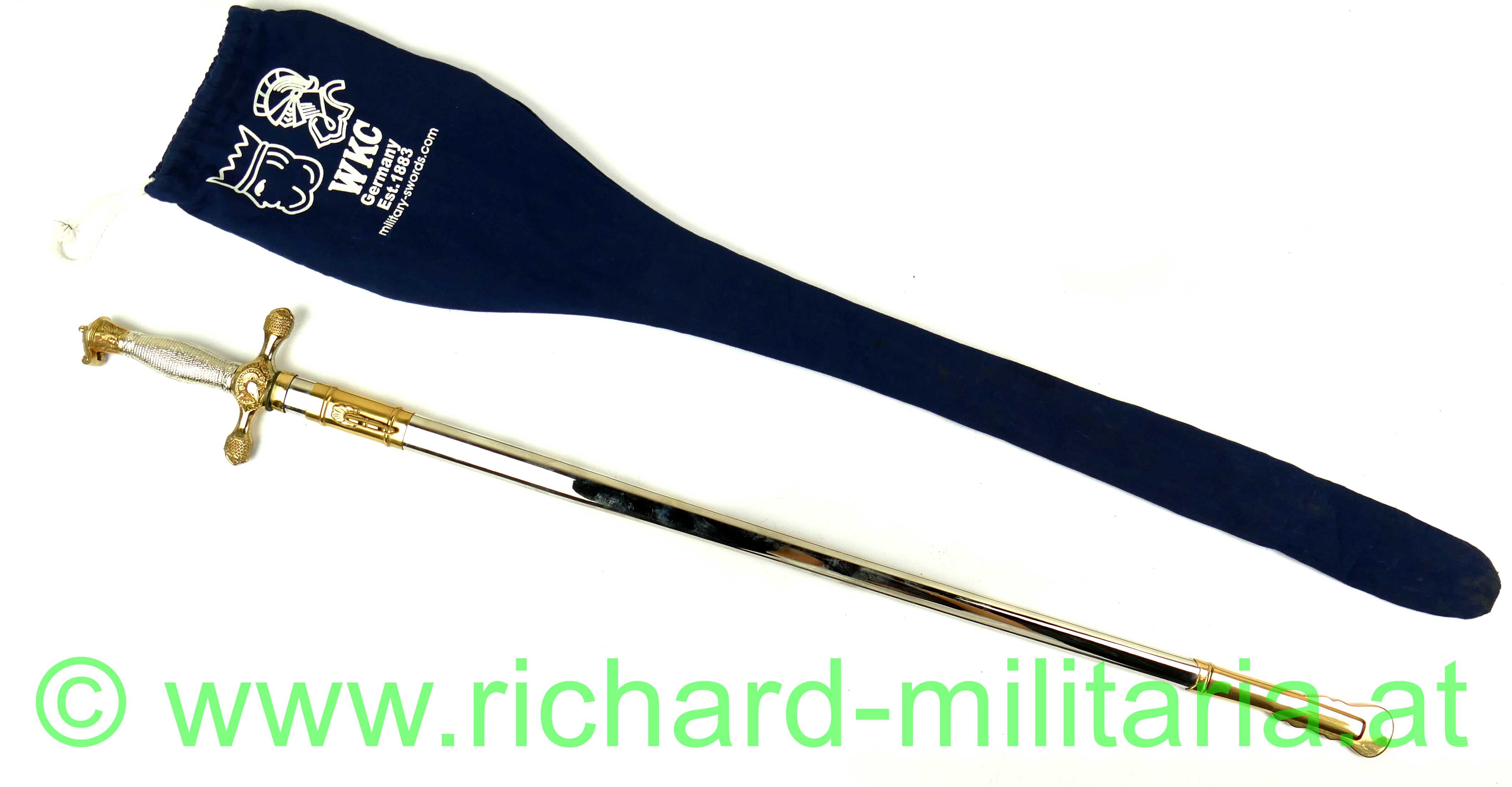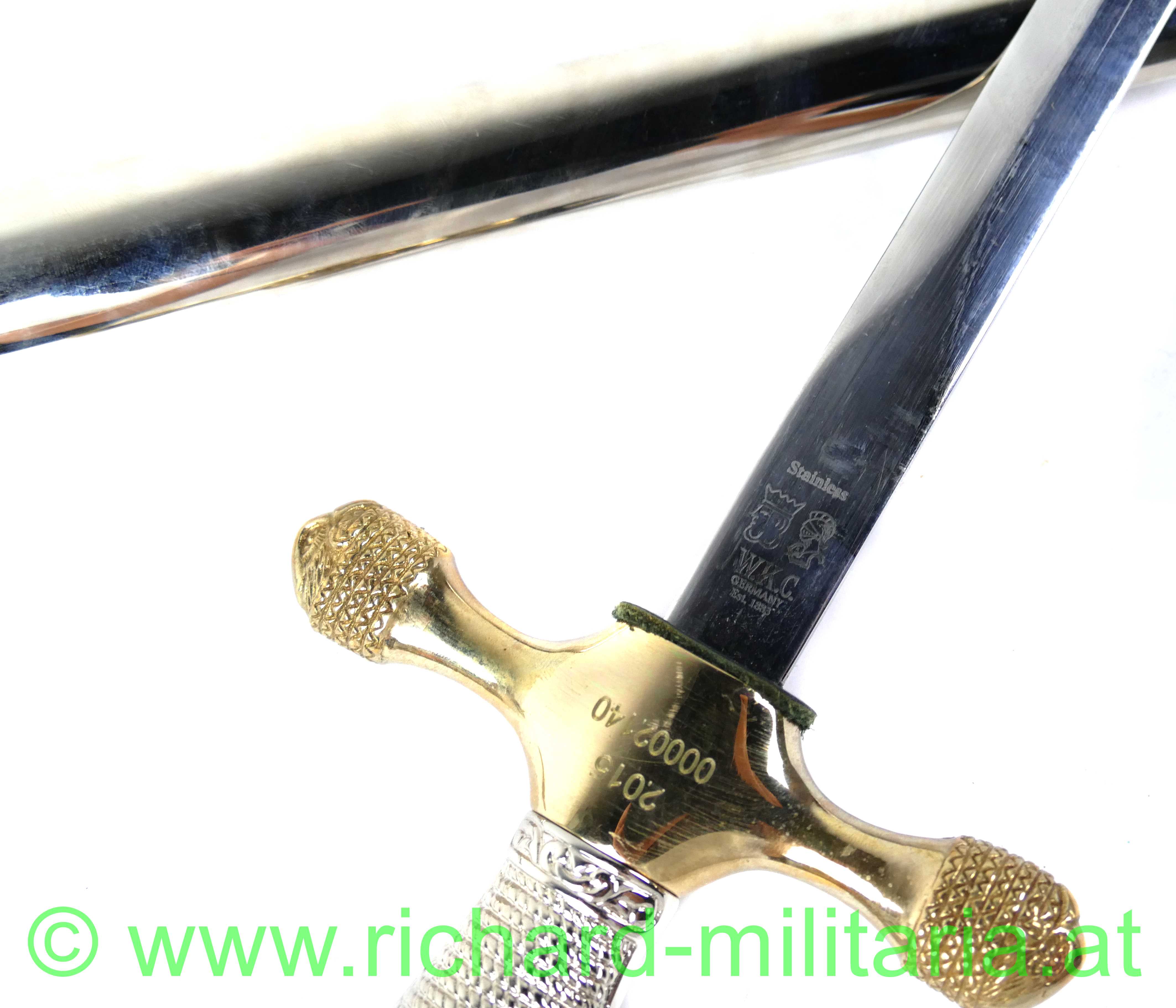USA - Kadettendegen, Hersteller auf der Klinge: "WKC Solingen - Stainless"; Rostfreie Edelstahlklinge mit Dachschliff poliert - beidseitig mit Ätzgravur versehen, auf der Terzseite: " U.S.M.A"; Beschläge Messing vergoldet auf der Rückseite graviert: "2015 - 00002140"; Griff aus Messing vernickelt; Scheide vernickelt mit vergoldeten Messingbeschlägen versehen, Mundstück mit Tragehaken; mit Aufbewahrungsfutteral;