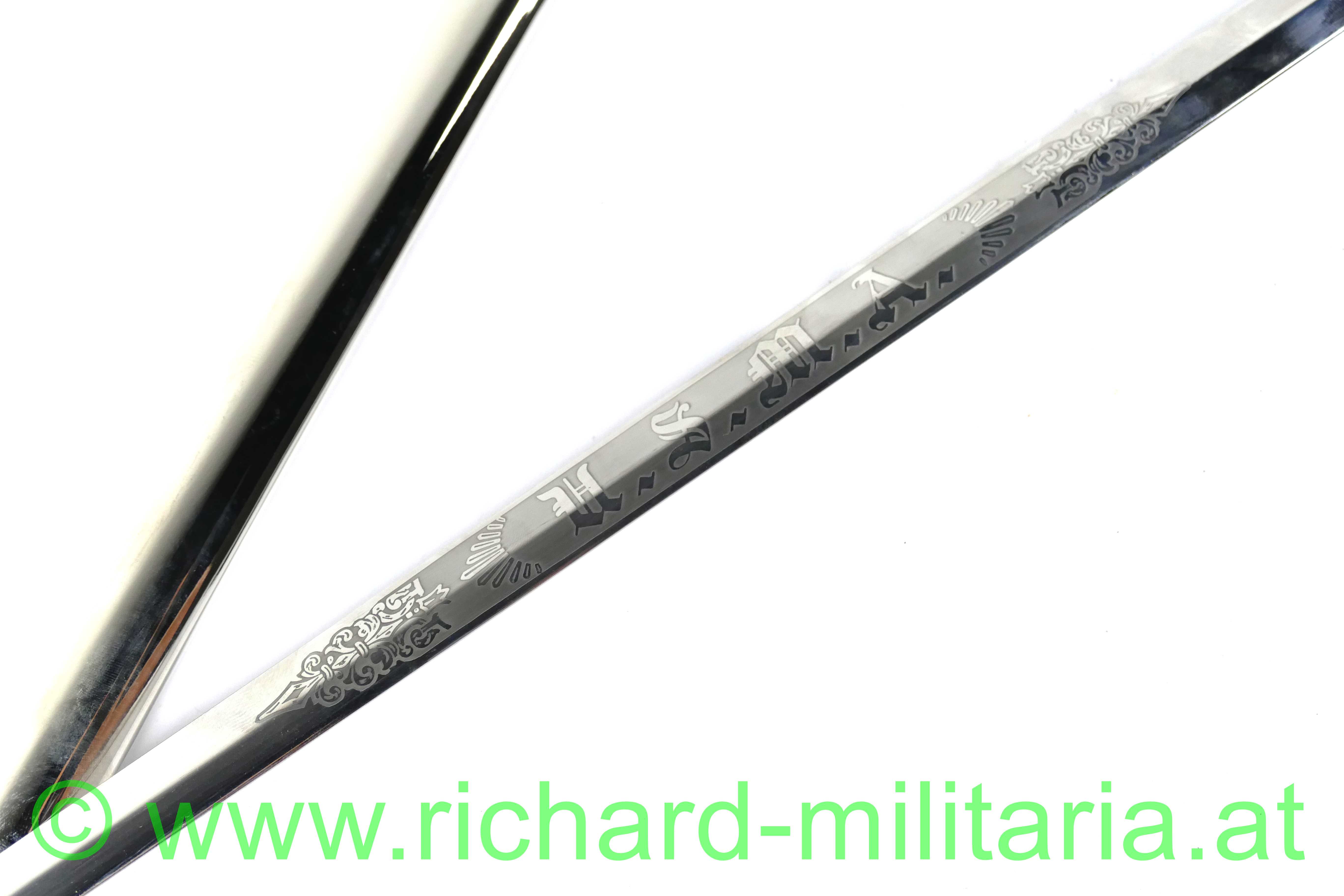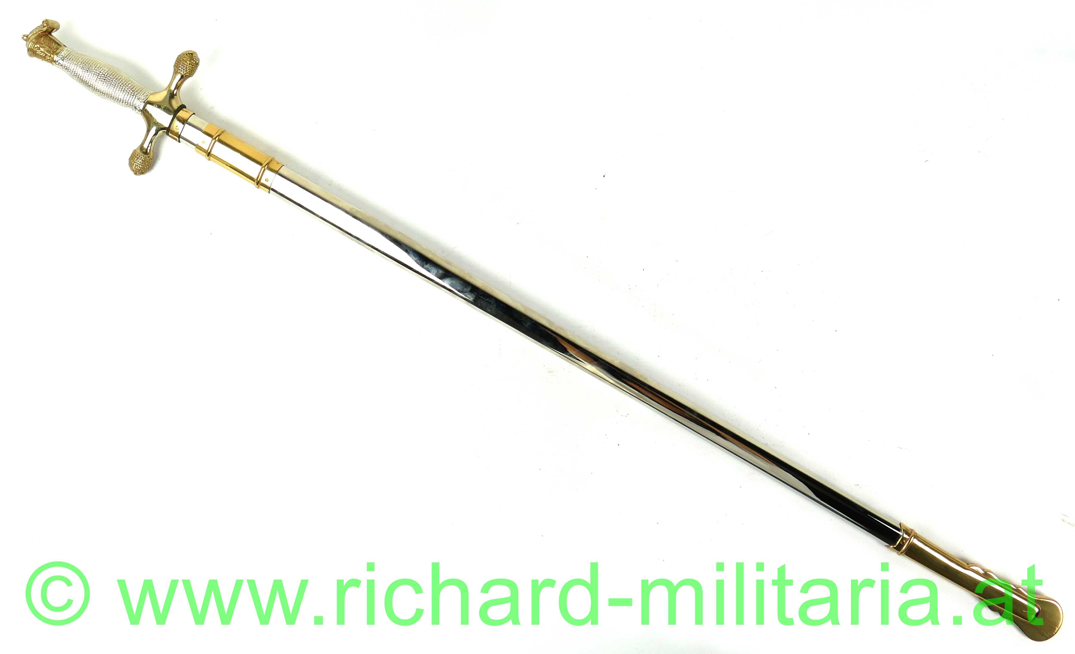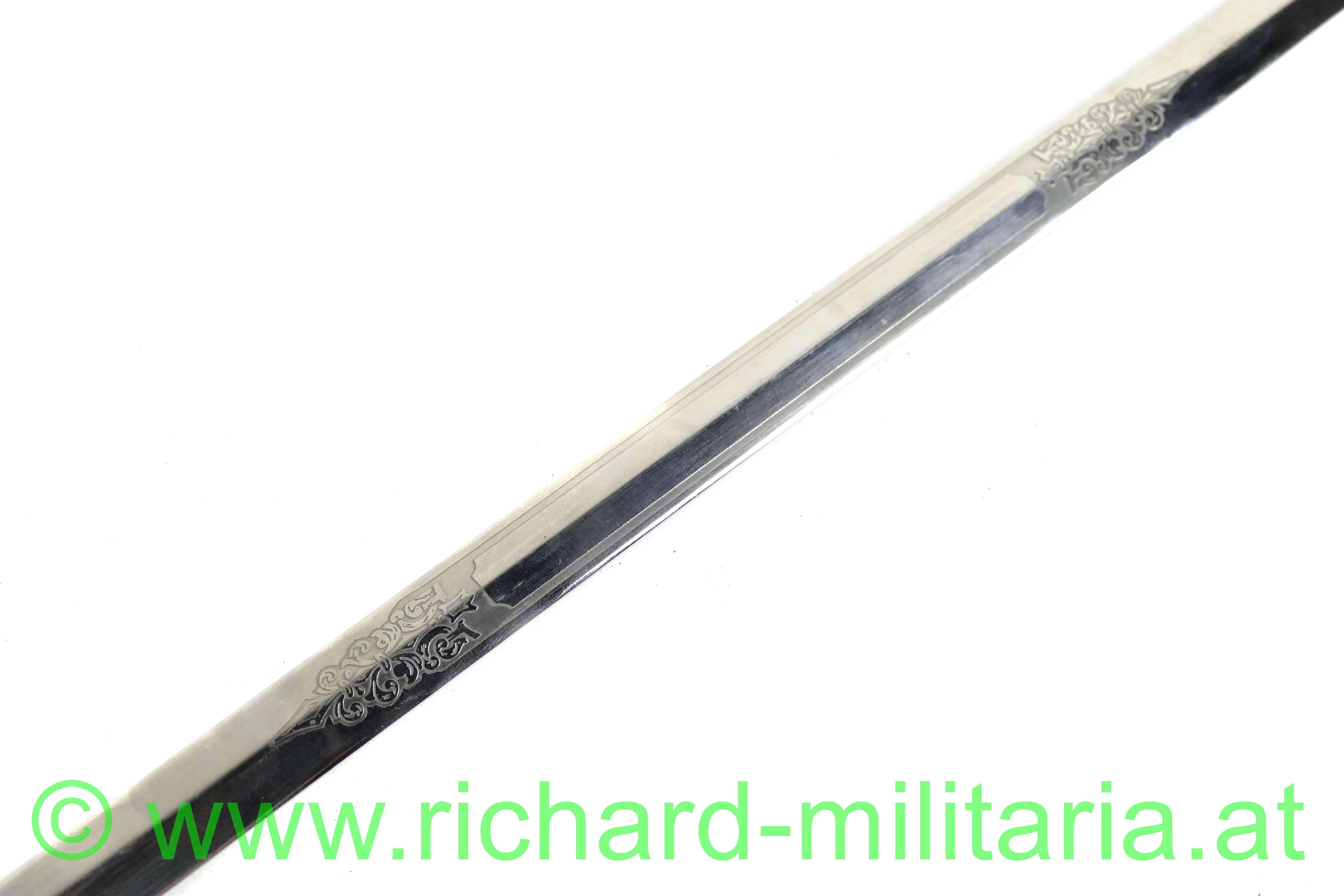 USA - Kadettendegen, Hersteller auf der Klinge: "WKC Solingen - Stainless"; Rostfreie Edelstahlklinge mit Dachschliff poliert - beidseitig mit Ätzgravur versehen, auf der Terzseite: " U.S.M.A"; Beschläge Messing vergoldet auf der Rückseite graviert: "2015 - 00002140"; Griff aus Messing vernickelt; Scheide vernickelt mit vergoldeten Messingbeschlägen versehen, Mundstück mit Tragehaken; mit Aufbewahrungsfutteral;