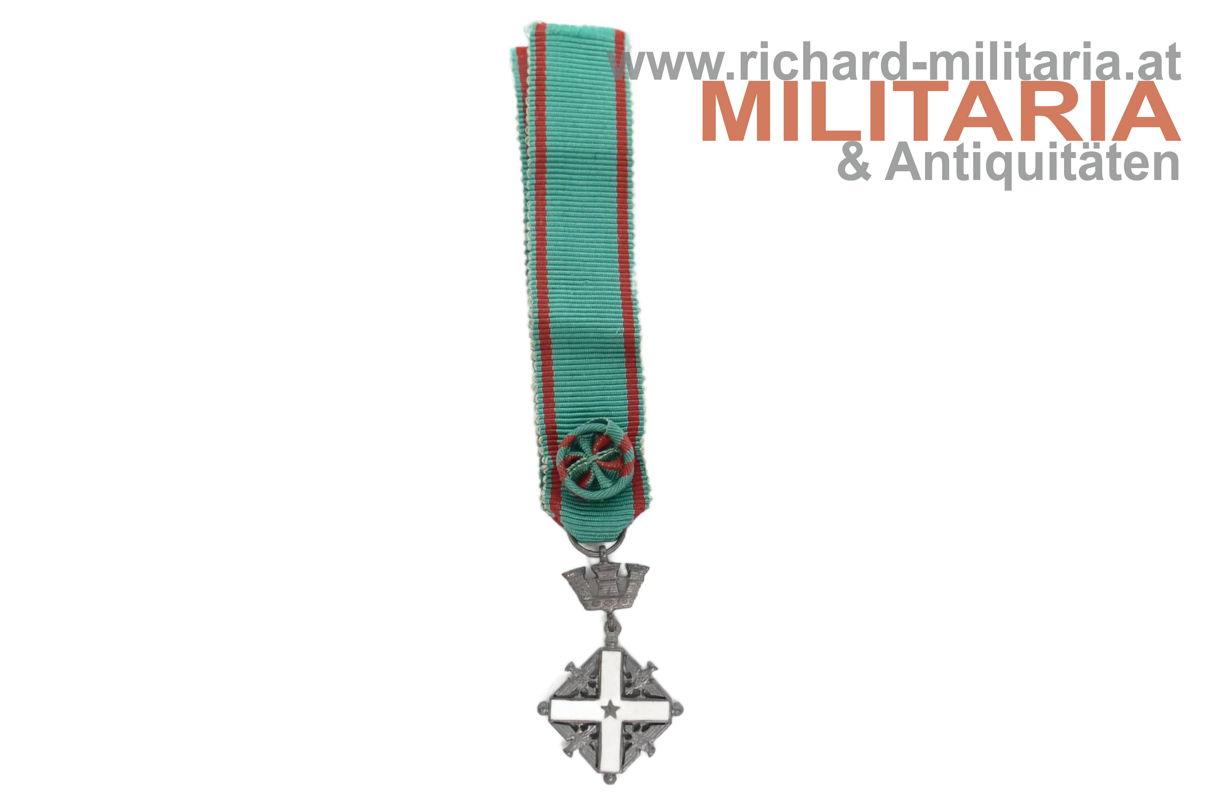 Verdienstorden der Republik Italien - Offizierskreuz im Etui; ältere Fertigung; Silber vergoldet und emailliert; Vergoldung großteils vergangen; zugehörige Miniatur und Rosette beiliegend; passendes Etui mit Hersteller im Deckel;