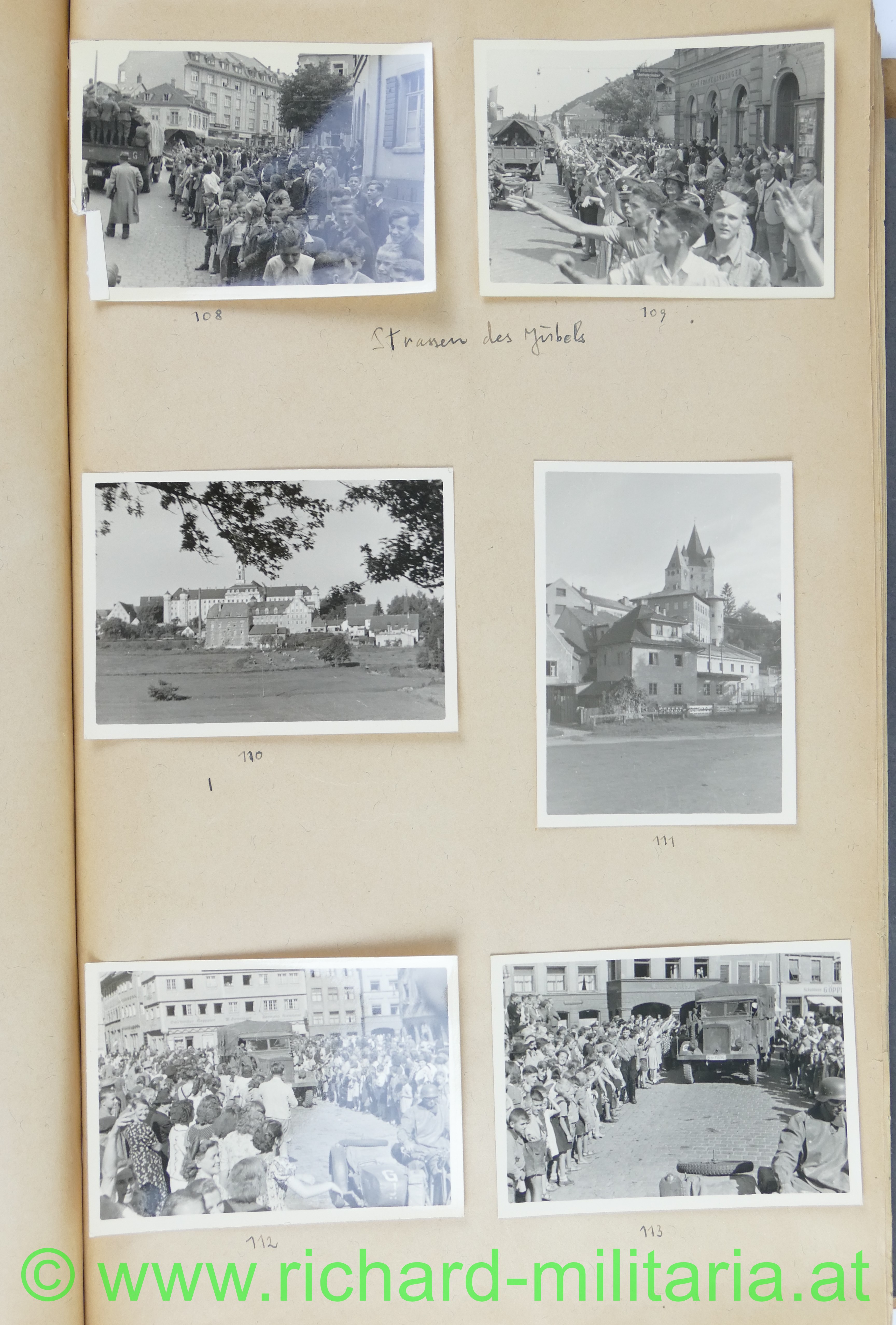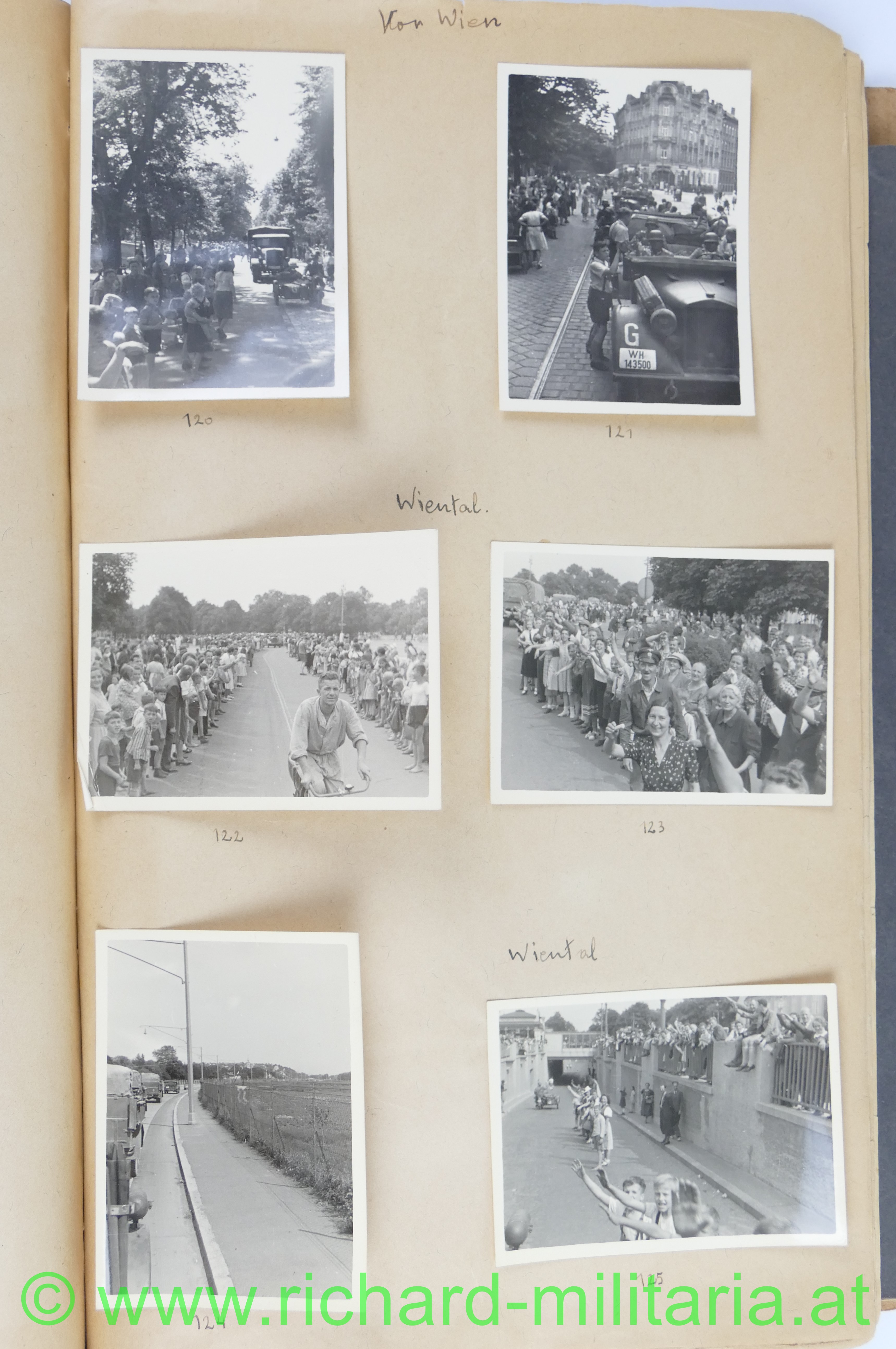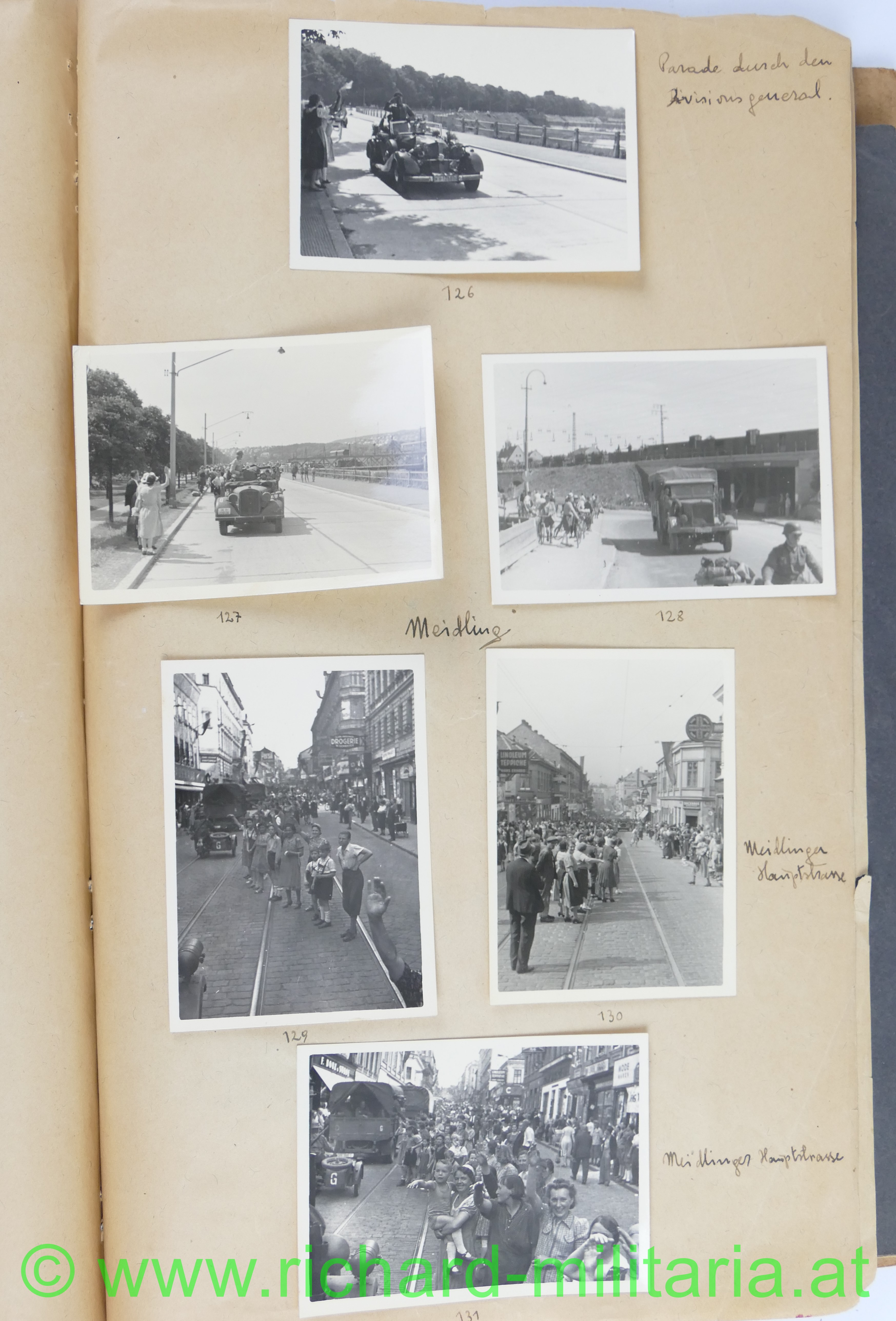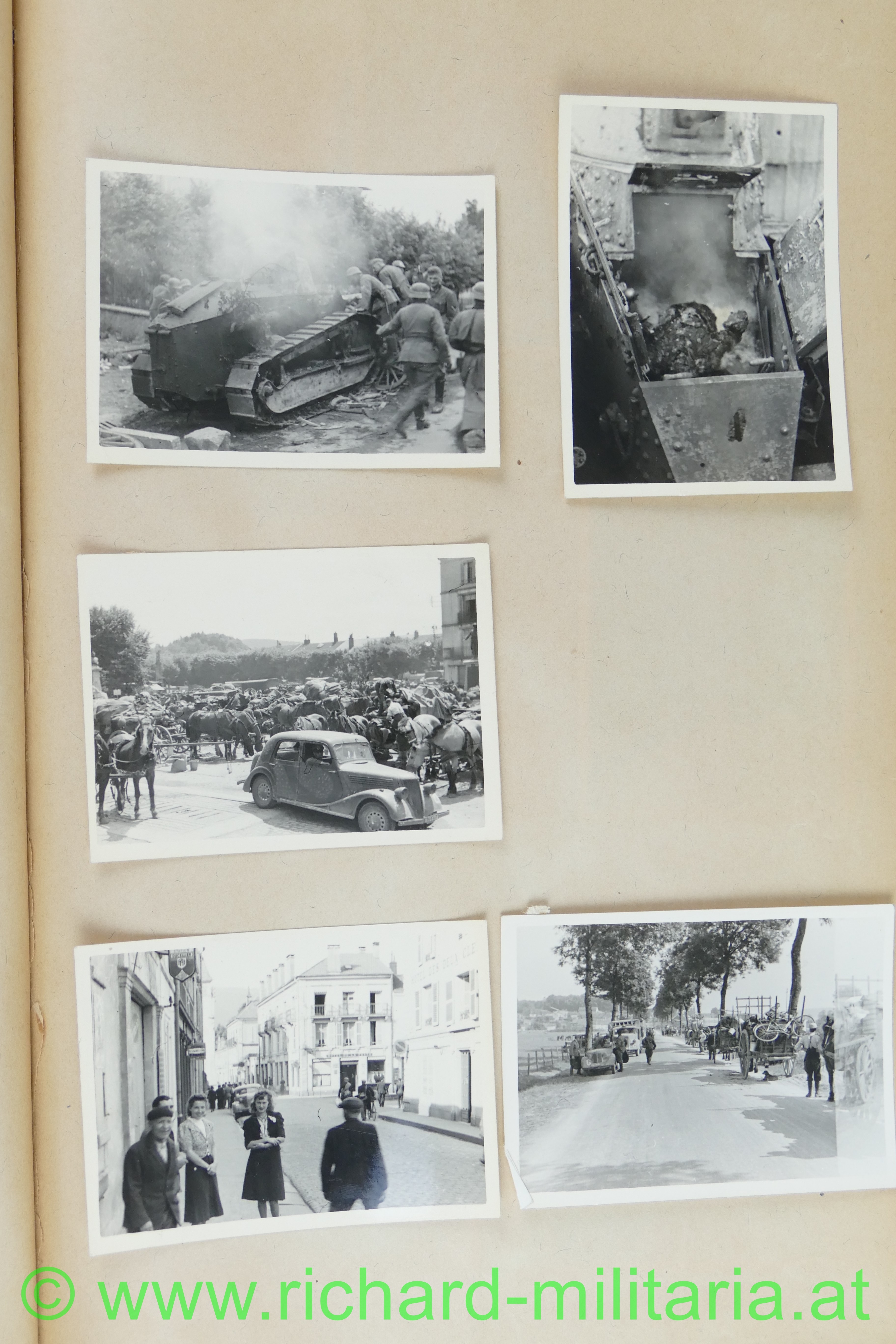 1. Album: Frankreichfeldzug, Siegesparade in Wien, Ausrüstung, Uniformen, deutscher Spähwagen, gefangene Belgier; deutsche Panzer, deutsche PAK, Marschkolonnen, Gefangenentransport, deutsche Soldatengräber, französische Panzer, Kradfahrer, Dornier 17, jubelnde Bevölkerung; Hochformat: 29,5 x 21 cm;