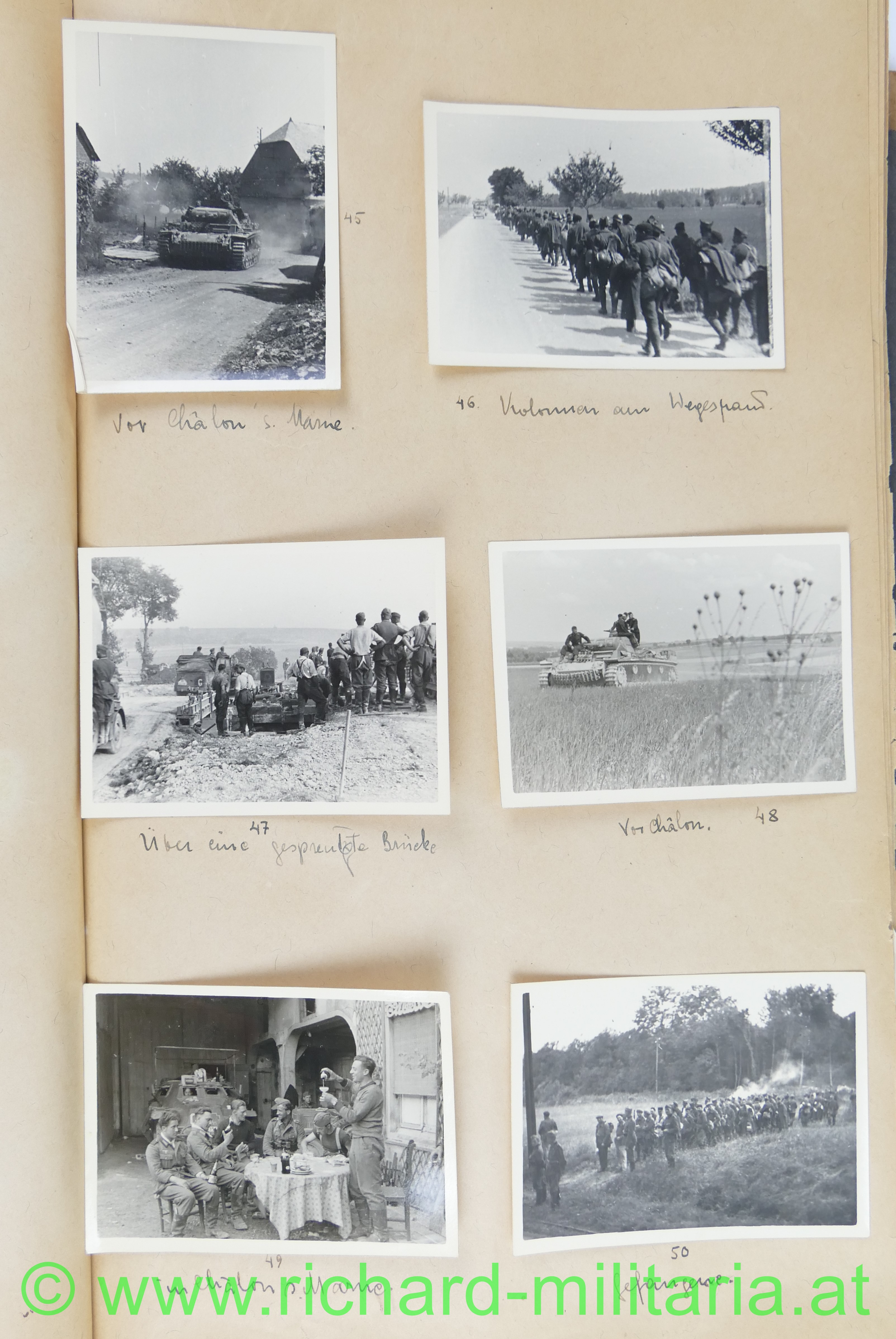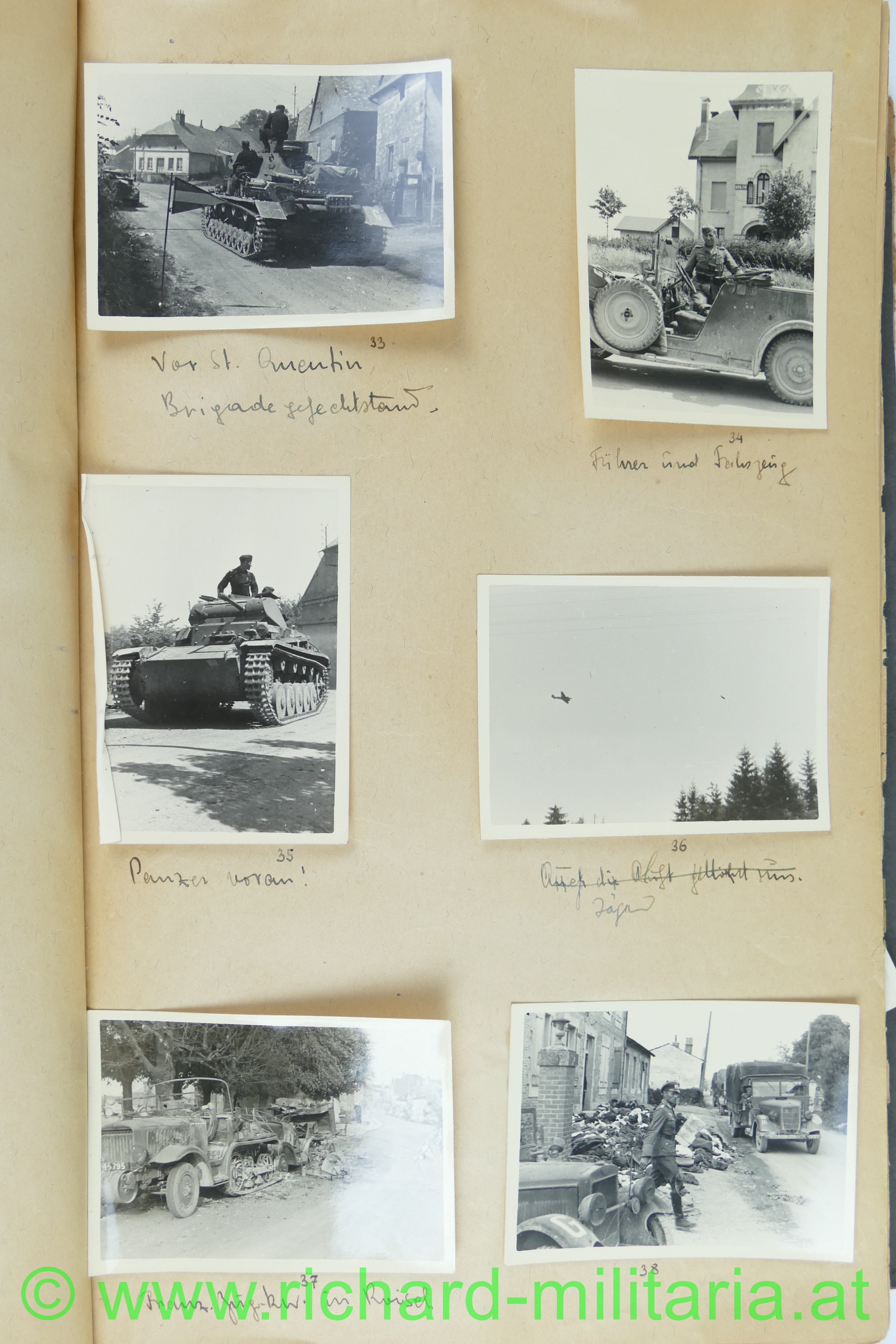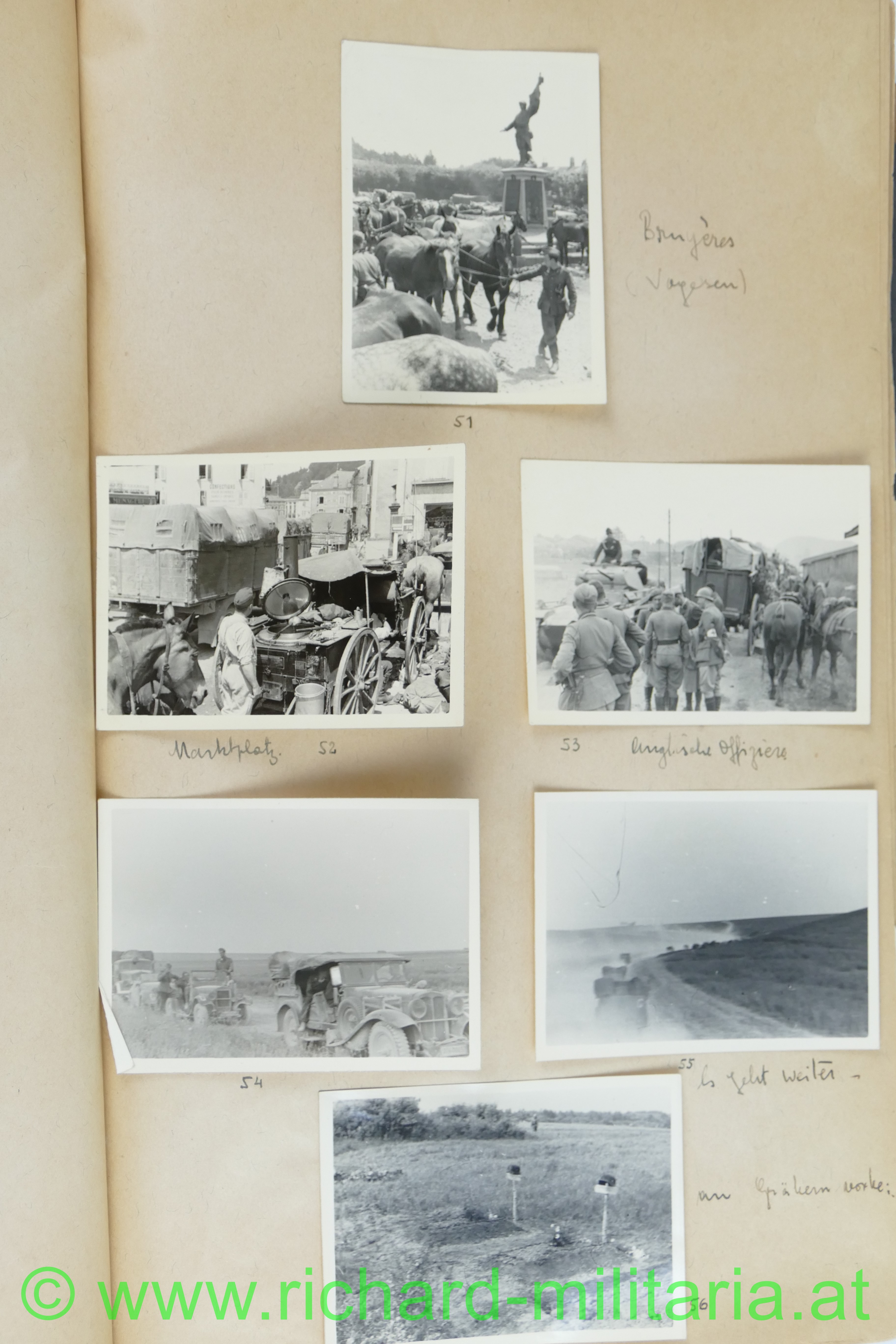 1. Album: Frankreichfeldzug, Siegesparade in Wien, Ausrüstung, Uniformen, deutscher Spähwagen, gefangene Belgier; deutsche Panzer, deutsche PAK, Marschkolonnen, Gefangenentransport, deutsche Soldatengräber, französische Panzer, Kradfahrer, Dornier 17, jubelnde Bevölkerung; Hochformat: 29,5 x 21 cm;