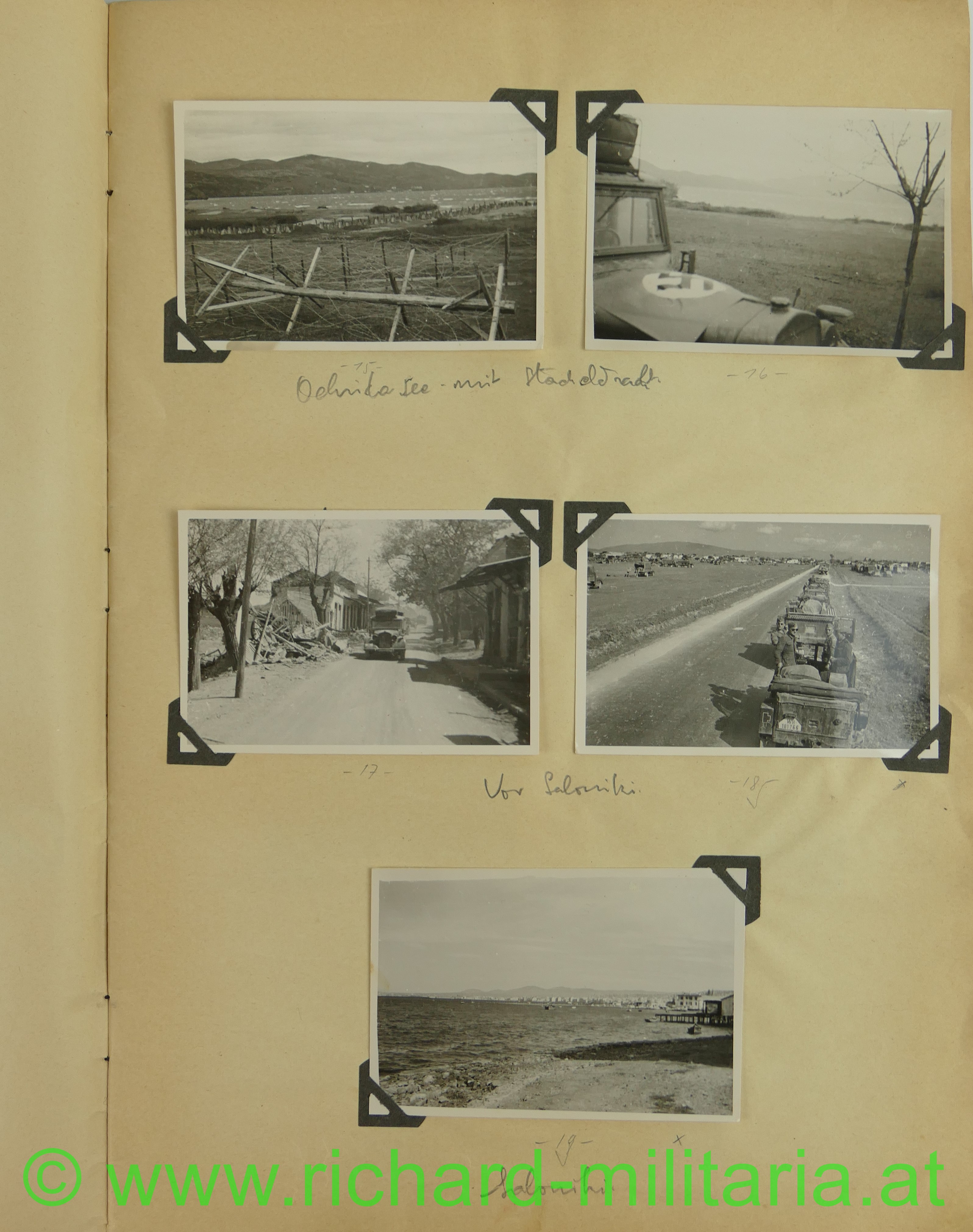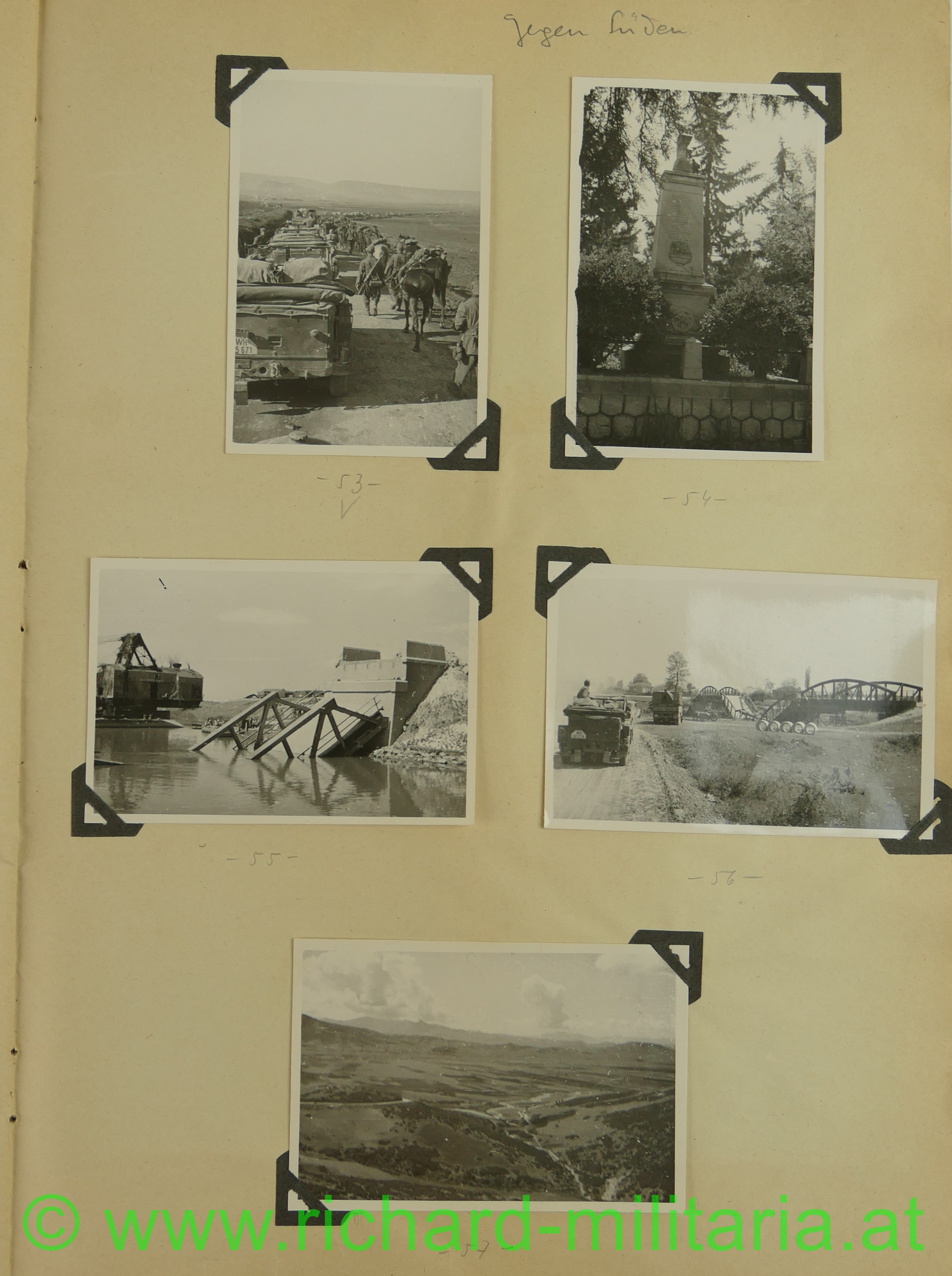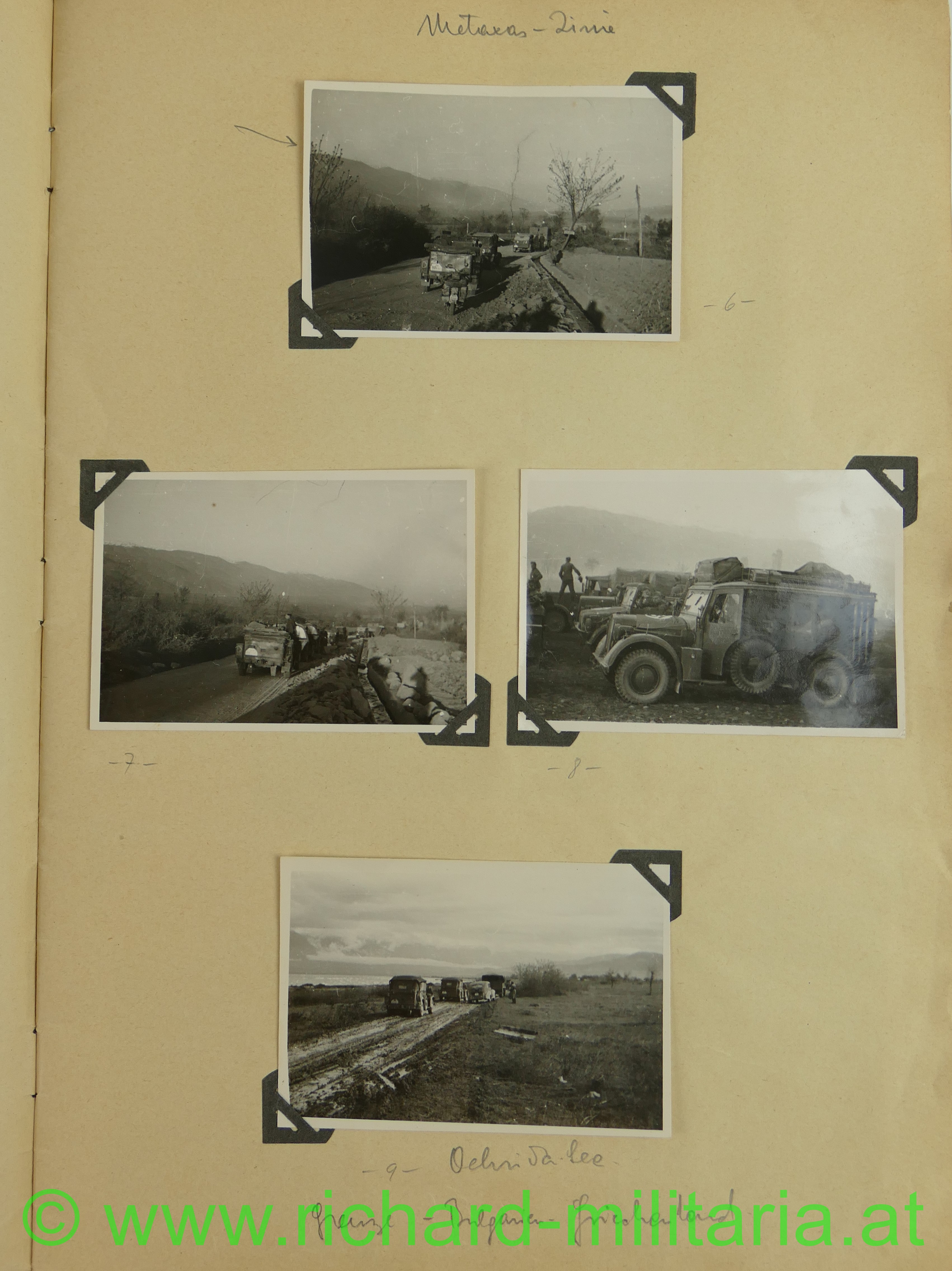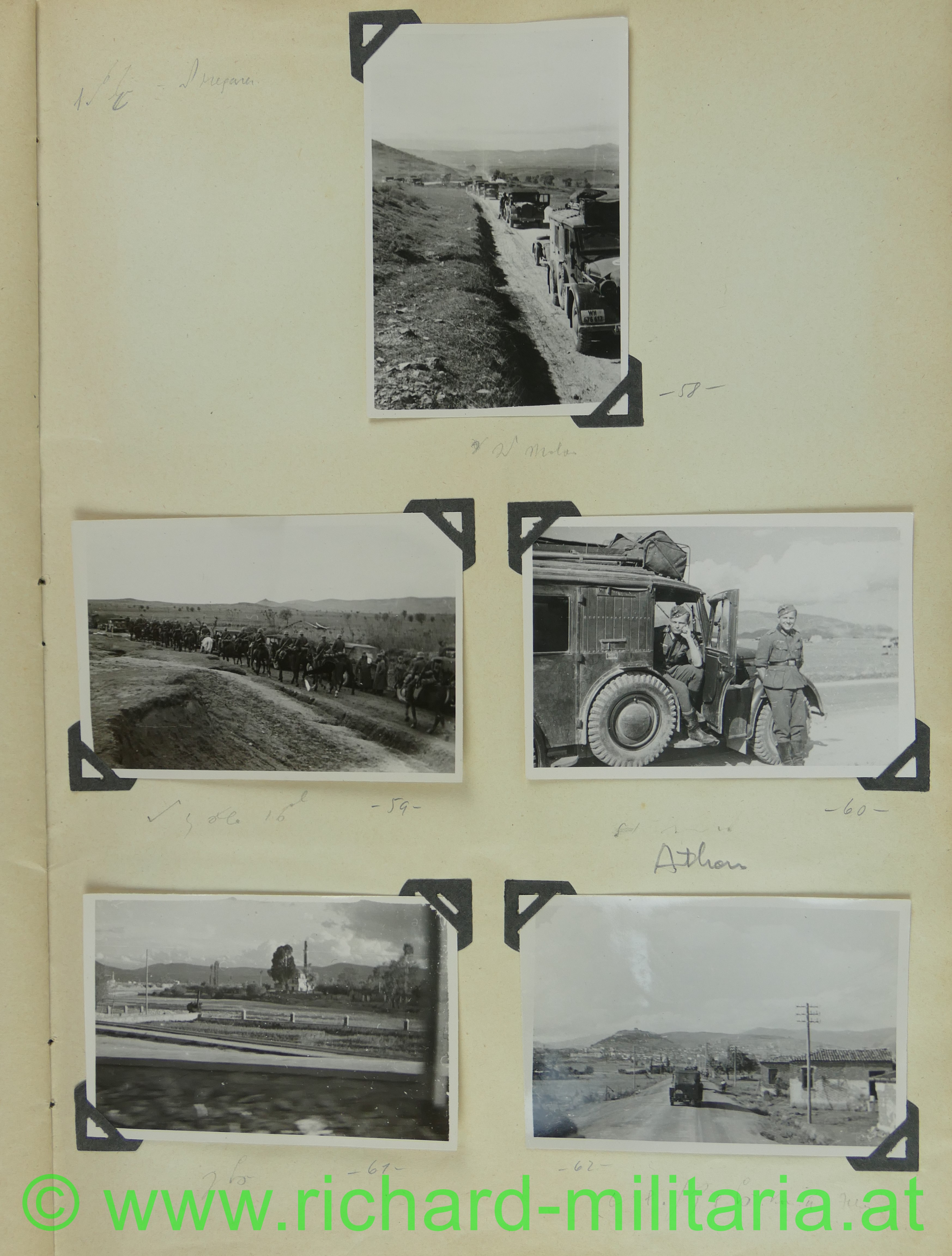 2. Album: Balkanfeldzug + Griechenlandfeldzug, Kettenfahrzeug mit 4-lings-FLAK, Feldflugplatz, Metaxa-Linie, Wehrmachtfahrzeuge, Hindernisgräben, Artillerieeinschlag, Schweineschlachtung, deutsche Panzer, Marschkolonnen, englischer Panzer, Feldlager, zerstörte Dörfer, Athen Palastwache, Hochformat: 34 x 21 cm;