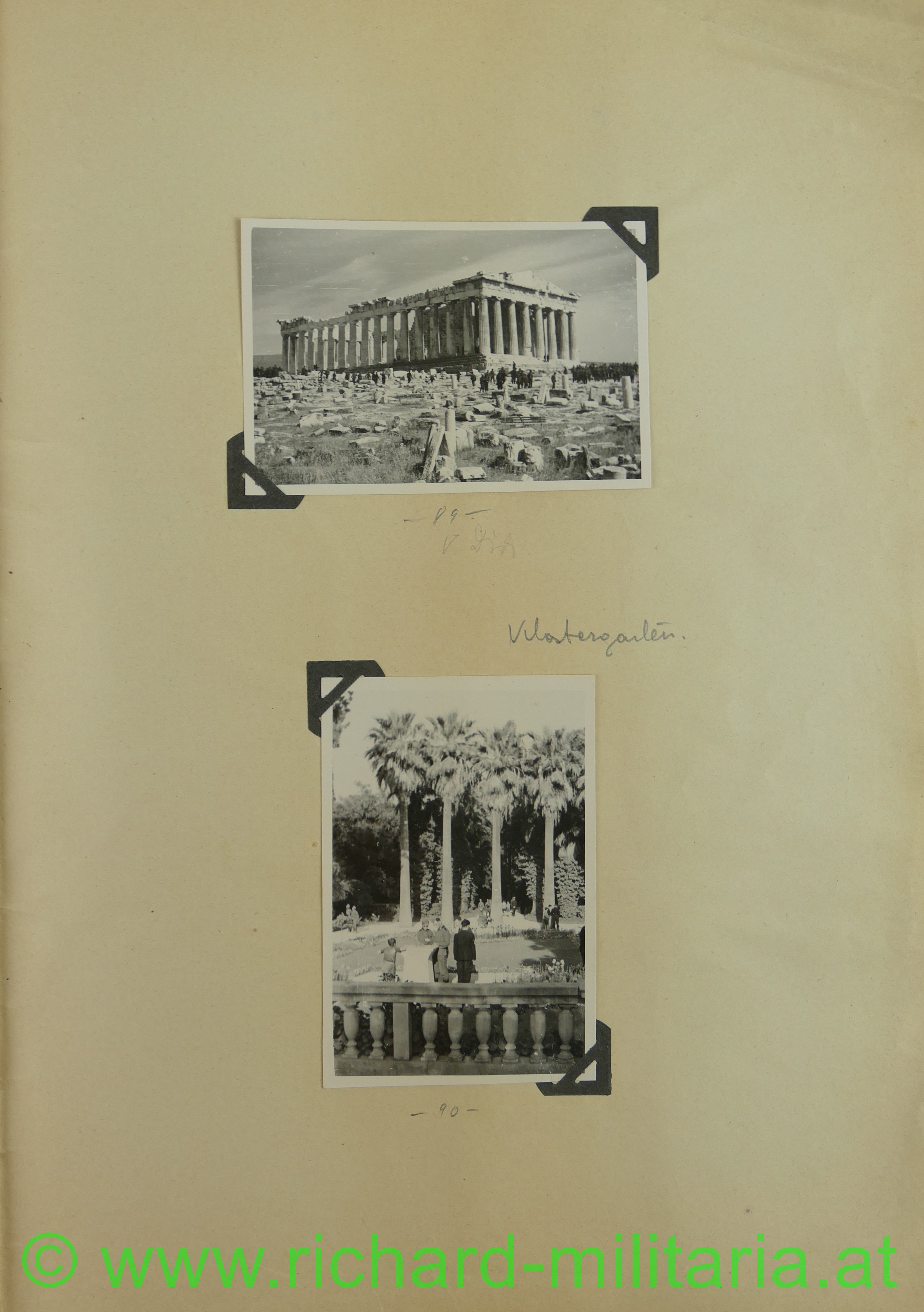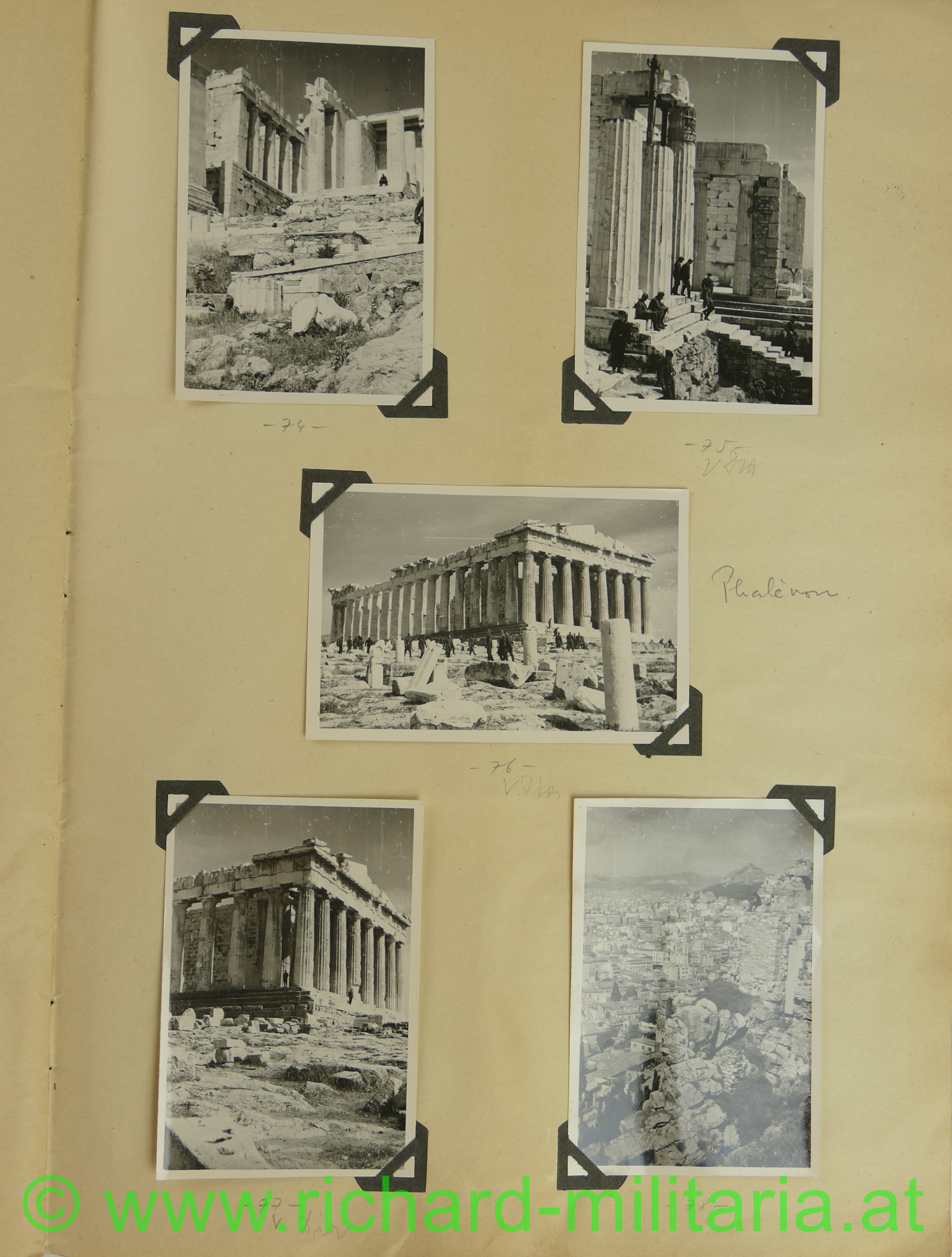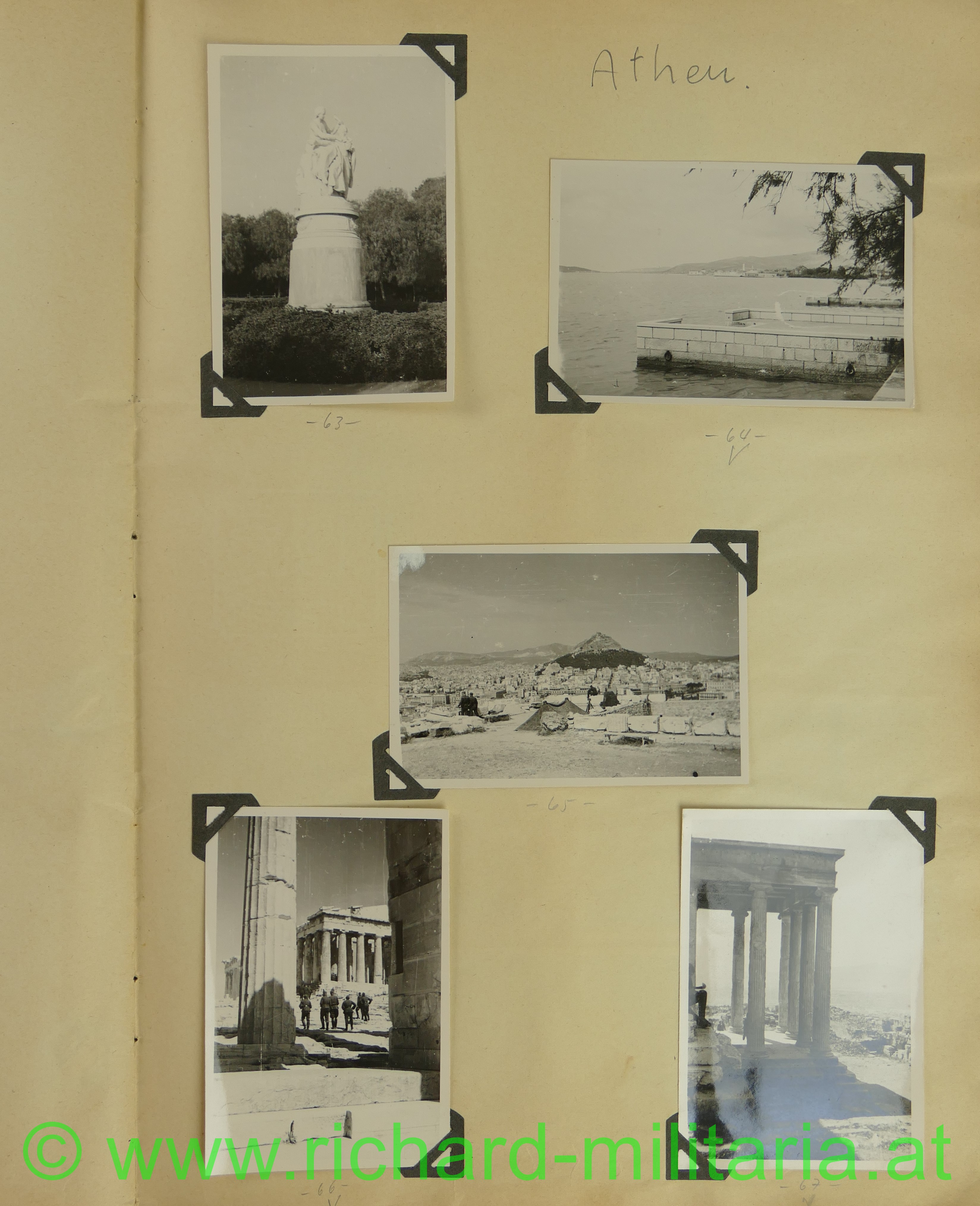 2. Album: Balkanfeldzug + Griechenlandfeldzug, Kettenfahrzeug mit 4-lings-FLAK, Feldflugplatz, Metaxa-Linie, Wehrmachtfahrzeuge, Hindernisgräben, Artillerieeinschlag, Schweineschlachtung, deutsche Panzer, Marschkolonnen, englischer Panzer, Feldlager, zerstörte Dörfer, Athen Palastwache, Hochformat: 34 x 21 cm;
