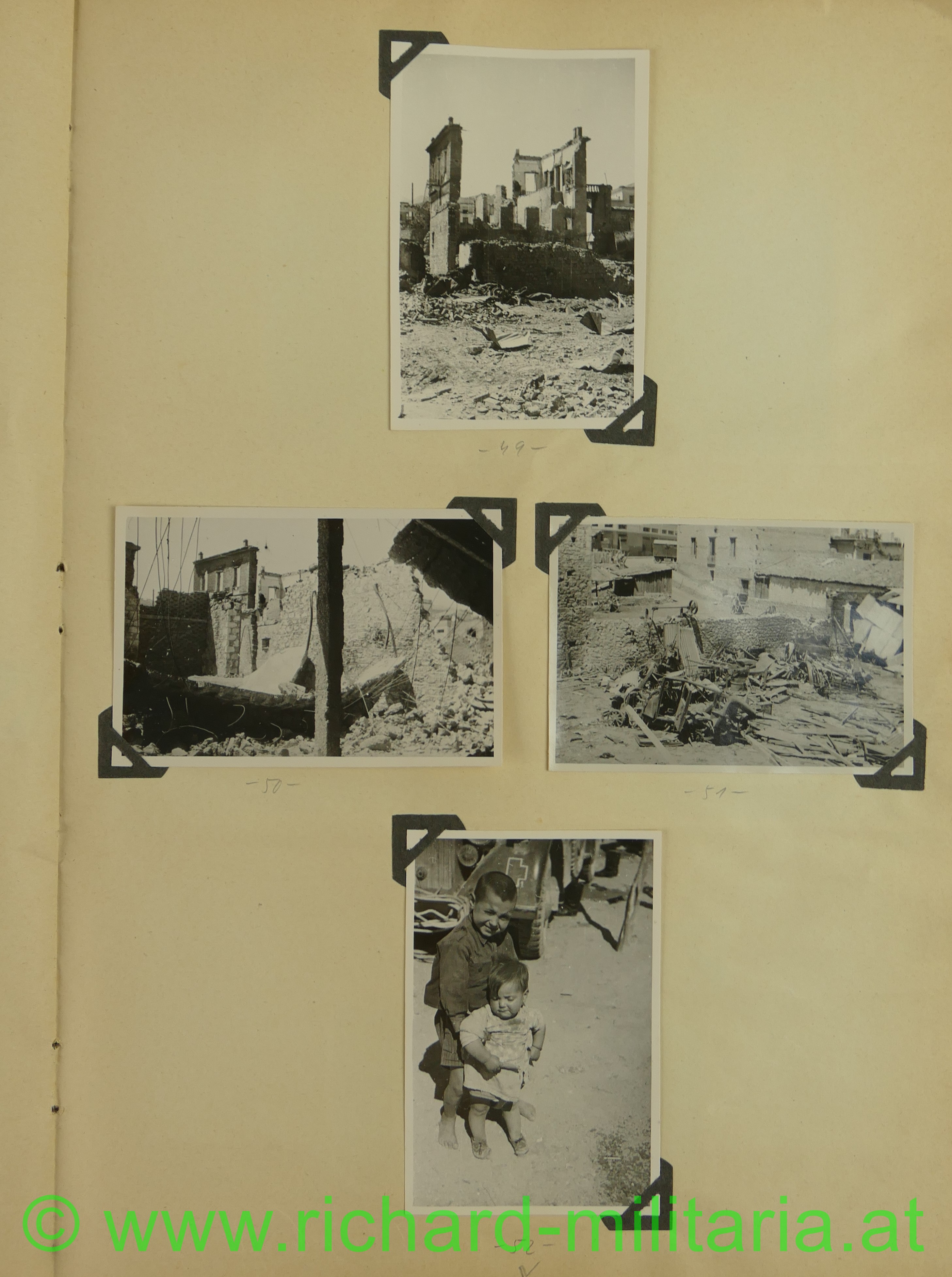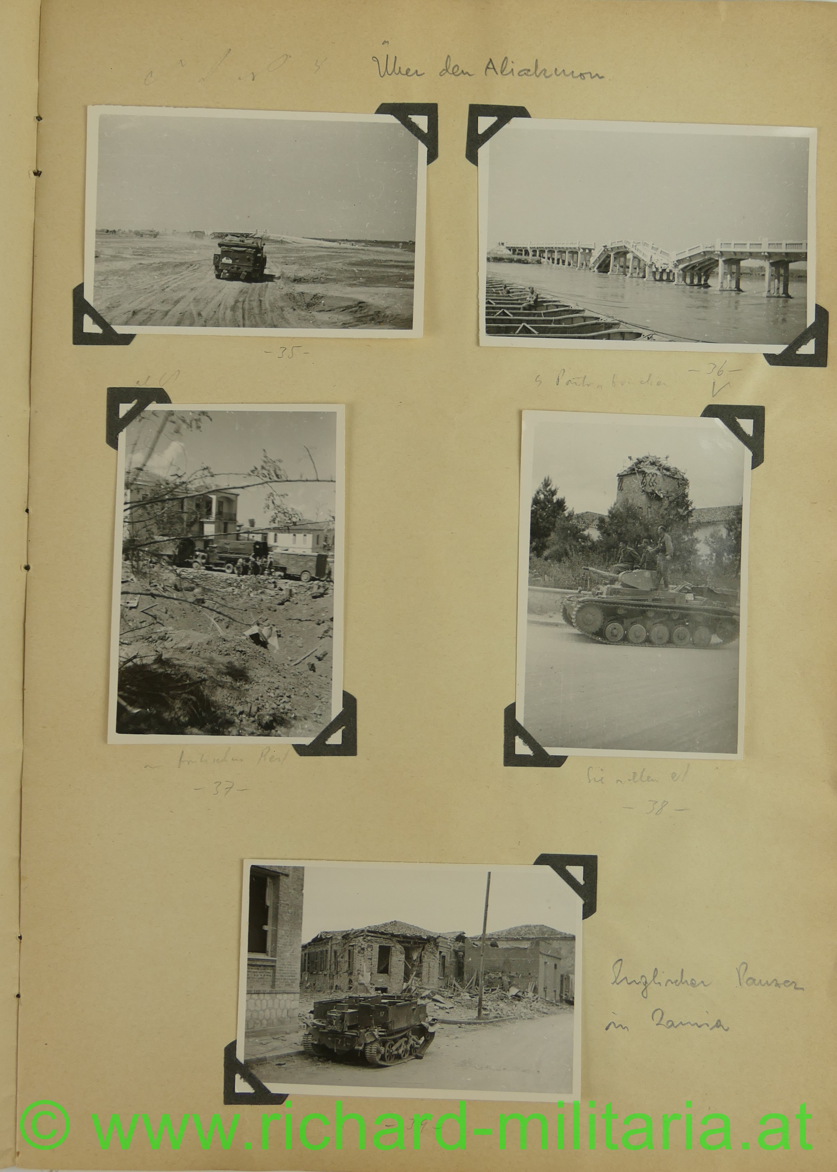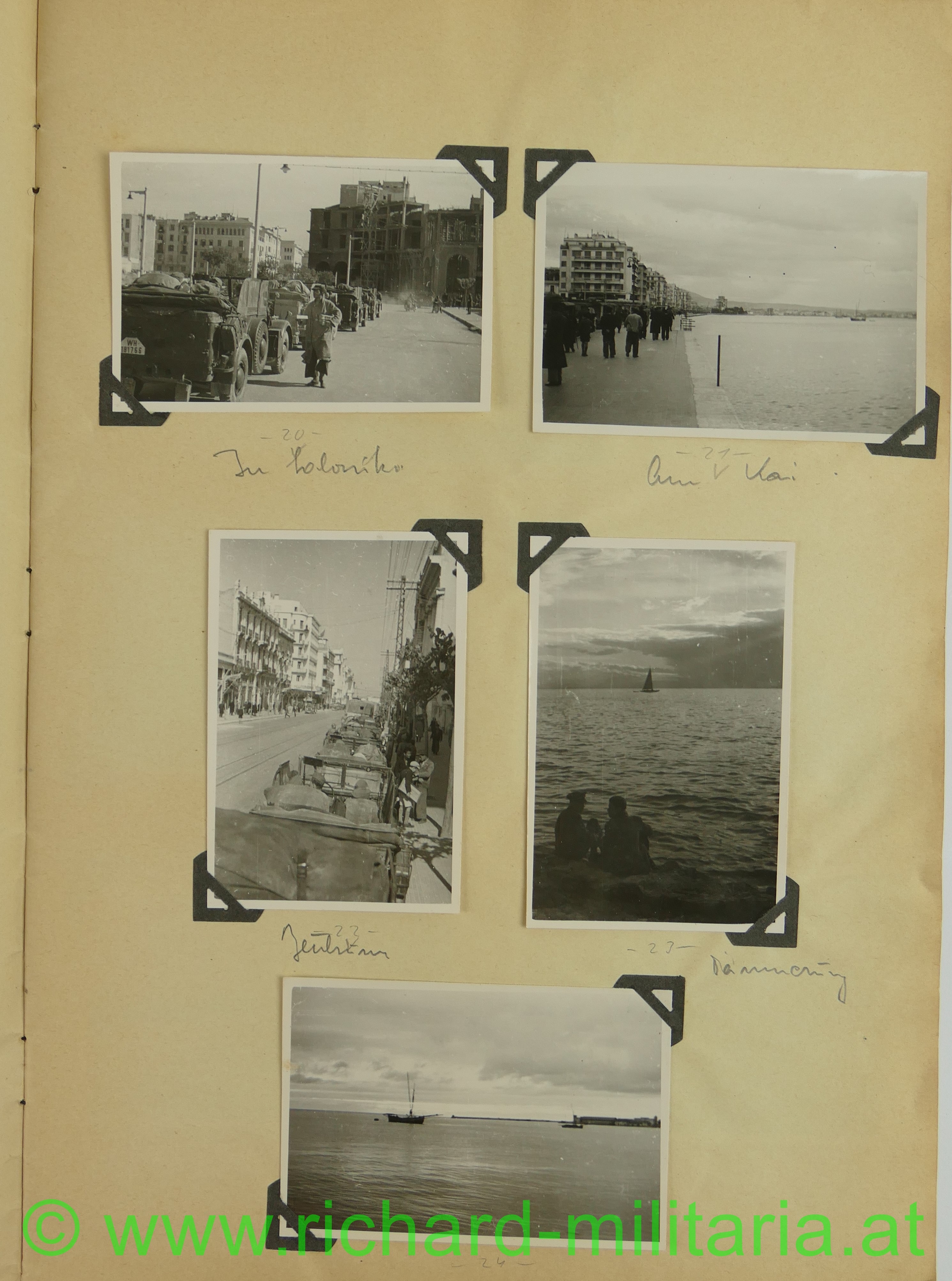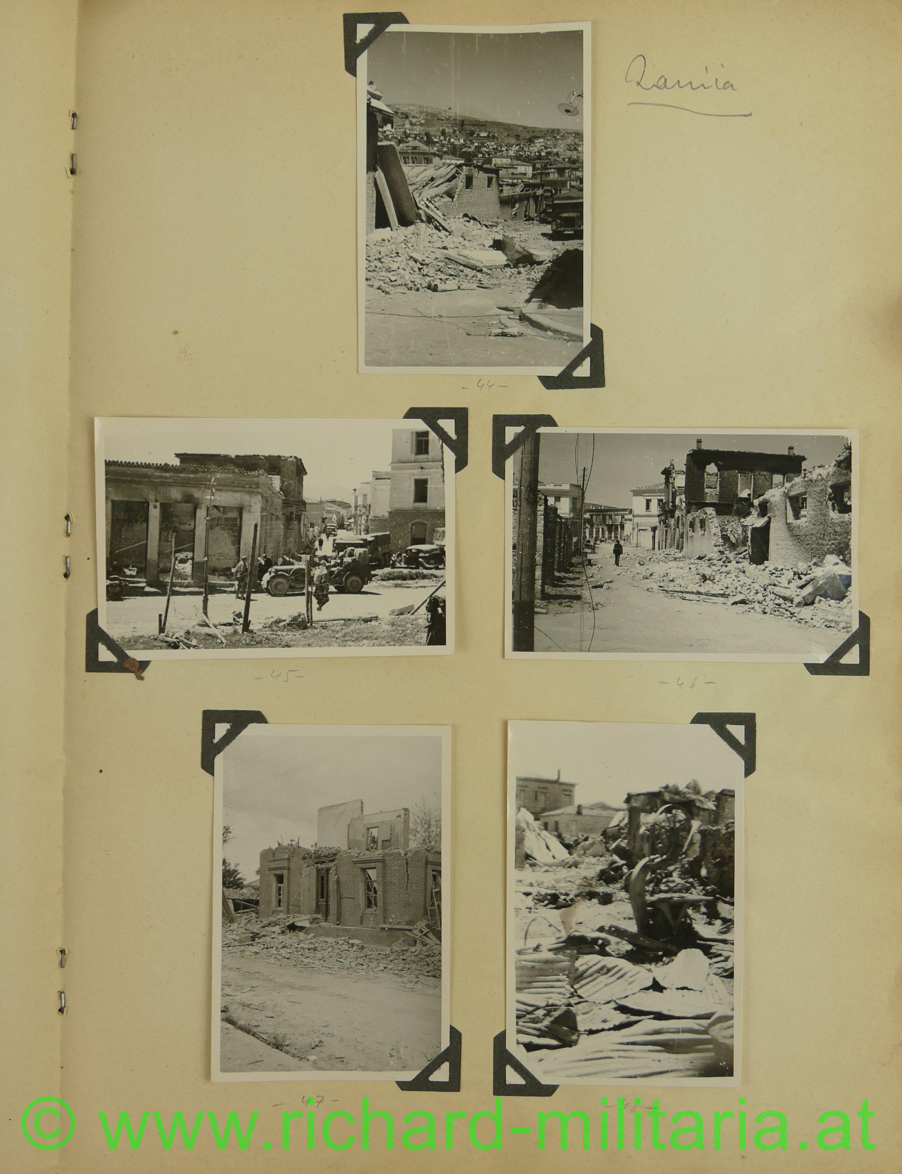 2. Album: Balkanfeldzug + Griechenlandfeldzug, Kettenfahrzeug mit 4-lings-FLAK, Feldflugplatz, Metaxa-Linie, Wehrmachtfahrzeuge, Hindernisgräben, Artillerieeinschlag, Schweineschlachtung, deutsche Panzer, Marschkolonnen, englischer Panzer, Feldlager, zerstörte Dörfer, Athen Palastwache, Hochformat: 34 x 21 cm;