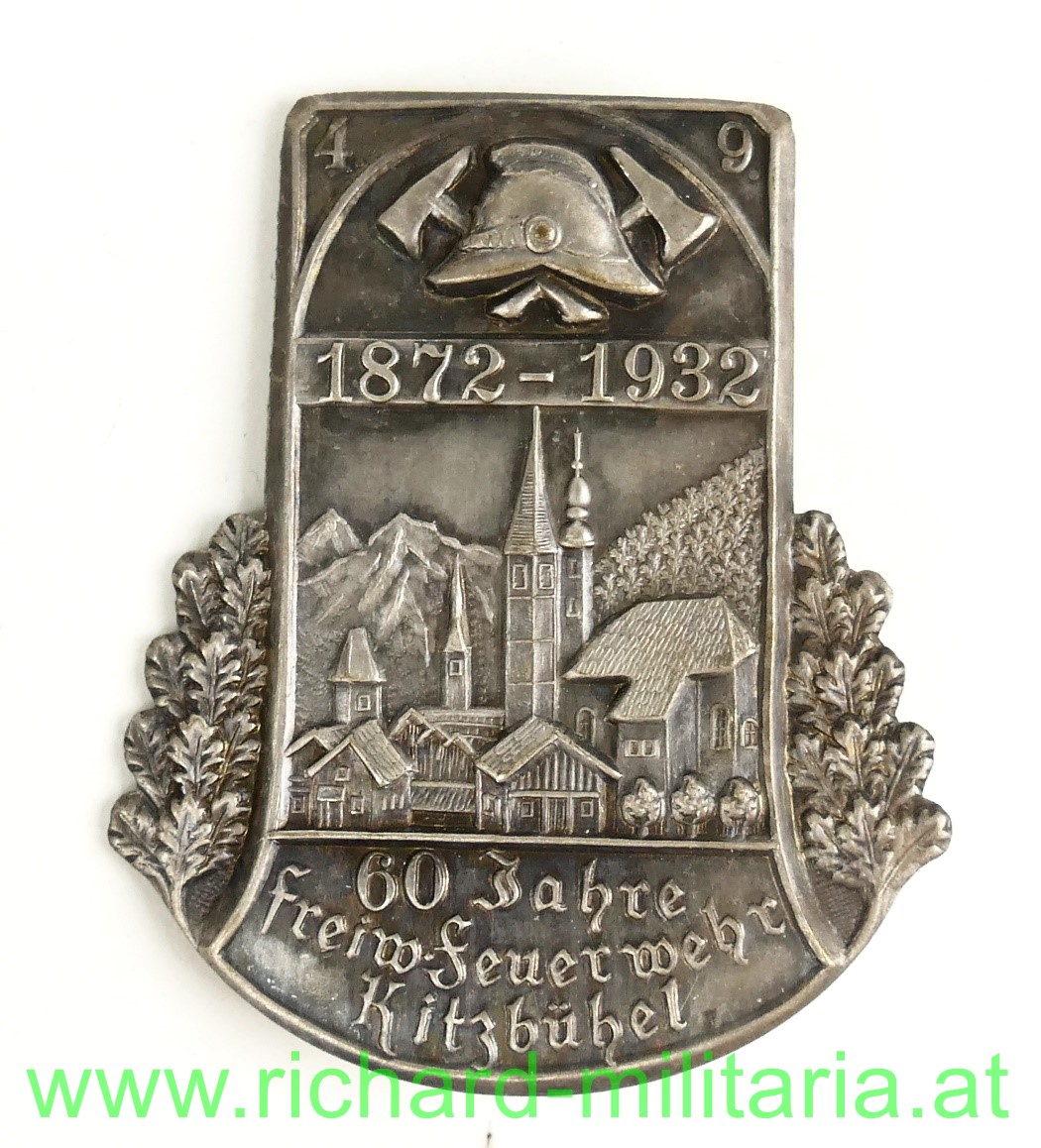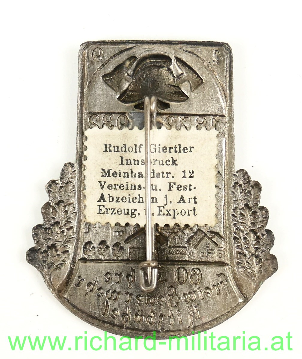 Abzeichen - 60 Jahre Freiw. Feuerwehr Kitzbühel 1872-1932; mit originaler Nadel und Herstelleretikett: "R. Giertler, Innsbruck";