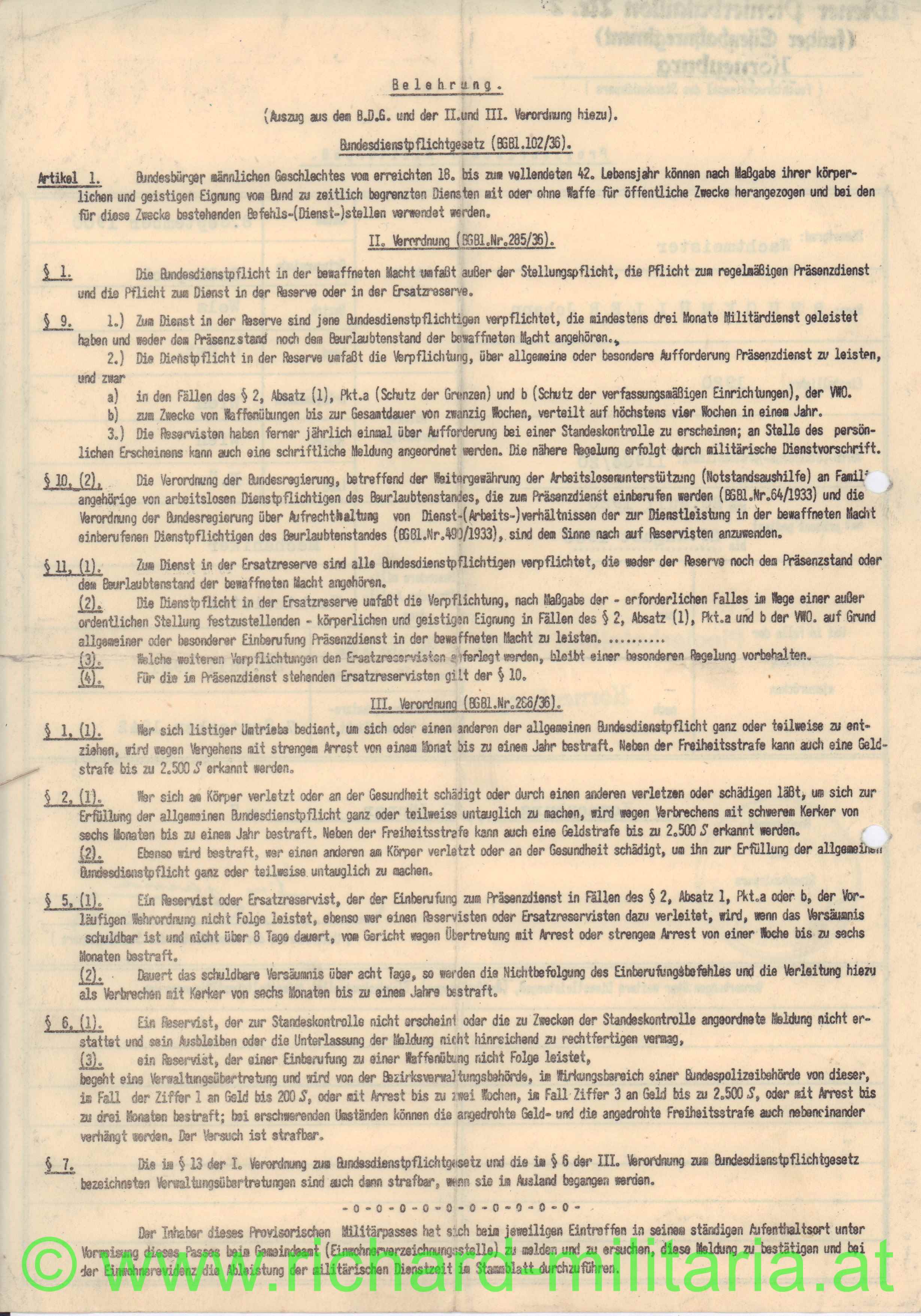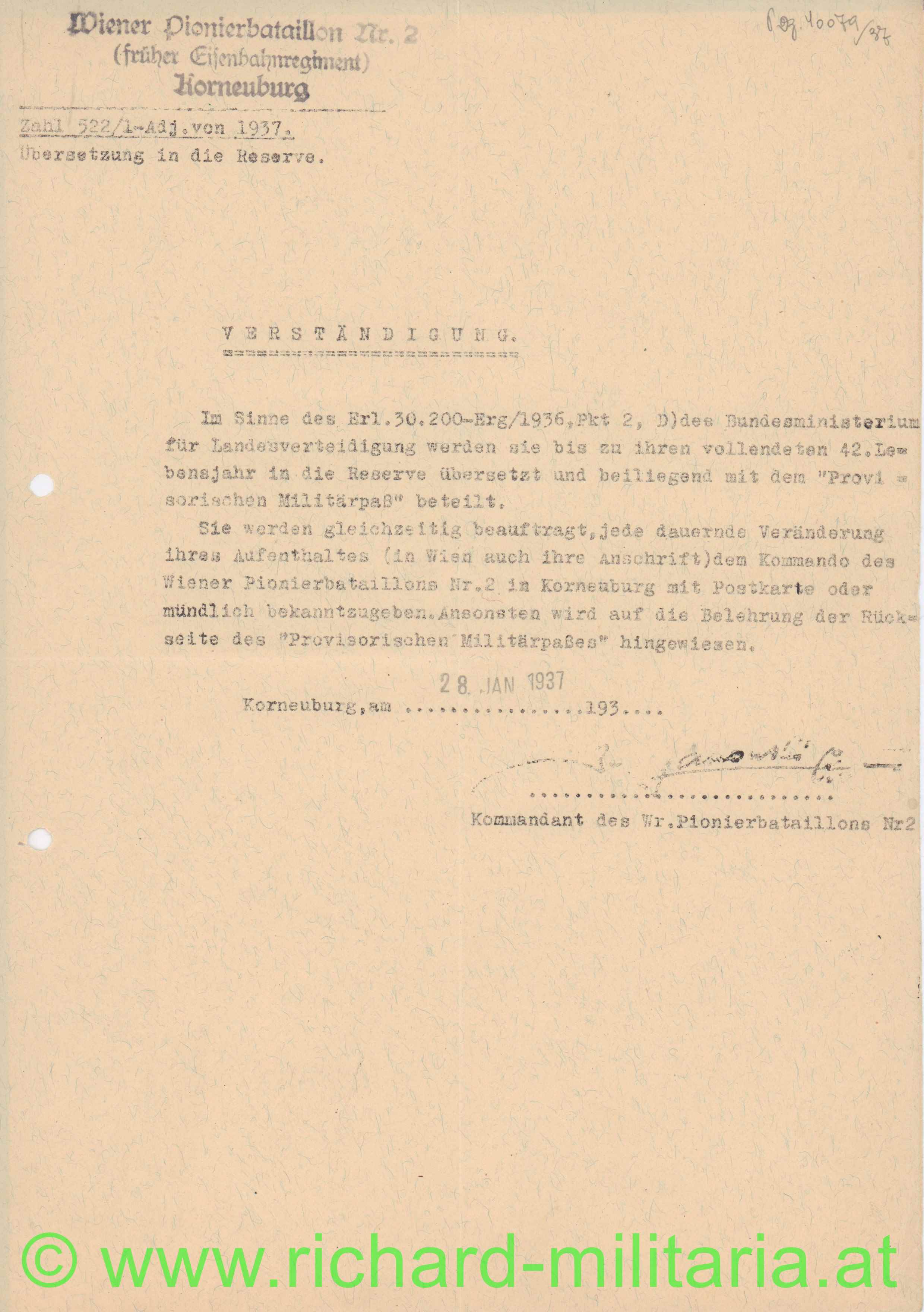 - Verständigung vom 28.1.1937 - Überführung in die Reserve und Aushändigung des provisorischen Militärpasses