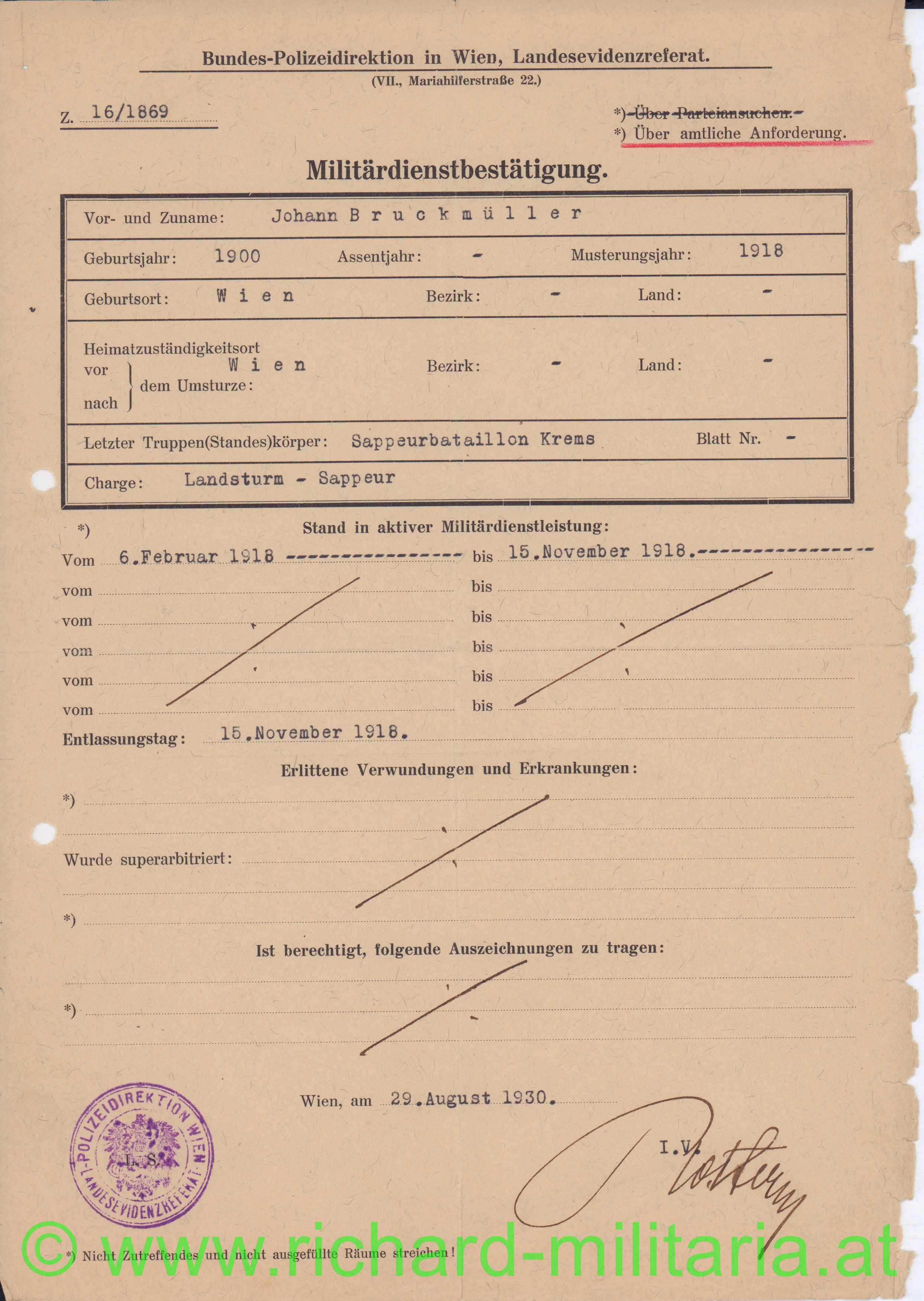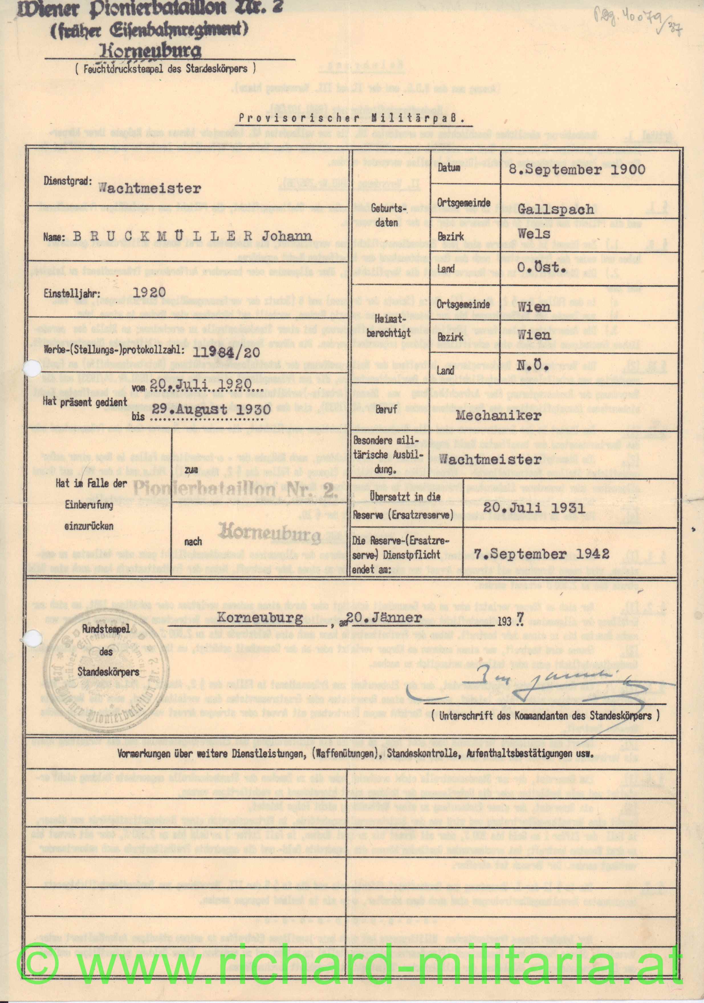 Papierkonvolut des Wachtmeister d. Res. Johann Brückmüller; Wiener Pionierbataillon Nr. 2 (früher Eisenbahnregiment) - Korneuburg; bestehend aus: