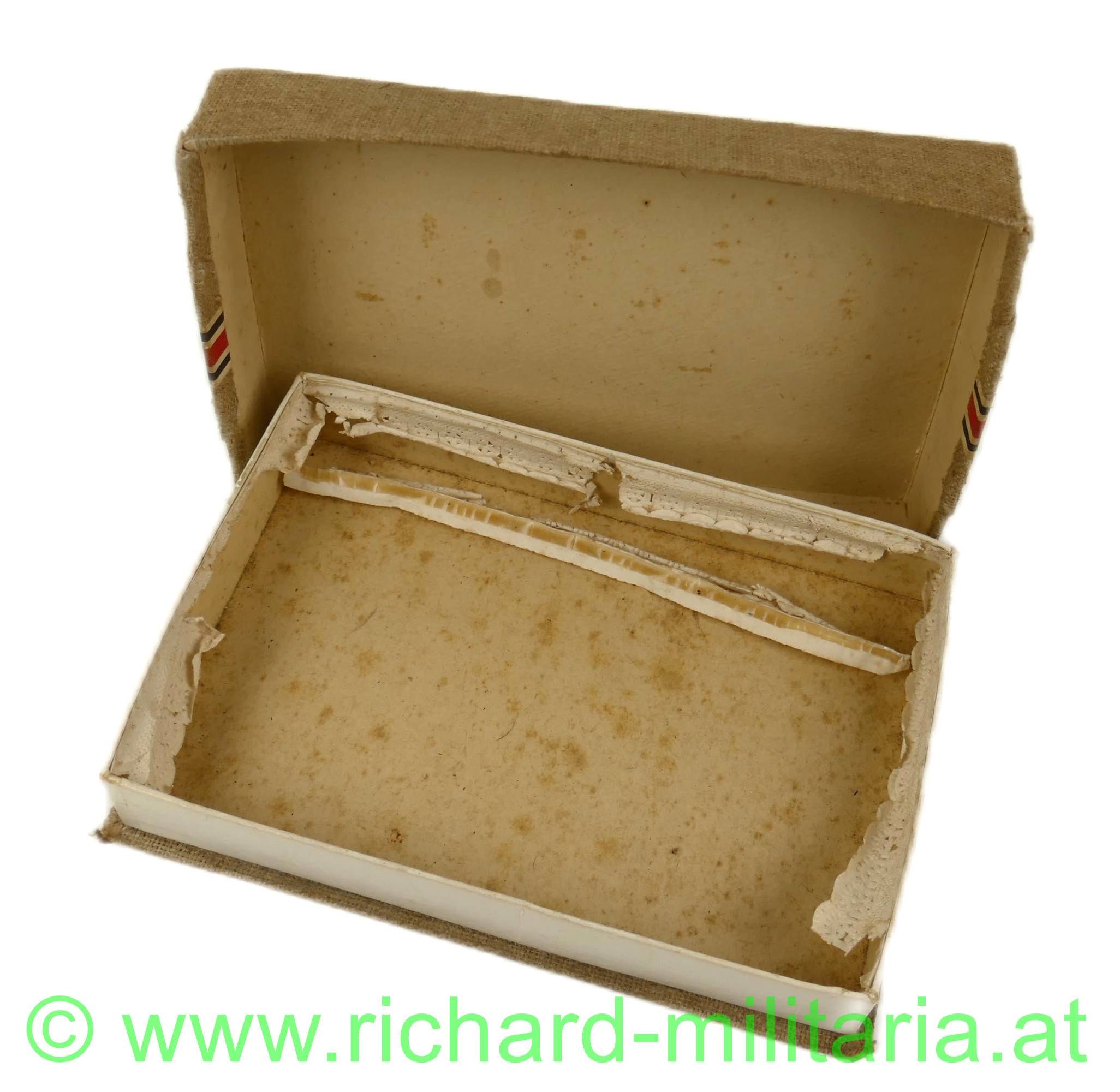 Feldpostbrief-Päckchen; mit Leinen überzogene Kartonschachtel, mit Adressenzettel, frankiert mit bayrischer Briefmarke, Ränder des Adresszettels mit schwarz/weiß/rot verziert, adressiert an einen Angehörigen der k.u.k. Festungstelegrafenabteilung in Südtirol;