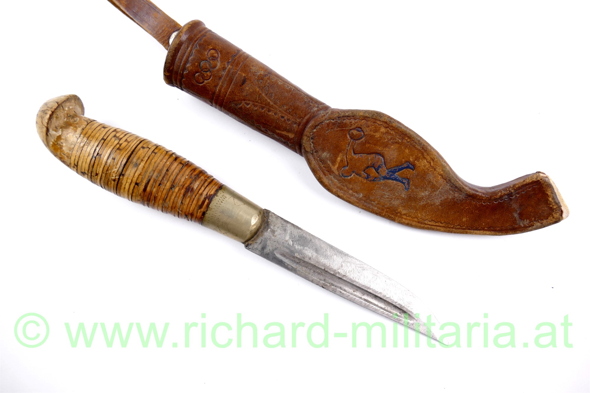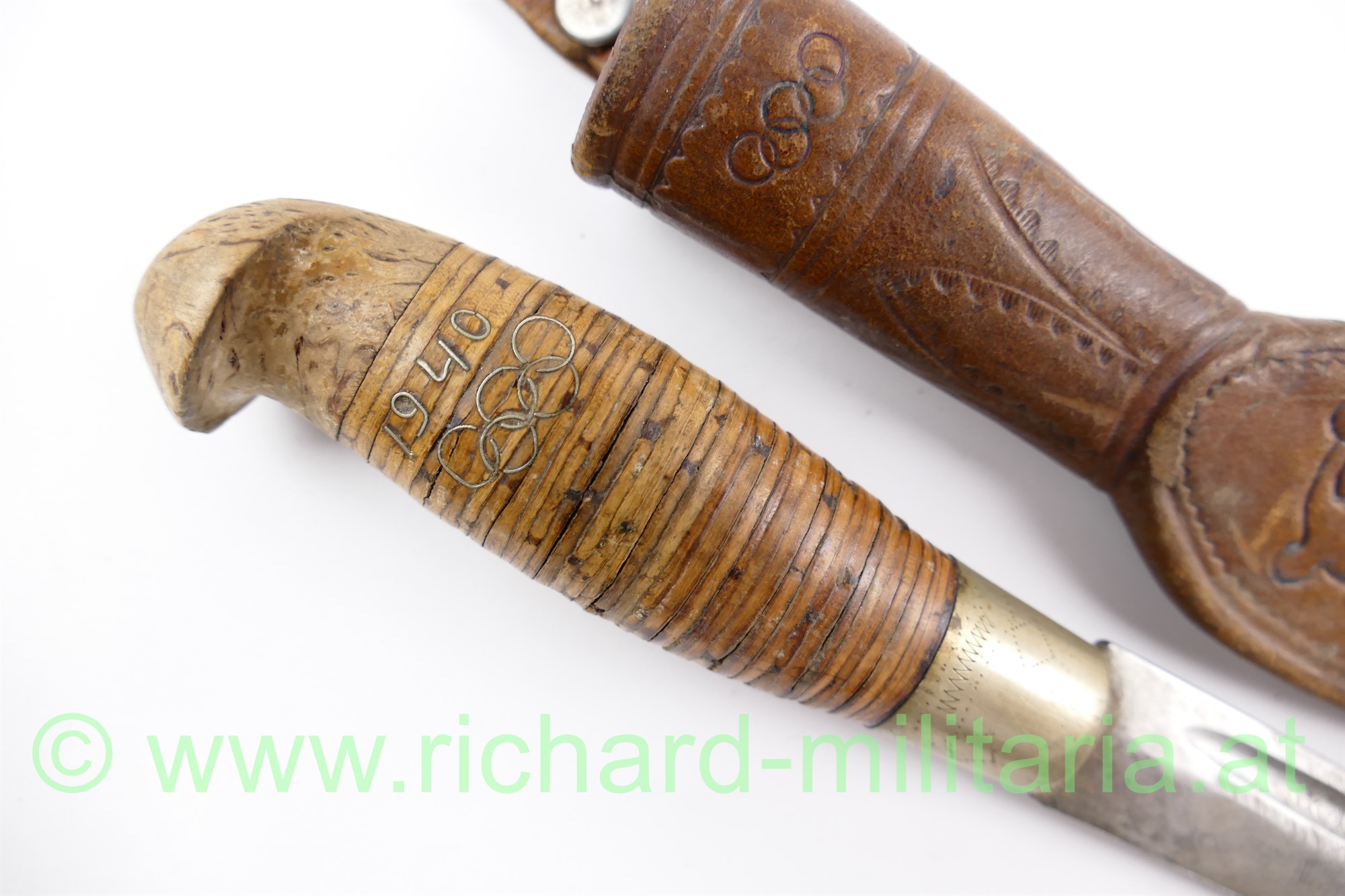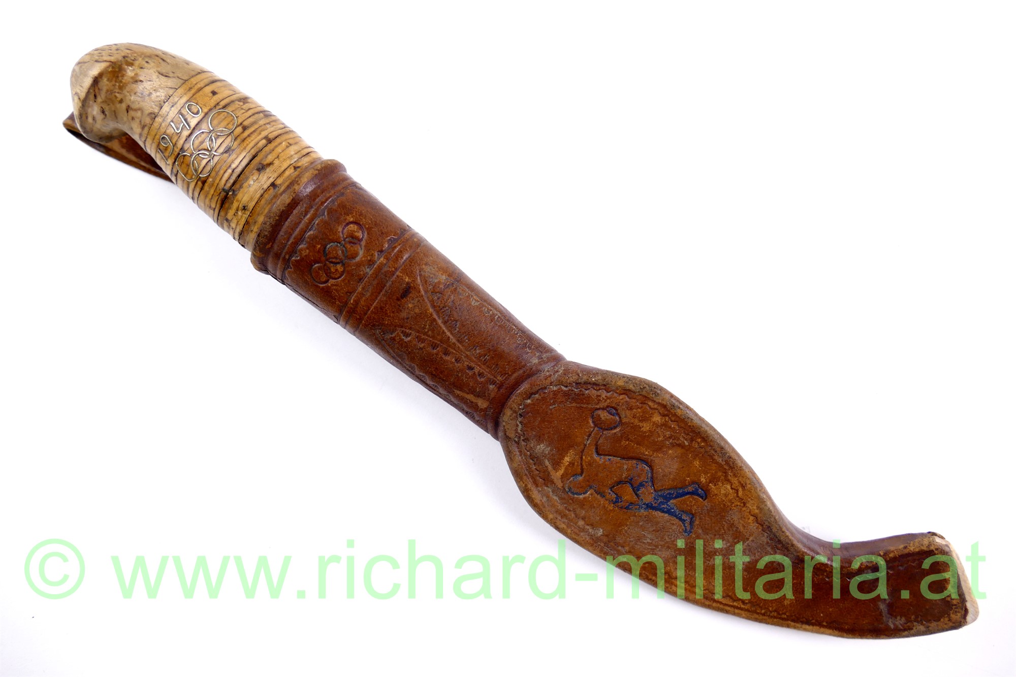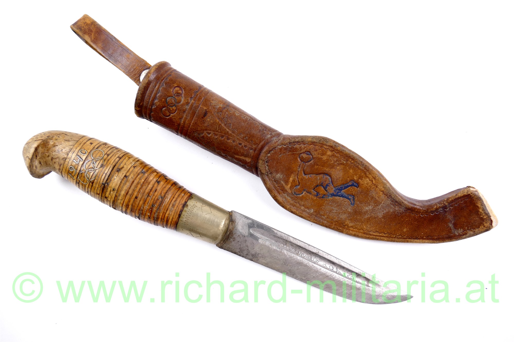 Finnenmesser mit Griffeinlage 1940 und olympischen Ringen, Lederscheide ebenfalls mit den olympischen Ringen und einem angedeutetem Diskuswerfer, Klinge nachgeschliffen (sehr scharf!), Gesamtlänge in der Scheide 25 cm