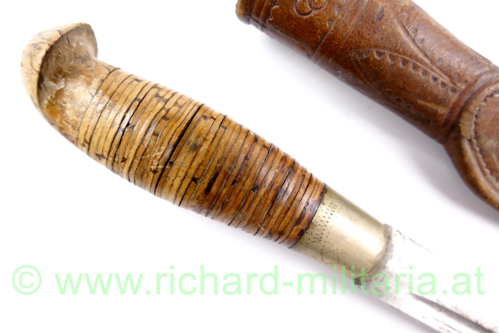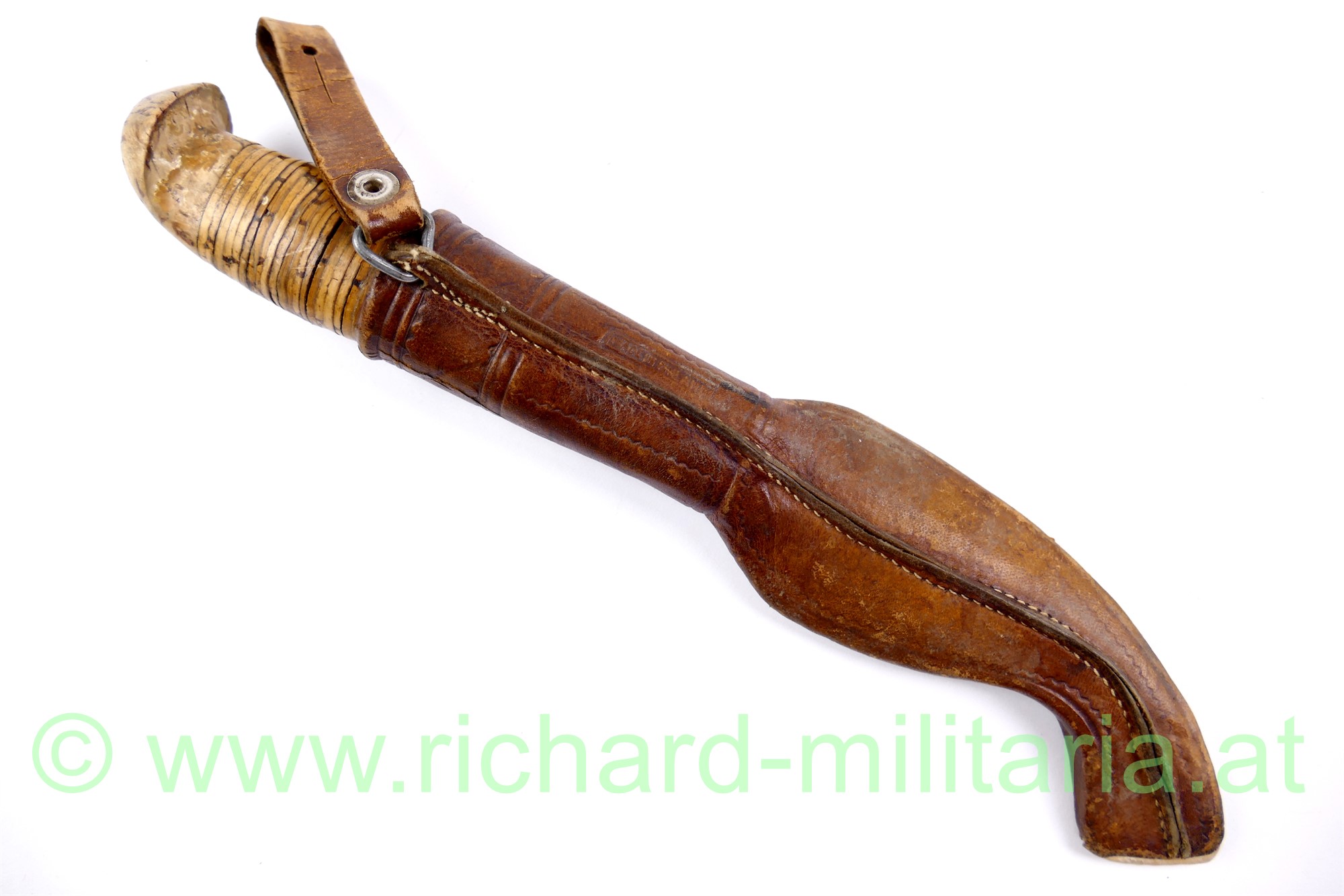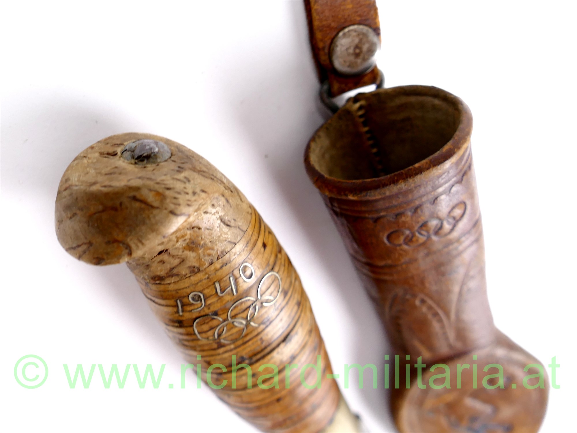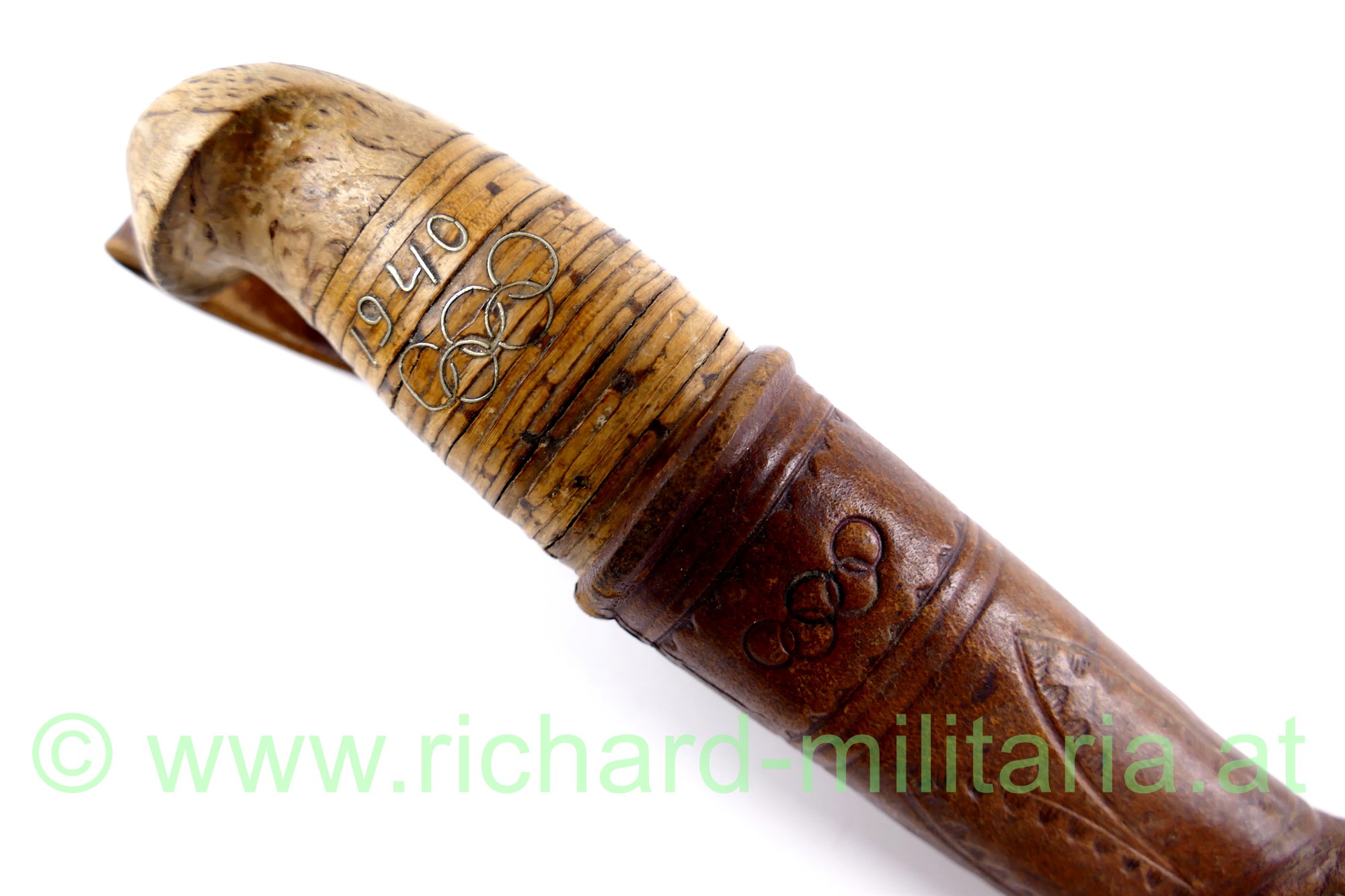 Finnenmesser mit Griffeinlage 1940 und olympischen Ringen, Lederscheide ebenfalls mit den olympischen Ringen und einem angedeutetem Diskuswerfer, Klinge nachgeschliffen (sehr scharf!), Gesamtlänge in der Scheide 25 cm