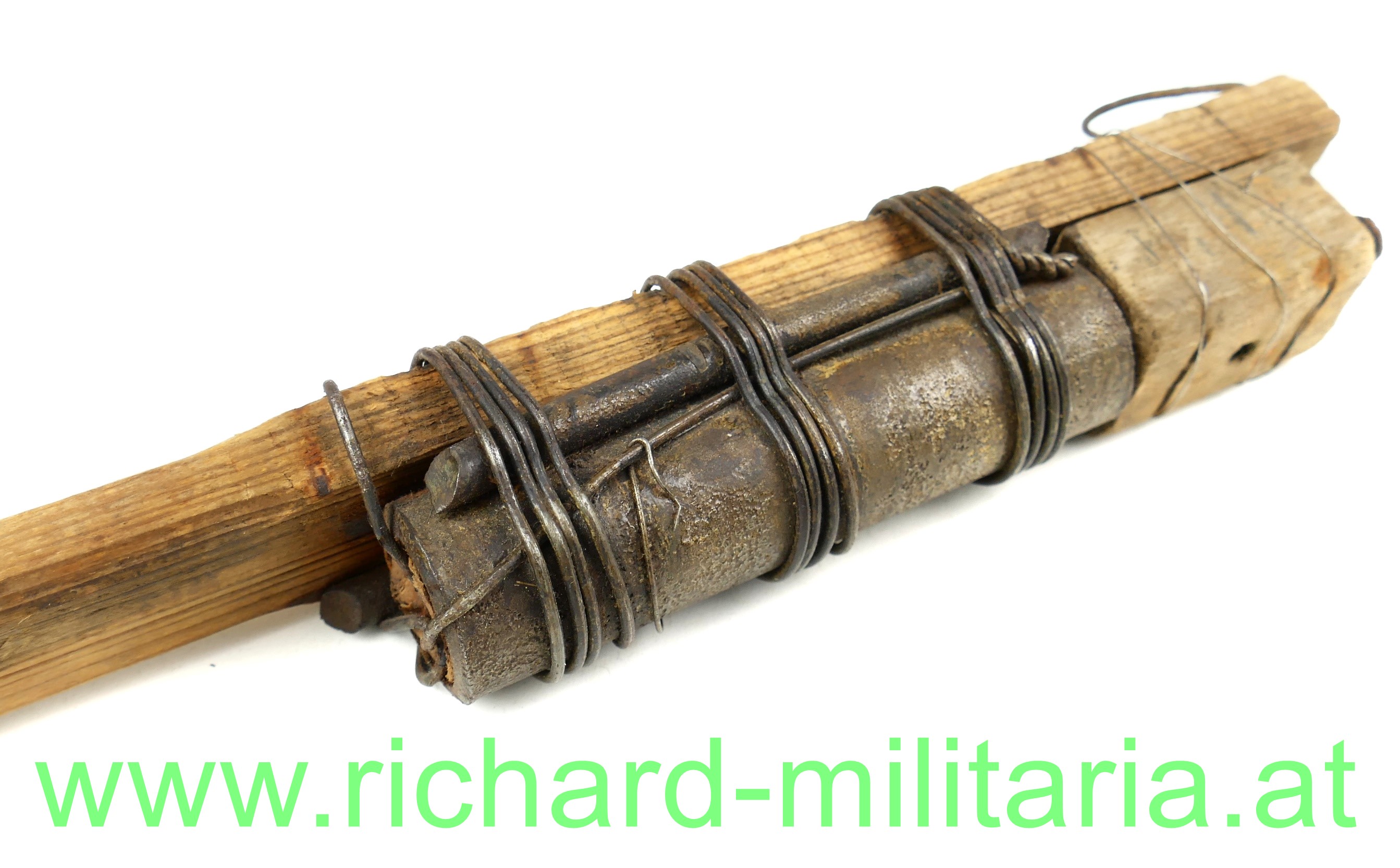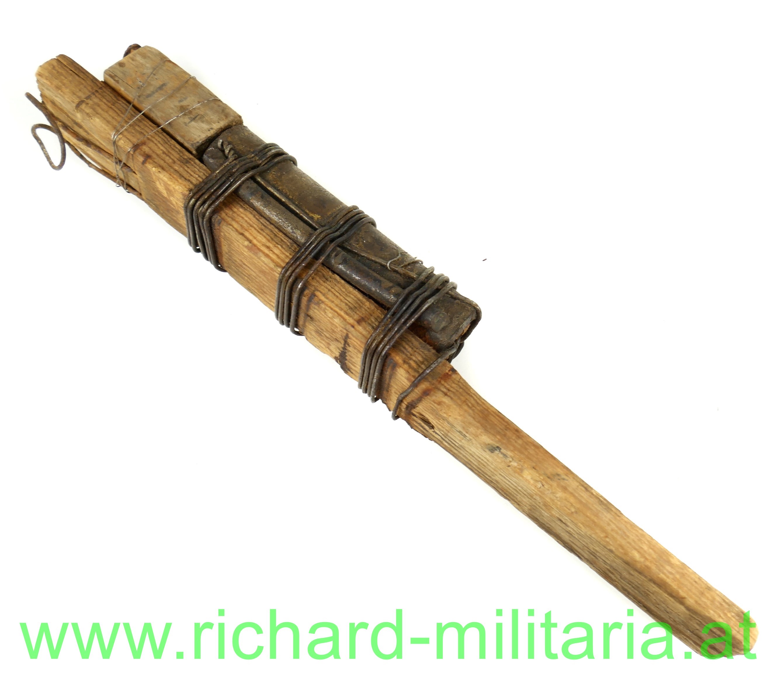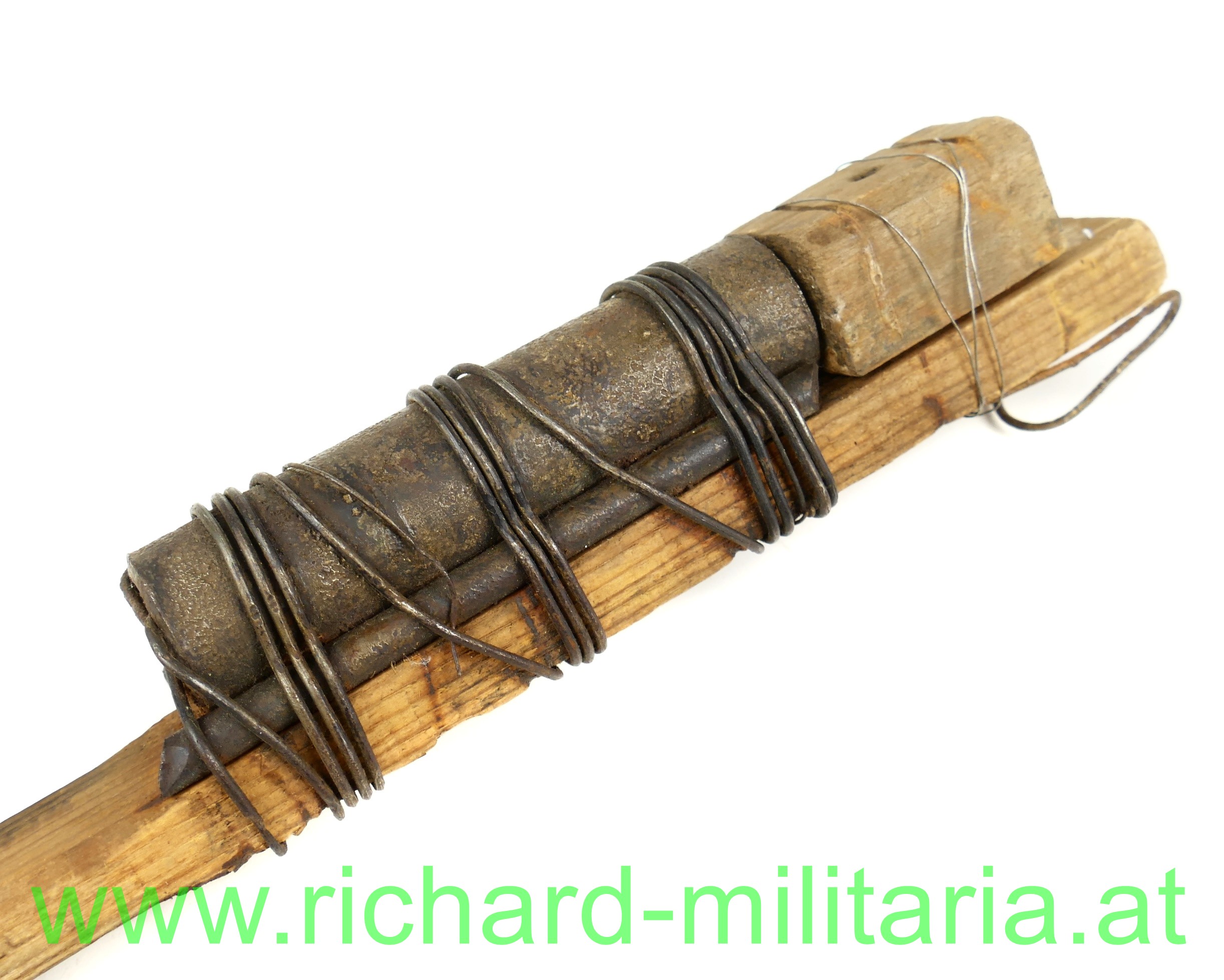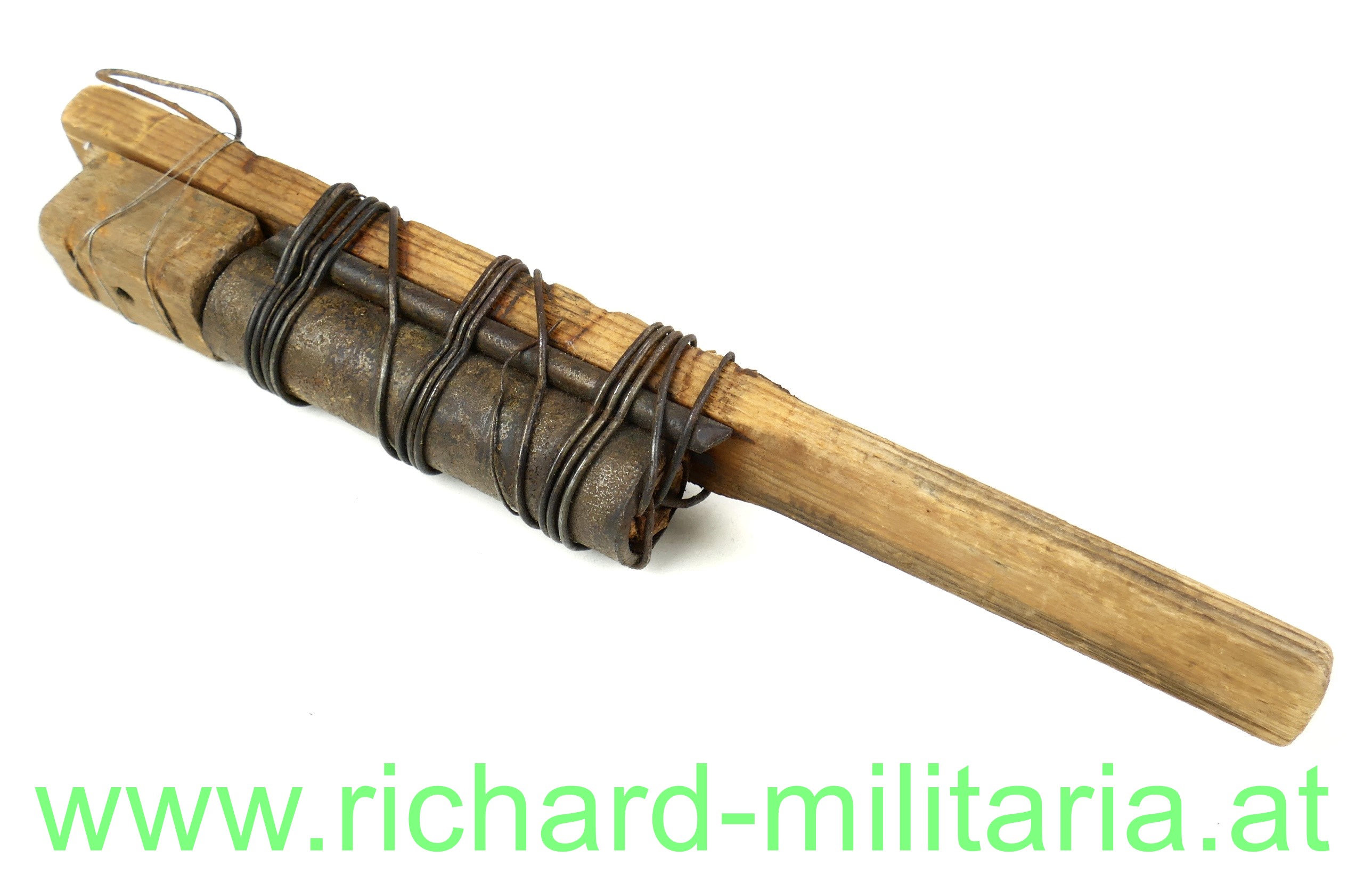 Sehr schön und detailgetreu NEU gefertigte Behelfshandgranate des 1. Weltkrieg aus Frankreich; Holzgriff mit hölzener Zündbox und darunter dem Sprengkopf aus Eisen; alle Teile mit Draht am Holzgriff befestigt; teilweise unter Verwendung zeitgenössischer Metallteile;