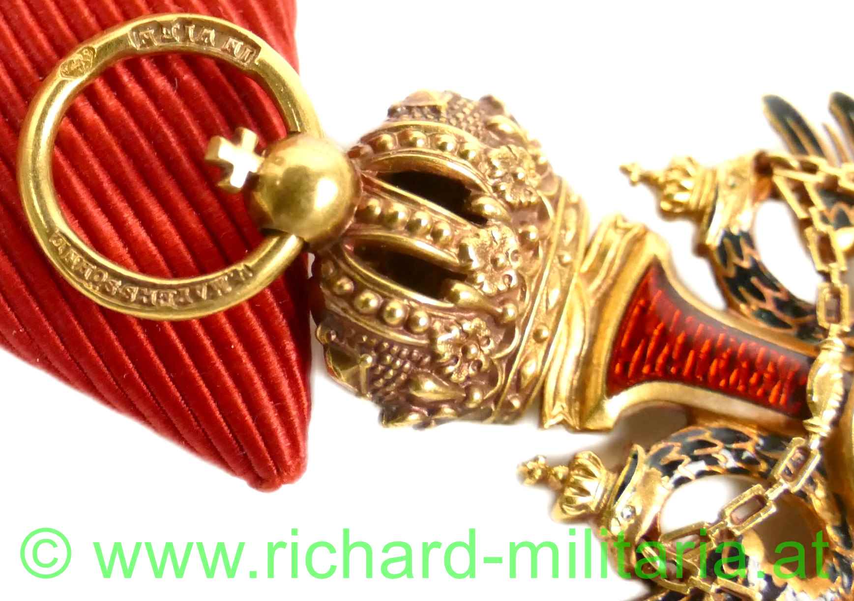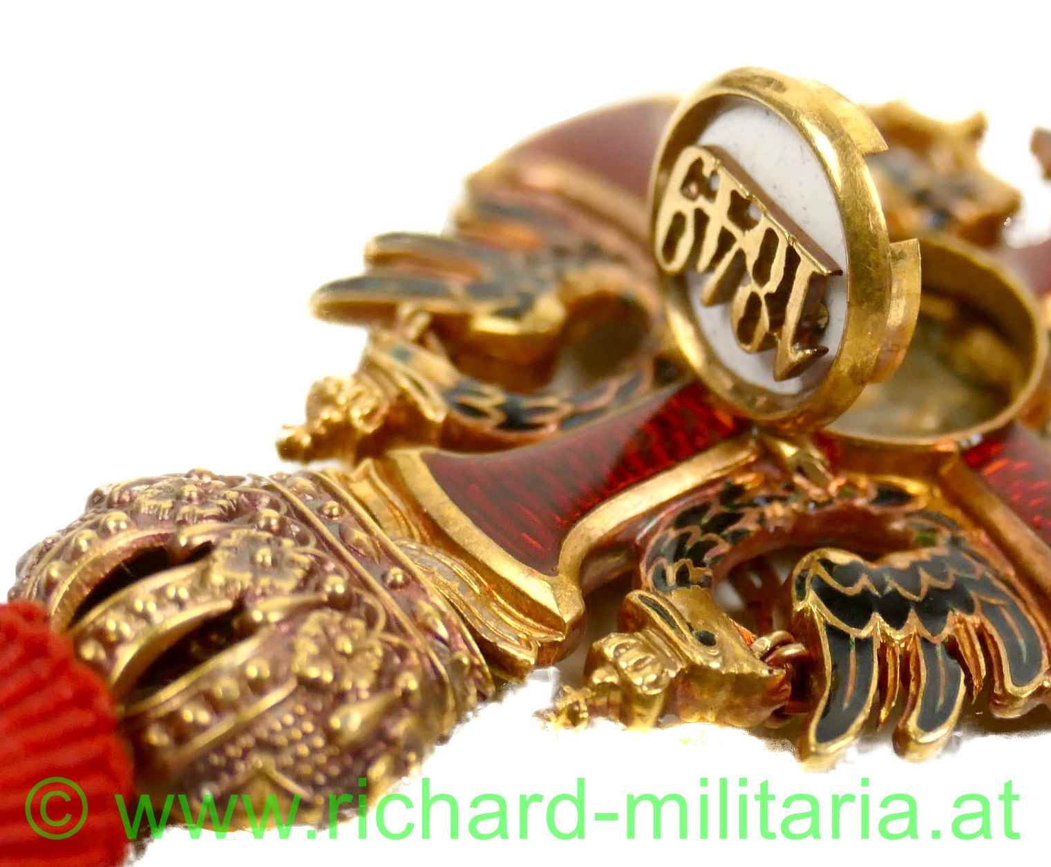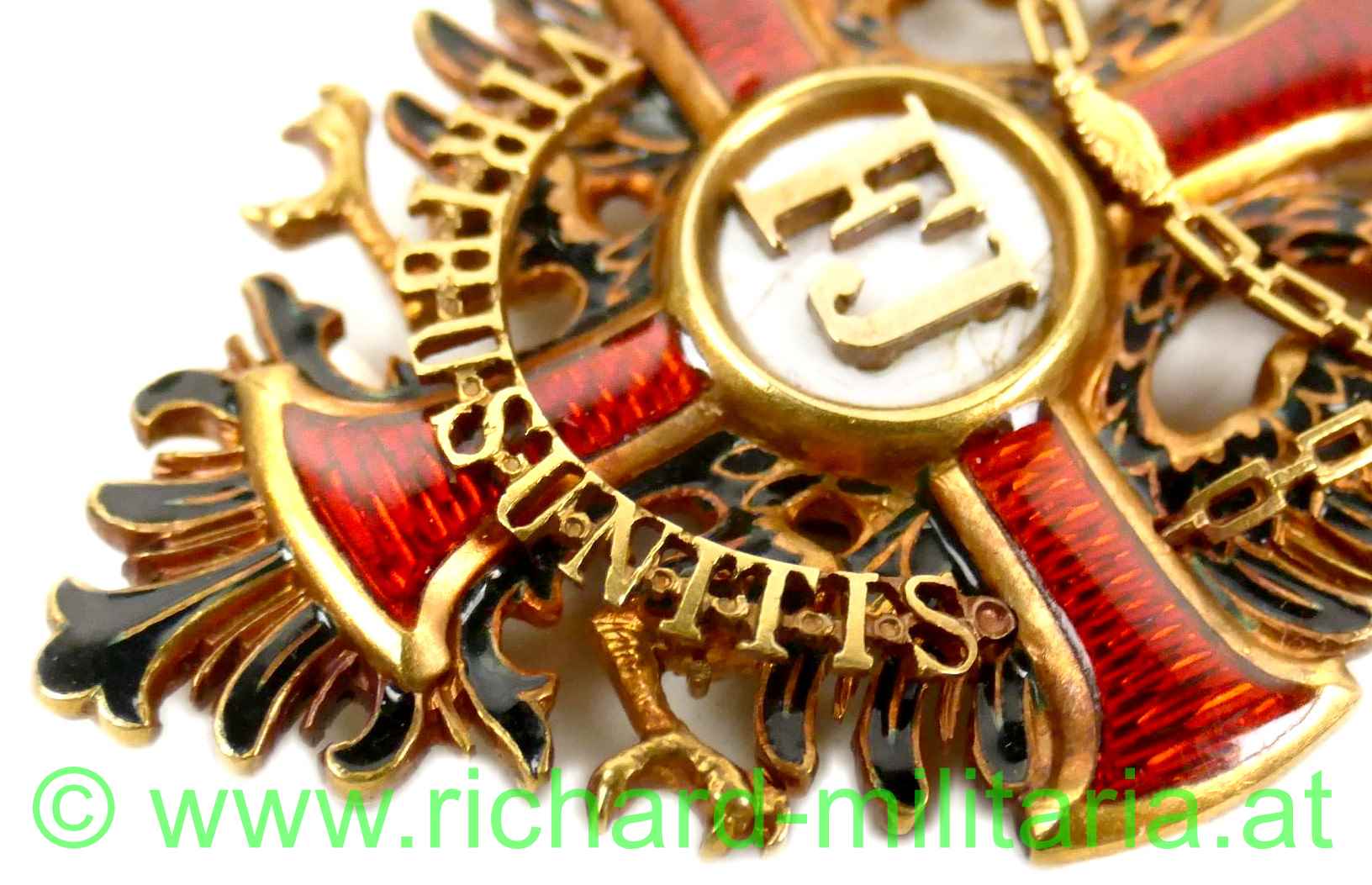 Kaiserlicher Franz Josef-Orden, Ritterkreuz; feinste Fertigung aus GOLD, im Ring Hersteller "V. Mayers & Söhne, Wien" und Goldpunzierung; rückseitiges Mittelmedaillon mit Scharnier; rotes Band, am Avers weißes Mittelmedaillon mit Sprungbildung; - ansonsten keine weiteren Emailfehler;