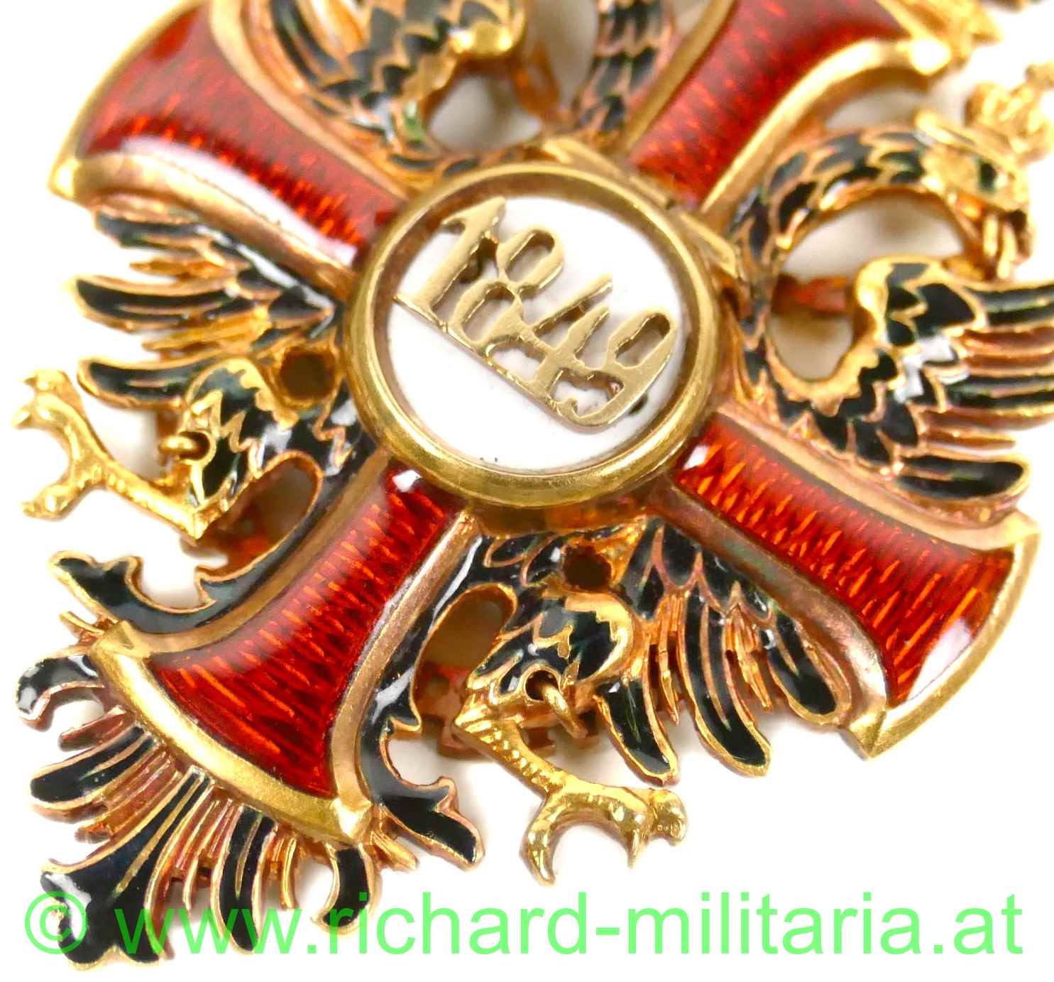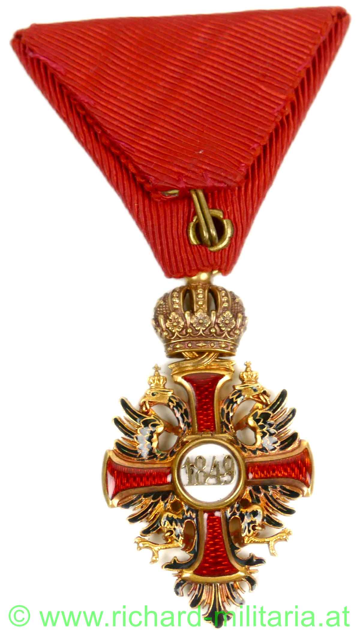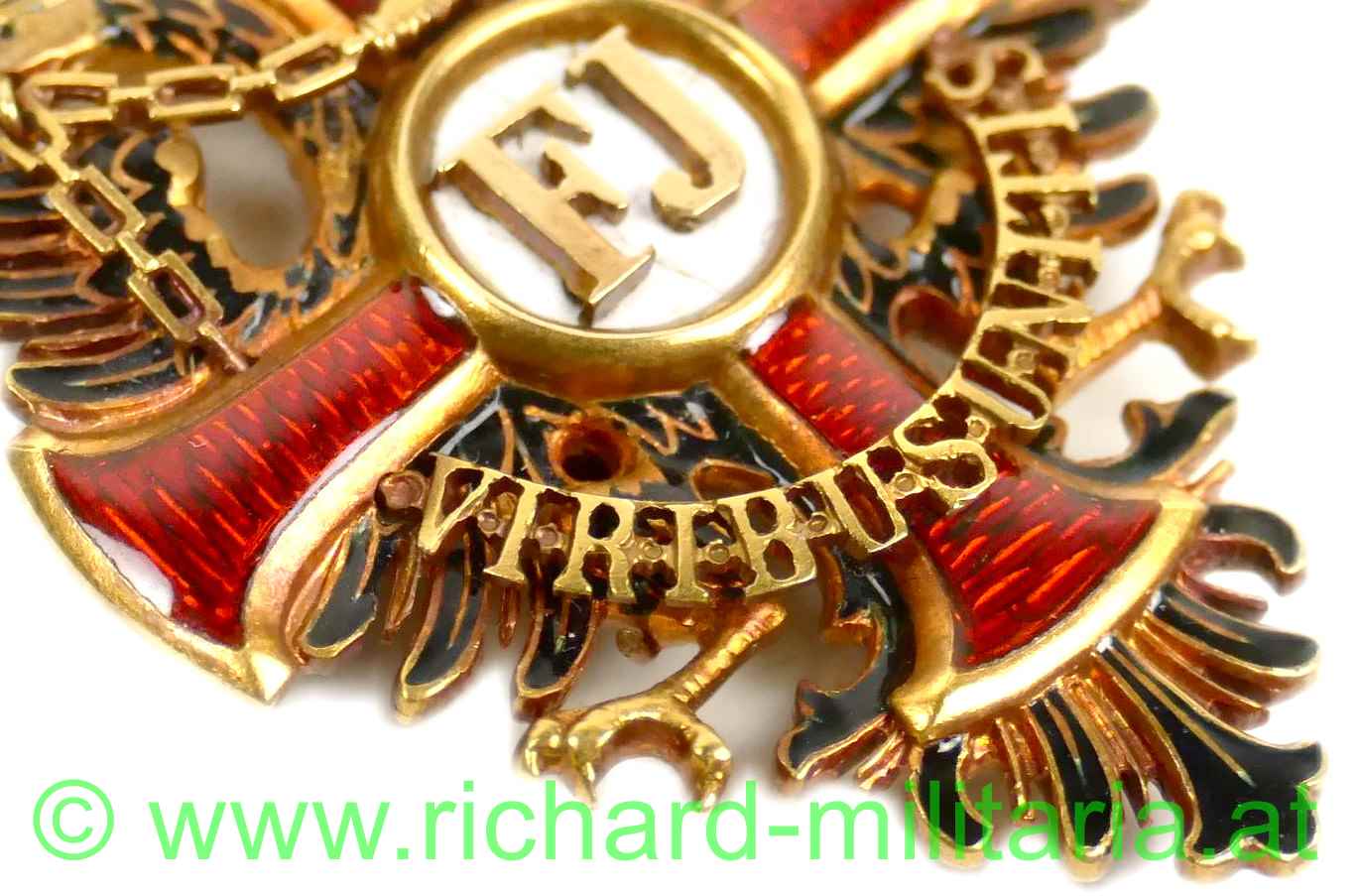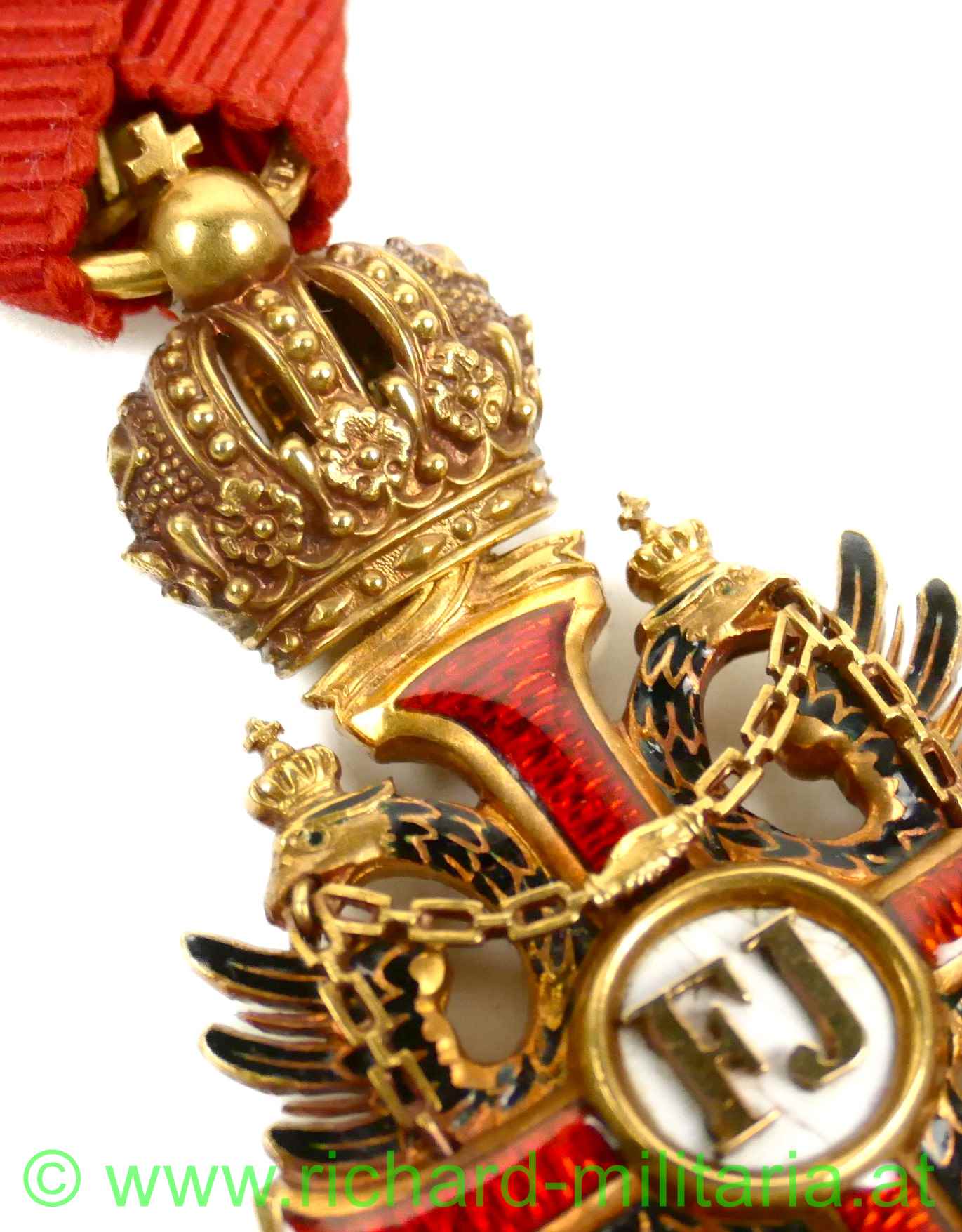 Kaiserlicher Franz Josef-Orden, Ritterkreuz; feinste Fertigung aus GOLD, im Ring Hersteller "V. Mayers & Söhne, Wien" und Goldpunzierung; rückseitiges Mittelmedaillon mit Scharnier; rotes Band, am Avers weißes Mittelmedaillon mit Sprungbildung; - ansonsten keine weiteren Emailfehler;