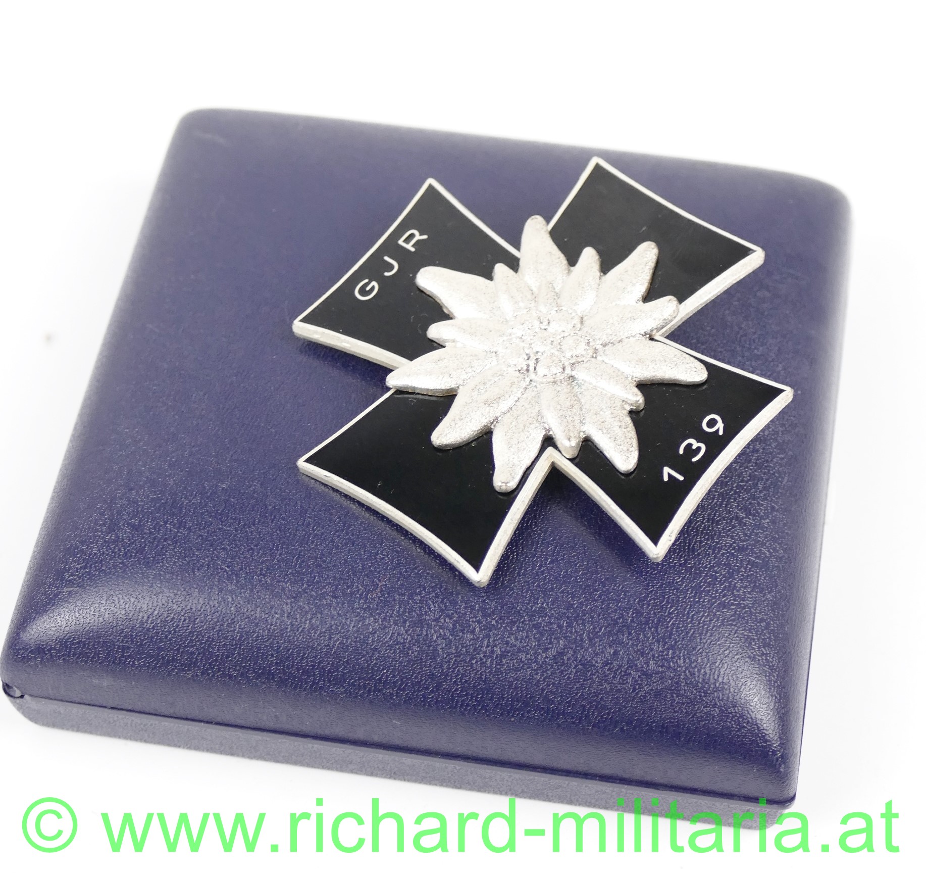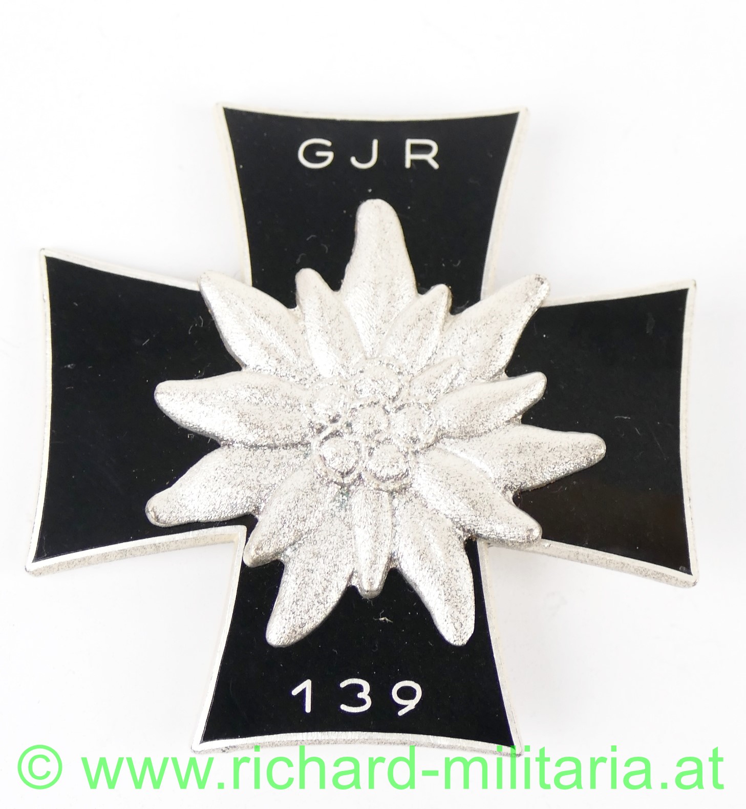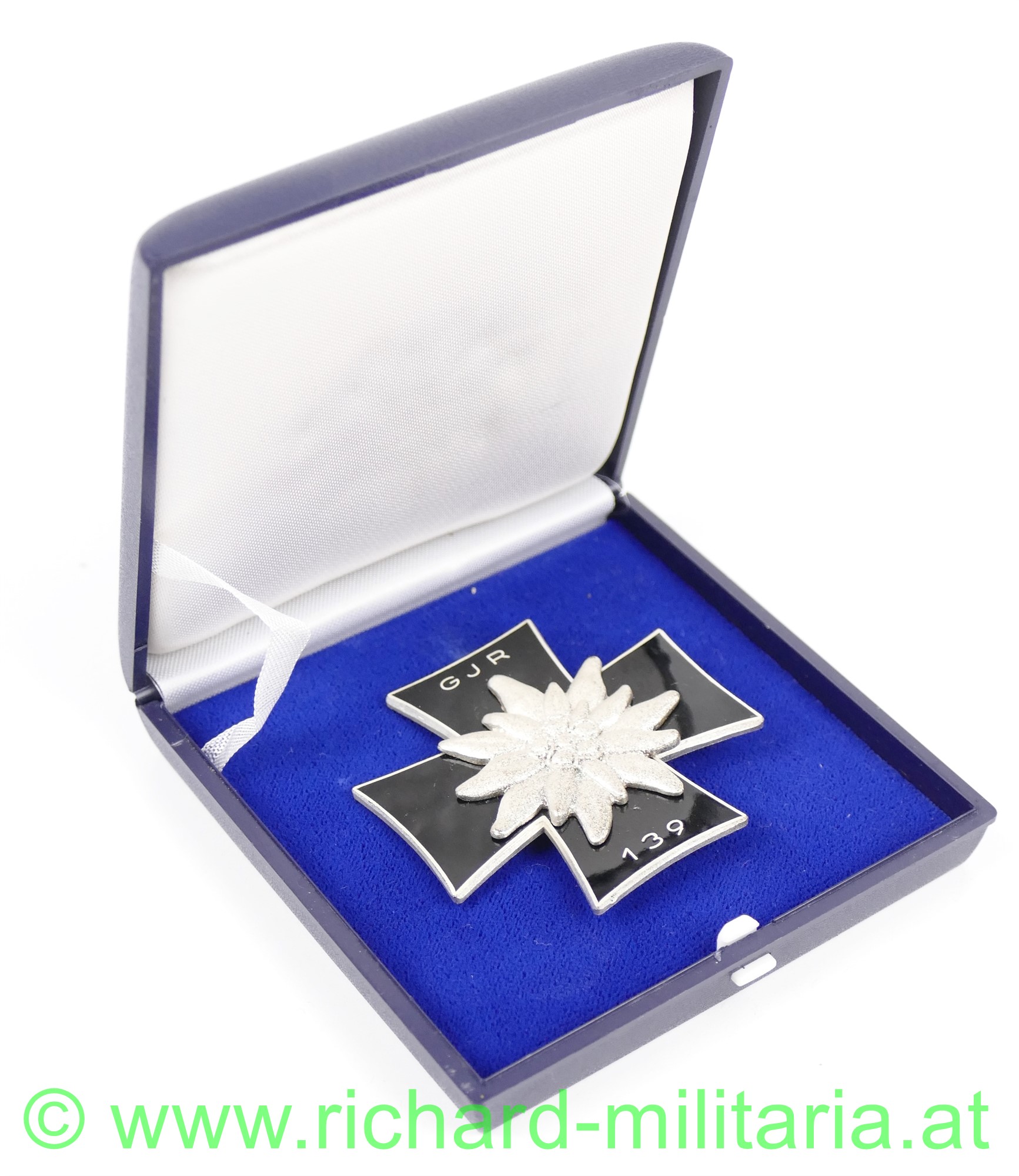 Abzeichen des Traditionsverbandes Ehemaliger Angehöriger des Gebirgsjäger-Regimentes 139, Bruststeckkreuz aus versilbertem Buntmetall schwarz emailliert und mittig aufgelegtem Edelweiss, im originalen Etui