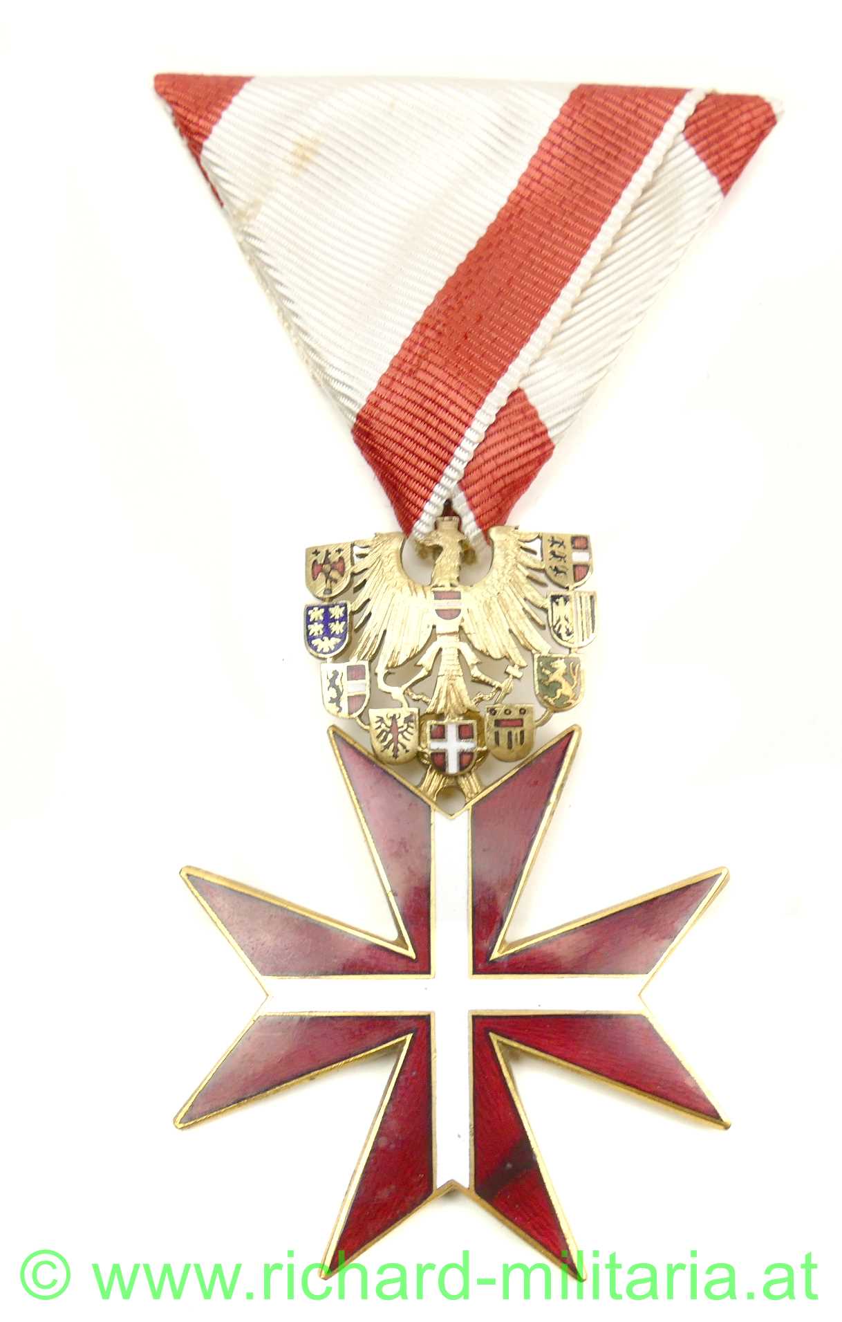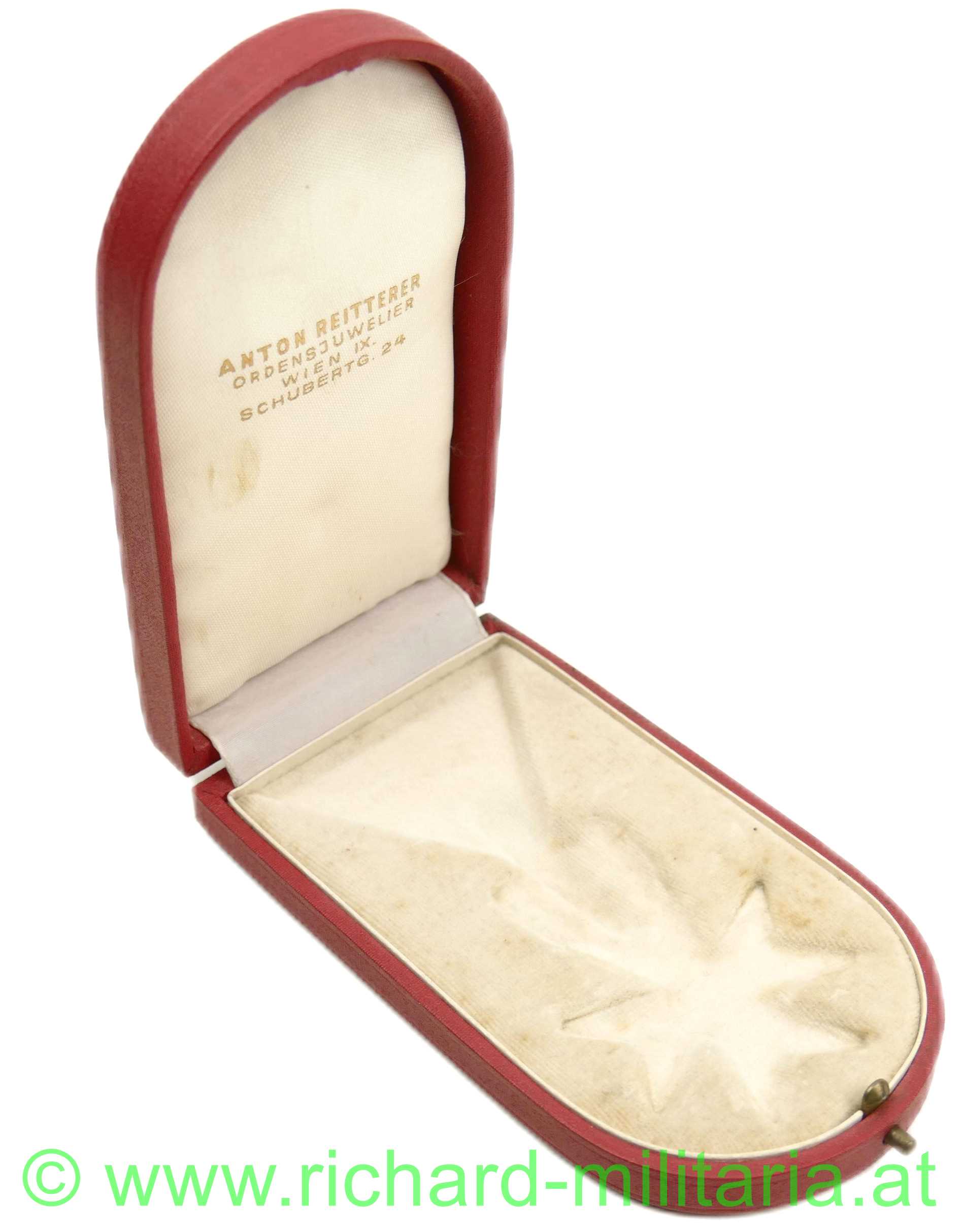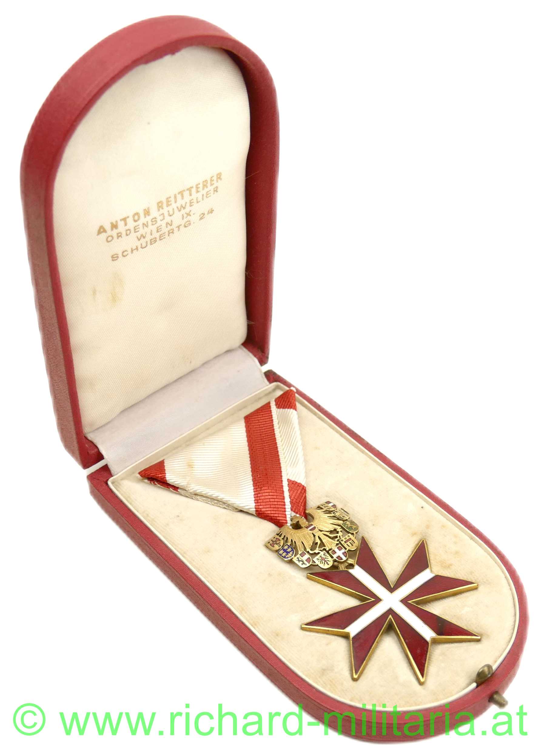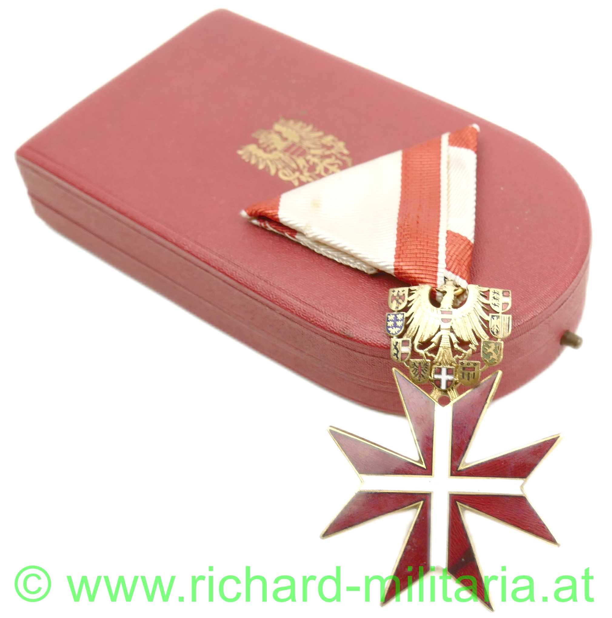 Goldenes Ehrenzeichen für Verdienste um die Republik Österreich mit Etui, feine frühe Anfertigungsqualität mit ausgeschnittenen Flügeln und Wappenschilden, Tombak vergoldet emailliert, originales Band; im Etui Hersteller: "Anton Reitterer, Wien";