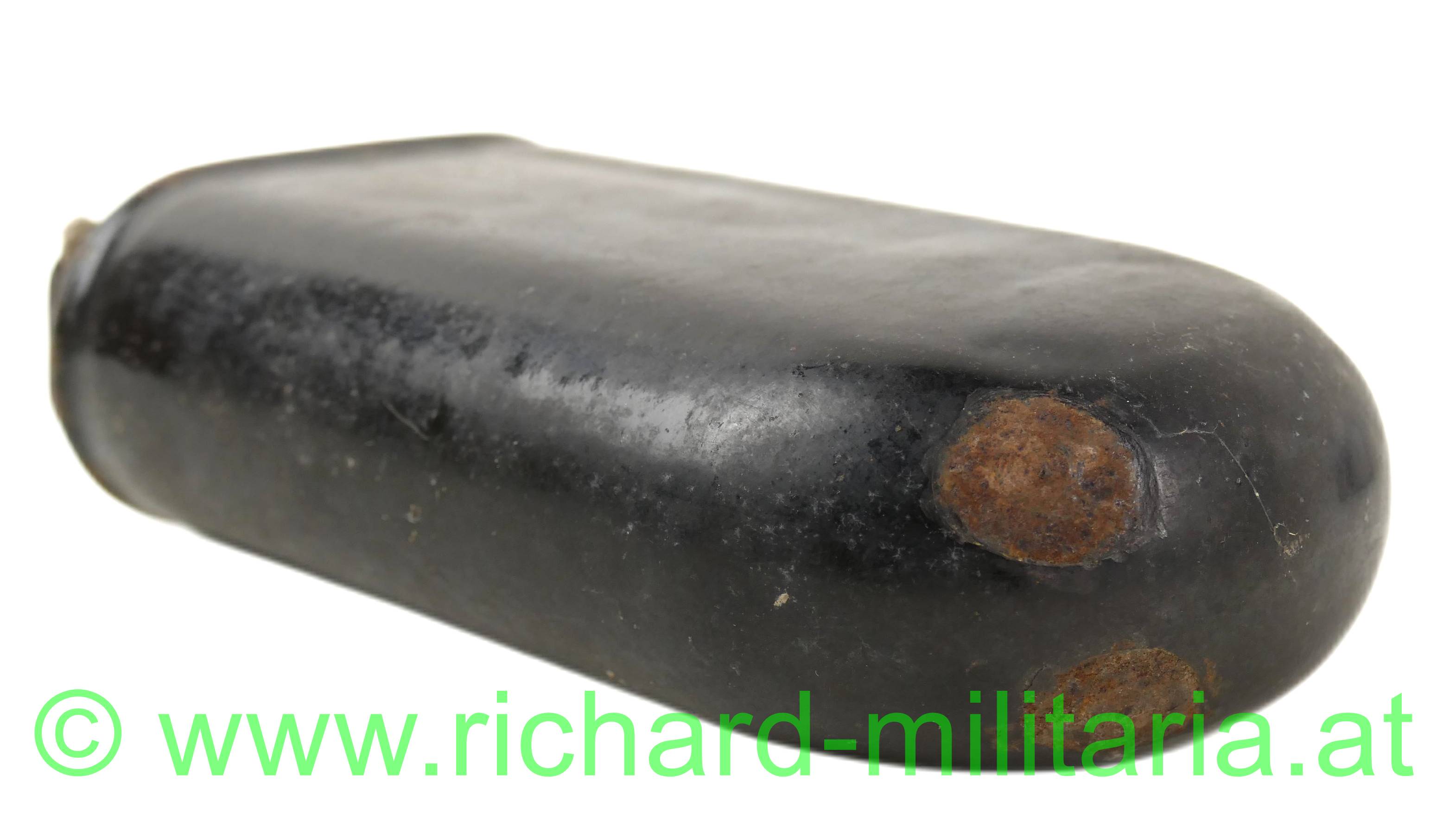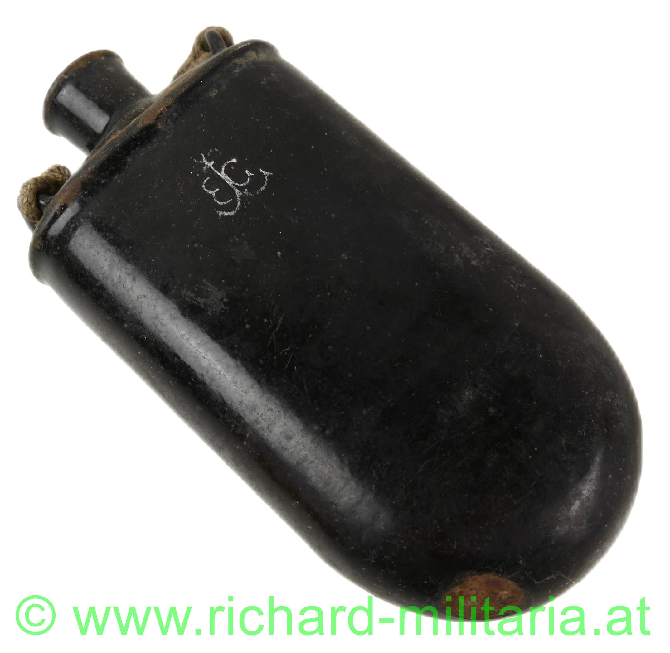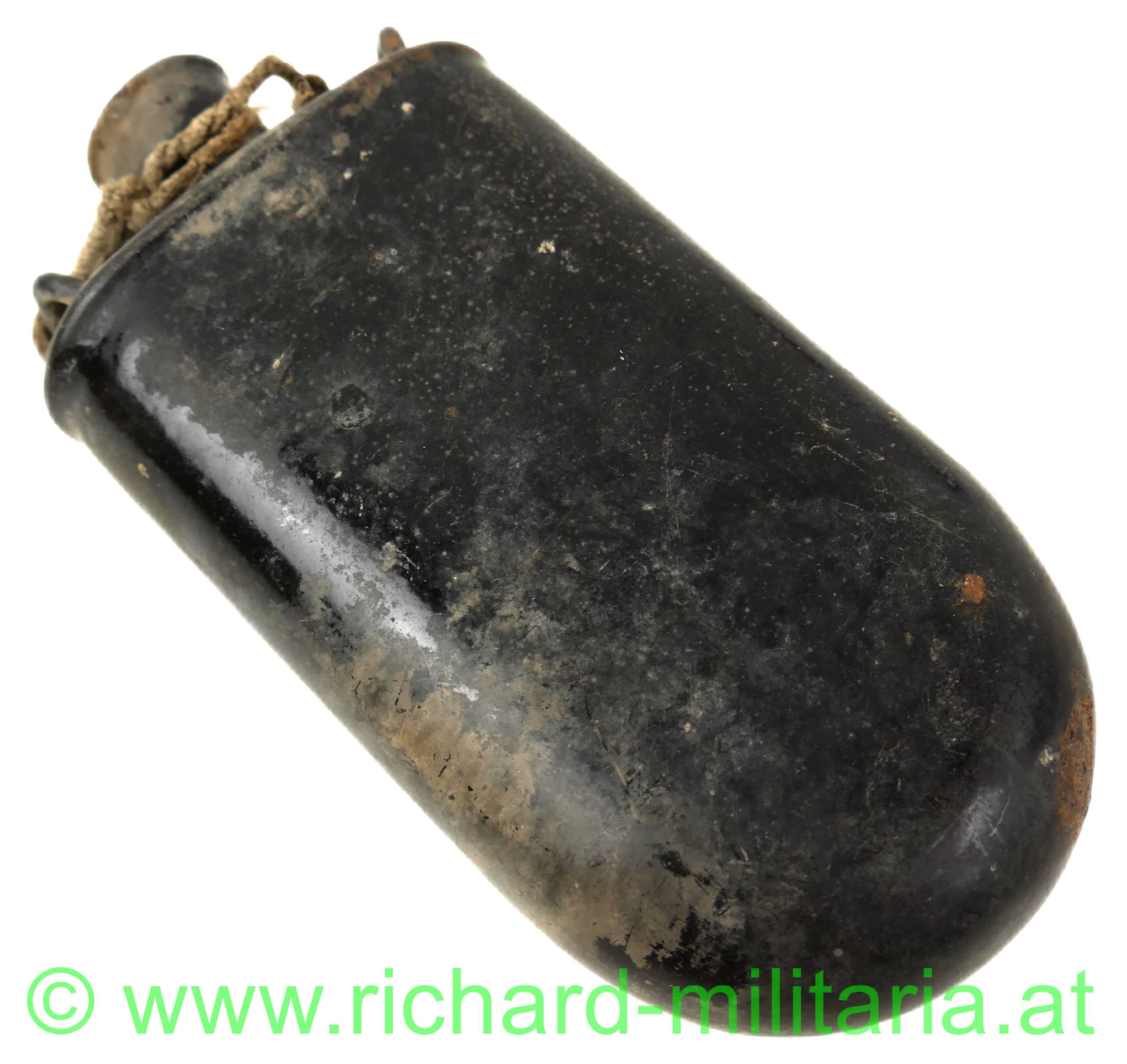 k.u.k Feldflasche, schwarz Email, Emailchips durch Gebrauch, mit Hersteller, Reste der original Verschnürung,