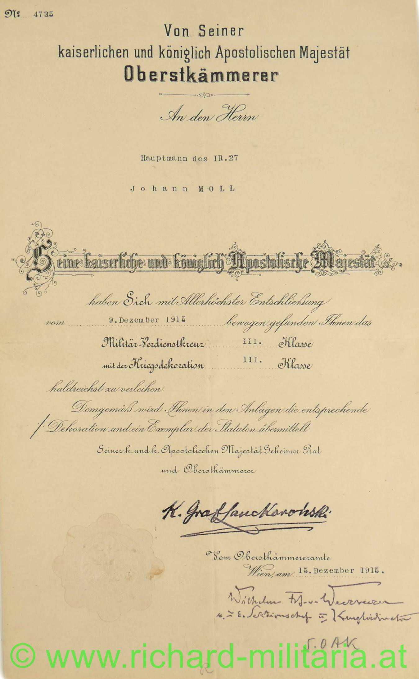 k.u.k. 2 Urkunden f. Auszeichnungen Hptm. Johann Moll - IR 27