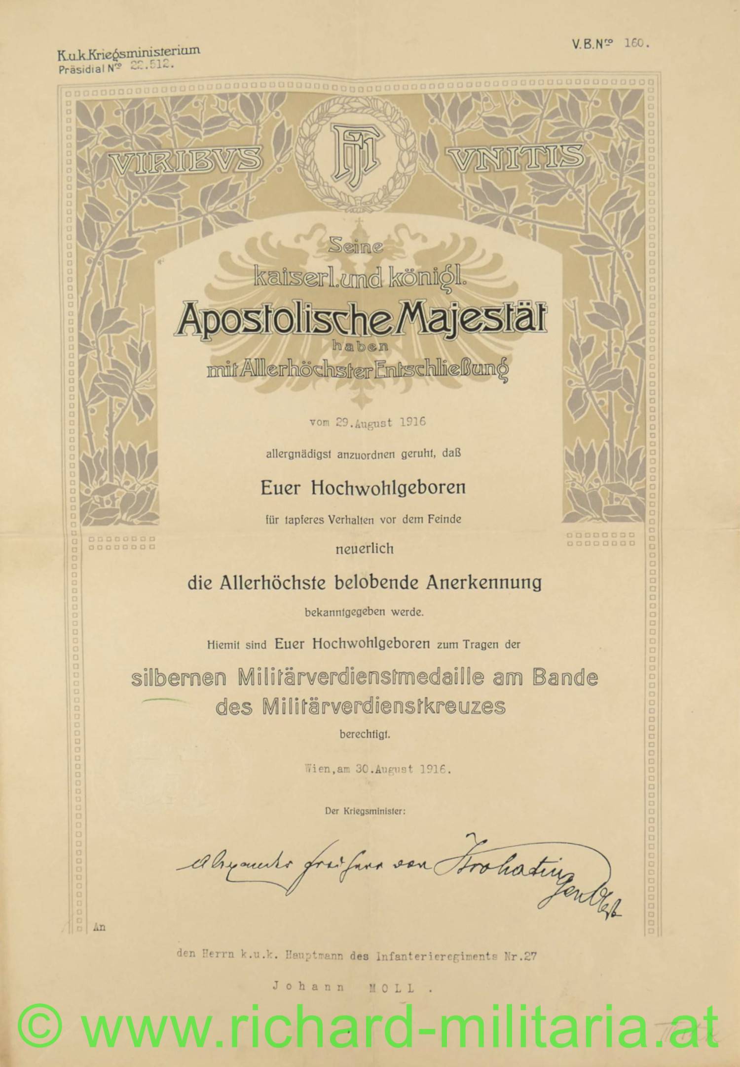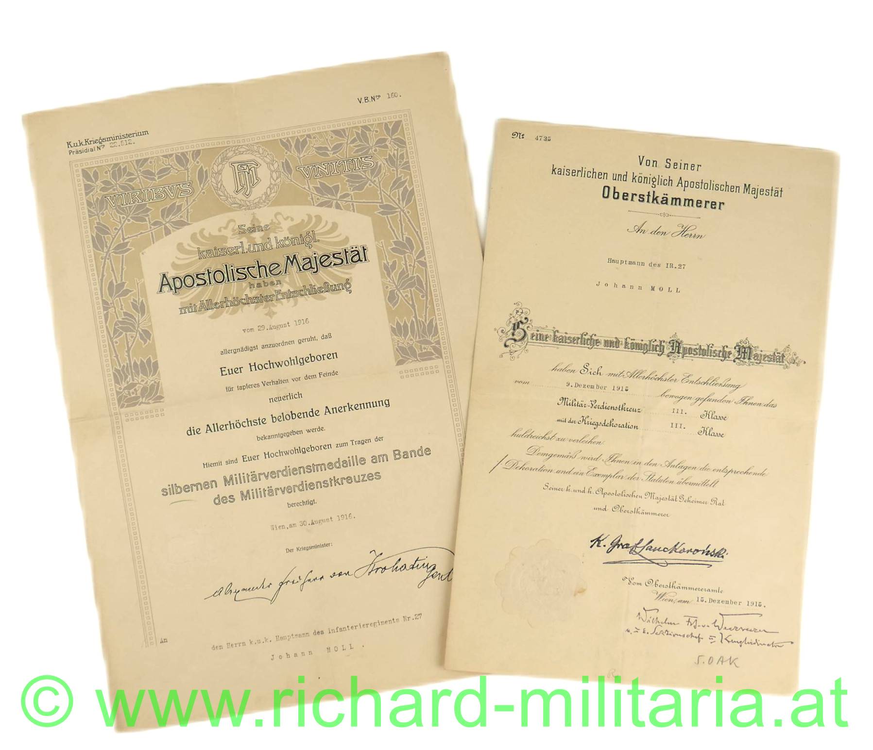 k.u.k. 2 Urkunden f. Auszeichnungen Hptm. Johann Moll, Infanterie Regiment Nr. 27: