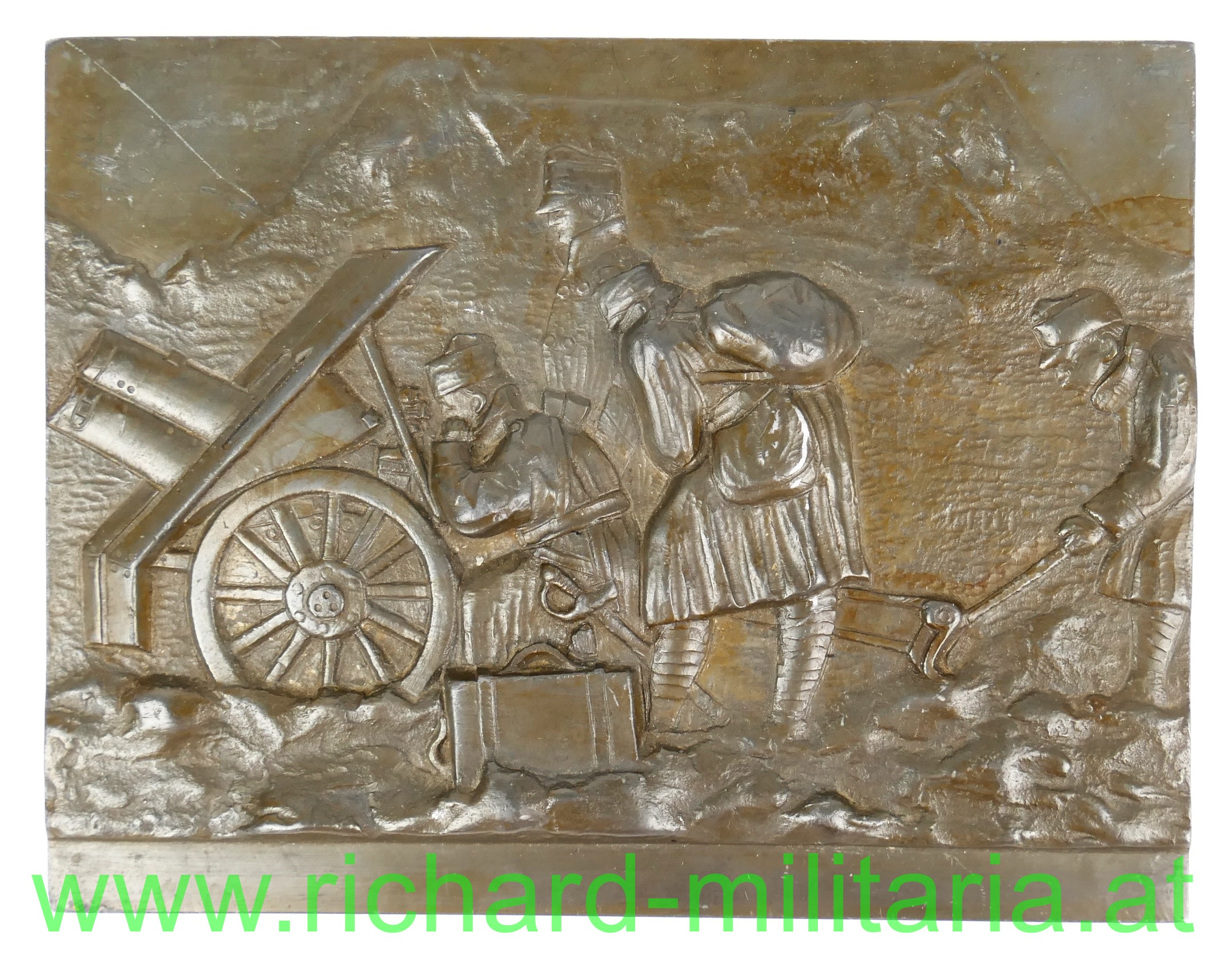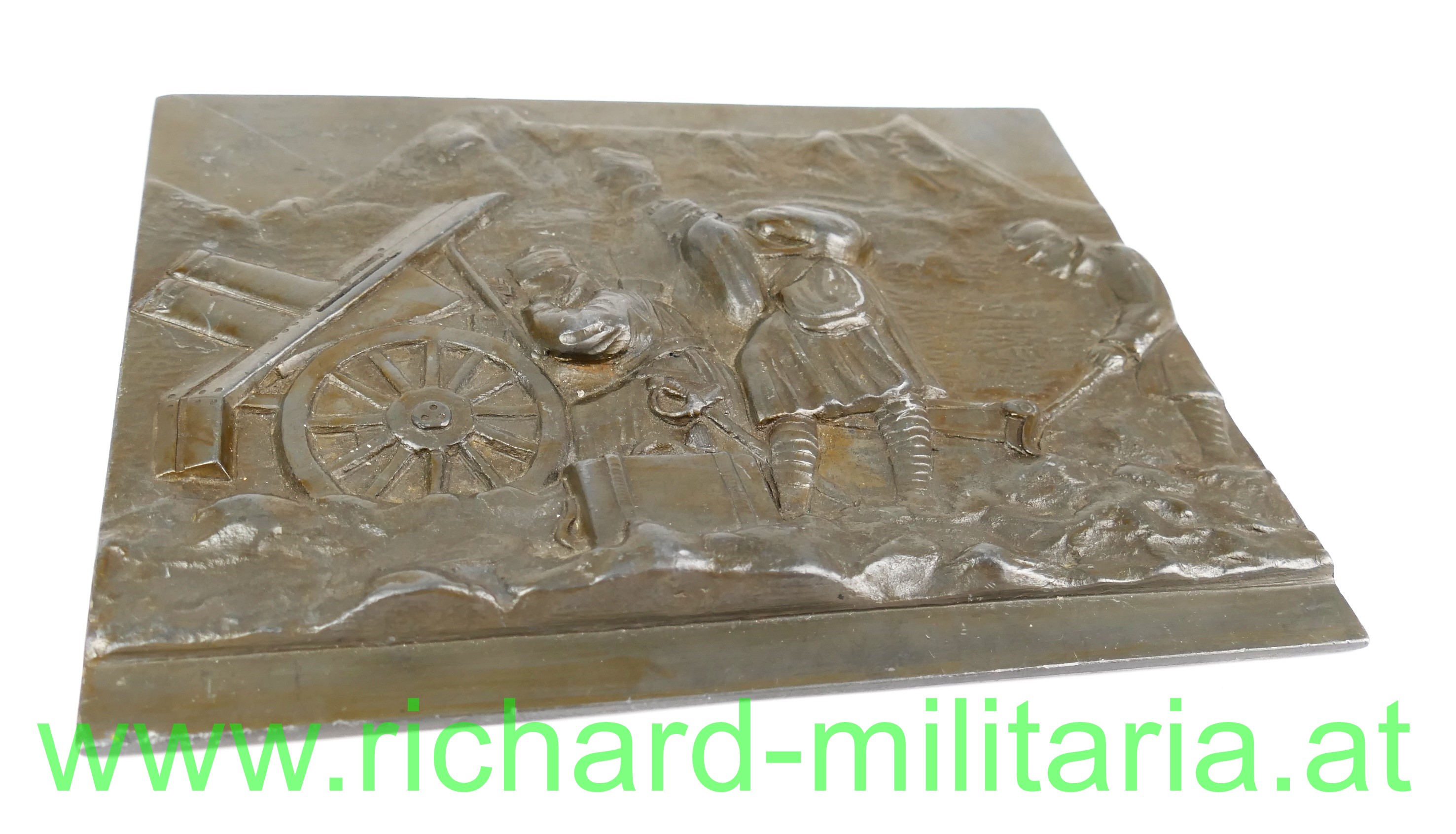 k.u.k. Gebirgsartillerie - Metallrelief, Darstellung einer feuernden Gebirgskanone mit 4 k.u.k. Soldaten, die sie bedienen; schweres Metall - nicht magnetisch; rückseitig Prägestempel oder Meisterzeichen " I H"; 19,5 x 15 cm; matt bronziert