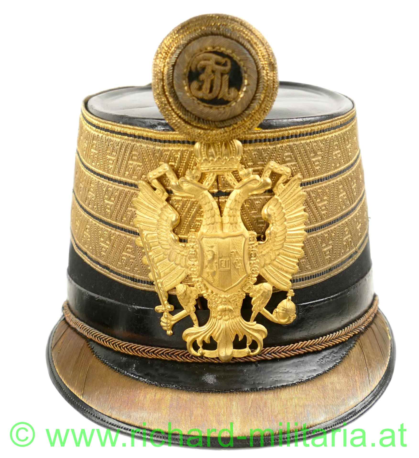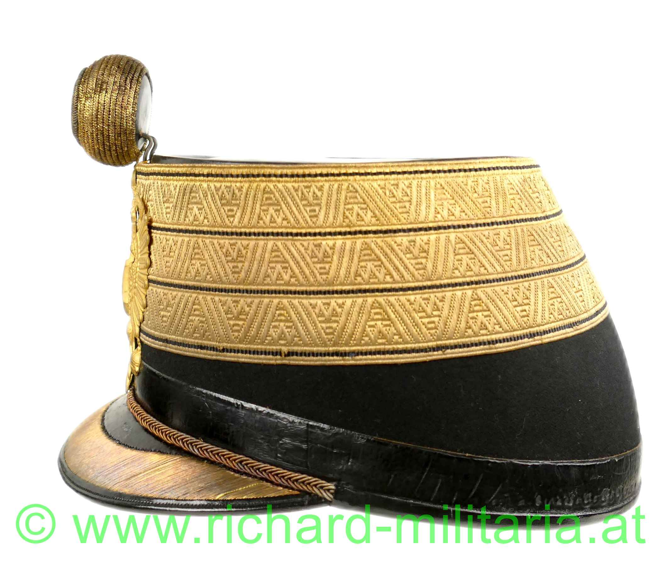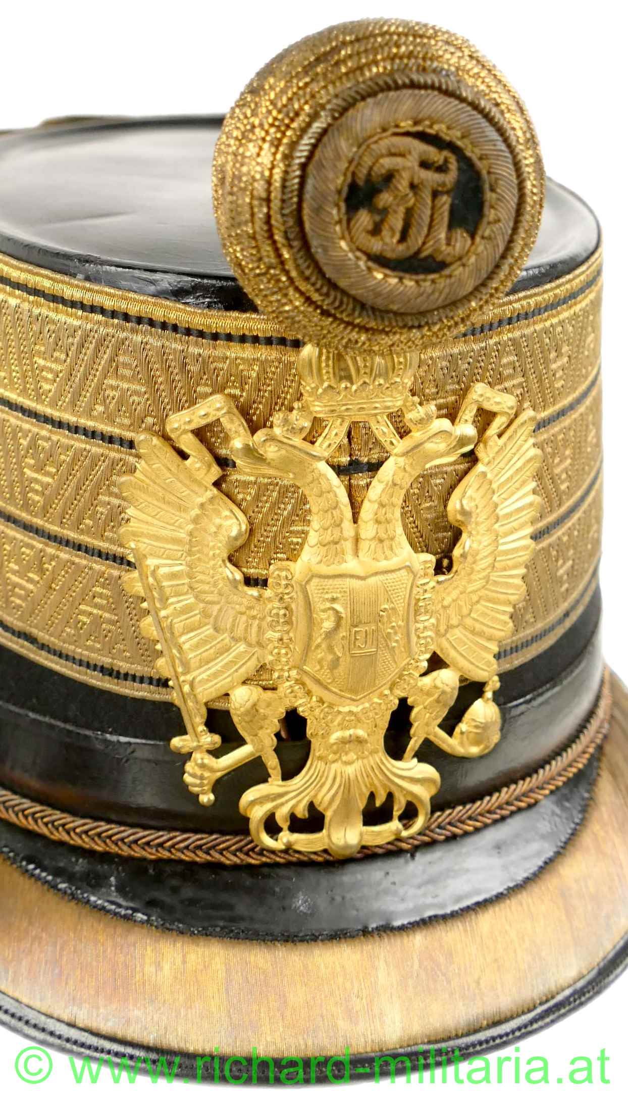 Infanterie-Tschako für Stabsoffiziere (Major, Oberstleutnant und Oberst) der k.u.k. Armee bis 1918 - personalisiert für OBERST DUBINA; Korpus mit schwarzem Wollstoffüberzug, breite - 3-teilige - goldene Tschako-Borte für Stabsoffiziere, Schirm aus schwarzem Lackleder mit Goldfäden bestickt und mit goldener Kordel besetzt, Doppeladler aus feuervergoldeten Messing, Kokarde aus Goldbouillon mit den Initialen FJI, Größe 58; Borten leicht gedunkelt; braun unterlegter Schirm; weinrotes Seidenfutter ohne Hersteller - personalisiert: "E. Dubina", braunes Schweißleder; dazu passender Wachstuchüberzug in sehr guter Erhaltung, dazugehöriger Tschakokoffer aus schwarzem Leder, am Tragegriff aufgeklammertes metallenes Namensschild: "OBERST E. DUBINA"; Verschlussriemen in voller Länge - Messingabschluss mit Herstellerkürzel - Gegenstück am Koffer fehlt;