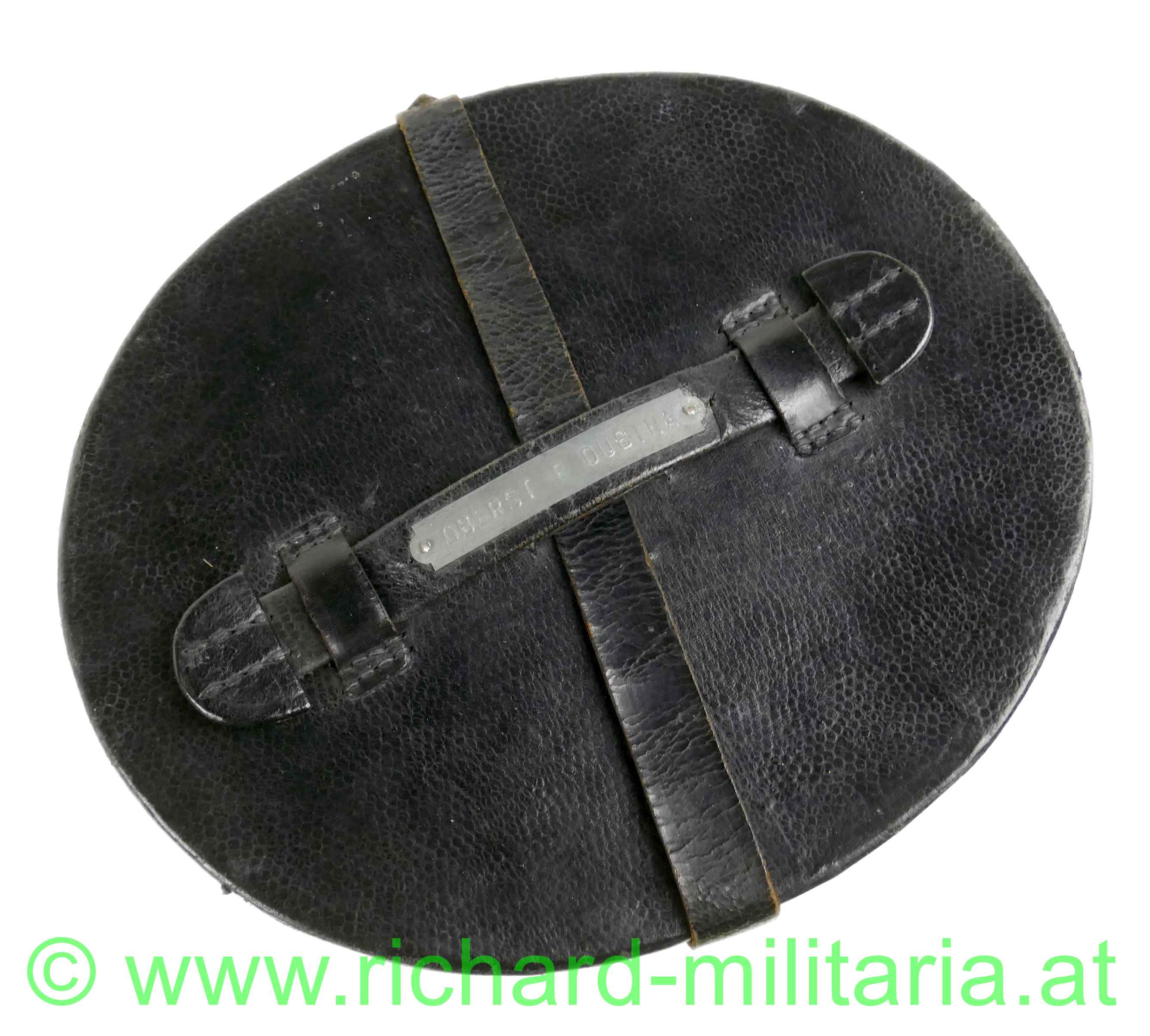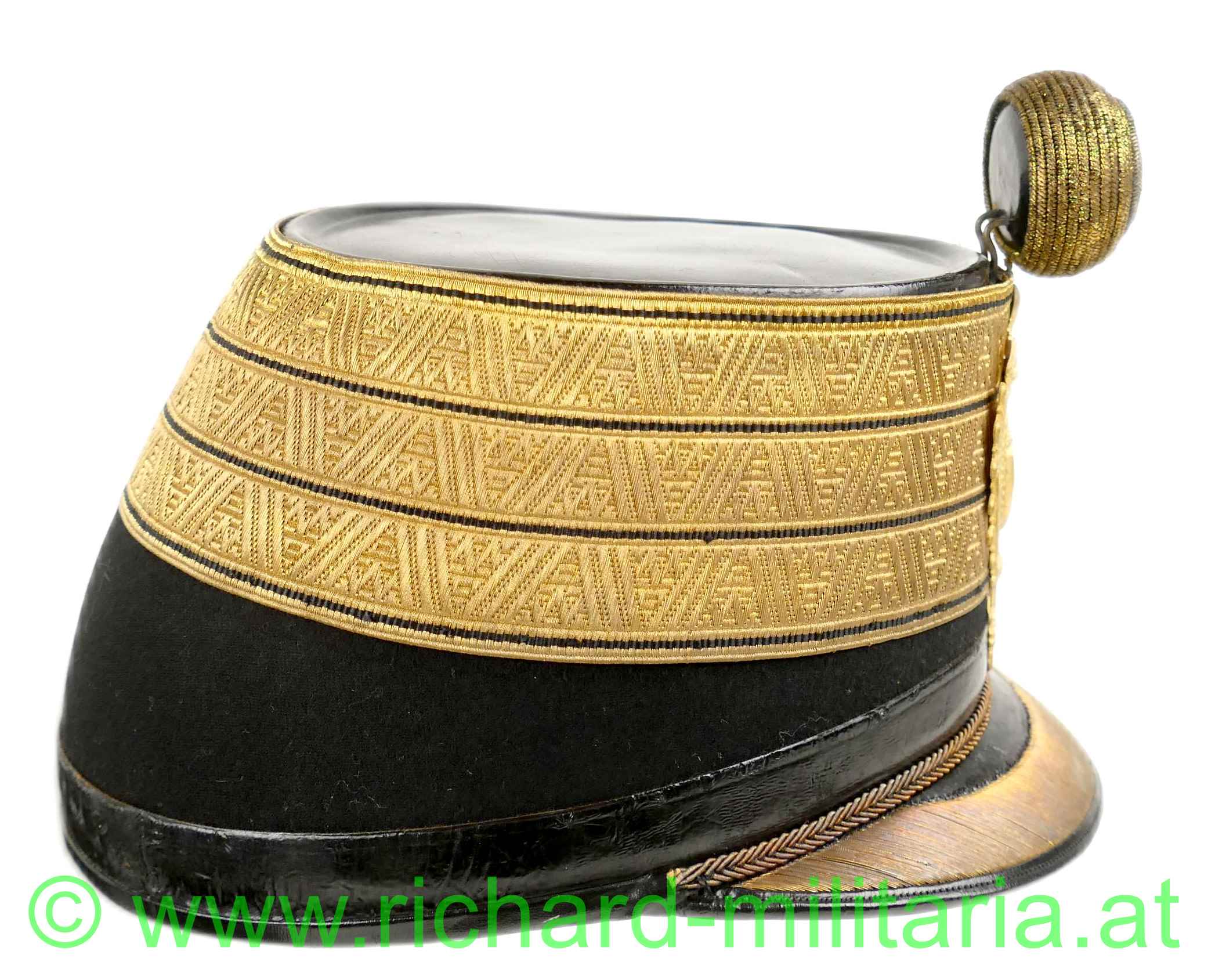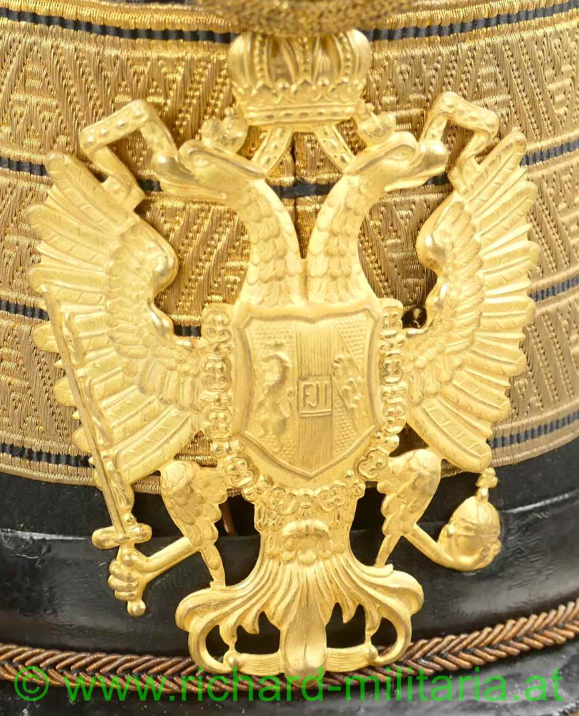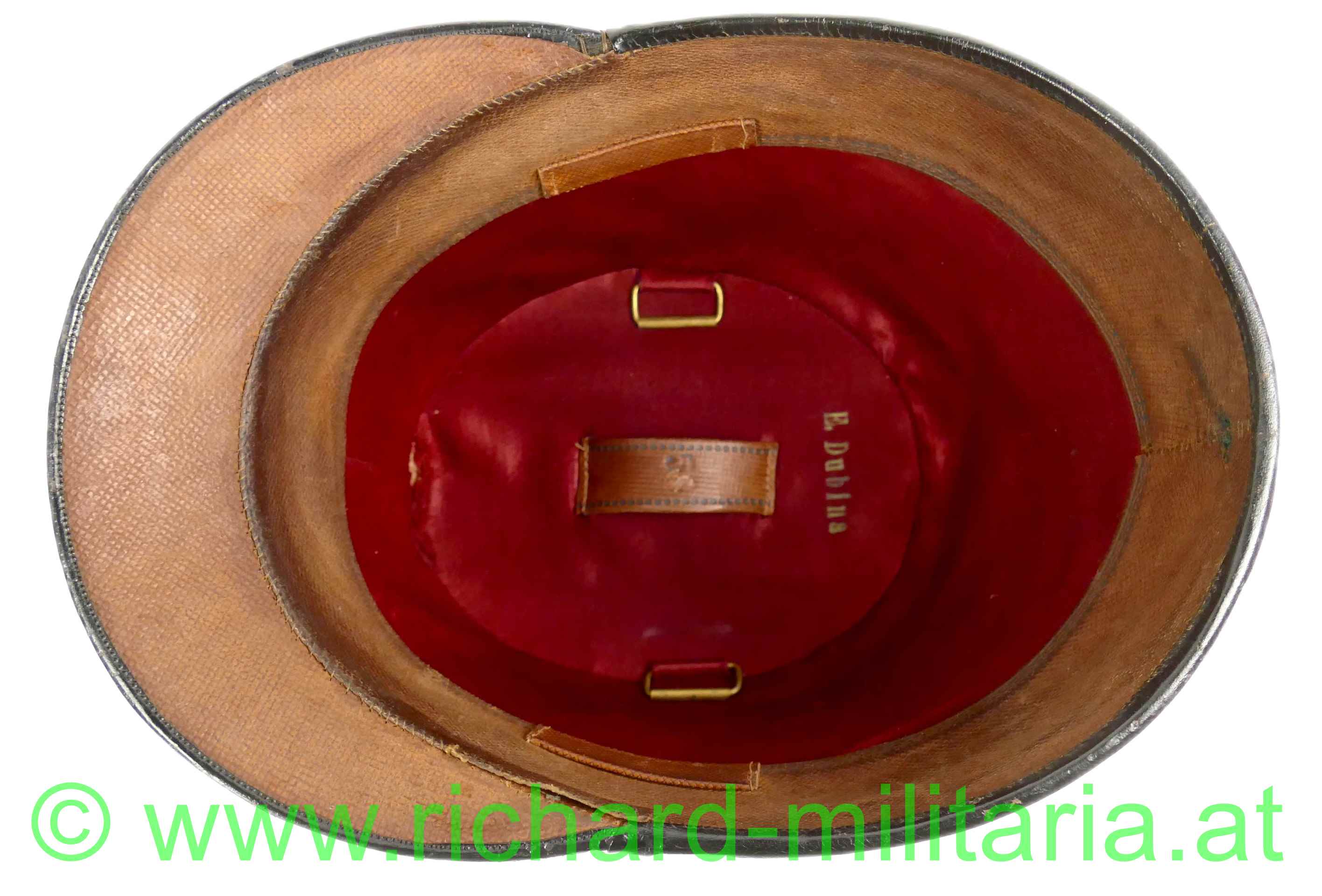Infanterie-Tschako für Stabsoffiziere (Major, Oberstleutnant und Oberst) der k.u.k. Armee bis 1918 - personalisiert für OBERST DUBINA; Korpus mit schwarzem Wollstoffüberzug, breite - 3-teilige - goldene Tschako-Borte für Stabsoffiziere, Schirm aus schwarzem Lackleder mit Goldfäden bestickt und mit goldener Kordel besetzt, Doppeladler aus feuervergoldeten Messing, Kokarde aus Goldbouillon mit den Initialen FJI, Größe 58; Borten leicht gedunkelt; braun unterlegter Schirm; weinrotes Seidenfutter ohne Hersteller - personalisiert: "E. Dubina", braunes Schweißleder; dazu passender Wachstuchüberzug in sehr guter Erhaltung, dazugehöriger Tschakokoffer aus schwarzem Leder, am Tragegriff aufgeklammertes metallenes Namensschild: "OBERST E. DUBINA"; Verschlussriemen in voller Länge - Messingabschluss mit Herstellerkürzel - Gegenstück am Koffer fehlt;