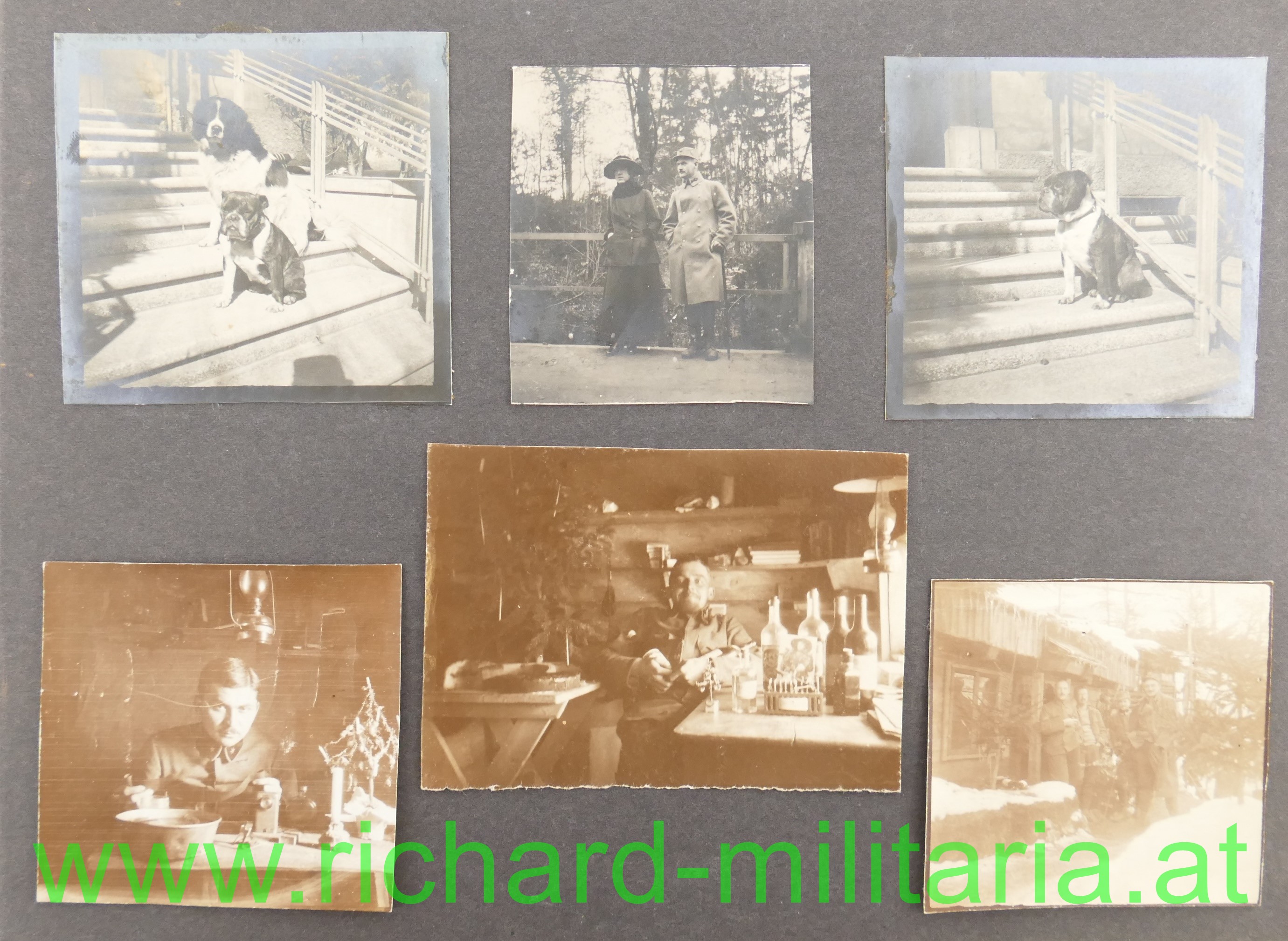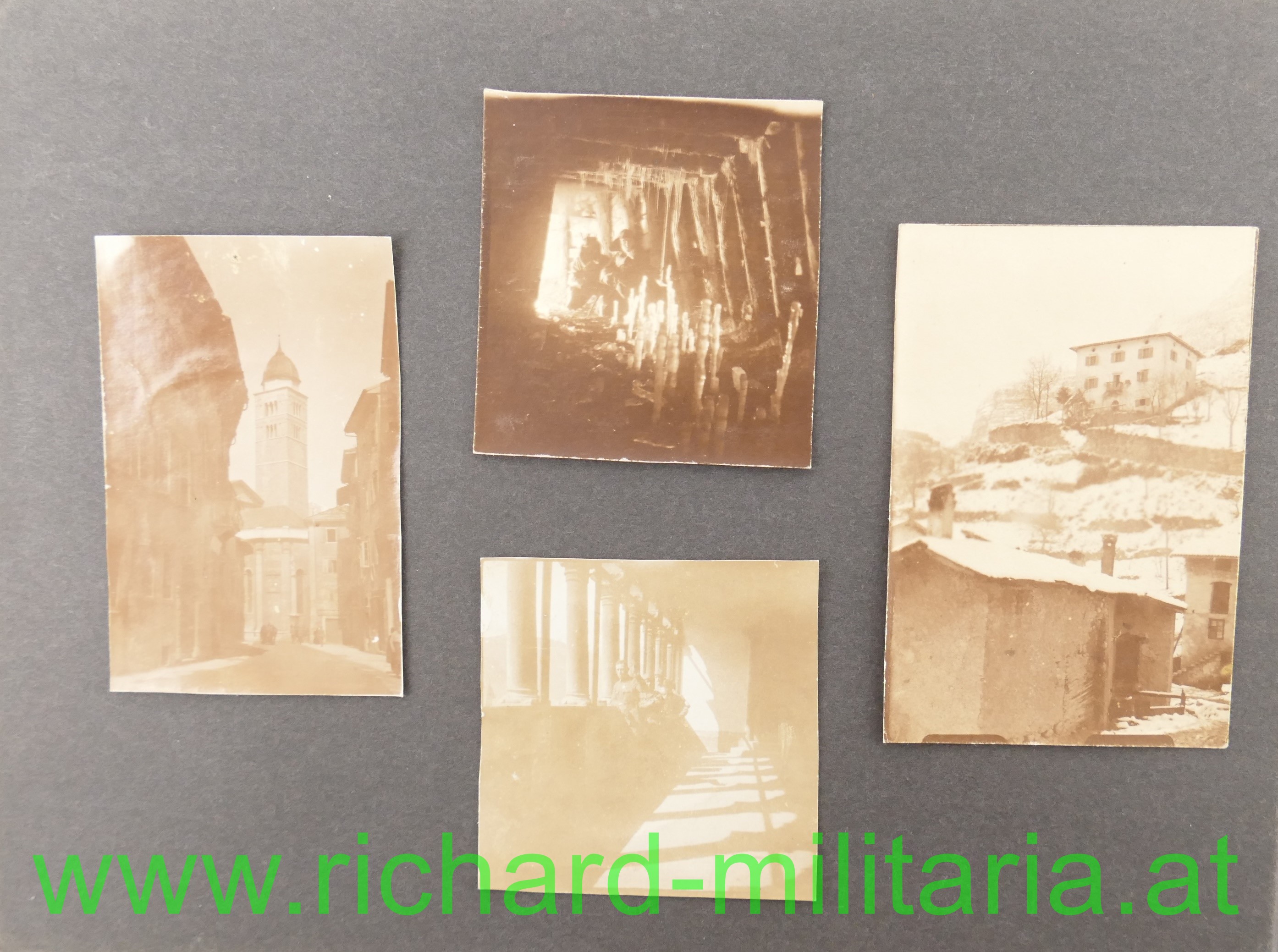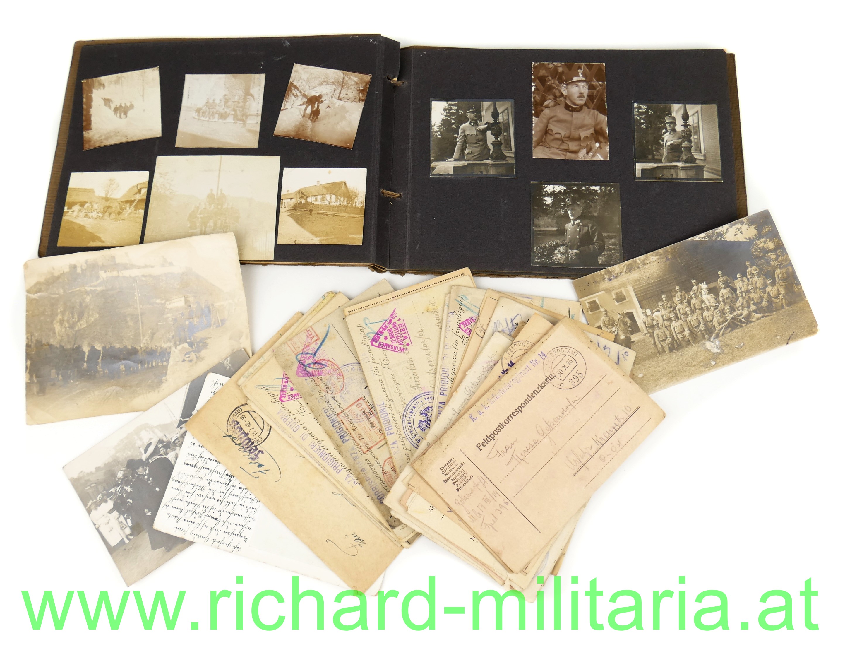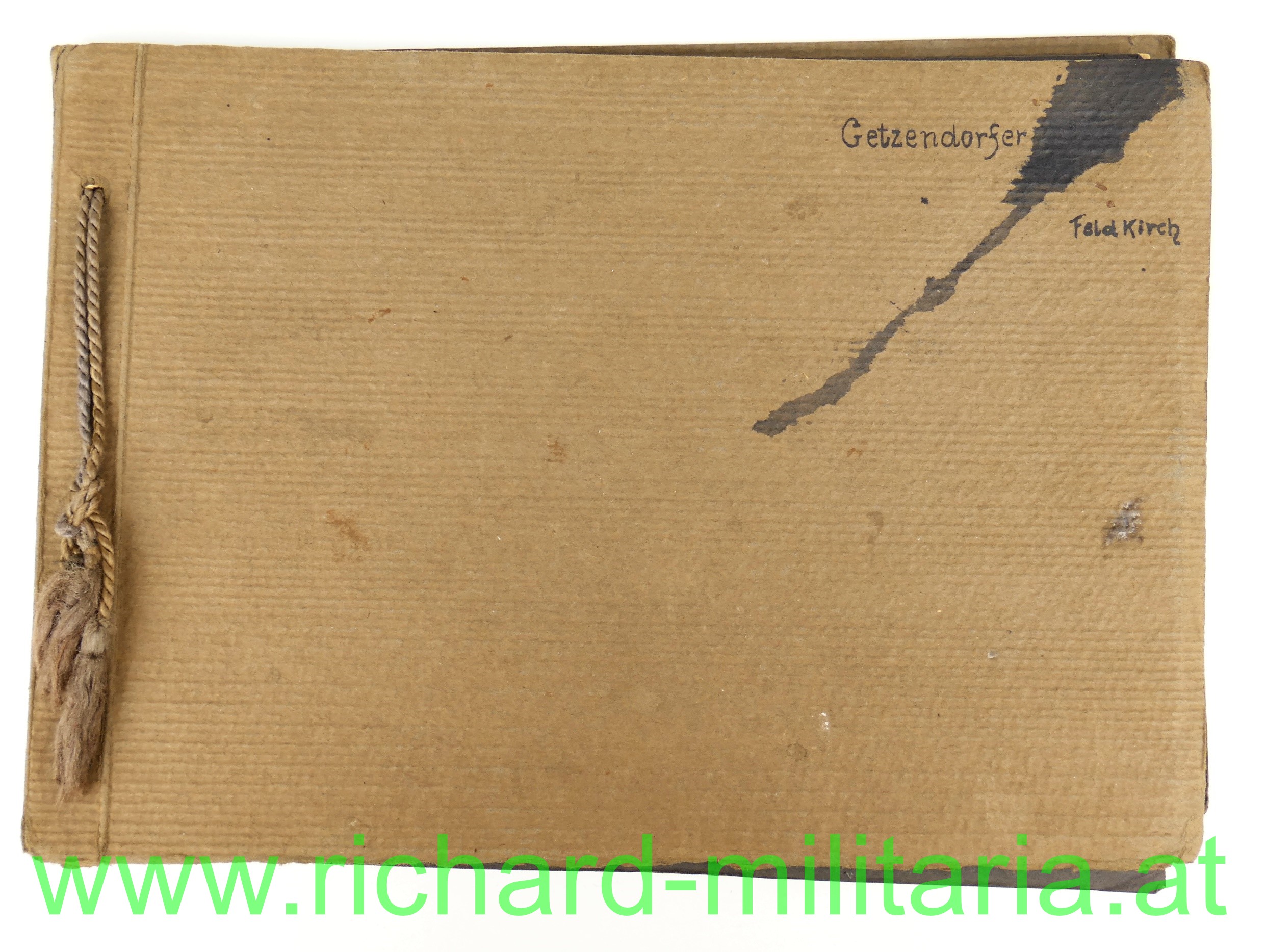 - einem Fotoalbum; am Umschlag beschrieben "Getzendorfer Feldkirch"; insgesamt 47 Fotos sauber zeitgenössisch in ein Fotoalbum eingeklebt; einige eindrucksvolle Fotos der Südfront gegen Italien dabei! Stellungen, Ortschaften, Leben im Felde... Format des Albums 24,8 x 17,3 cm