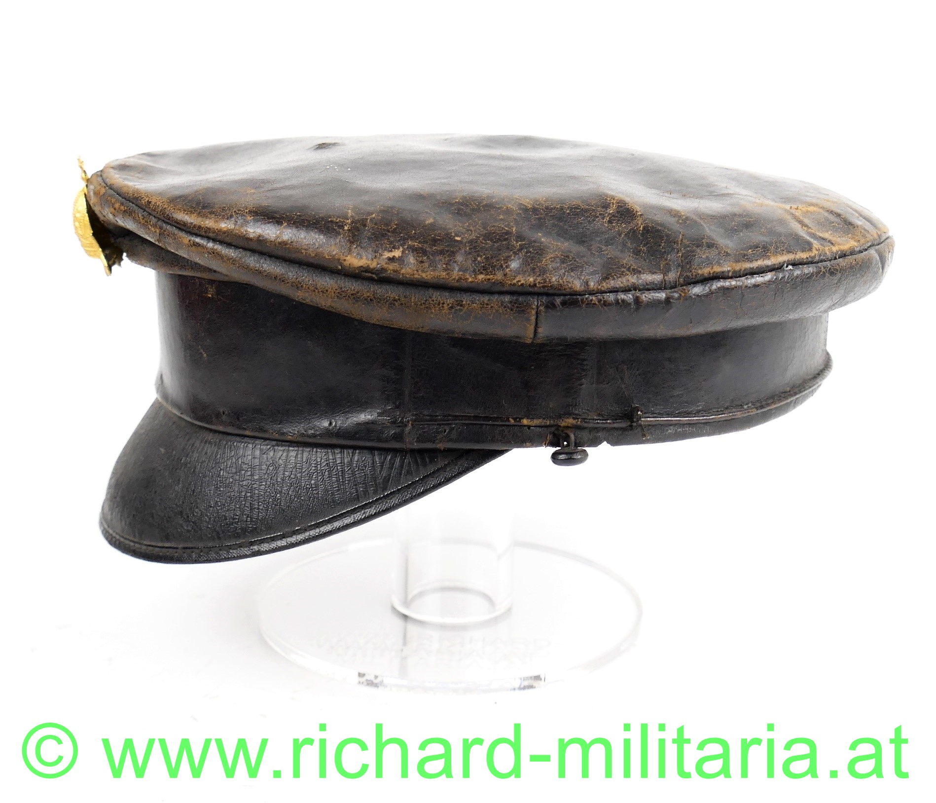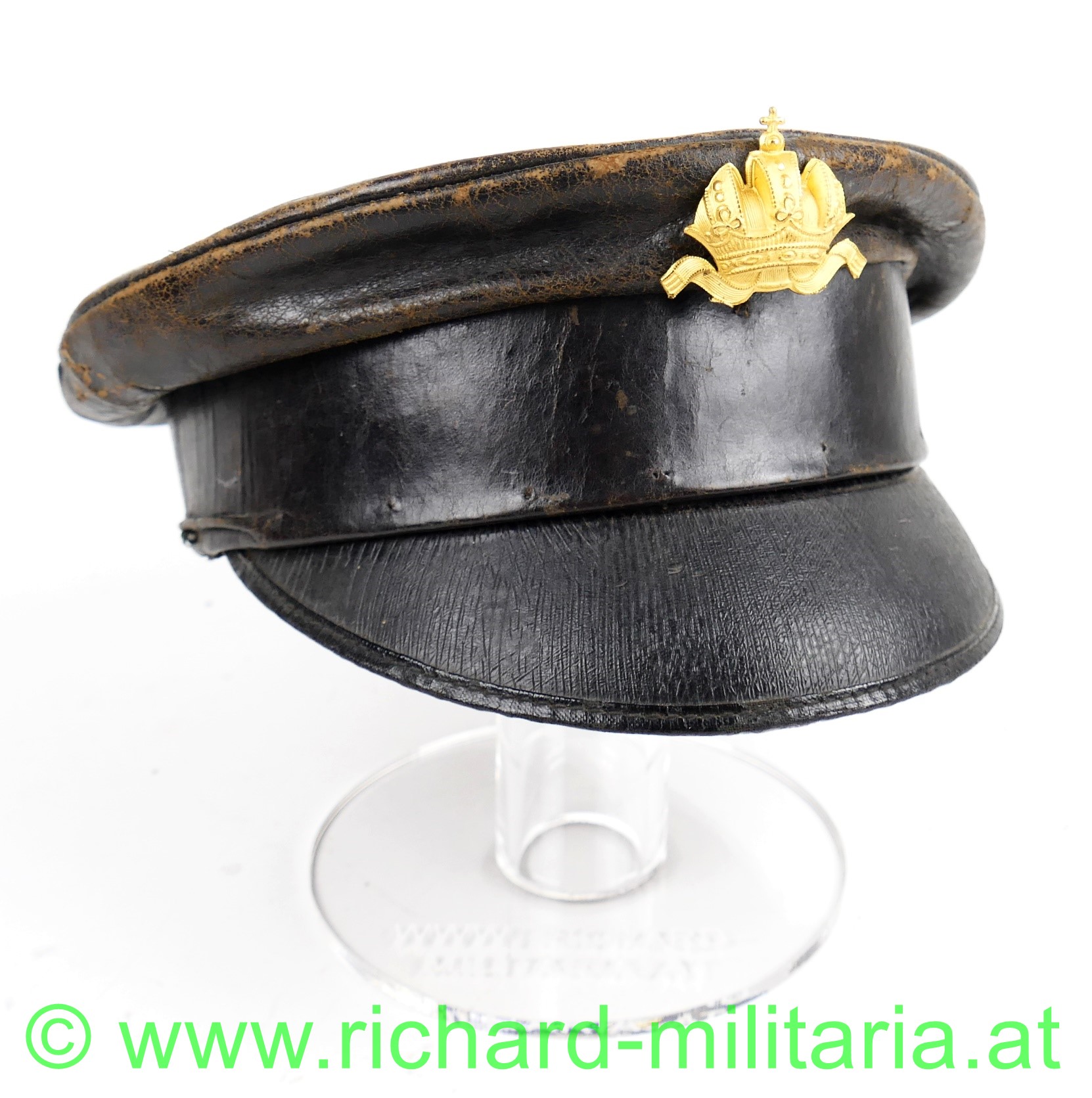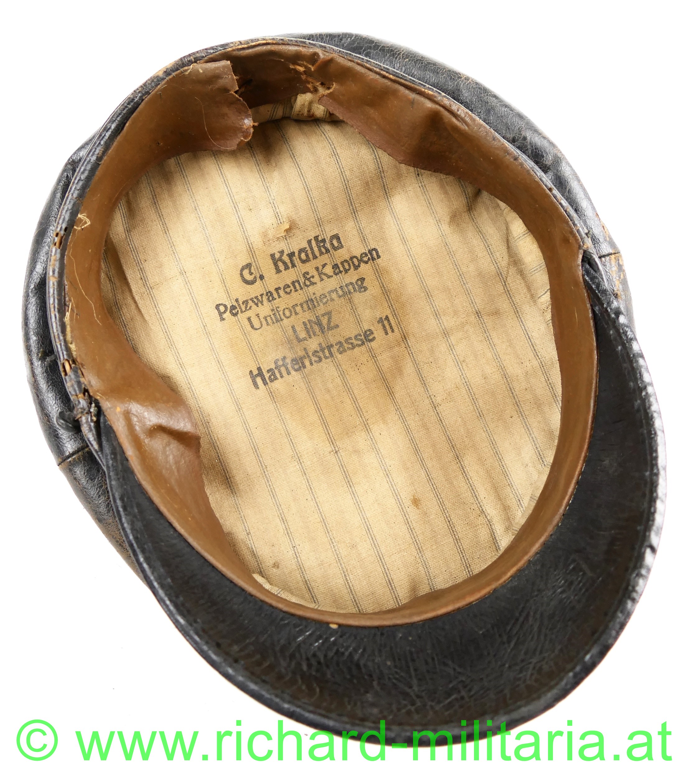 Schirmmütze aus Leder zur Sonderbekleidung der Offiziere im k.u.k. Kraftfahrtruppe; dunkelbraunes fast schwarzes Leder in Schirmkappenform, vorne mittig angestecktes aus vergoldetem Tombak geprägte Kaiserkrone (Pentilen sind abgebrochen) - diese nicht zugehörig; unter der Kaiserkrone ins Leder eingearbeitete Einschublöcher für die Kokade bzw. Hoheitszeichen; schwarzer eingefasster Lederschirm, seitlich beginnend und im Nacken zusammenlaufender kleiner Wulst im Stirnband außen; darunter deutlich einige Nahtlöcher für die fehlende Offiziershutschnur aus Goldfaden; links auch noch eine kleine Schlaufe mit Knopf - diese rechts nur mehr in Fragmenten vorhanden; braunes Stirnleder; gestreifter Futterstoff mit Hersteller "C. Kralka Pelzwaren & Kappen Uniformierung LINZ Haffelstraße 11"; ein paar kleine unbedeutende Holzwurmlöchlein