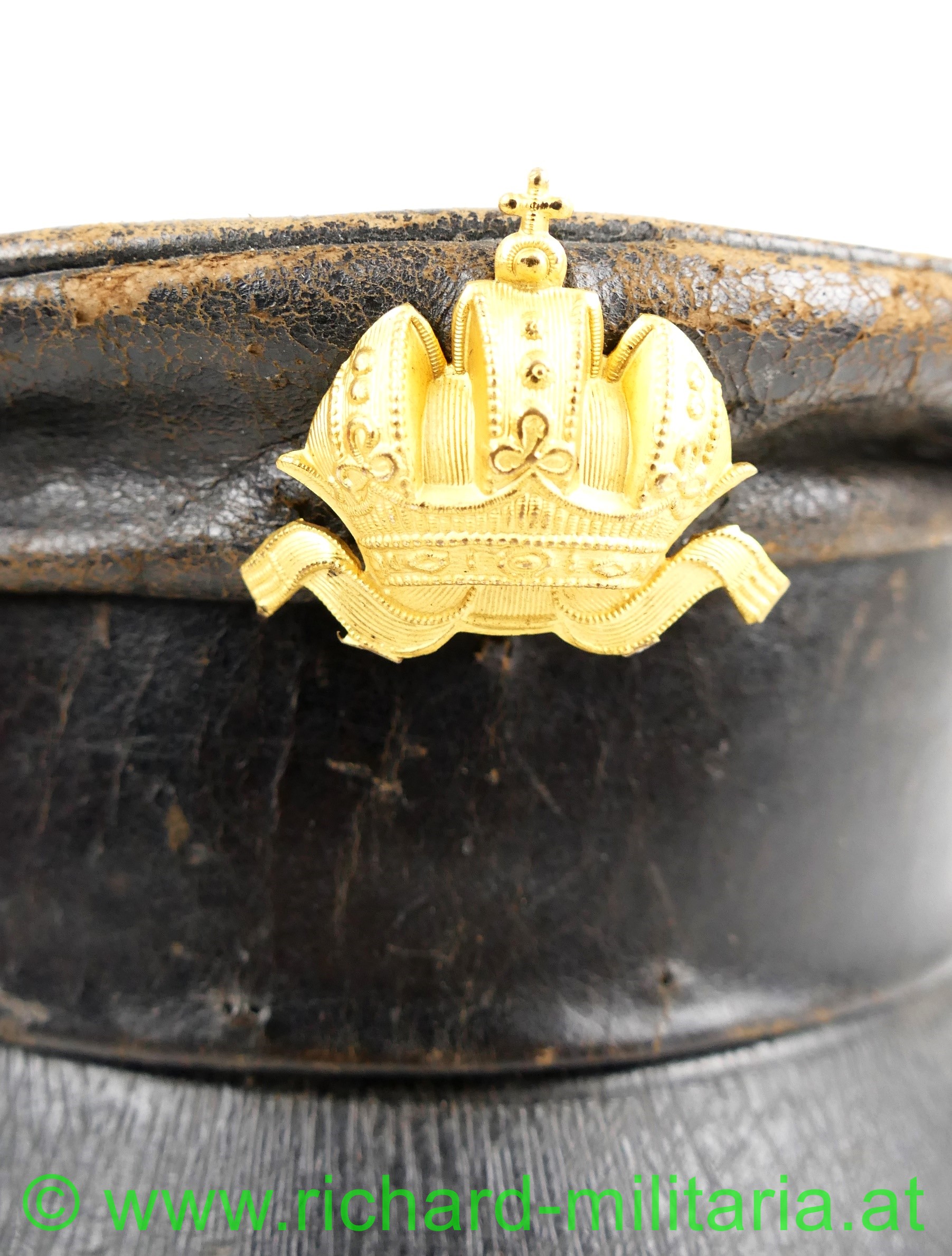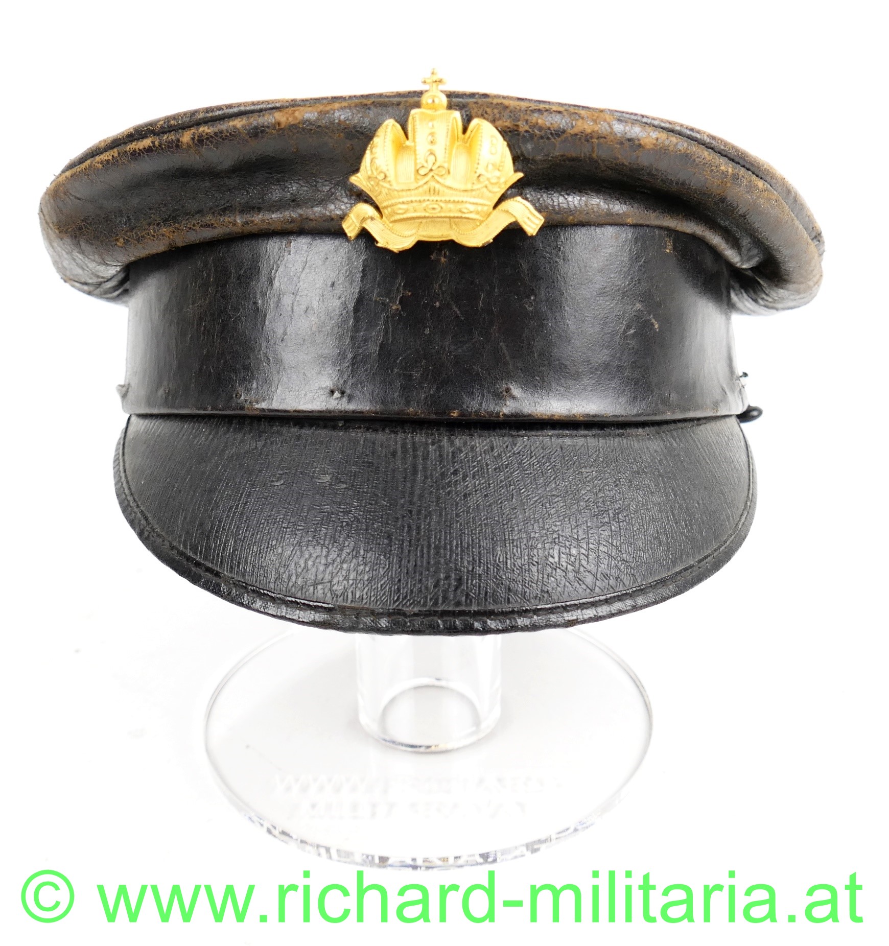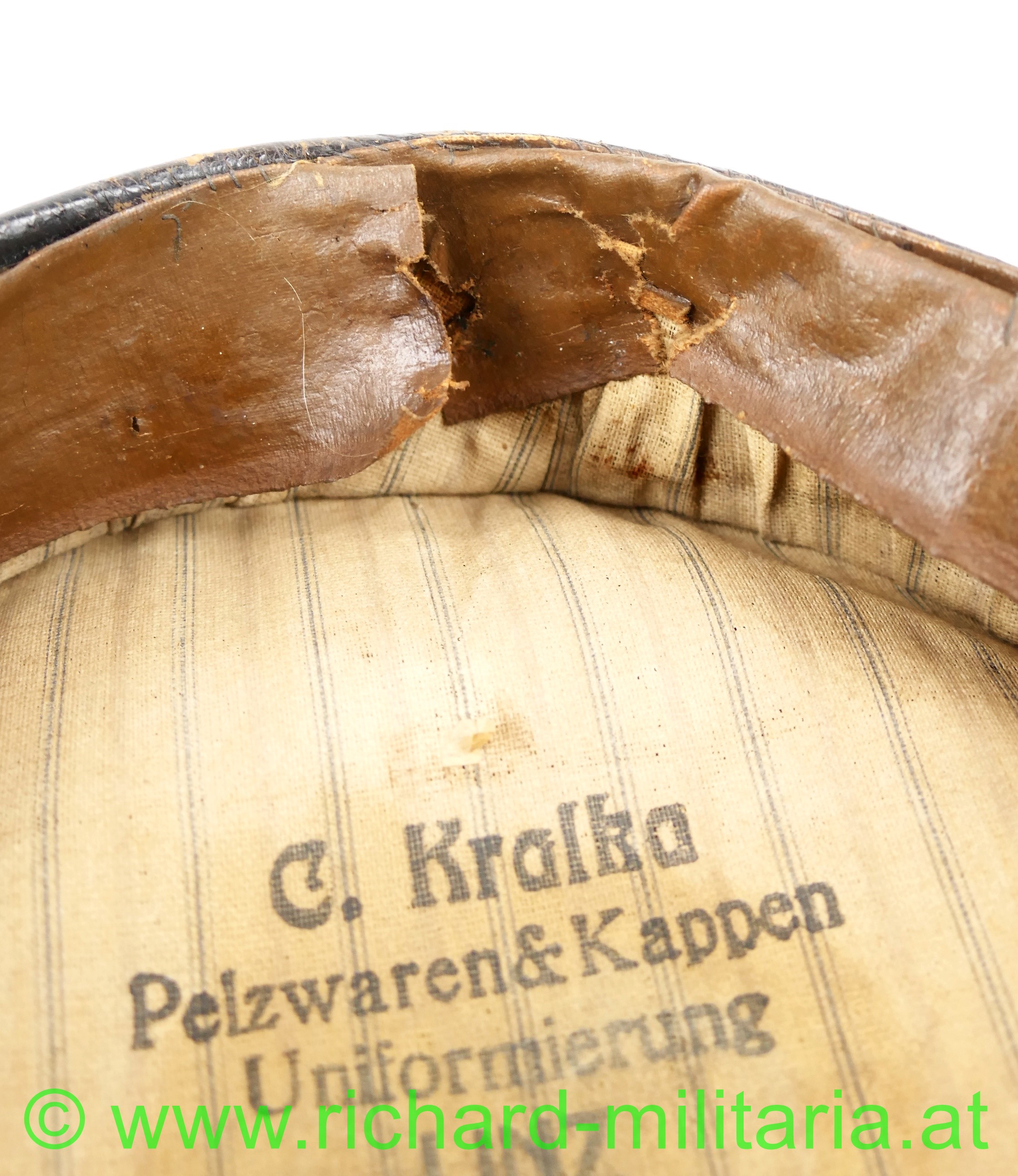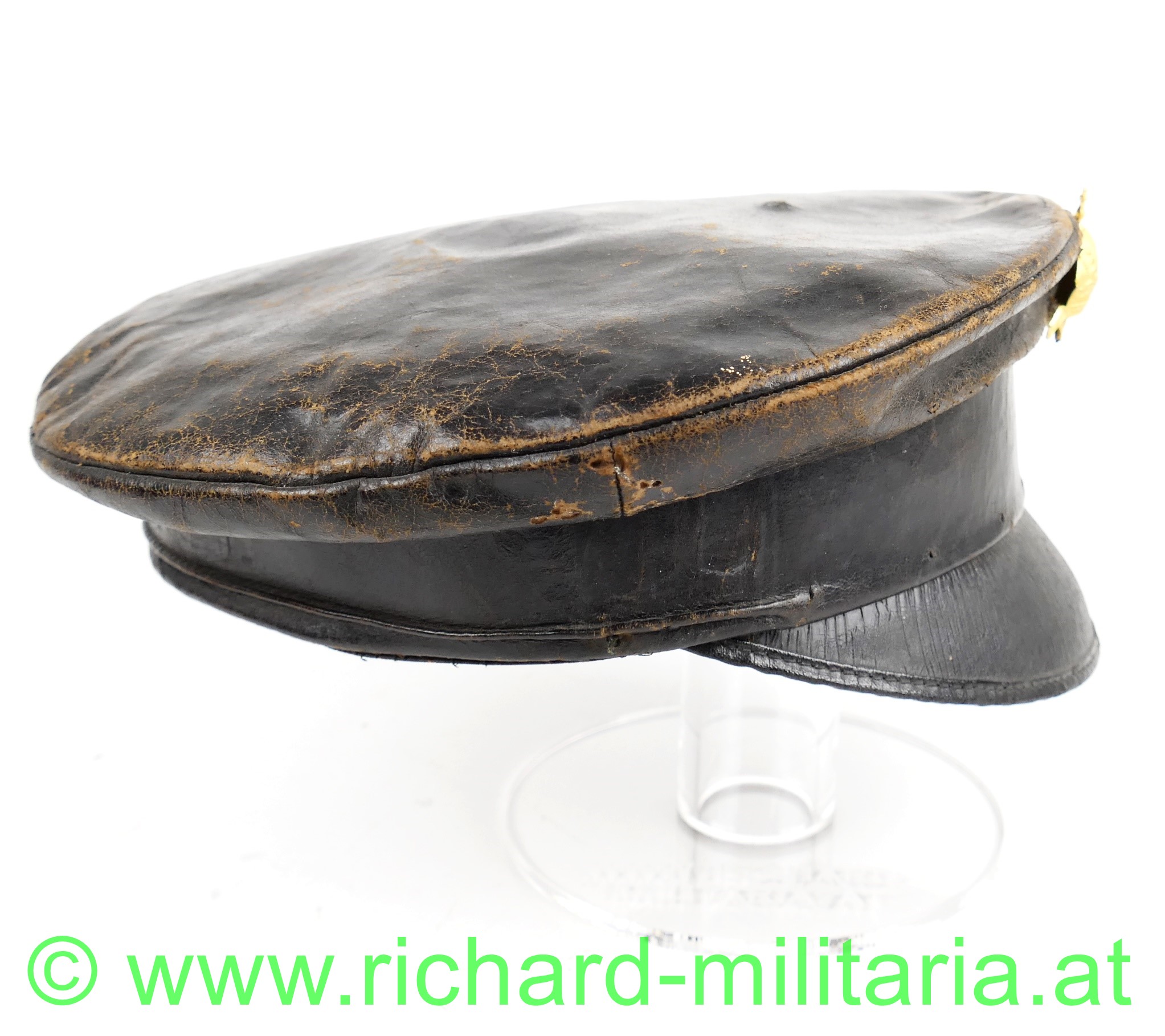 Schirmmütze aus Leder zur Sonderbekleidung der Offiziere im k.u.k. Kraftfahrtruppe; dunkelbraunes fast schwarzes Leder in Schirmkappenform, vorne mittig angestecktes aus vergoldetem Tombak geprägte Kaiserkrone (Pentilen sind abgebrochen) - diese nicht zugehörig; unter der Kaiserkrone ins Leder eingearbeitete Einschublöcher für die Kokade bzw. Hoheitszeichen; schwarzer eingefasster Lederschirm, seitlich beginnend und im Nacken zusammenlaufender kleiner Wulst im Stirnband außen; darunter deutlich einige Nahtlöcher für die fehlende Offiziershutschnur aus Goldfaden; links auch noch eine kleine Schlaufe mit Knopf - diese rechts nur mehr in Fragmenten vorhanden; braunes Stirnleder; gestreifter Futterstoff mit Hersteller "C. Kralka Pelzwaren & Kappen Uniformierung LINZ Haffelstraße 11"; ein paar kleine unbedeutende Holzwurmlöchlein