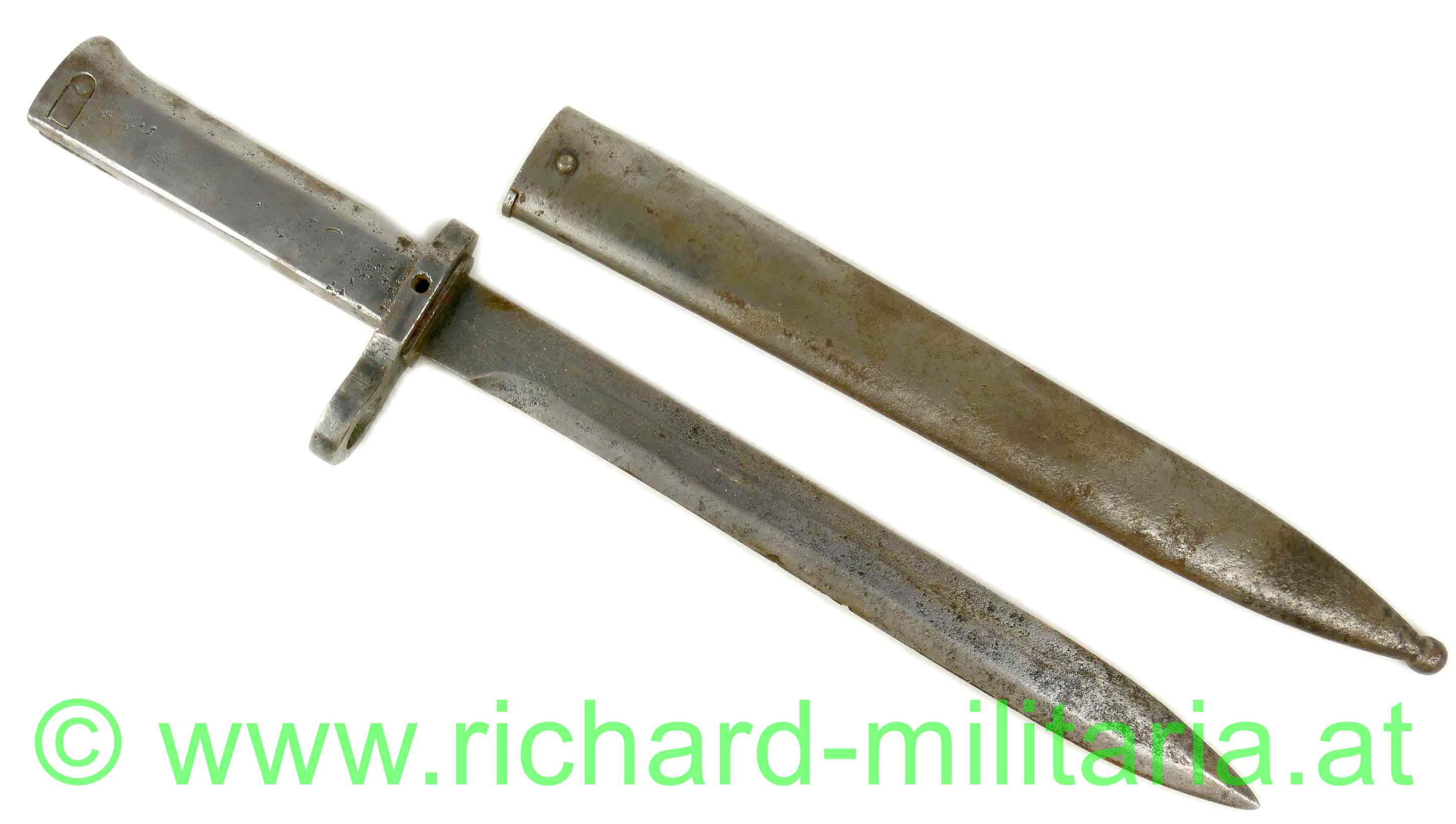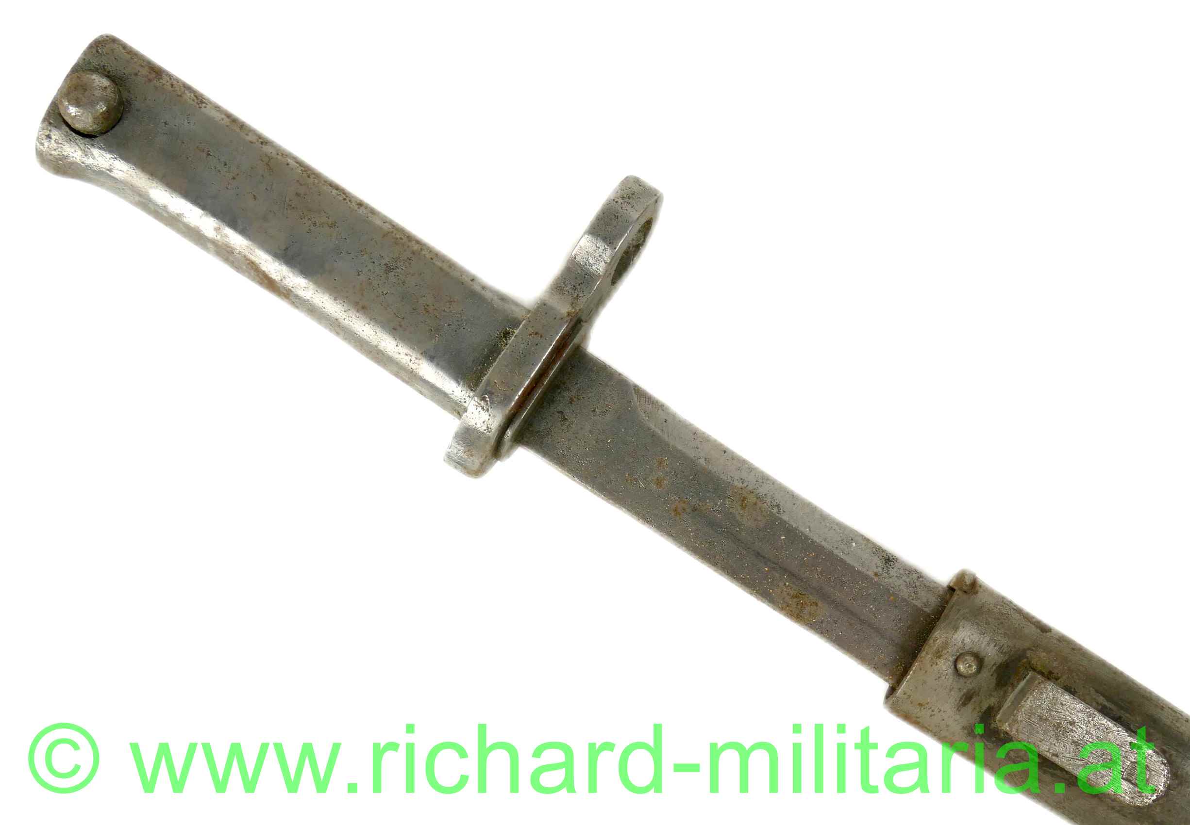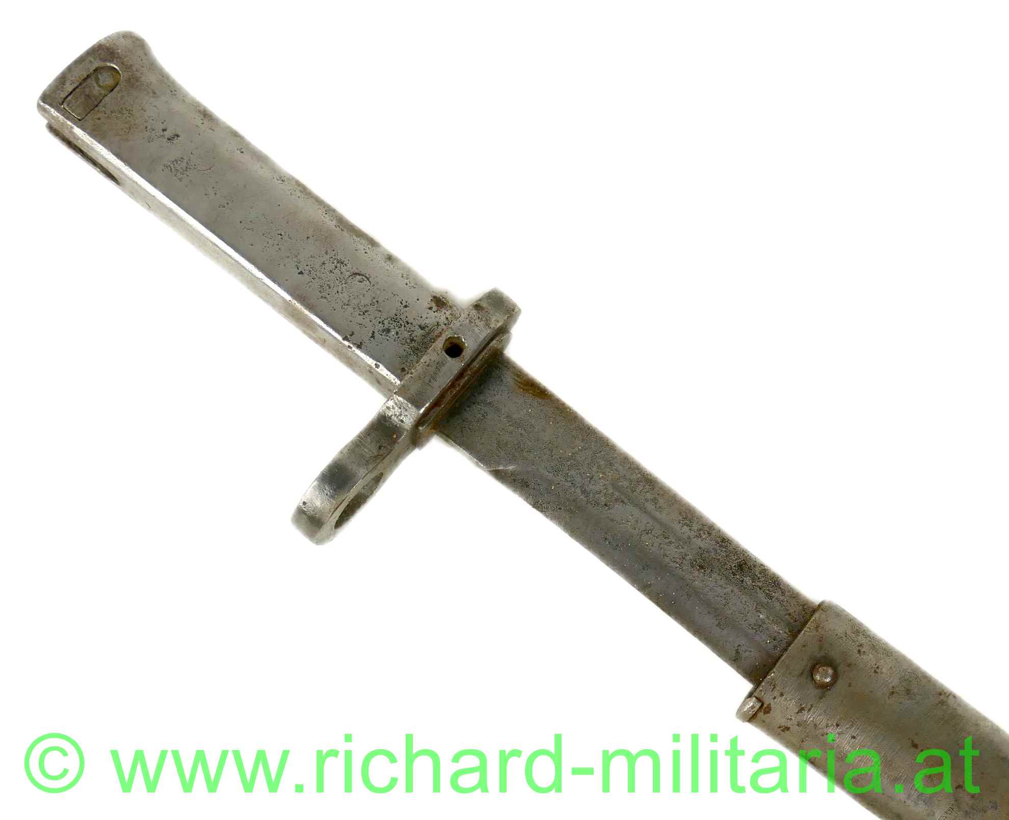 k.u.k. Not-/Ersatzbajonett M95 - nach deutschem Muster, Messerklinge ohne Hohlschliff mit ca. 4 cm Rückenschneide - keine Herstellermarkierungen - Klinge gereinigt - narbig, Griff mit Hülse und Drücker aus Eisenblech gepresst - dieser ebenfalls gereinigt und leicht narbig, massive Parierstange - DM-Laufführungsring ca.: "15mm", Standardscheide für Messerbajonett M 1895 mit Hersteller und Armeeabnahme - ohne Lack und ebenfalls gereinigt und narbig;