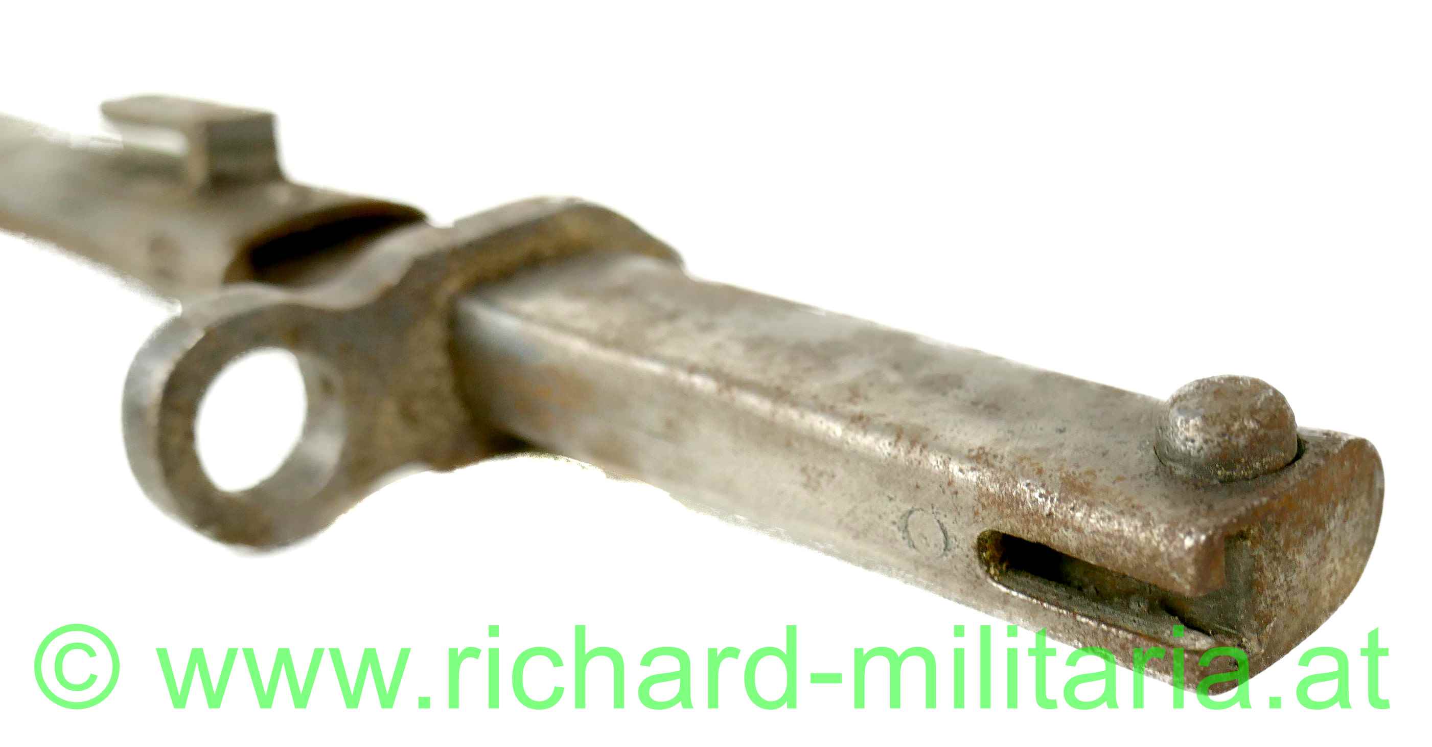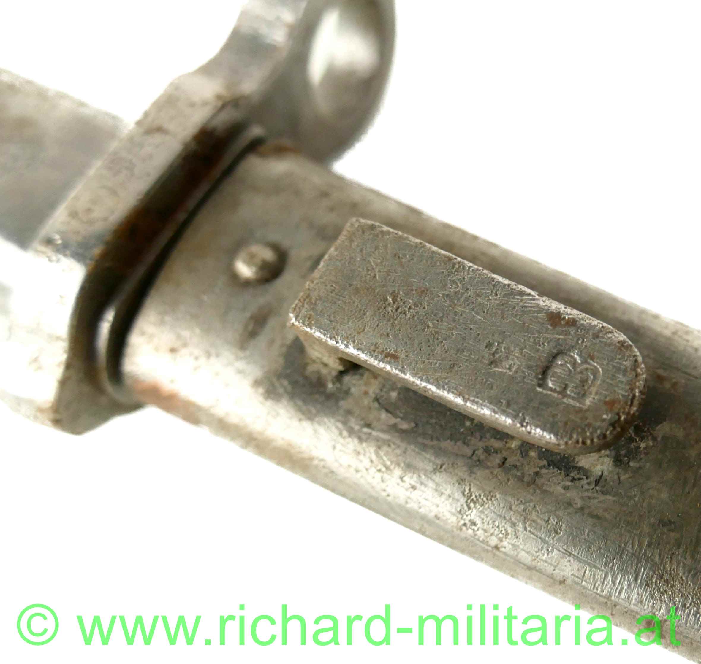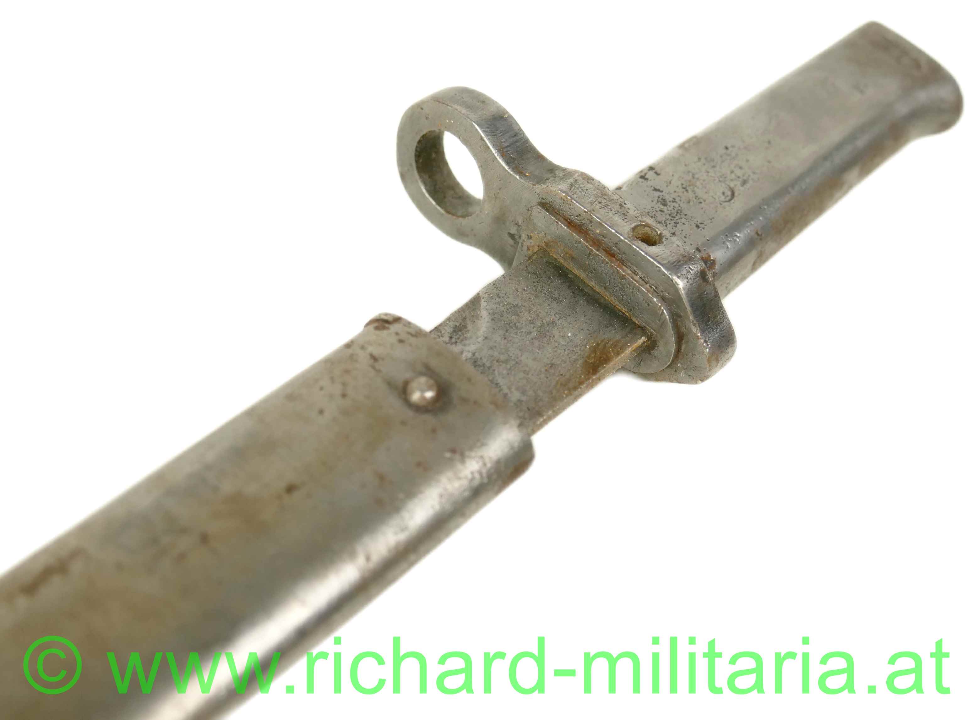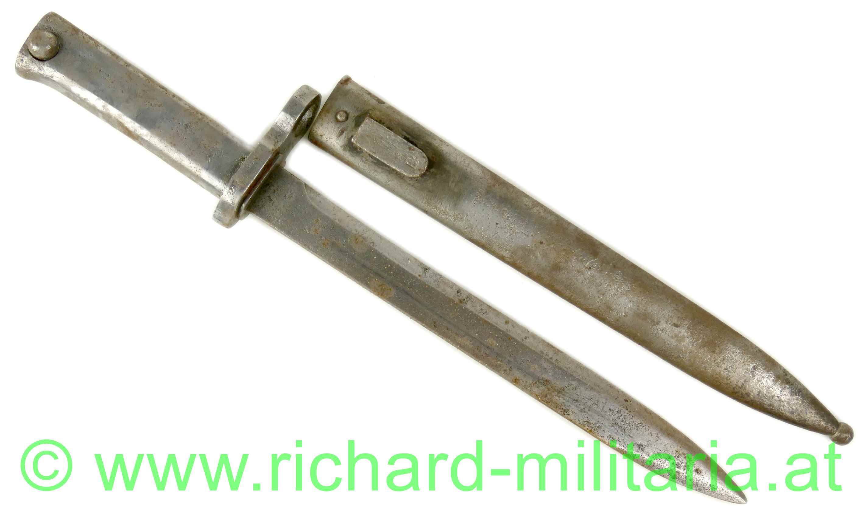 k.u.k. Not-/Ersatzbajonett M95 - nach deutschem Muster, Messerklinge ohne Hohlschliff mit ca. 4 cm Rückenschneide - keine Herstellermarkierungen - Klinge gereinigt - narbig, Griff mit Hülse und Drücker aus Eisenblech gepresst - dieser ebenfalls gereinigt und leicht narbig, massive Parierstange - DM-Laufführungsring ca.: "15mm", Standardscheide für Messerbajonett M 1895 mit Hersteller und Armeeabnahme - ohne Lack und ebenfalls gereinigt und narbig;
