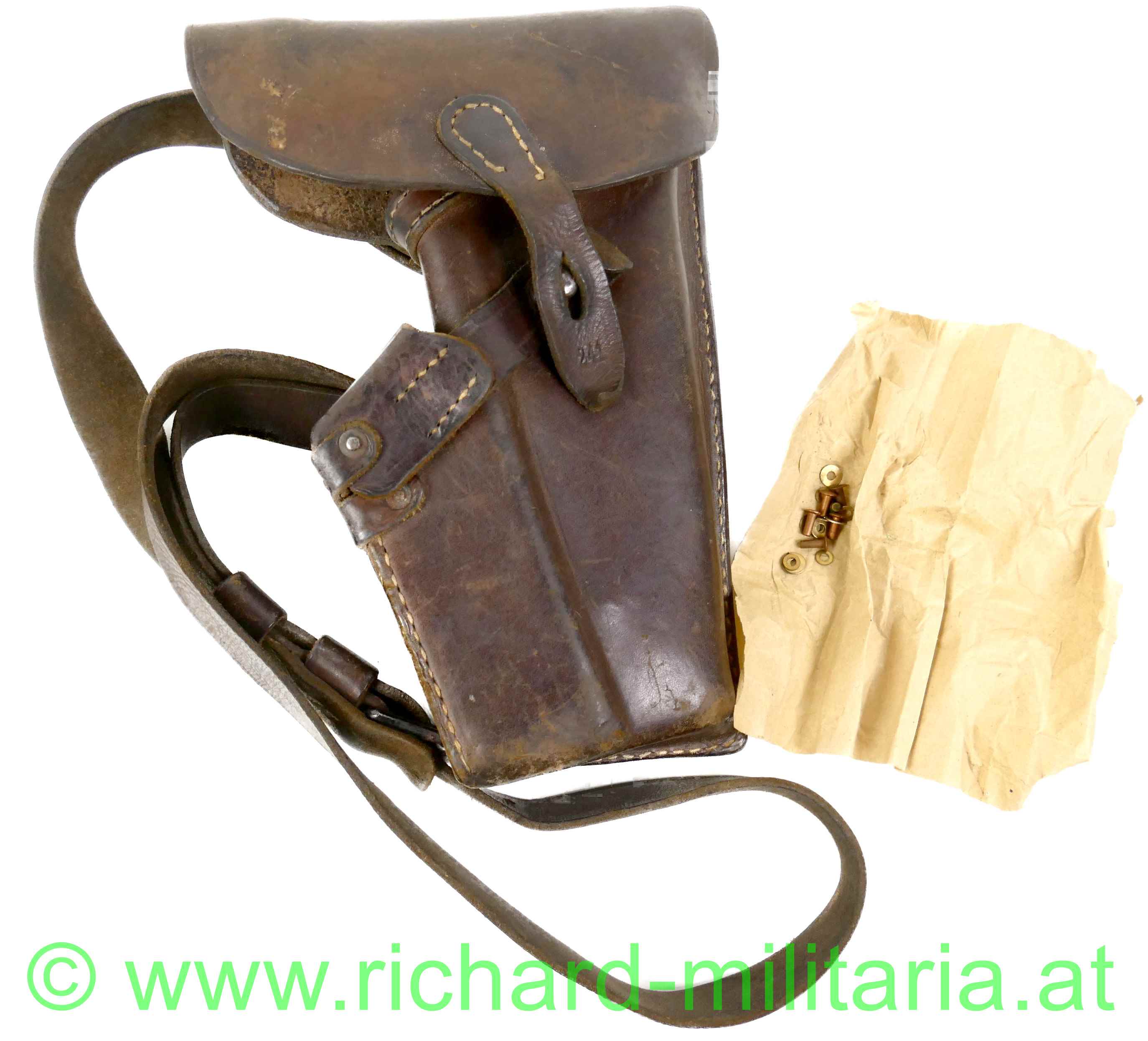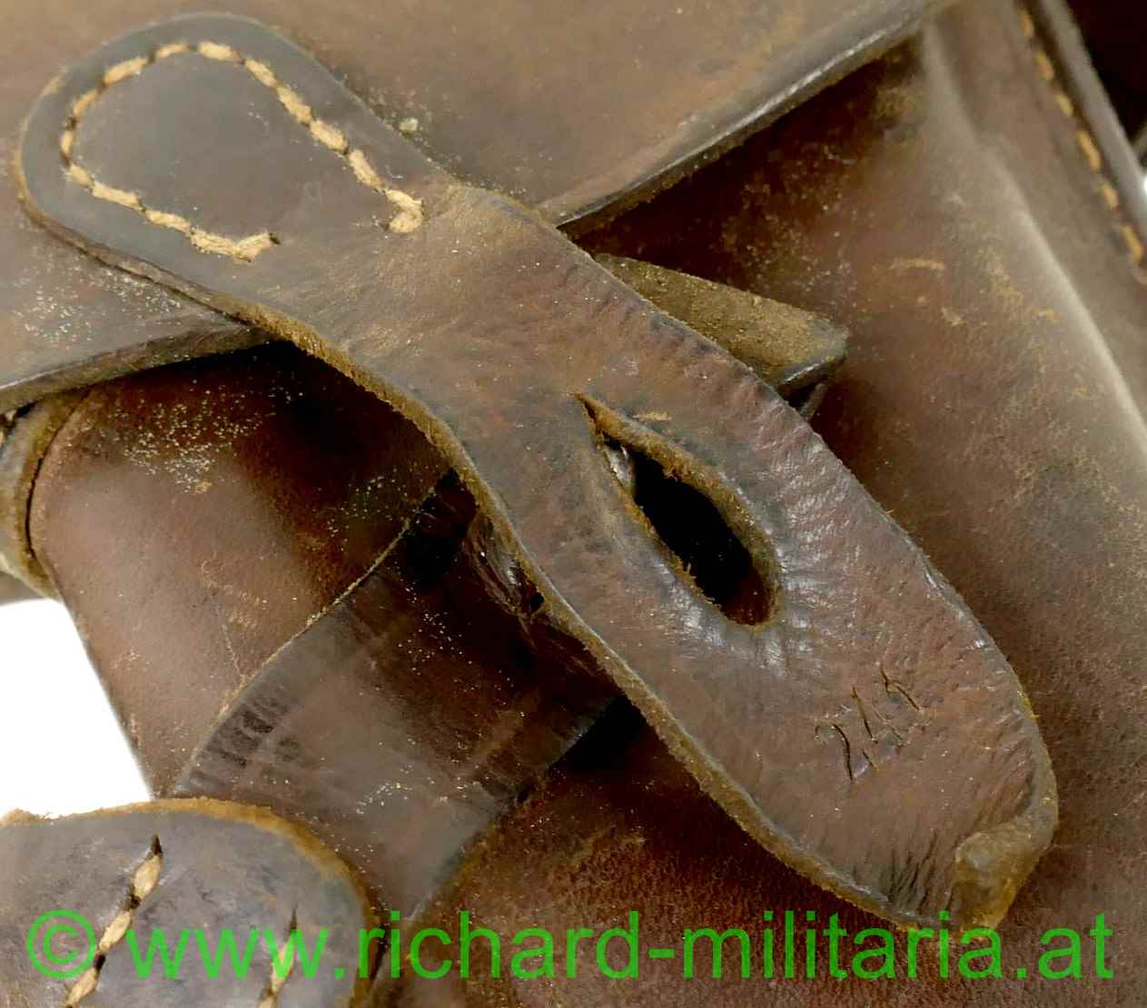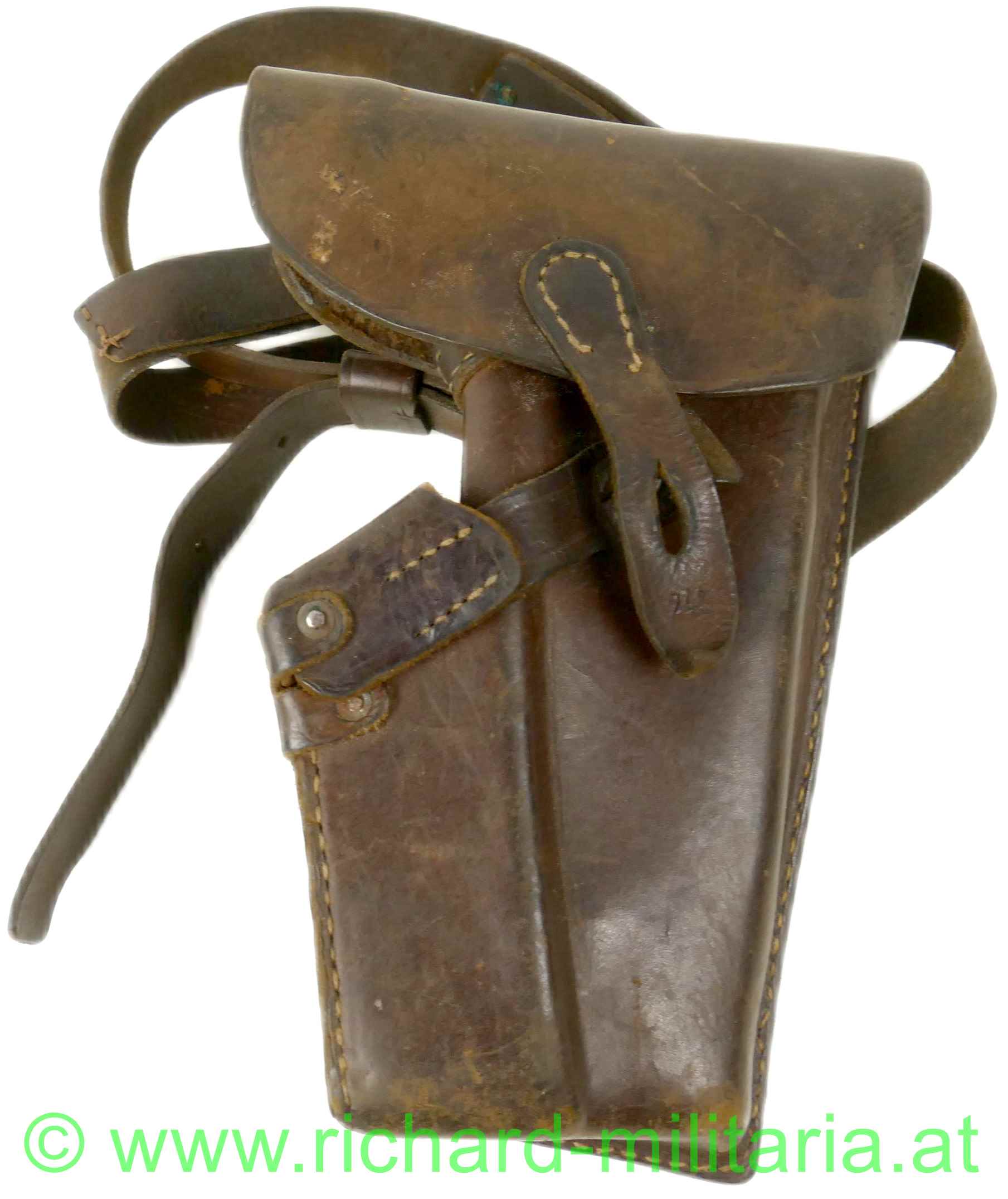 k.u.k. Pistolentasche Steyr M12 mit originalem Schultertragegurt; dickes braunes Leder, beide Verschlusslaschen vorhanden; die Verschlusslaschen mit "241" gestempelt, verschiedene Monturdepotstempel auf der Tascheninnenseite; alle Nähte fest; Verschlusslasche für die Munitionstasche komplett; der originale lange Schulterriemen unberührt und komplett erhalten, die Durchzugsschlaufen für das Koppel wurden teilweise repariert (alt-vernäht); originale alte (4 Stk.) Befestigungsnieten liegen bei;
