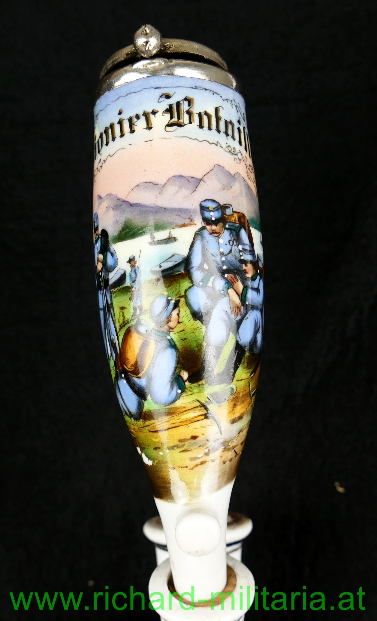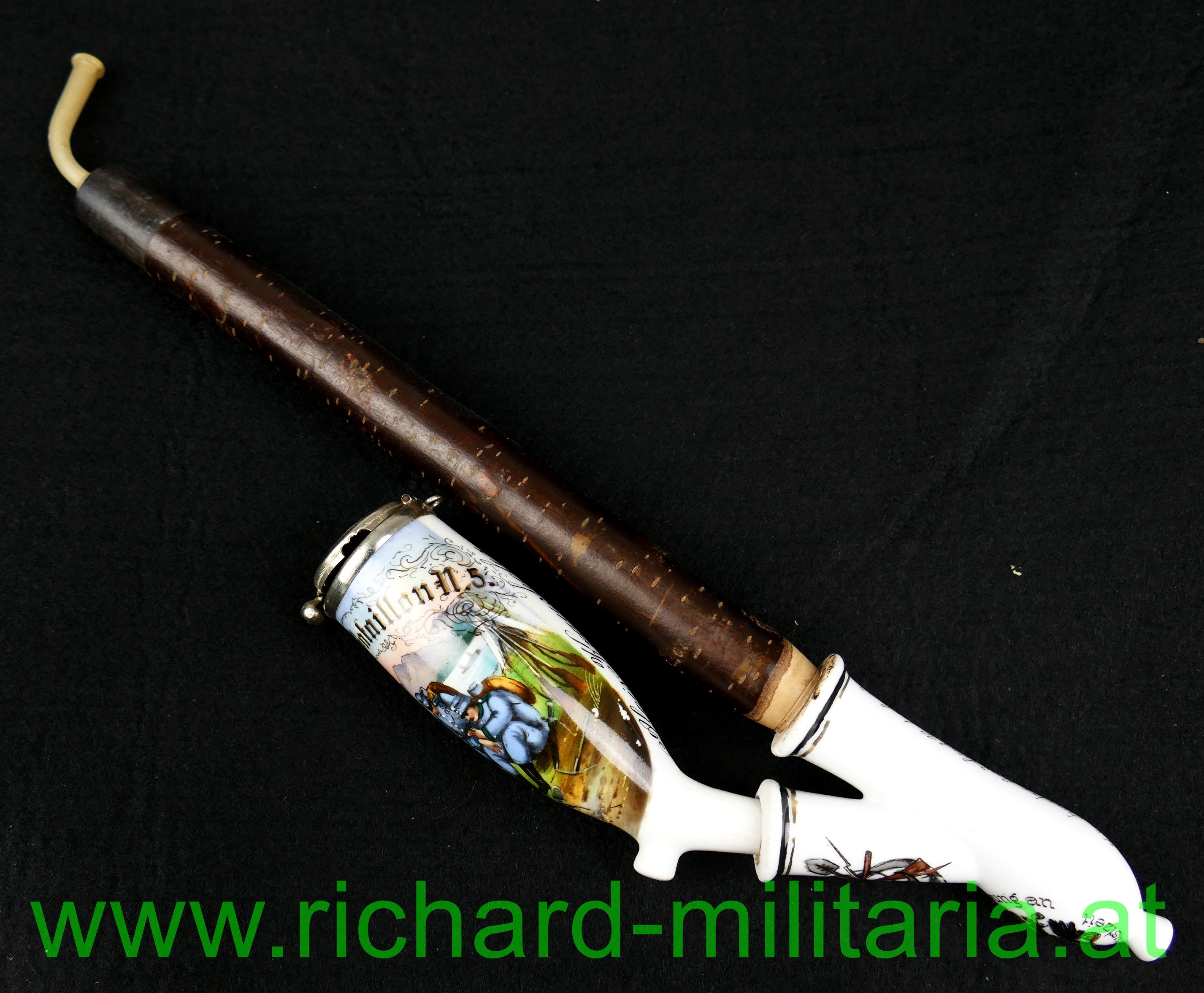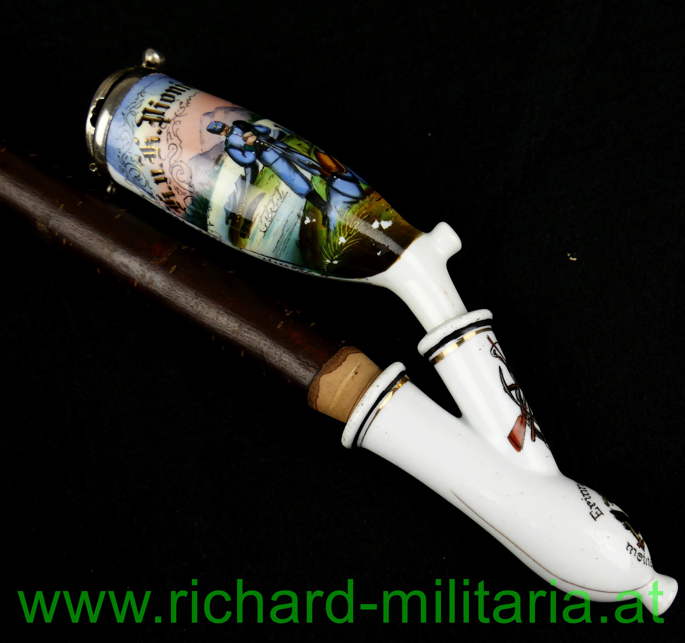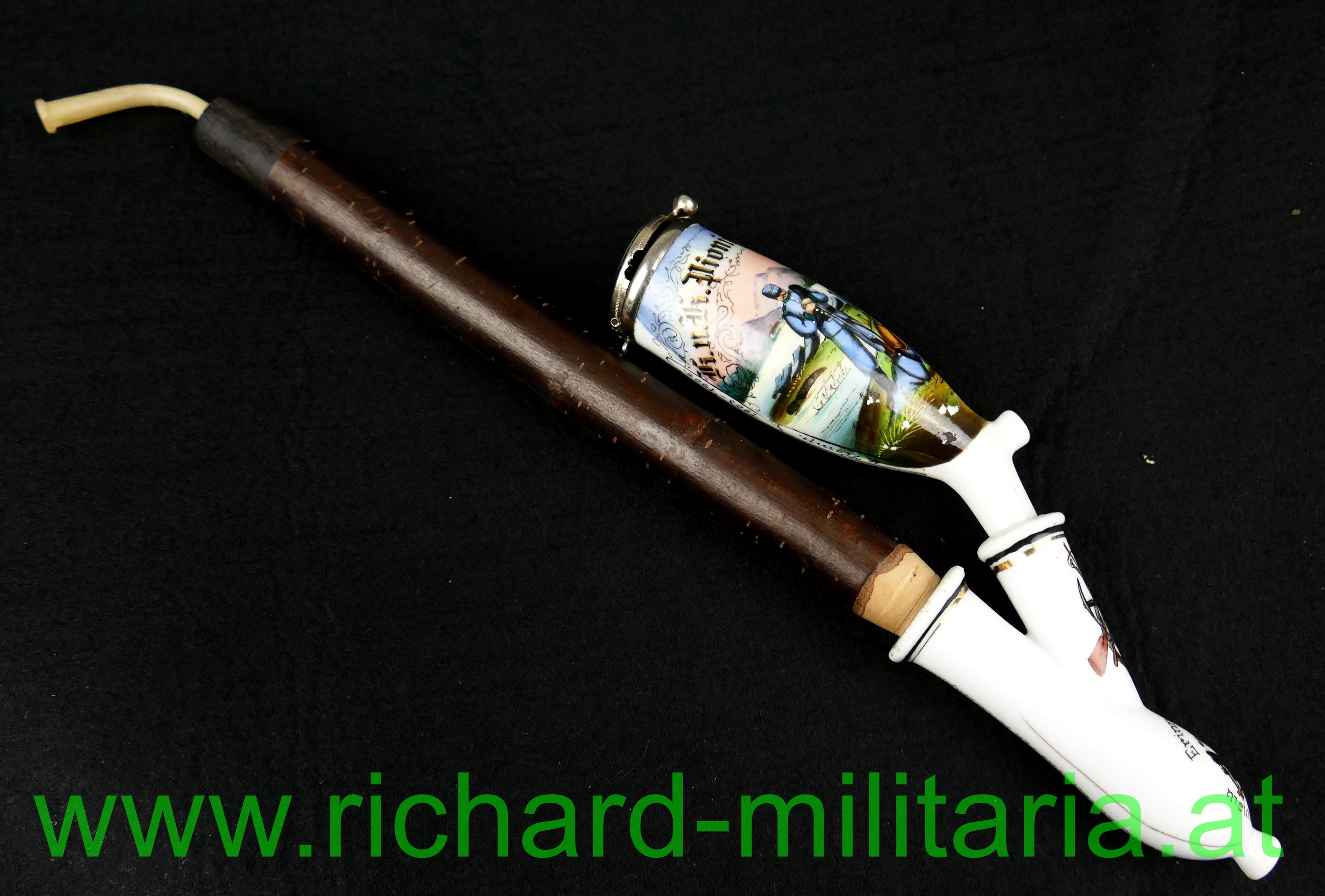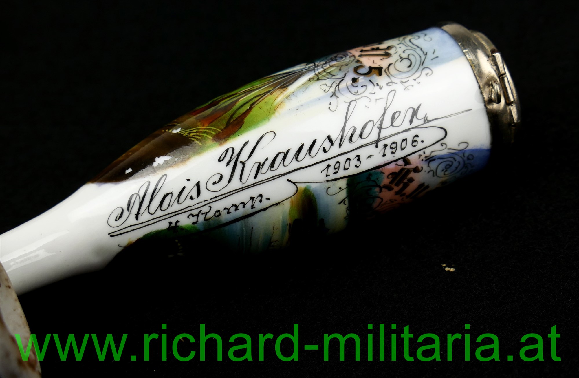 k.u.k. Reservistenpfeife des Alois Kraushofer, 4. Komp, 1903-1906 beim k.u.k. Pionier-Bataillon Nr. 5; handbemalt mit passendem Wassersack; unbeschädigt in sehr guter Erhaltung mit Deckel, Höhe der Pfeife mit Wassersack ca. 19 cm, dazu der passende Holzstiel mit einer Länge von 23 cm