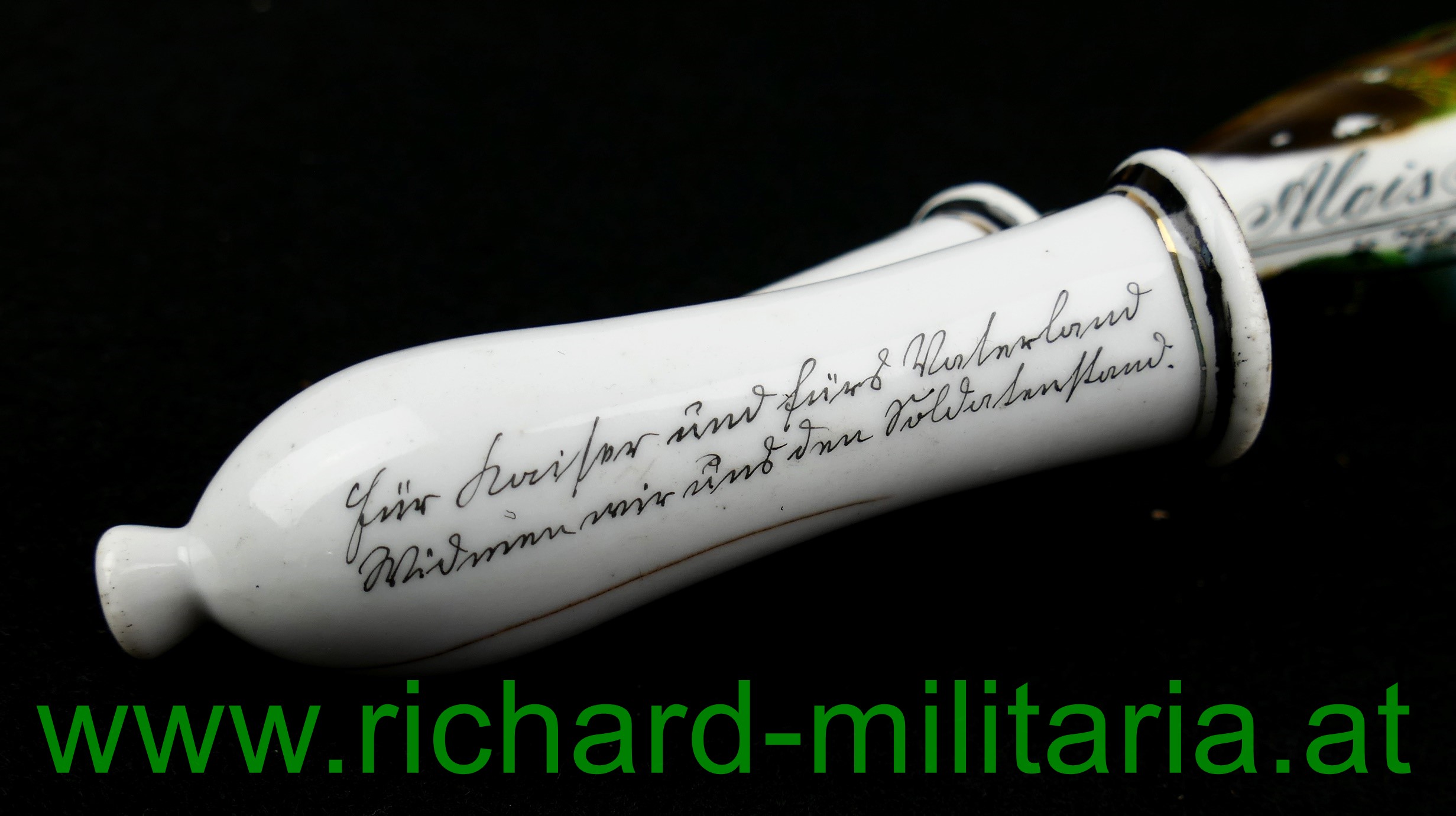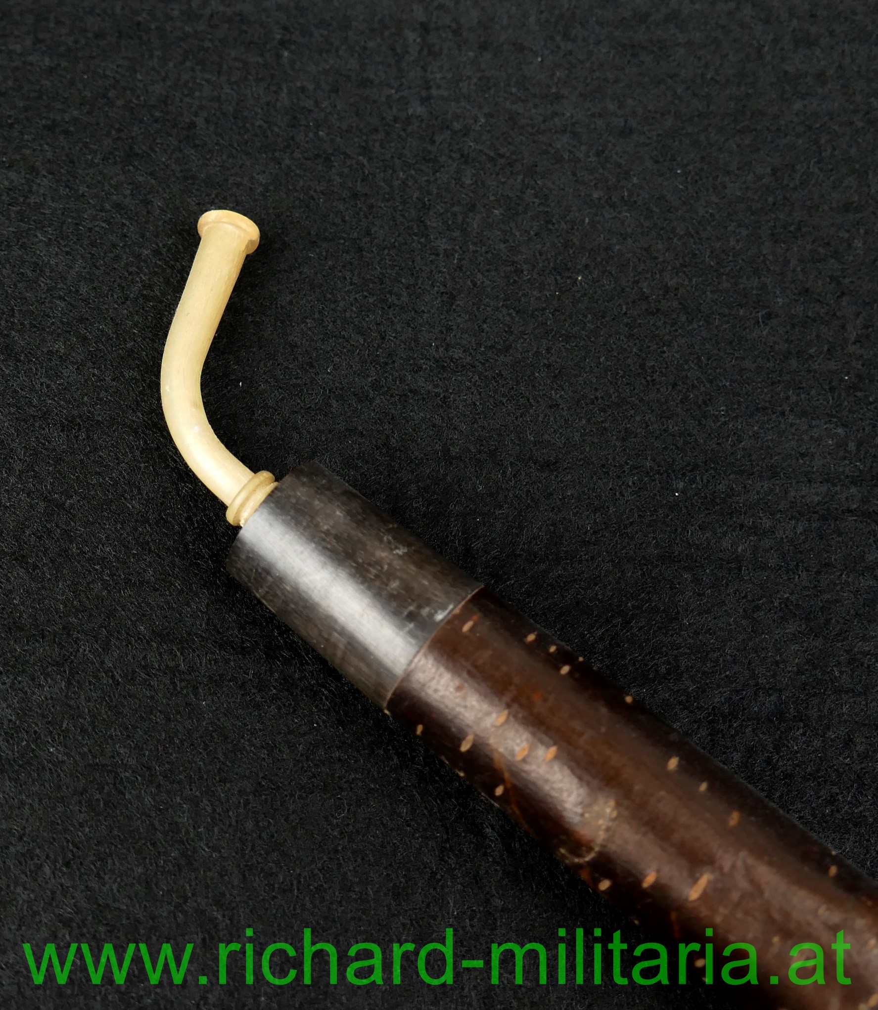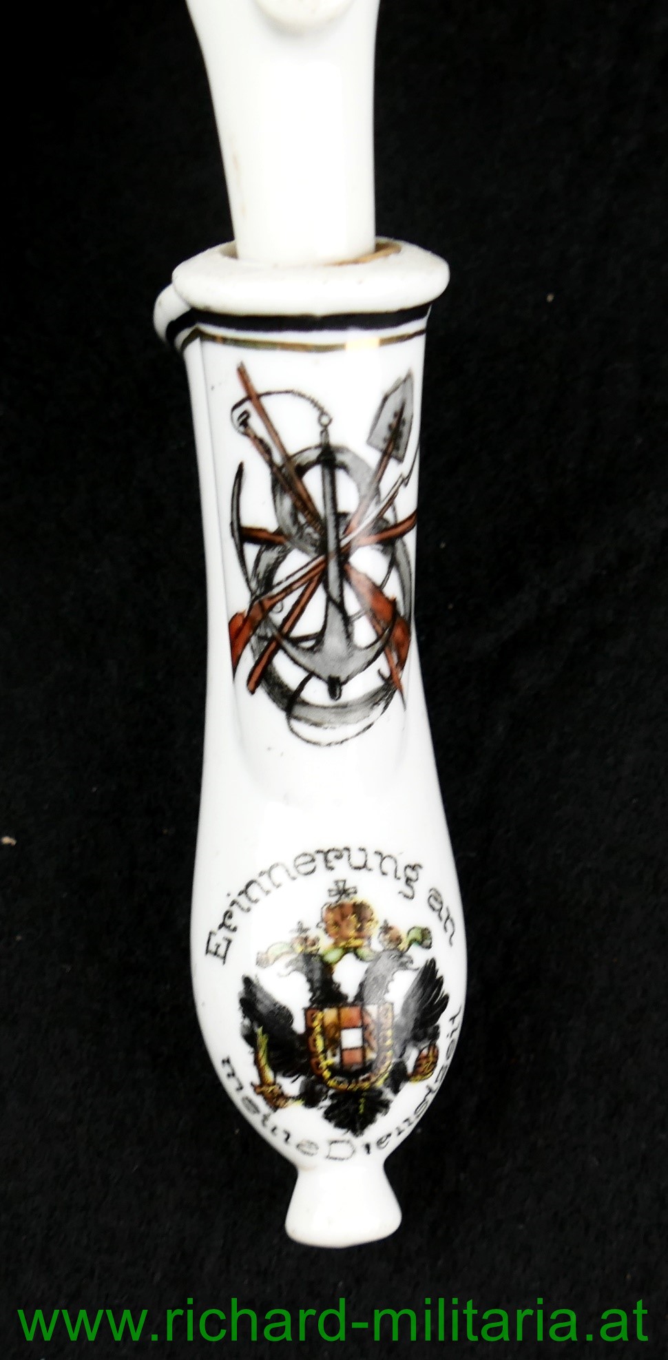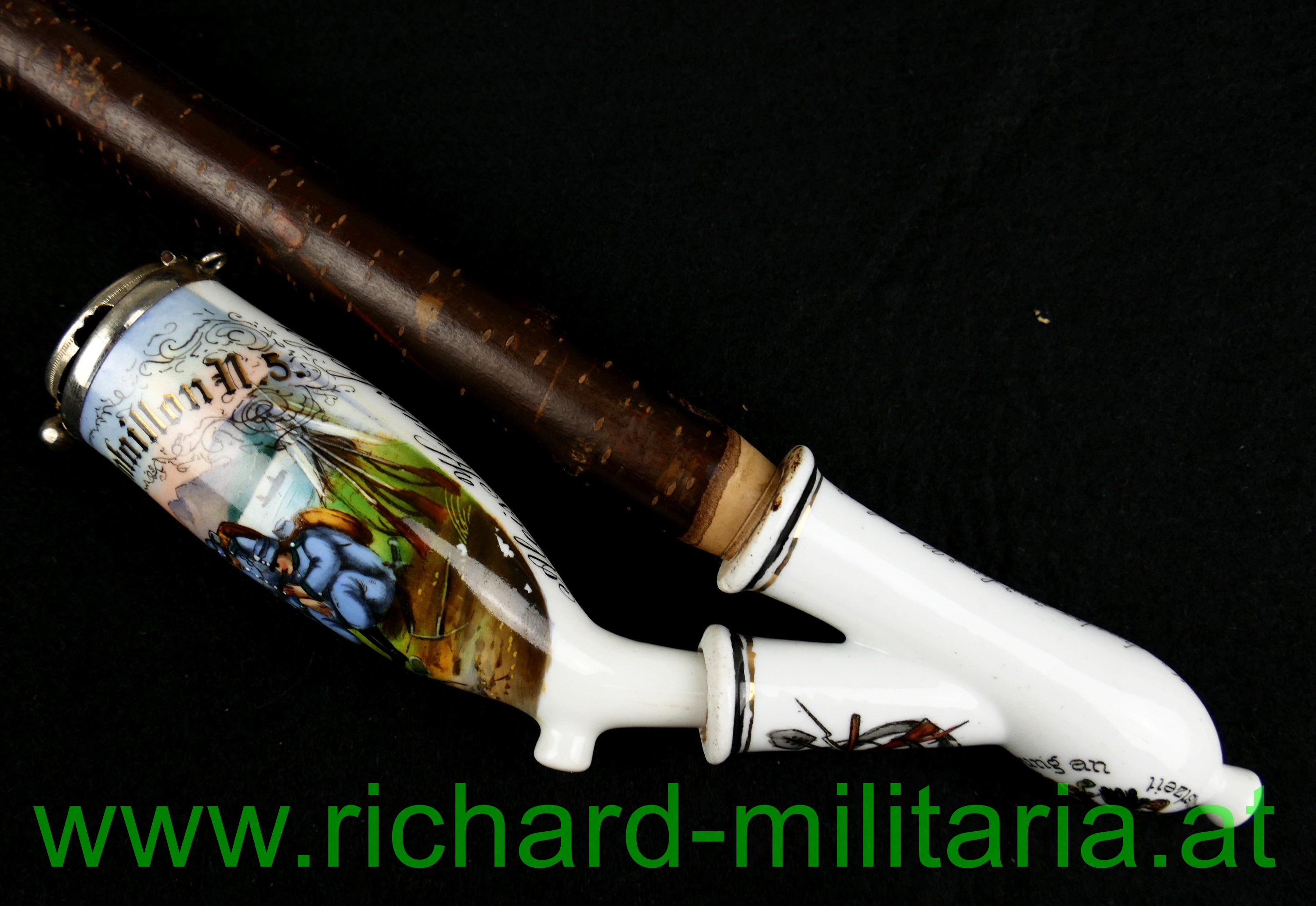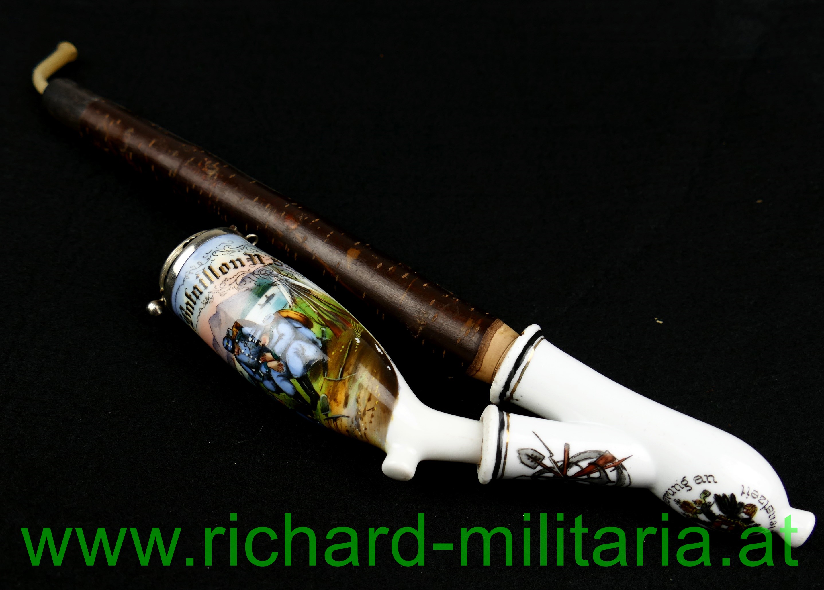 k.u.k. Reservistenpfeife des Alois Kraushofer, 4. Komp, 1903-1906 beim k.u.k. Pionier-Bataillon Nr. 5; handbemalt mit passendem Wassersack; unbeschädigt in sehr guter Erhaltung mit Deckel, Höhe der Pfeife mit Wassersack ca. 19 cm, dazu der passende Holzstiel mit einer Länge von 23 cm
