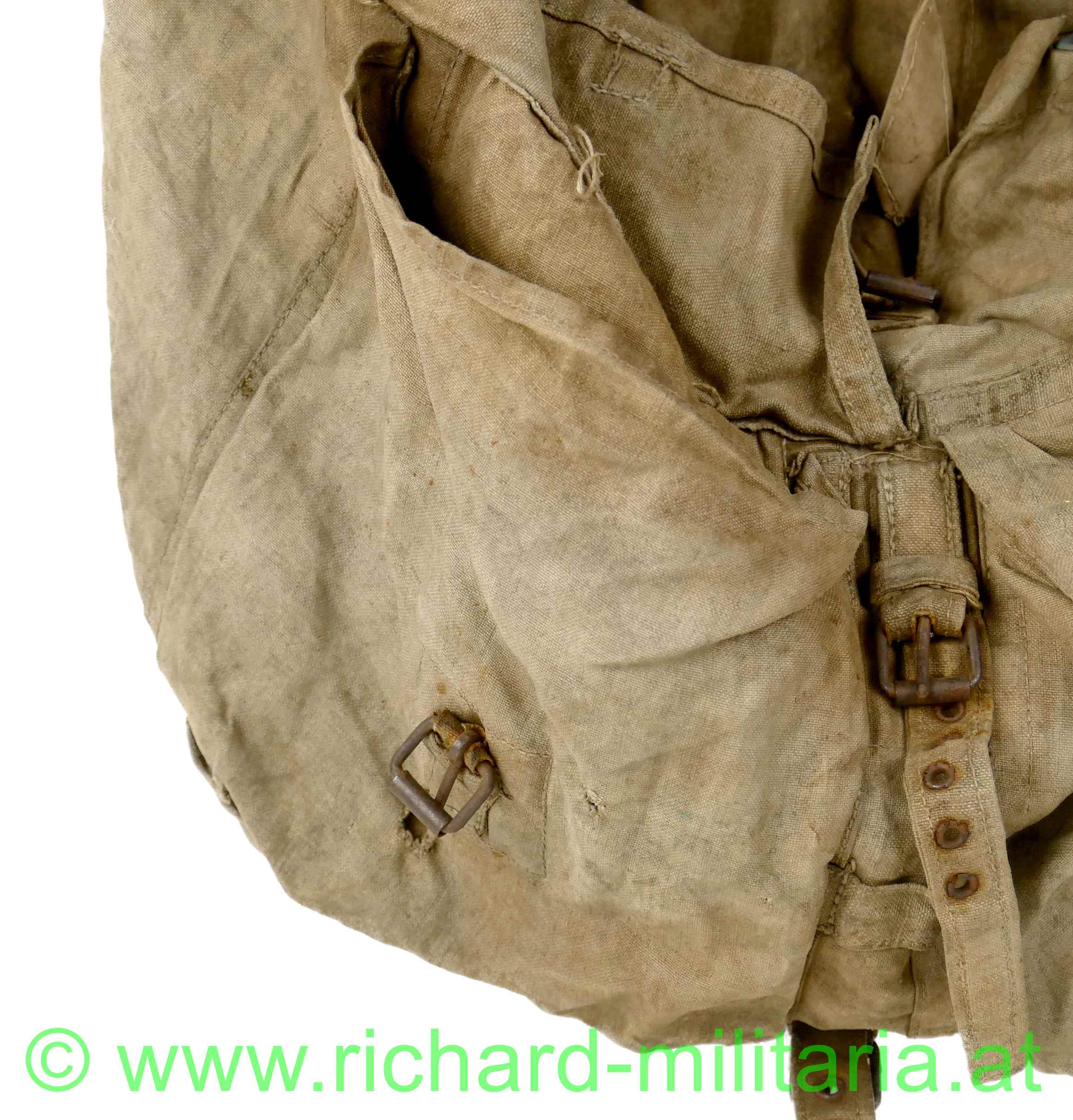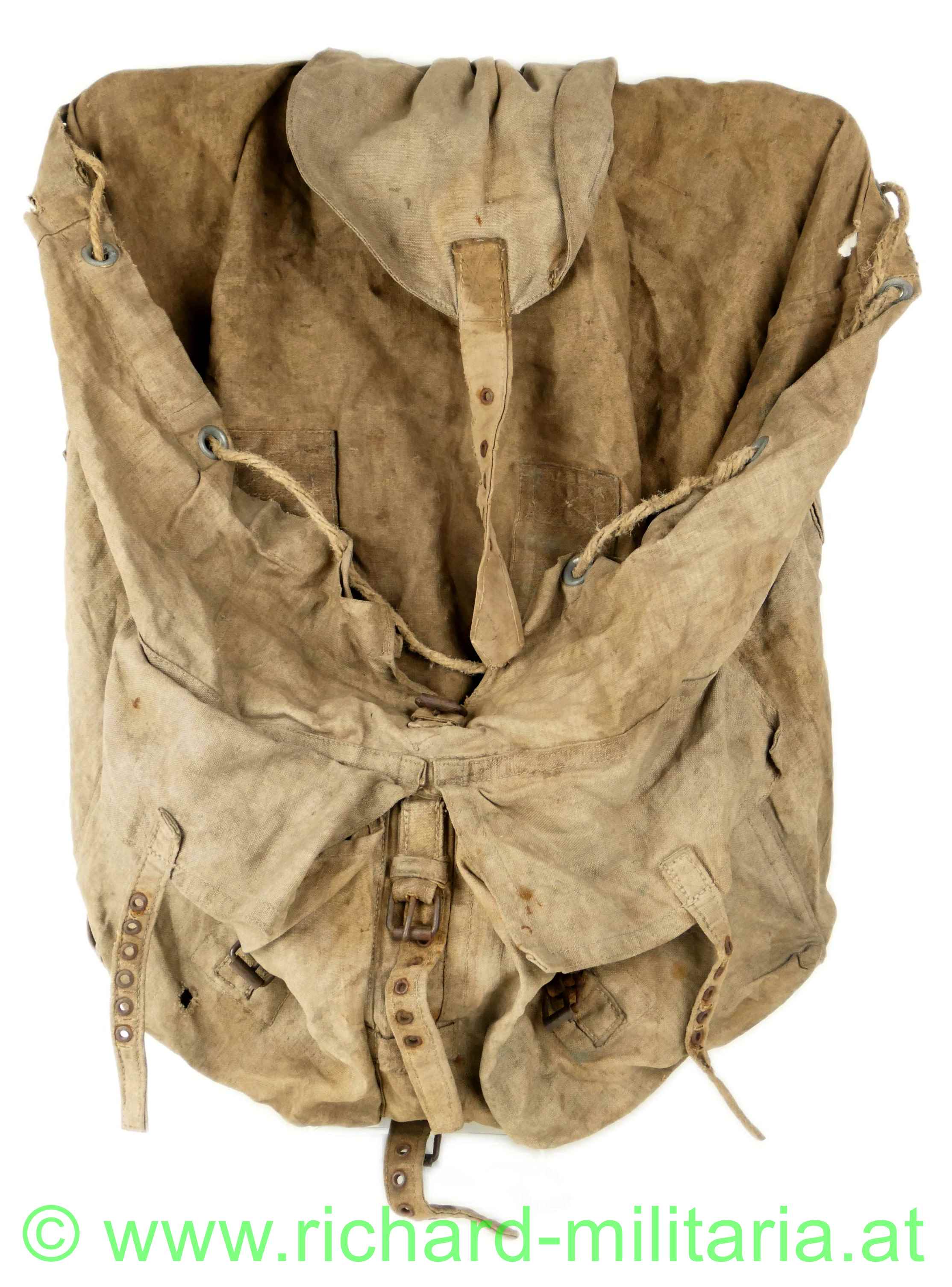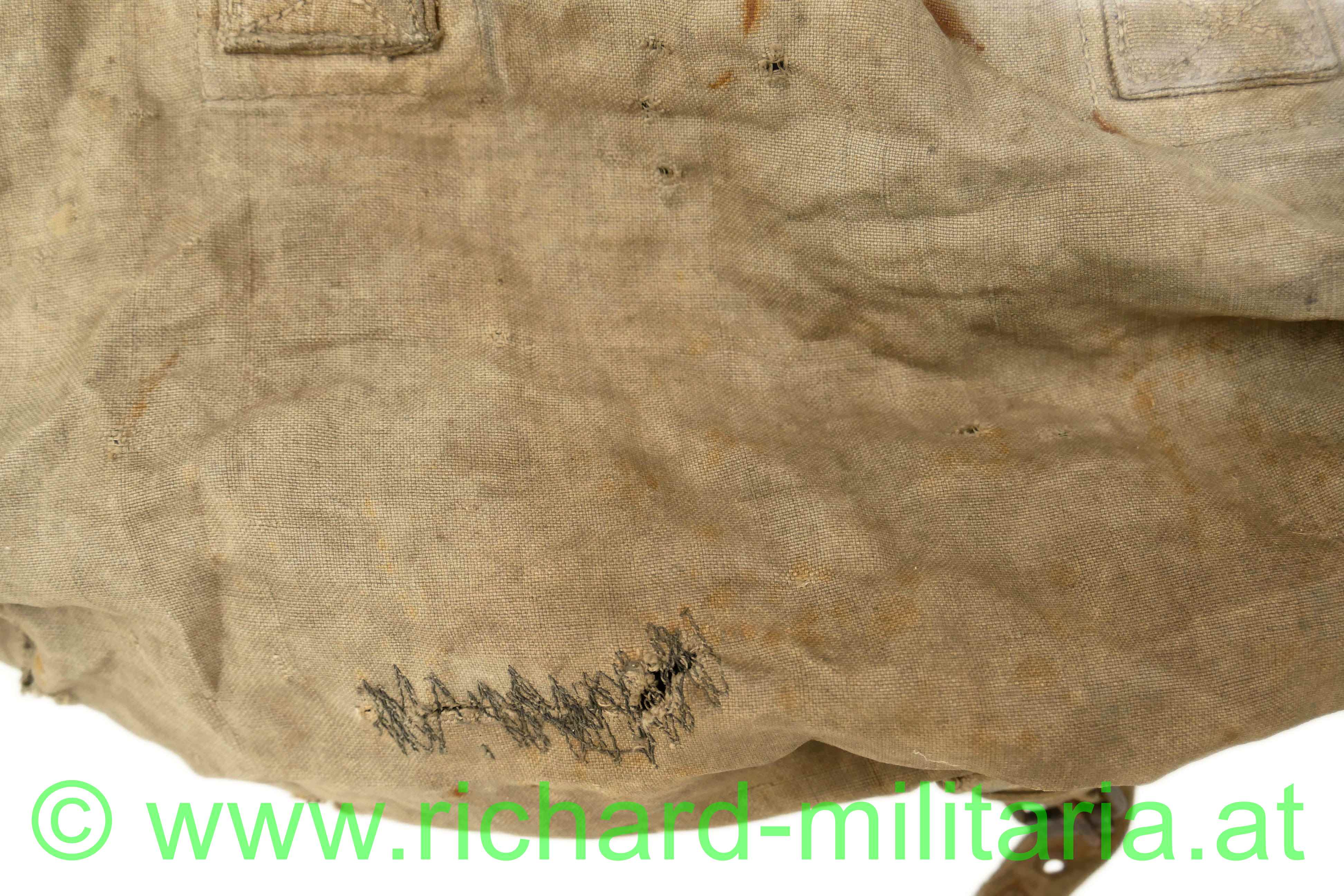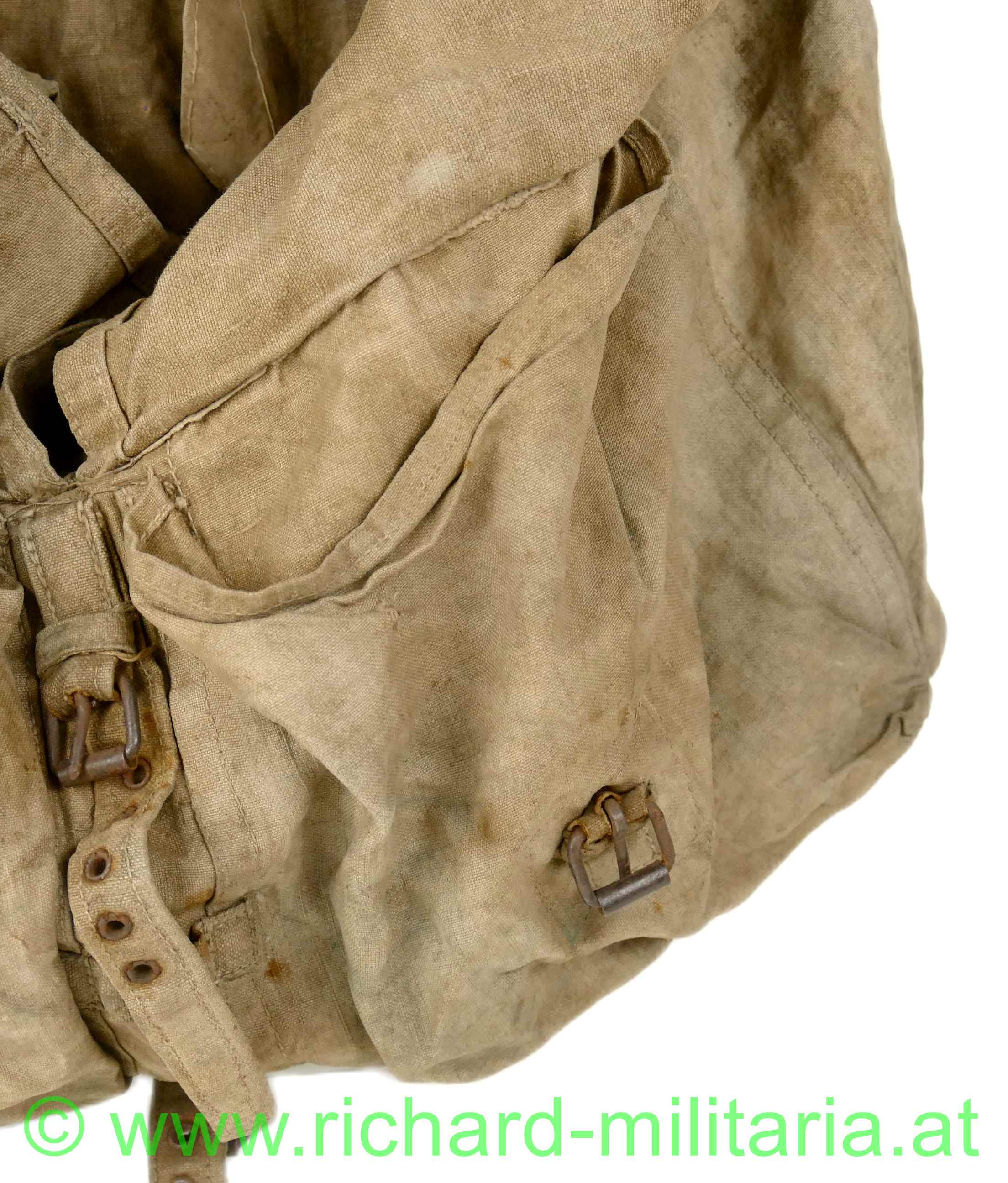 k.u.k. Rucksack M1916 - Monturdepotstempel, naturbraunes Leinen mit 2 gefütterten Leinengurten - die Leinenschlaufen zum Einhängen in die Patronentaschen fehlen, frontseitig befinden sich 2 Taschen die mittels Leinenriemen und Dornschnallen geschlossen werden, Rucksackdeckel ist ebenfalls mit einer Dornschnalle zu schließen, auf der Innenseite des Rucksackdeckel deutlich sichbarer Monturdepotstempel; Rucksack hat deutliche Trage- und Alterungsspuren, angeschmutzt mit Reparaturstellen,