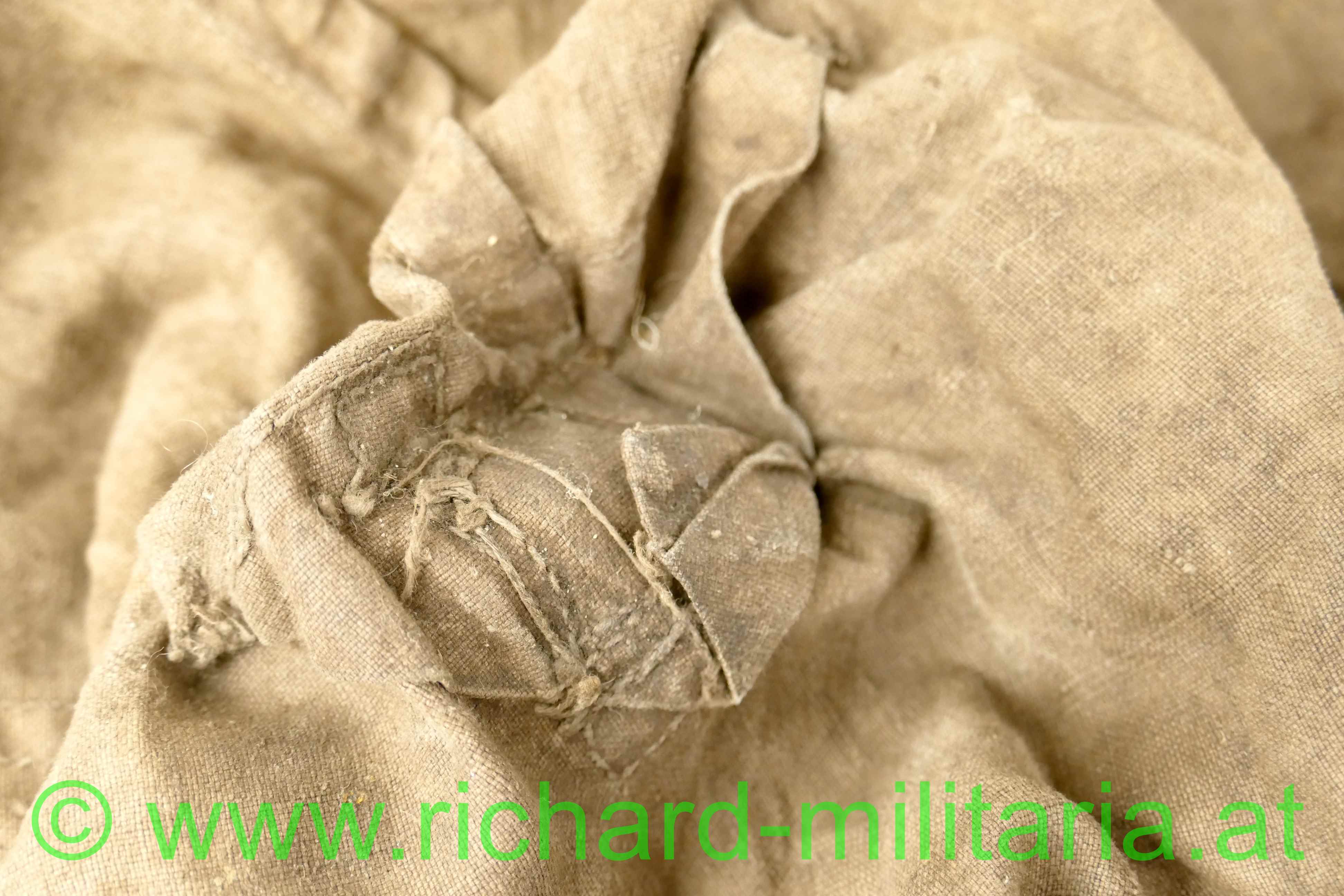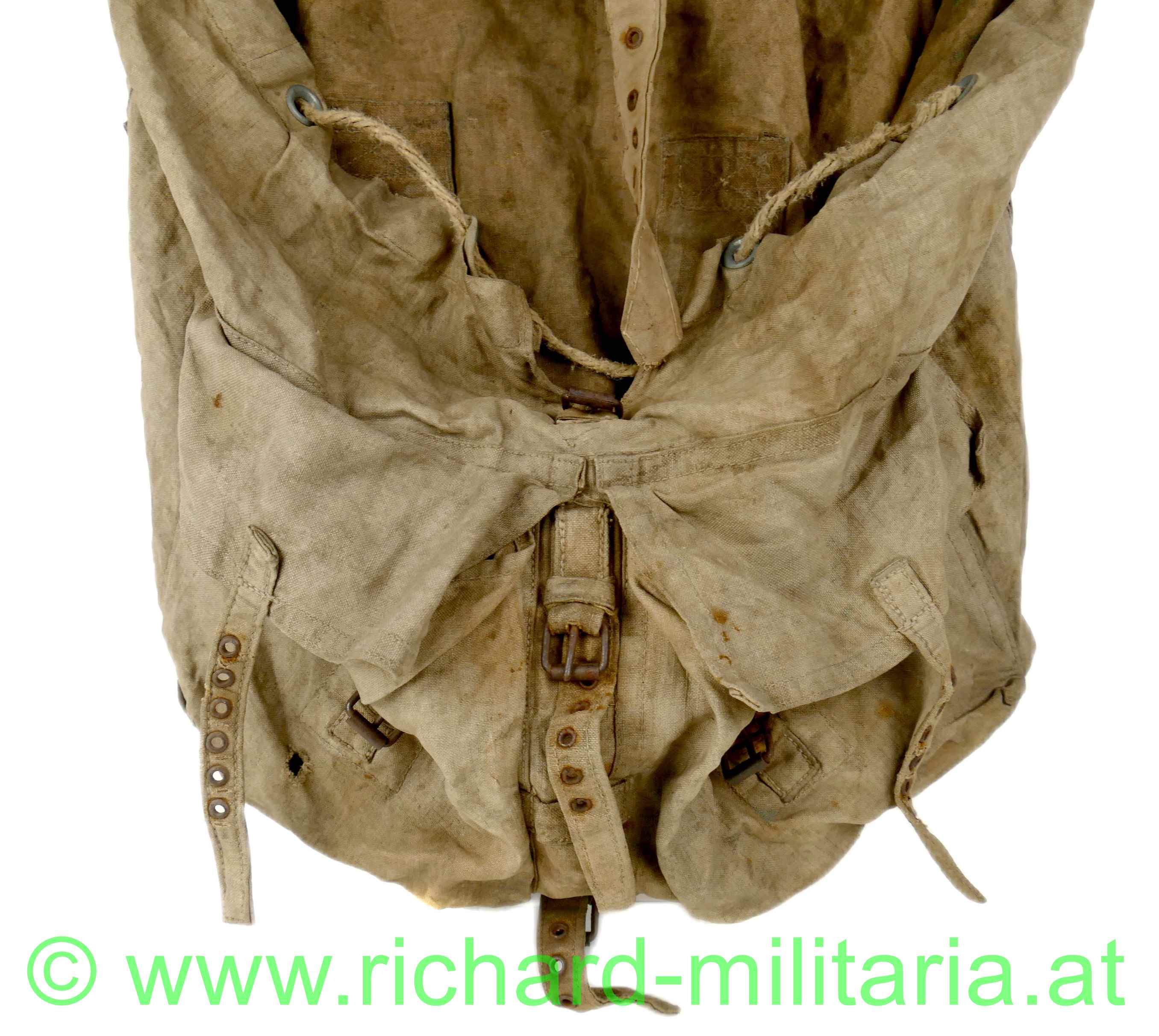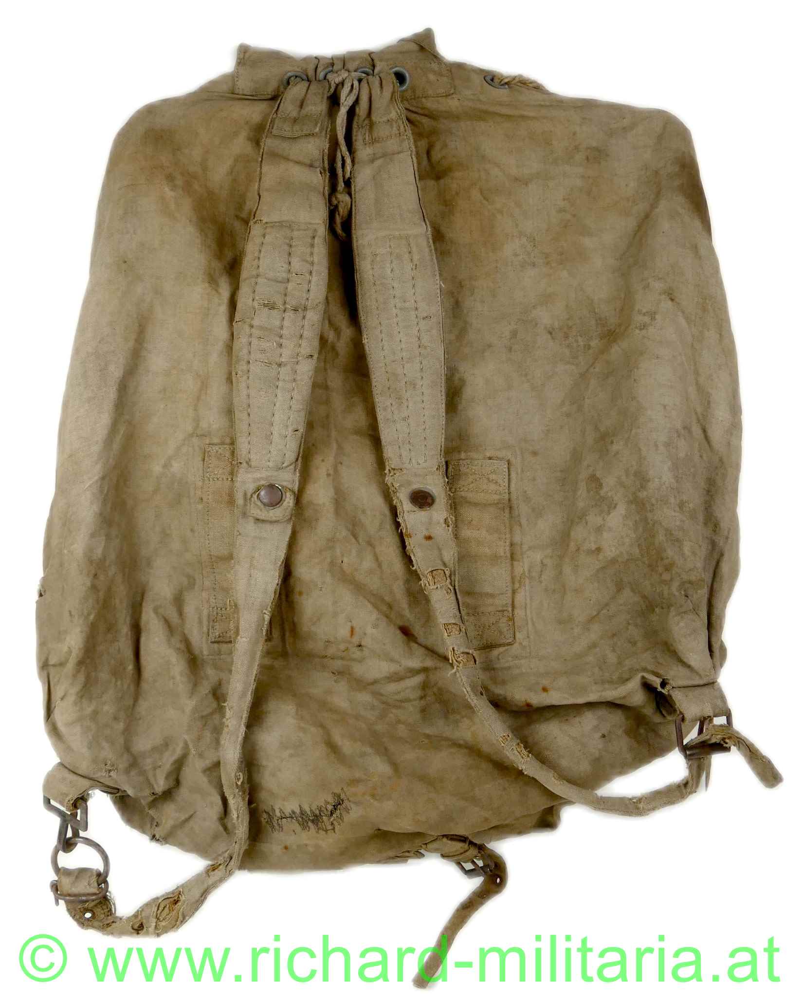 k.u.k. Rucksack M1916 - Monturdepotstempel, naturbraunes Leinen mit 2 gefütterten Leinengurten - die Leinenschlaufen zum Einhängen in die Patronentaschen fehlen, frontseitig befinden sich 2 Taschen die mittels Leinenriemen und Dornschnallen geschlossen werden, Rucksackdeckel ist ebenfalls mit einer Dornschnalle zu schließen, auf der Innenseite des Rucksackdeckel deutlich sichbarer Monturdepotstempel; Rucksack hat deutliche Trage- und Alterungsspuren, angeschmutzt mit Reparaturstellen,