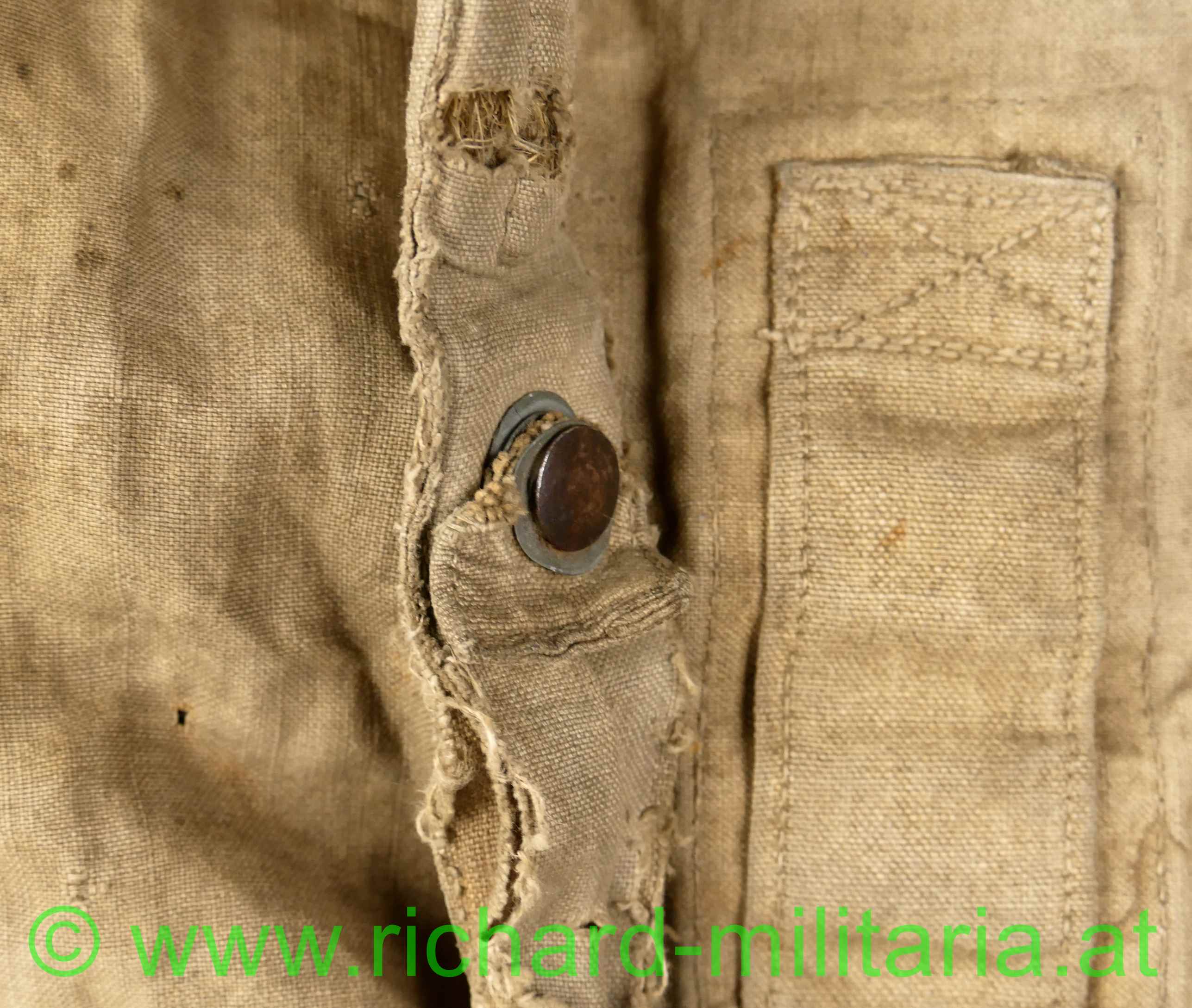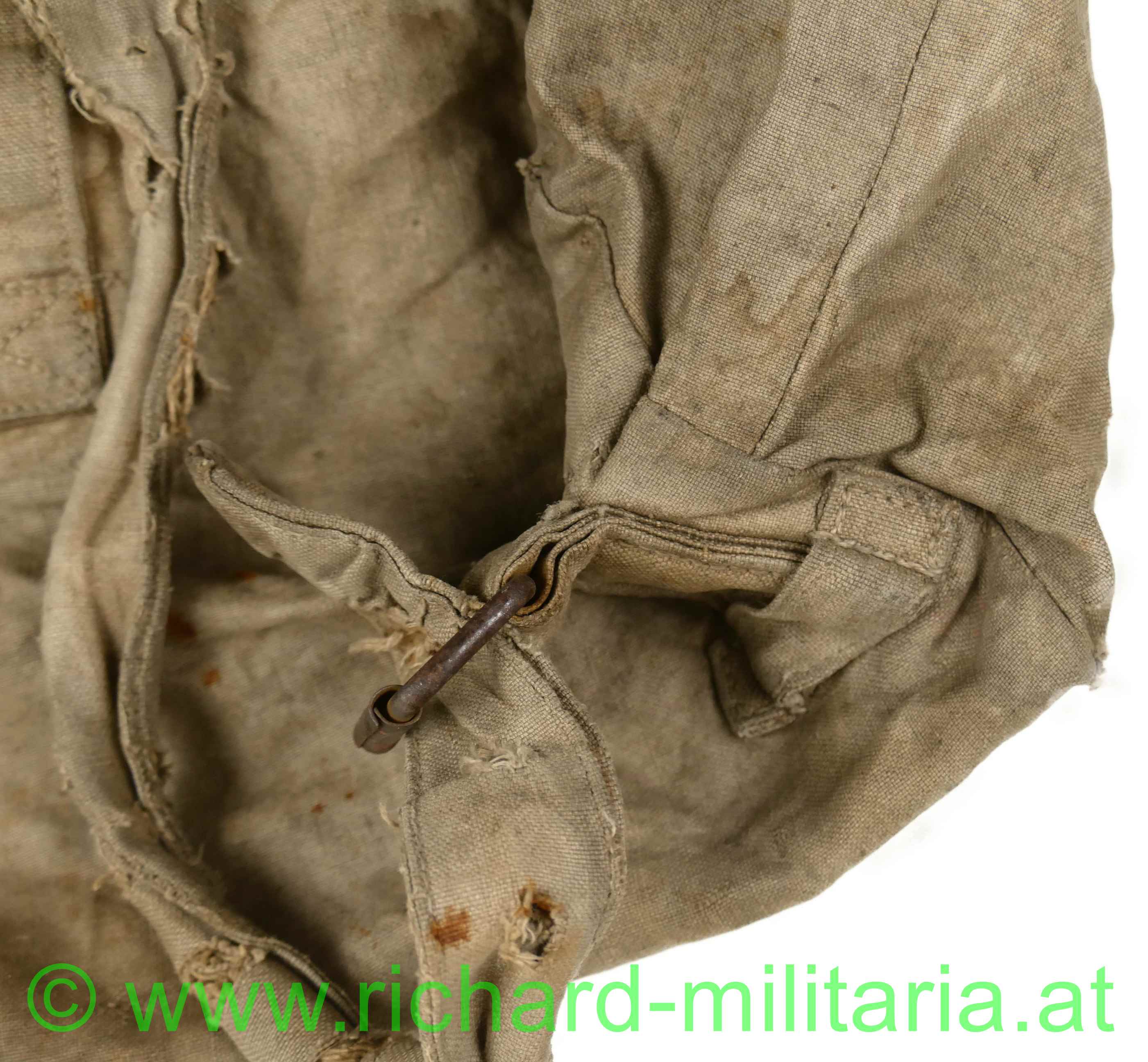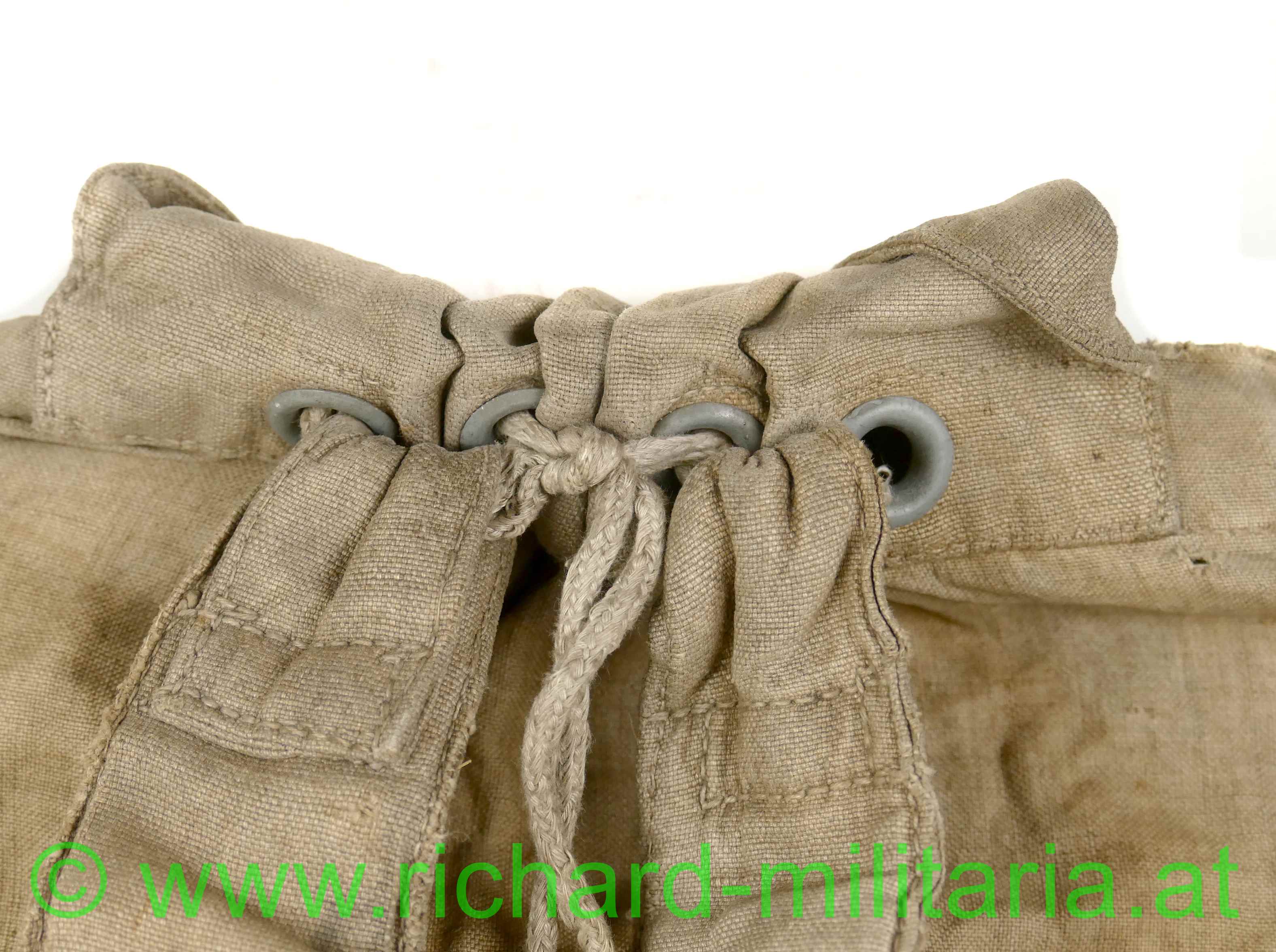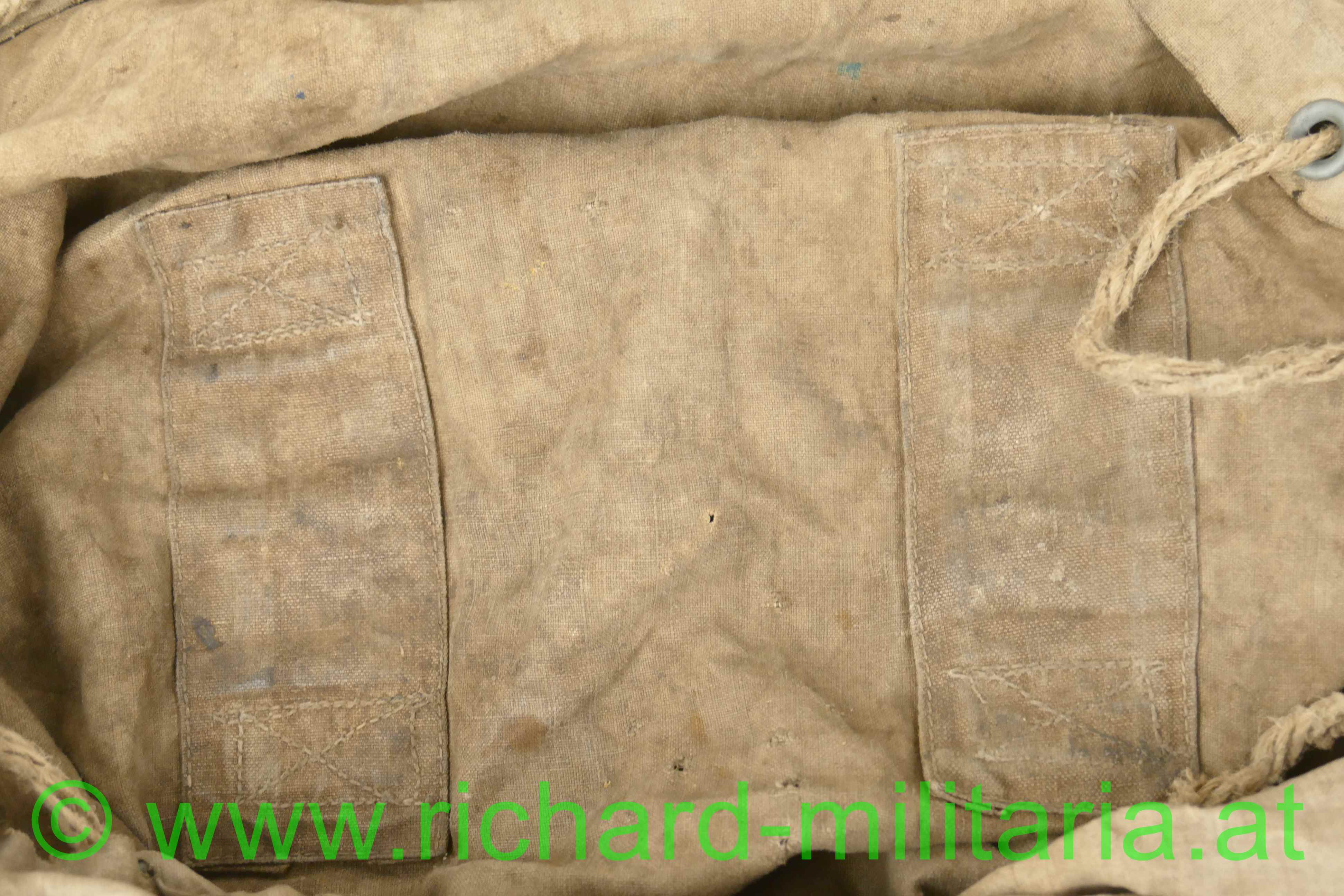 k.u.k. Rucksack M1916 - Monturdepotstempel, naturbraunes Leinen mit 2 gefütterten Leinengurten - die Leinenschlaufen zum Einhängen in die Patronentaschen fehlen, frontseitig befinden sich 2 Taschen die mittels Leinenriemen und Dornschnallen geschlossen werden, Rucksackdeckel ist ebenfalls mit einer Dornschnalle zu schließen, auf der Innenseite des Rucksackdeckel deutlich sichbarer Monturdepotstempel; Rucksack hat deutliche Trage- und Alterungsspuren, angeschmutzt mit Reparaturstellen,