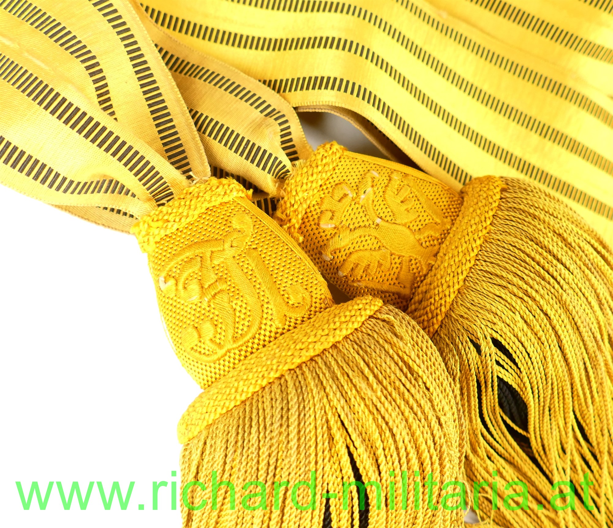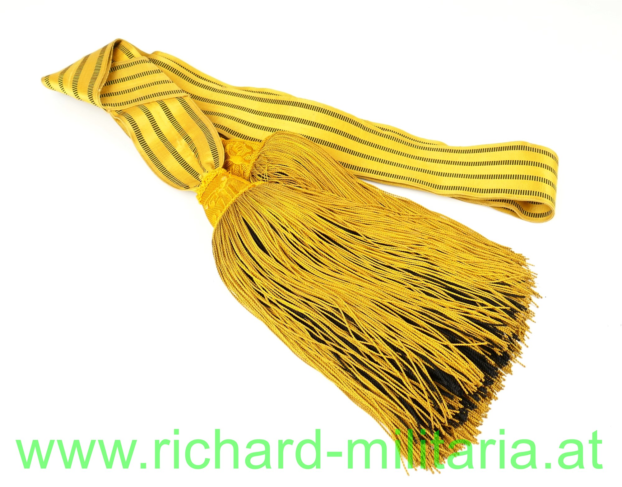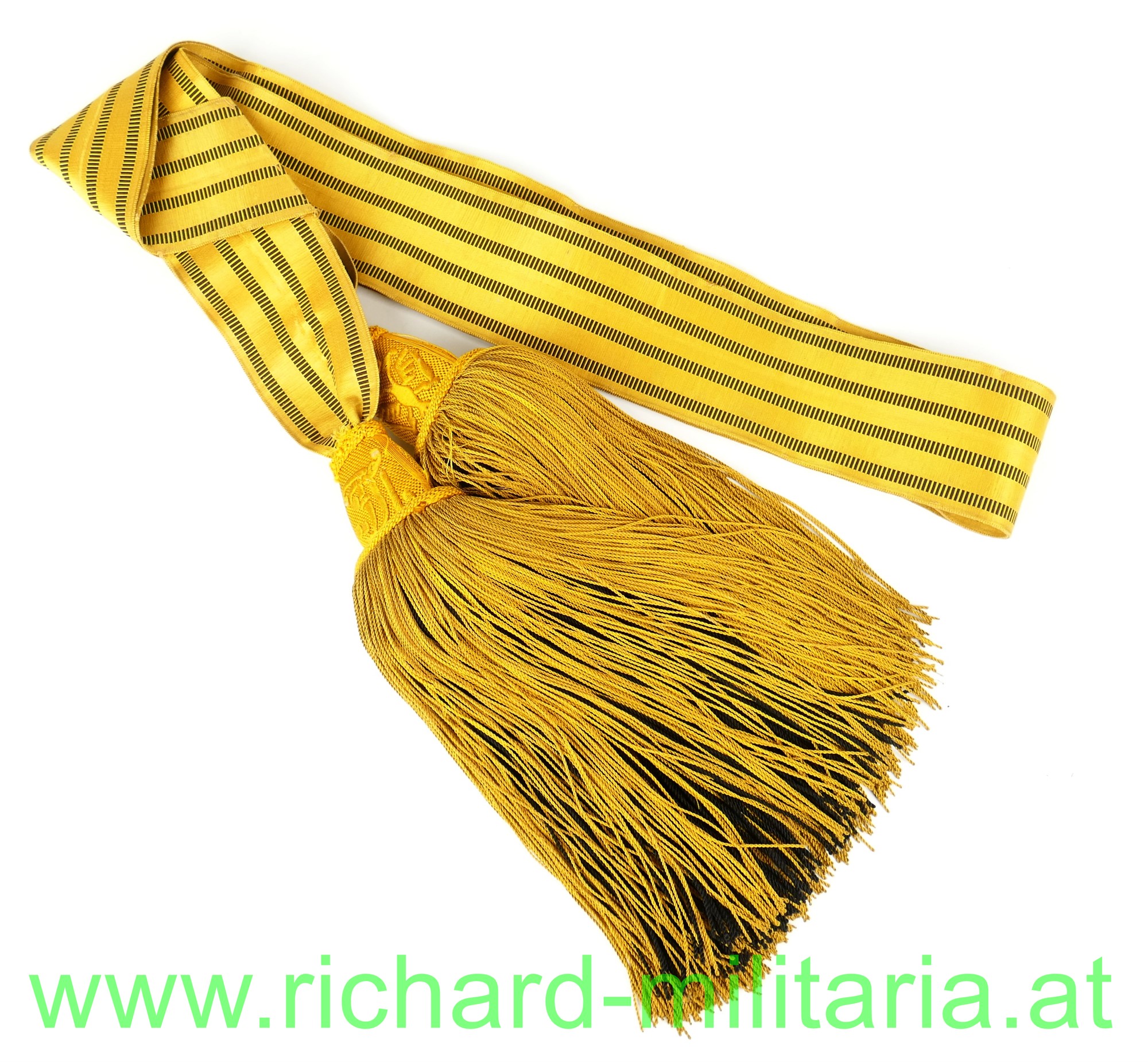 k.u.k. Schärpe für Adjutanten, um 1900/1910, kaisergelbe Wolle mit 4 schwarzen gestreiften Durchzügen; 2 Quasten mit kaiserlichen Namenszug bzw. kaiserlichem Doppeladler, Bandbreite ca. 6.8 cm, original vernäht, dünne Fransen