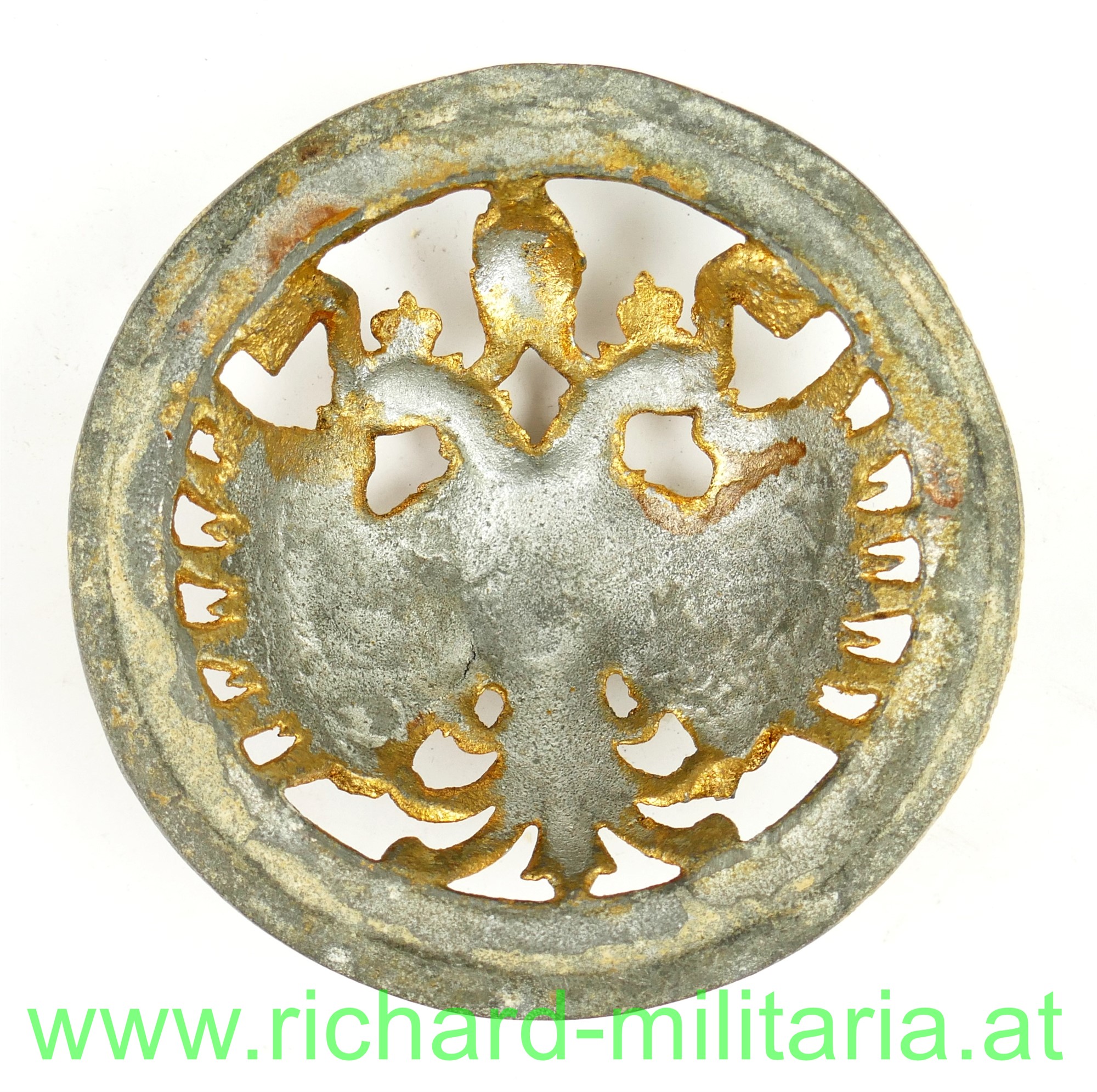bombiertes k.u.k. Wappenschild "kaiserl. u. königl. Hoflieferant", zeitgenössischer Zinkguss mit Resten der Vergoldung;