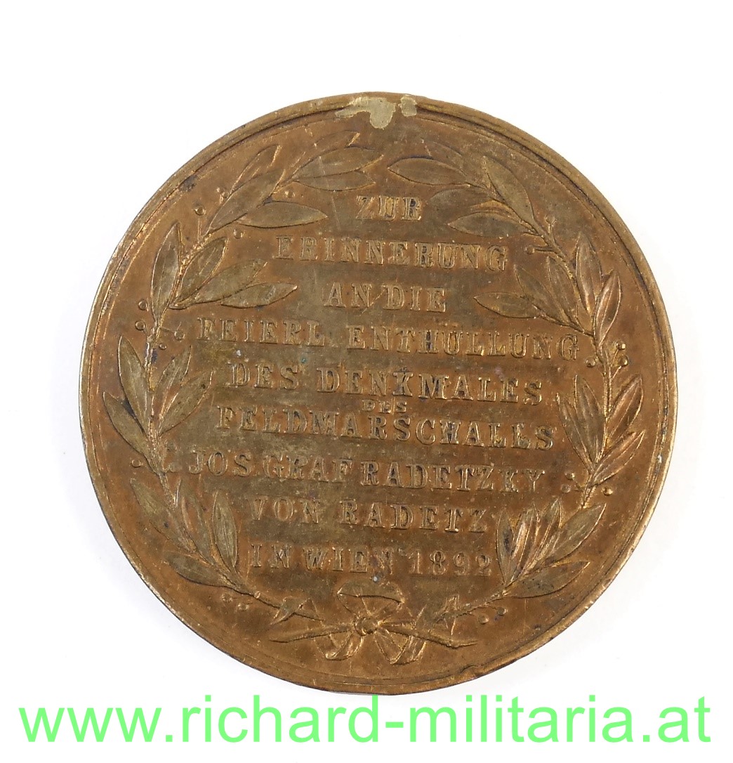 Medaille - Enthüllung Radetzkydenkmal 1892 Wien; AVERS: "Zur Erinnerung an die Enthüllung des Radetzkydenkmales in Wien 1892"; REVERS: "Zur Erinnerung an die feierliche Enthüllung des Denkmales des Feldmarschalls Jos. Graf Radetzky von Radetz in Wien 1892"; Bronze, Trageöse entfernt