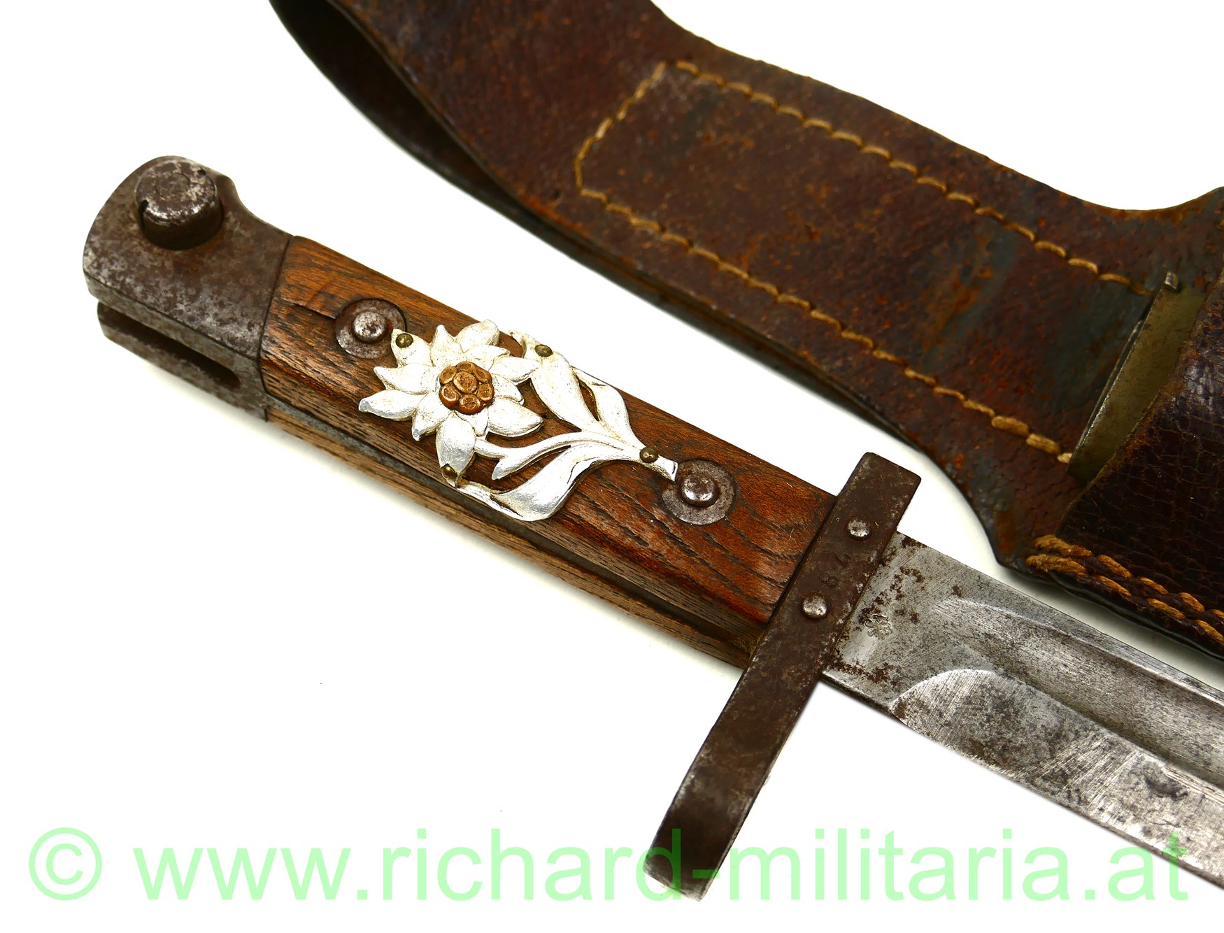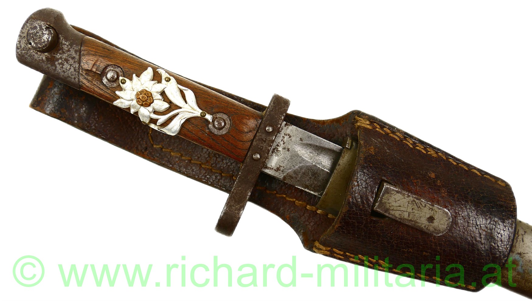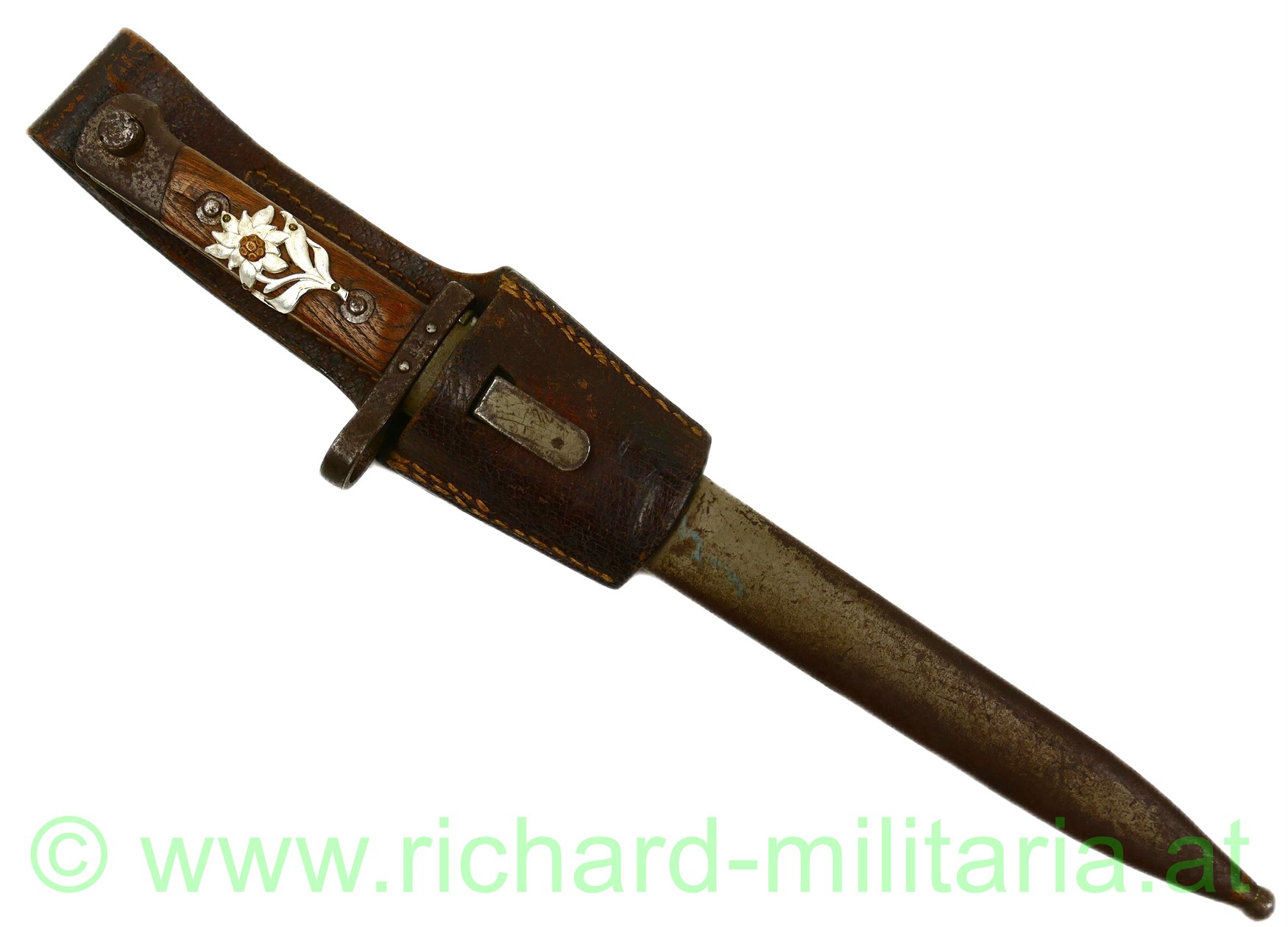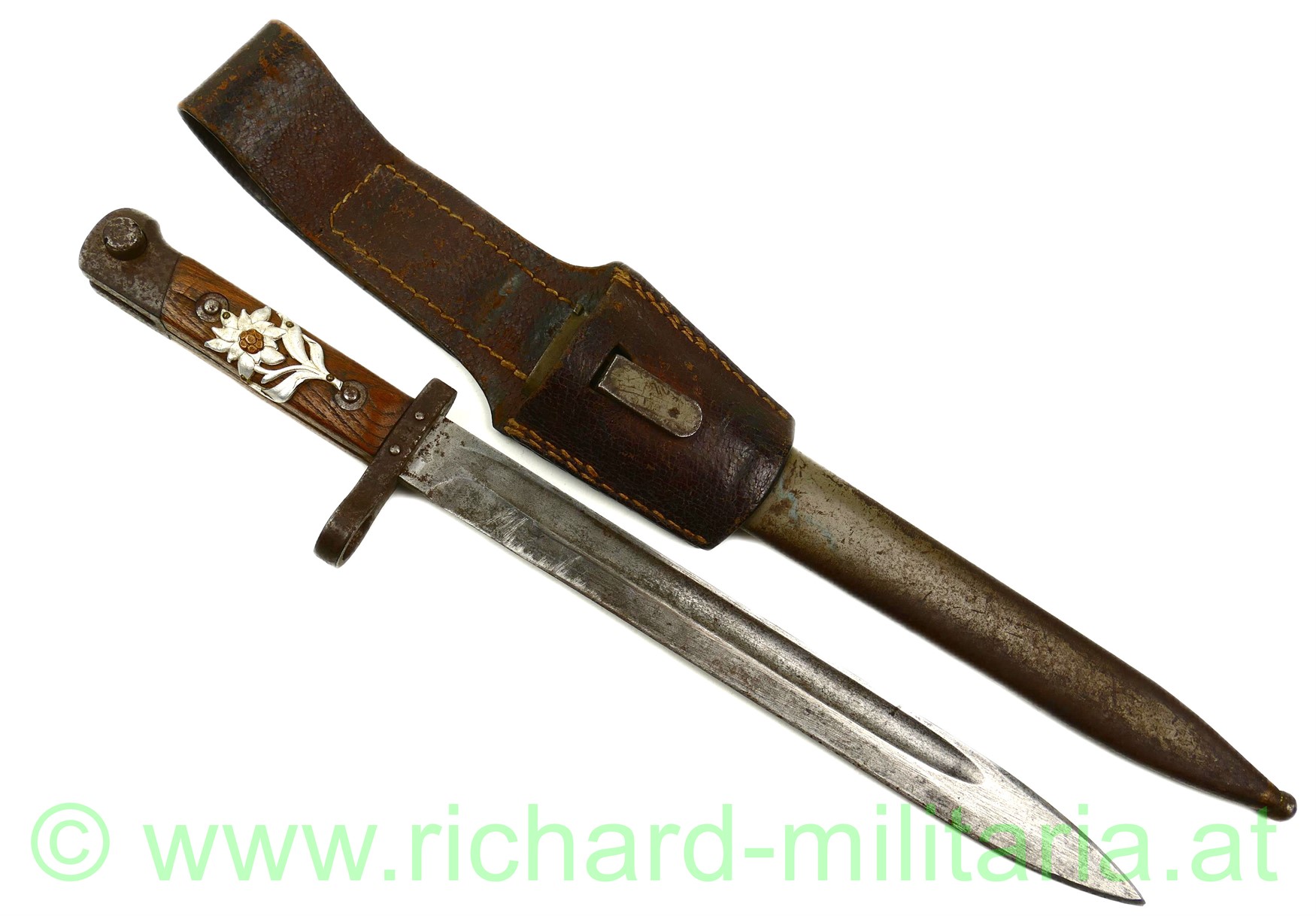 k.u.k. Messerbajonett M1895 für Unteroffiziere mit Truppenstempel "14 R" u. Waffennummer "3287" am Knauf - dieser rostig, auf der Parierstange die Nr. 78 eingeschlagen; Hersteller: OeWG und k.u.k. Armeeabnahme auf der Klinge - diese unberührt mit Gebrauchsspuren,original grün lackierte Stahlscheide mit Armeeabnahmestempel am Tragehaken, zweifach vernietete Holzgriffschalen - frontseitig zeitgenösisch aufgebrachtes Edelweiß der k.u.k.Gebirgstruppen; originales Trageleder im sehr guten Zustand;