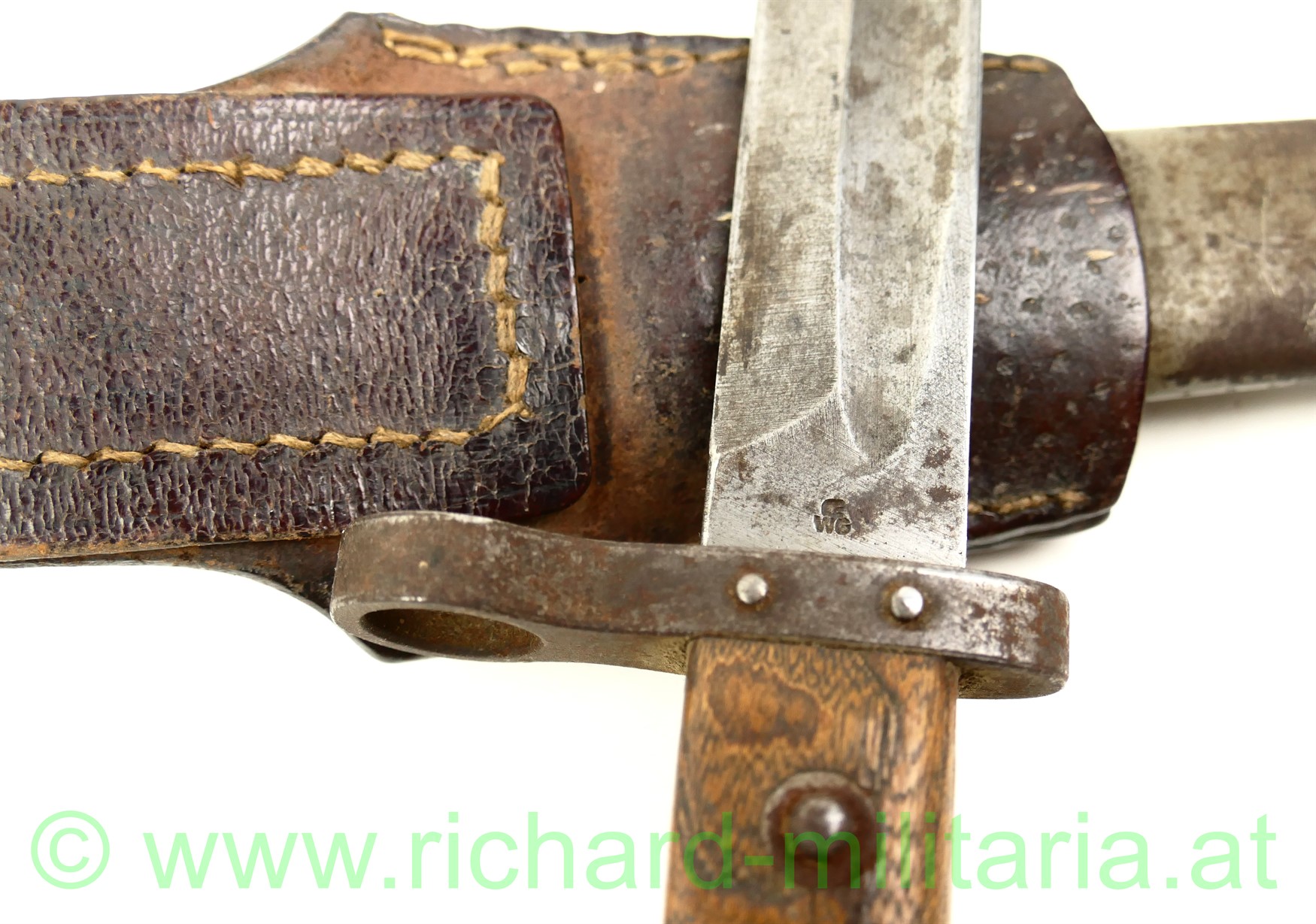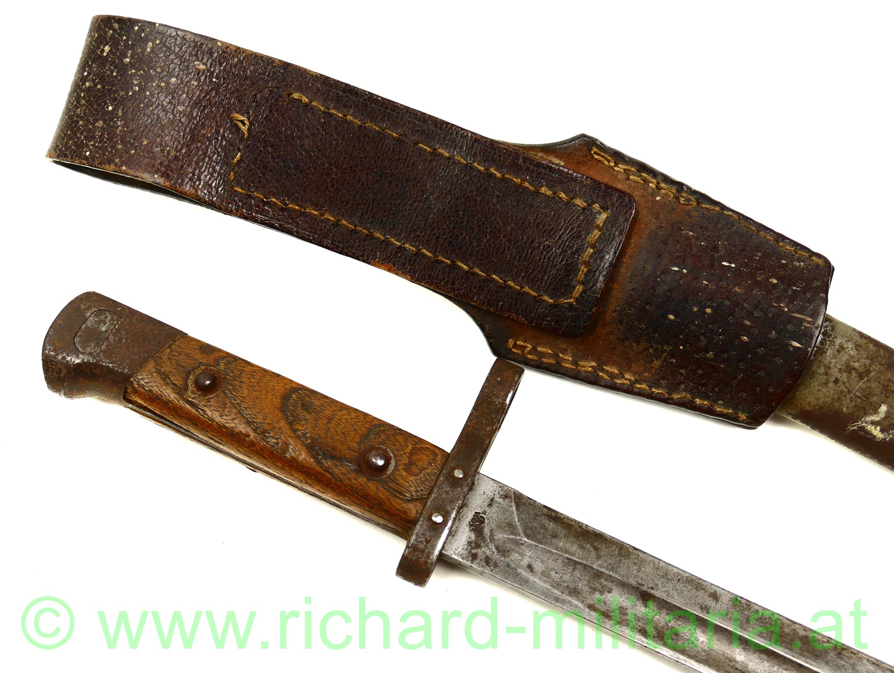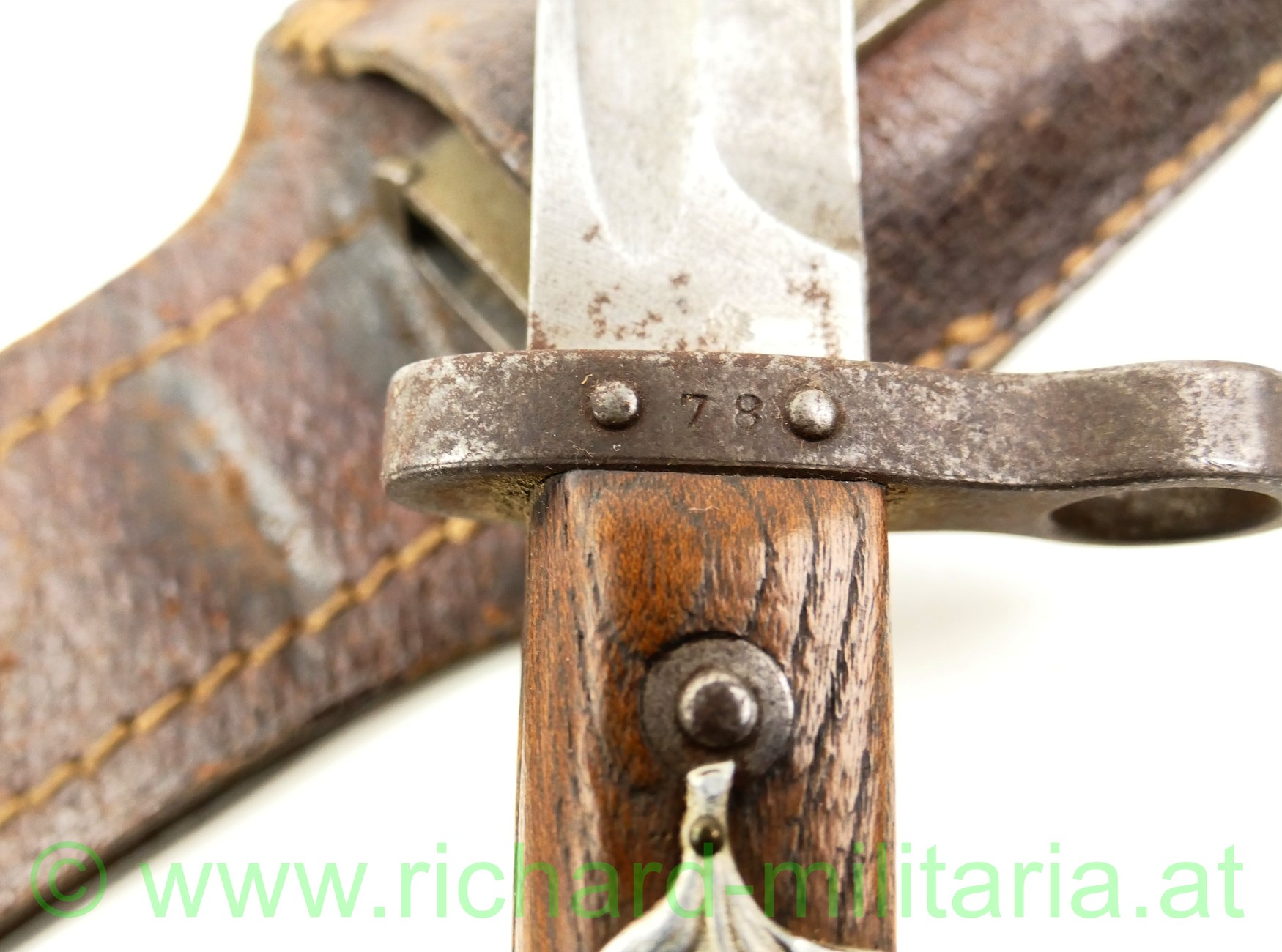 k.u.k. Messerbajonett M1895 für Unteroffiziere mit Truppenstempel "14 R" u. Waffennummer "3287" am Knauf - dieser rostig, auf der Parierstange die Nr. 78 eingeschlagen; Hersteller: OeWG und k.u.k. Armeeabnahme auf der Klinge - diese unberührt mit Gebrauchsspuren,original grün lackierte Stahlscheide mit Armeeabnahmestempel am Tragehaken, zweifach vernietete Holzgriffschalen - frontseitig zeitgenösisch aufgebrachtes Edelweiß der k.u.k.Gebirgstruppen; originales Trageleder im sehr guten Zustand;