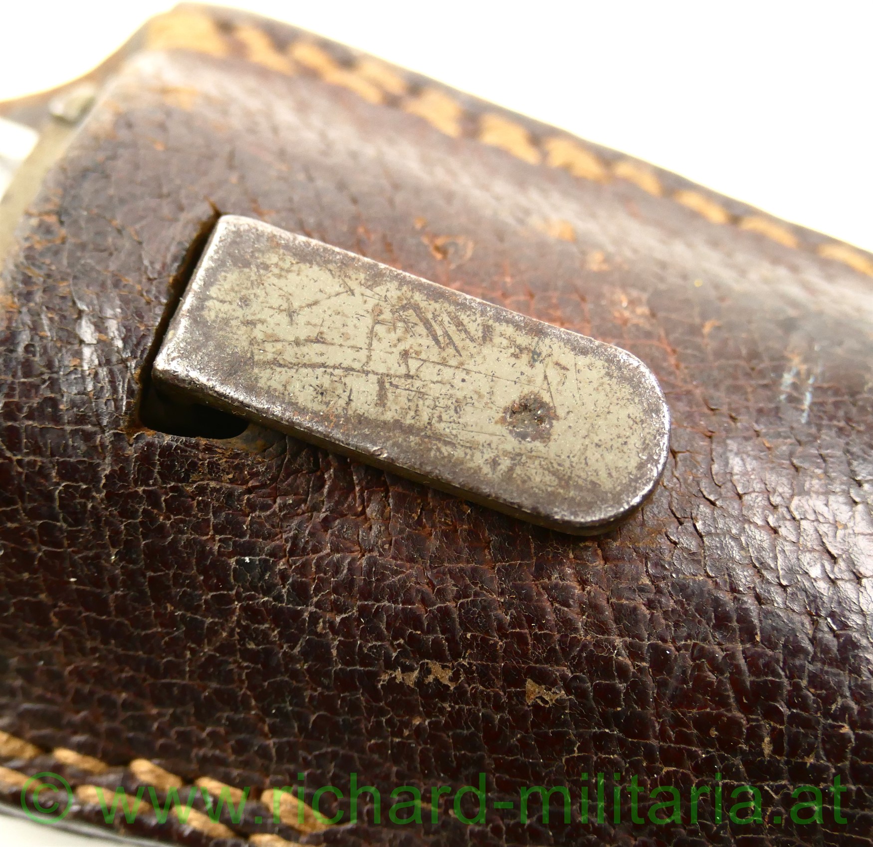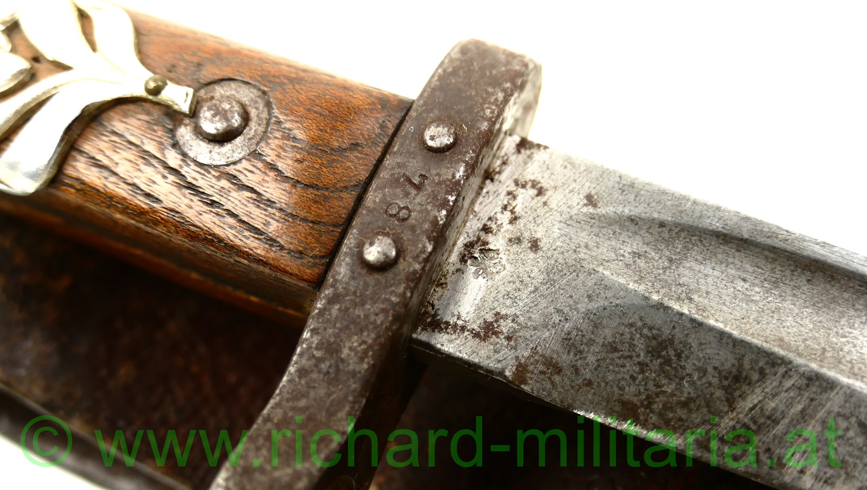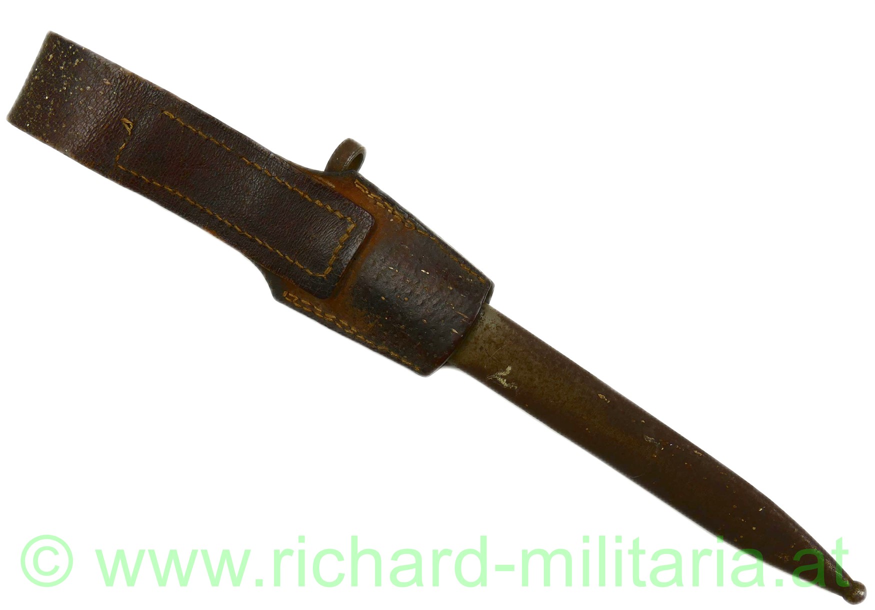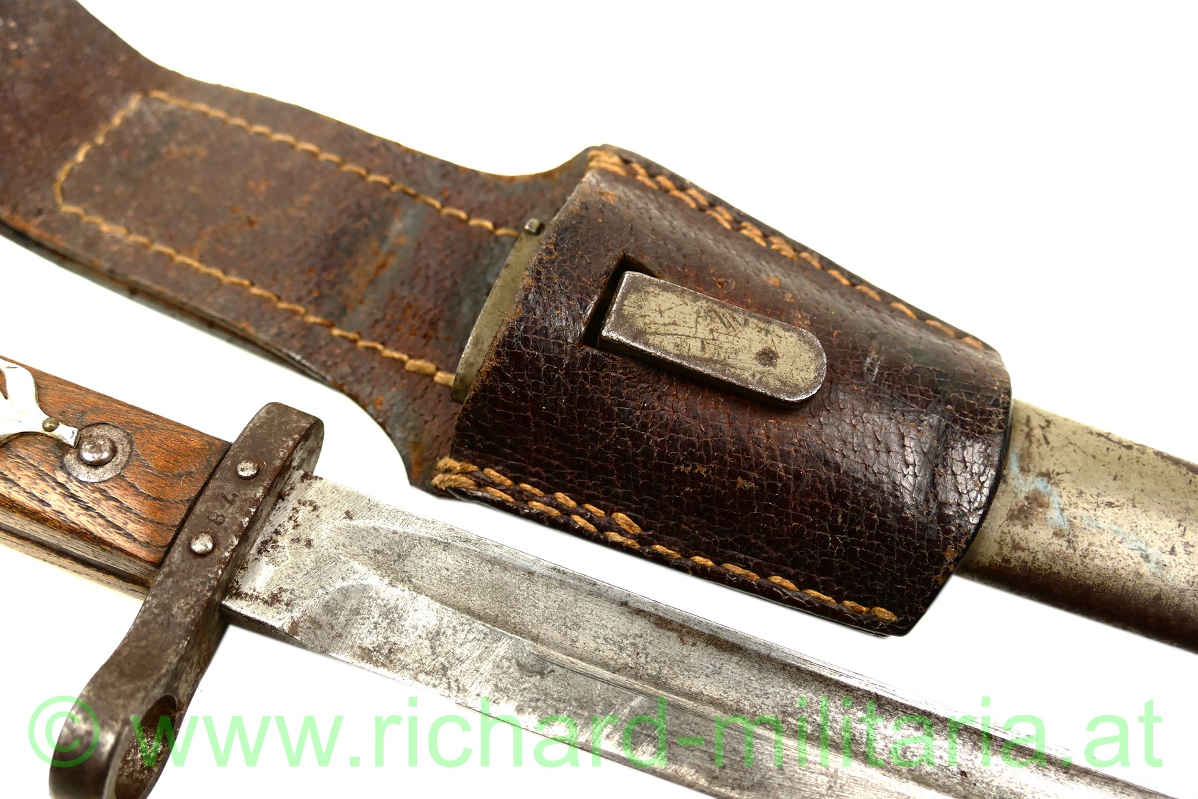 k.u.k. Messerbajonett M1895 für Unteroffiziere mit Truppenstempel "14 R" u. Waffennummer "3287" am Knauf - dieser rostig, auf der Parierstange die Nr. 78 eingeschlagen; Hersteller: OeWG und k.u.k. Armeeabnahme auf der Klinge - diese unberührt mit Gebrauchsspuren,original grün lackierte Stahlscheide mit Armeeabnahmestempel am Tragehaken, zweifach vernietete Holzgriffschalen - frontseitig zeitgenösisch aufgebrachtes Edelweiß der k.u.k.Gebirgstruppen; originales Trageleder im sehr guten Zustand;