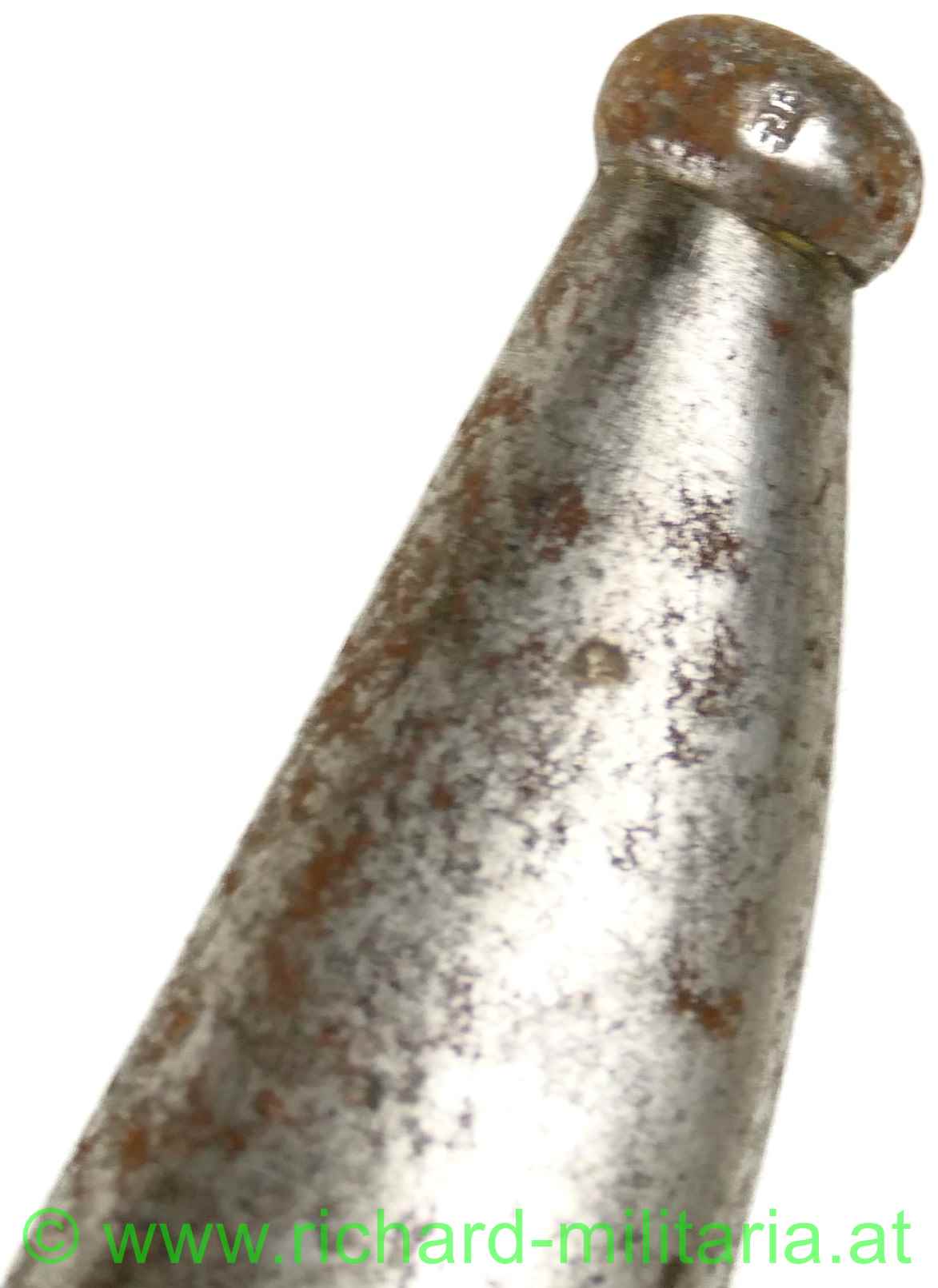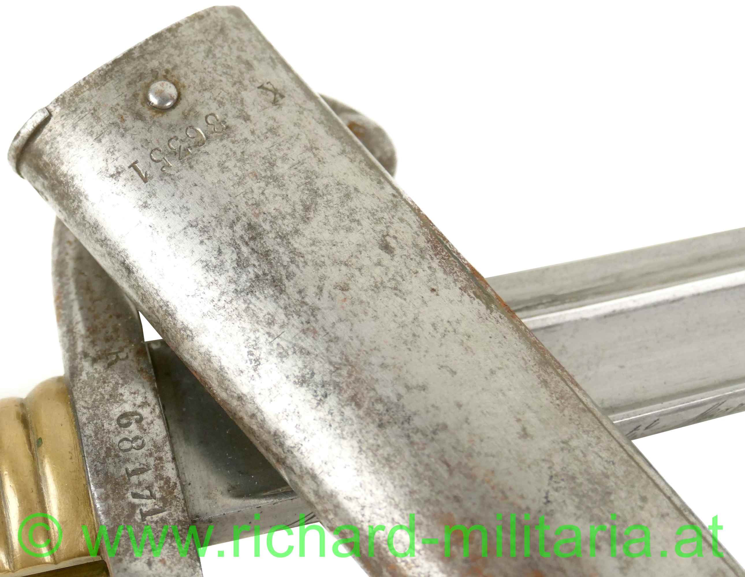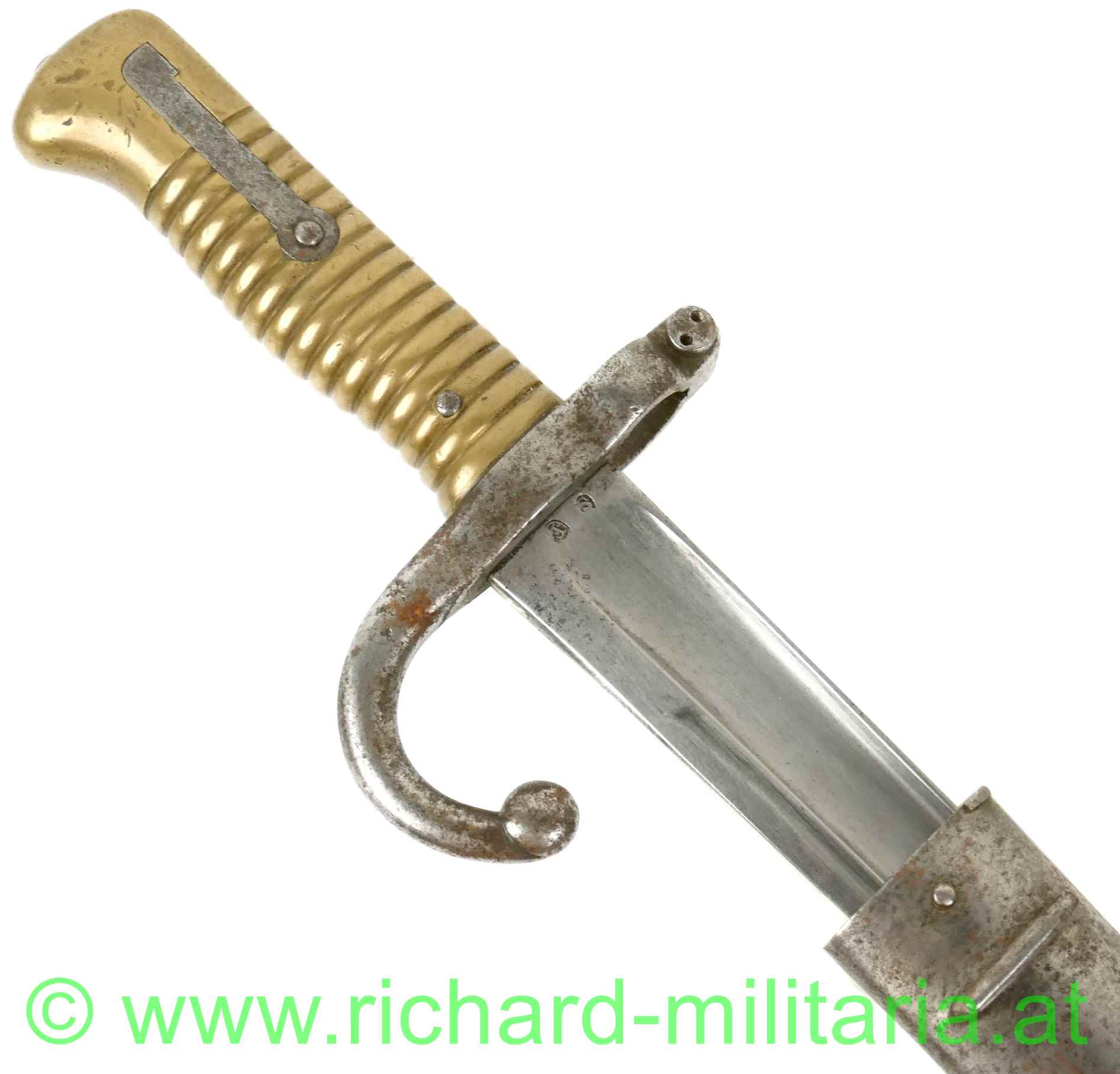 Mle 1866 Chasepot, Jatagan Bajonett - Frankreich, blanke Klinge - am Klingenrücken Herstellergravur mit Baujahr: "1868", gegossener Messinggriff mit gängigem Drücker, auf der Parierstange eingeschlagene Nummer: "R 68181", und verschiedene kleinere Stempel; Scheide aus Metall ohne Dellen - komplett gereinigt - flugrostig - eingeschlagene Nummer: "86351",