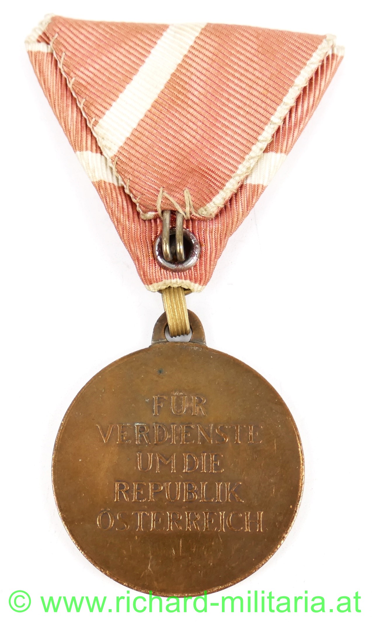 Bronzene Medaille für Verdienste um die Republik Österreich; 1. Modell mit kleinem Adler; Tombak; originales Band; Avers: Bundesadler der Ersten Republik; Revers: „FÜR VERDIENSTE UM DIE REPUBLIK ÖSTERREICH“,