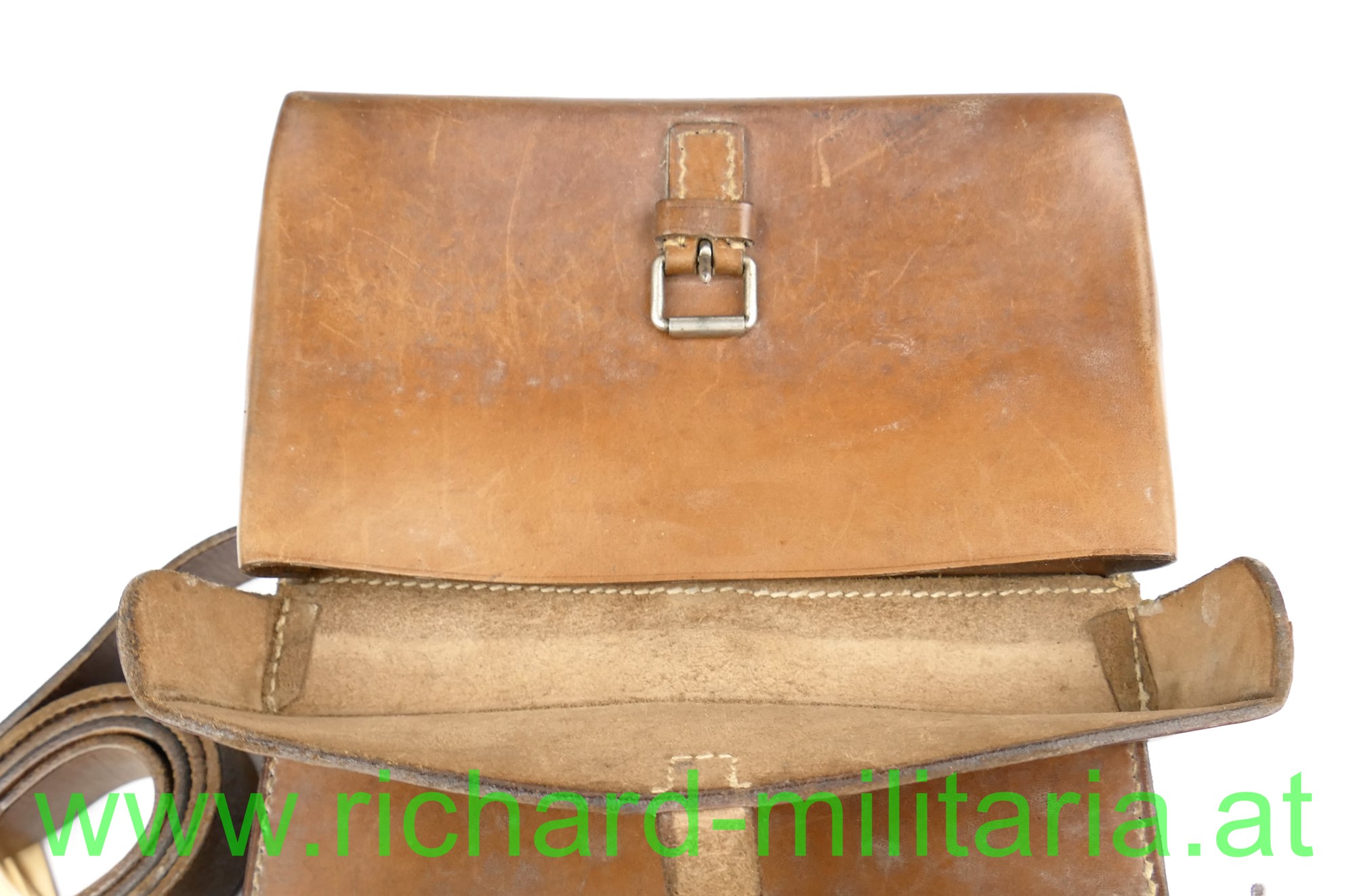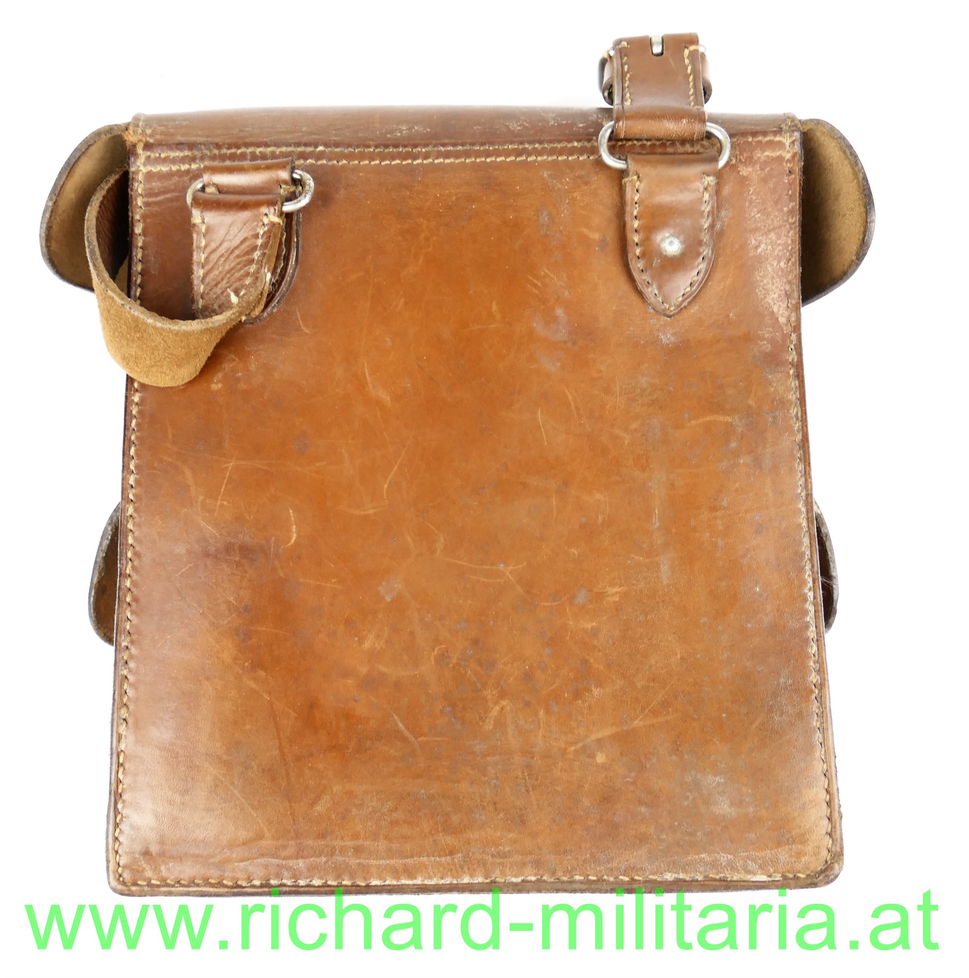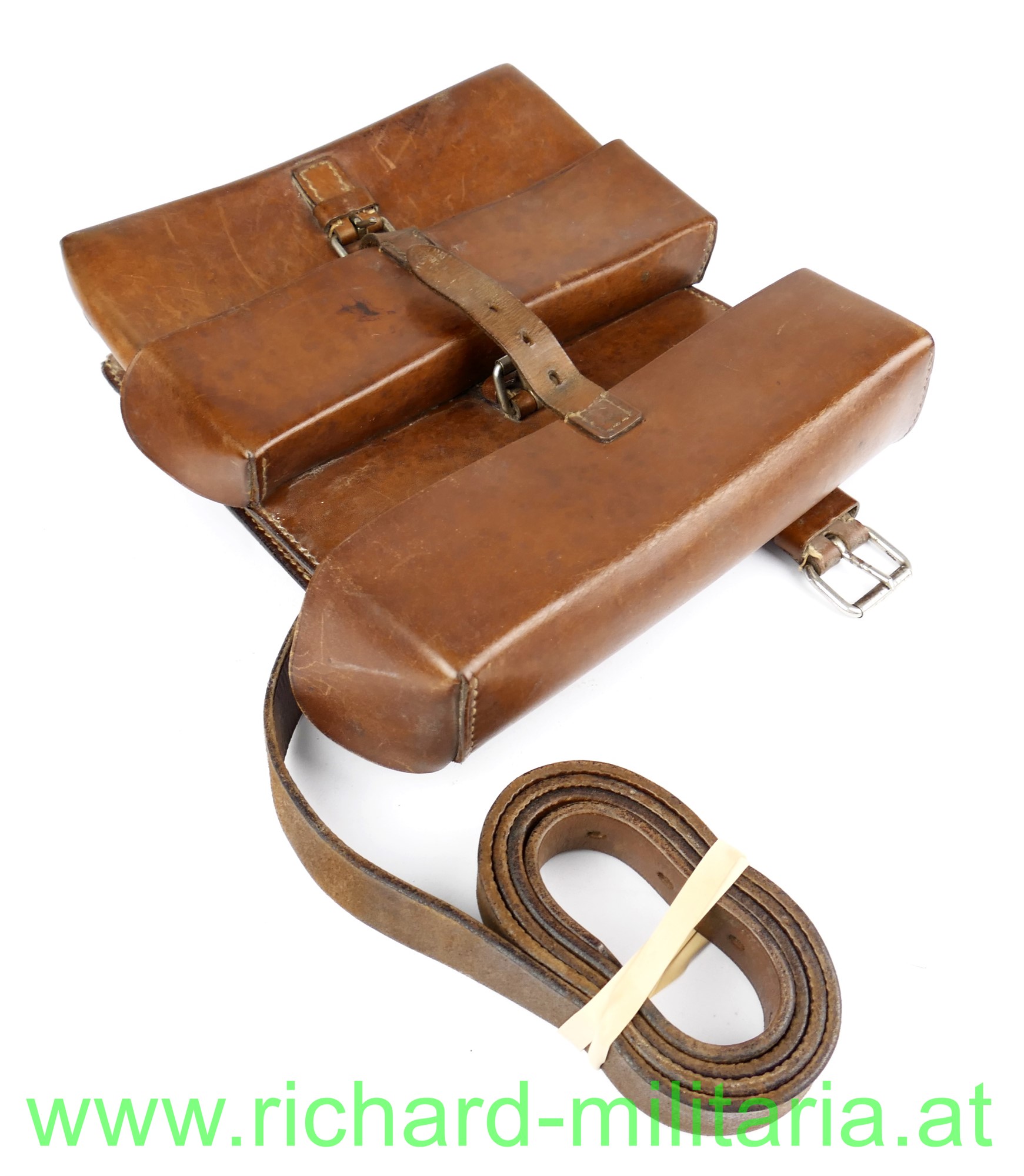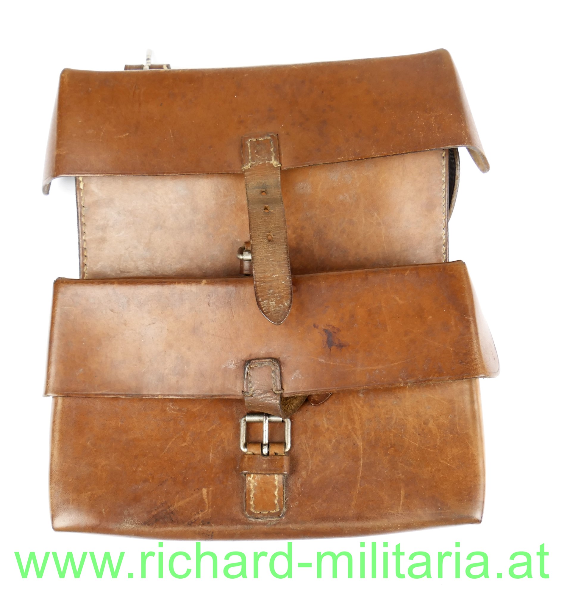 Österreich B-Gendarmerie - Patrouillentasche; dickes braunes Leder mit 2 Fächern - jeweils mit Deckel; innen gestempelt "GBA 1950" und Stolla Wien; komplett mit Schulterriemen und den Verschlusslaschen; sehr guter Zustand.