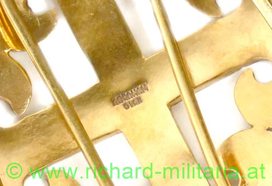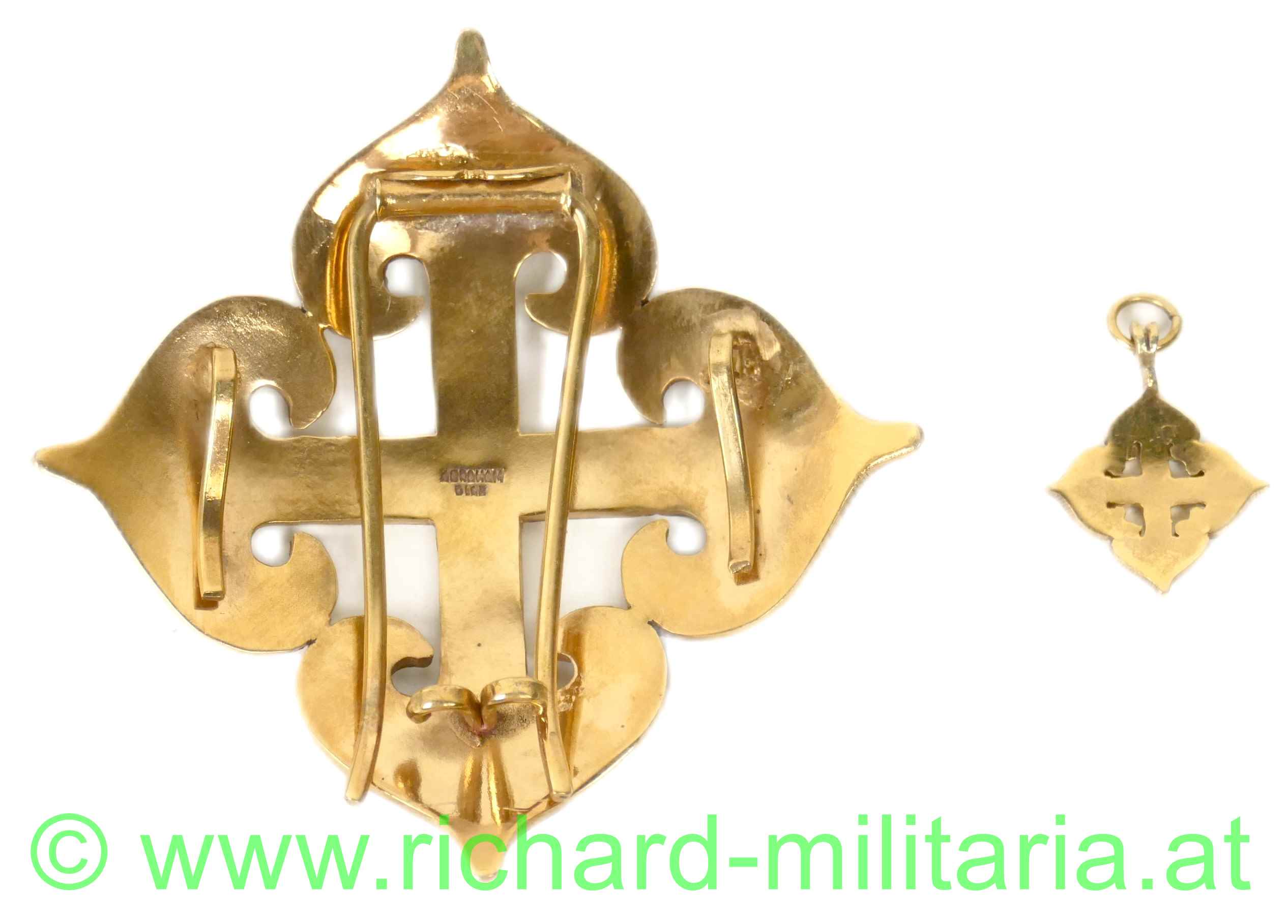 Orden des spanischen Adels mit Miniatur; weinrote Emaillierung auf der Vorderseite in nahe zu perfekter Erhaltung; Emaillierung mit feiner linienartigen Maserung; Rückseite Tombak vergoldet; zweiarmiges Verschlusssystem auf der Rückseite voll funktionsfähig; Punzierung "Abraham Diaz" mittig auf der Rückseite; Durchmesser: 80mm;