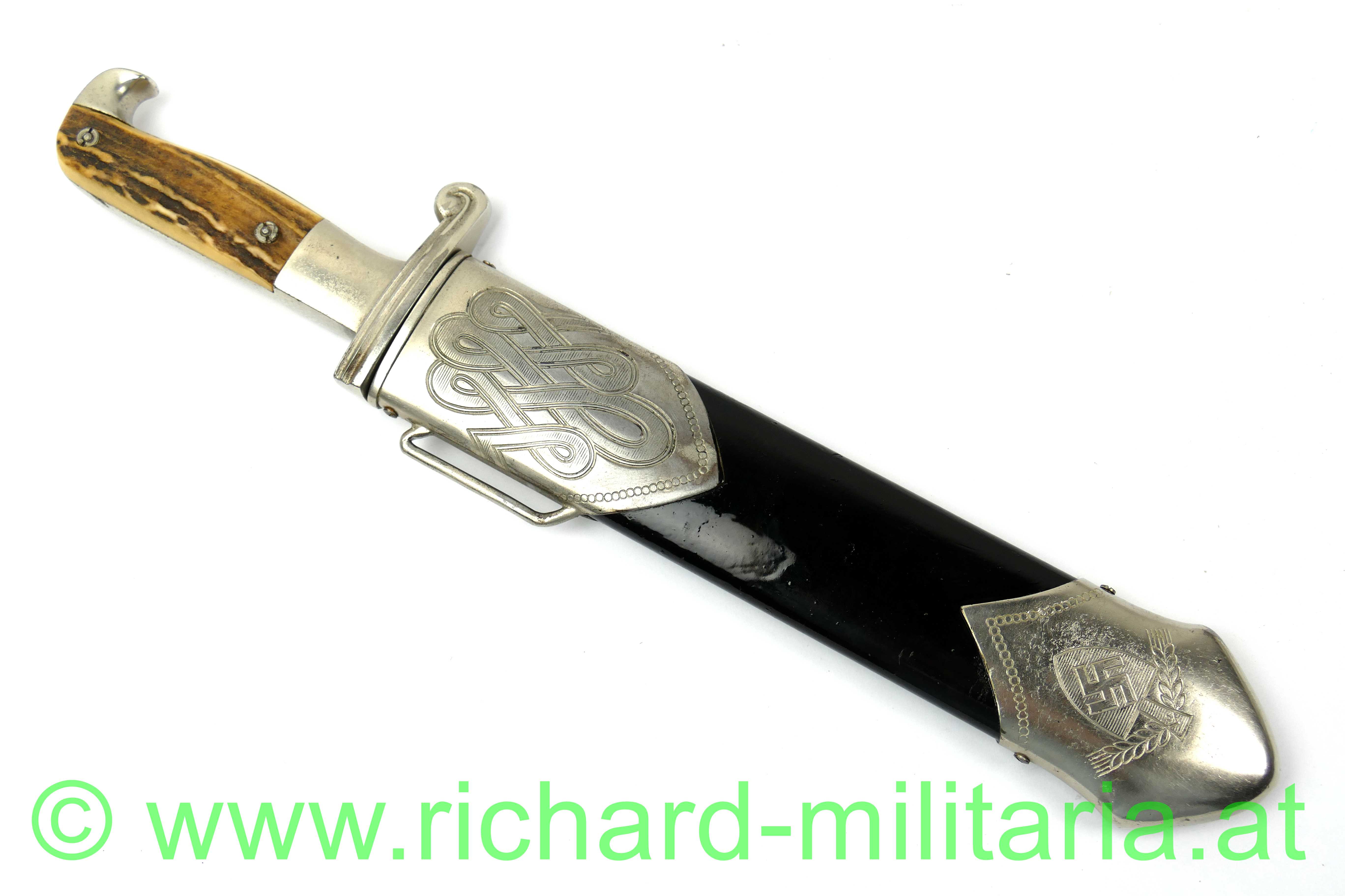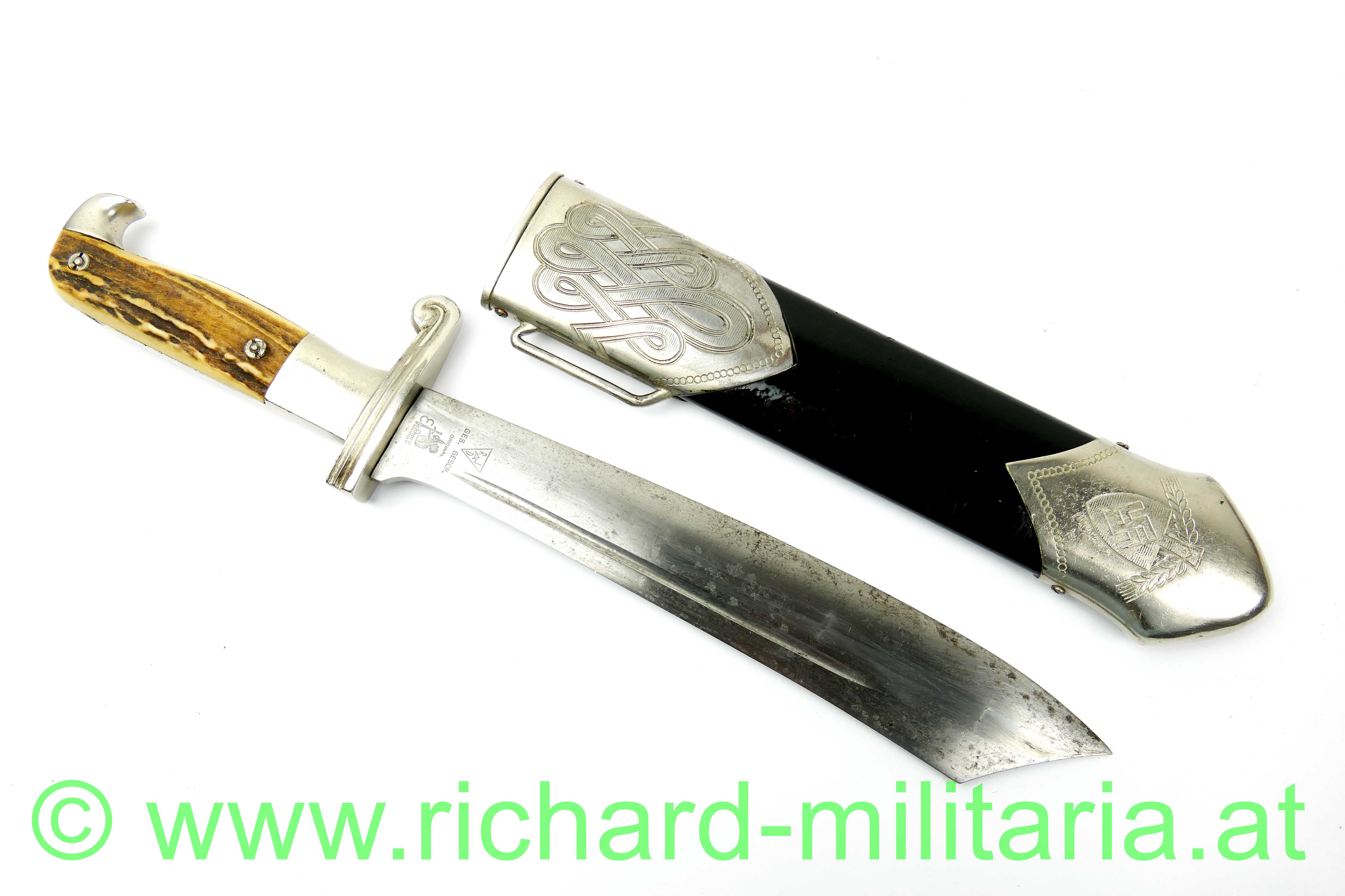 Reichsarbeitsdienst Hauer für Mannschaften und Unterführer; Hersteller: "Eickhorn Solingen" und "RadJ - Ges. Gesch."; Klinge mit Devise: "Arbeit adelt"; Klinge fleckig; verschraubte Horngriffschalen,