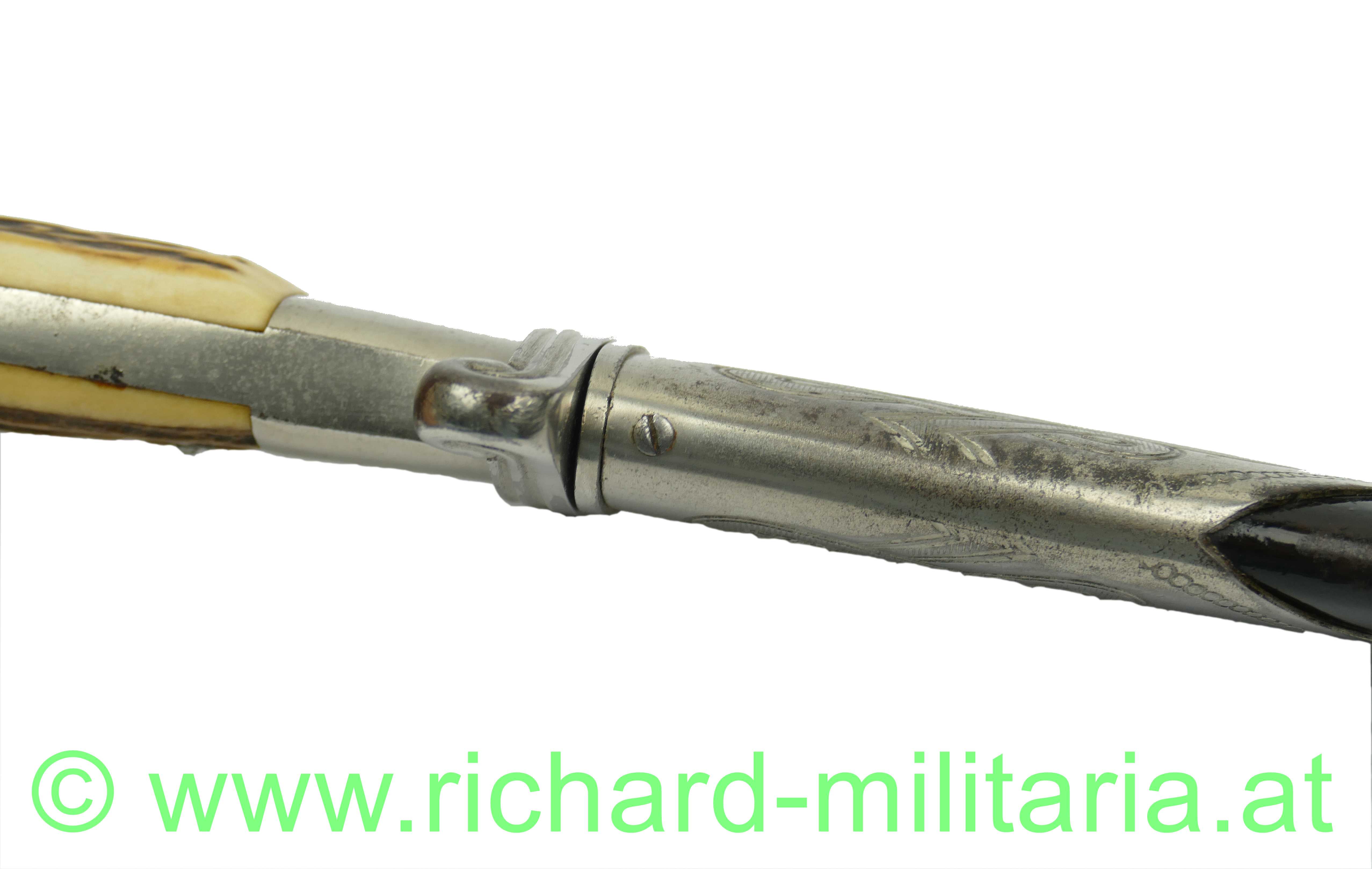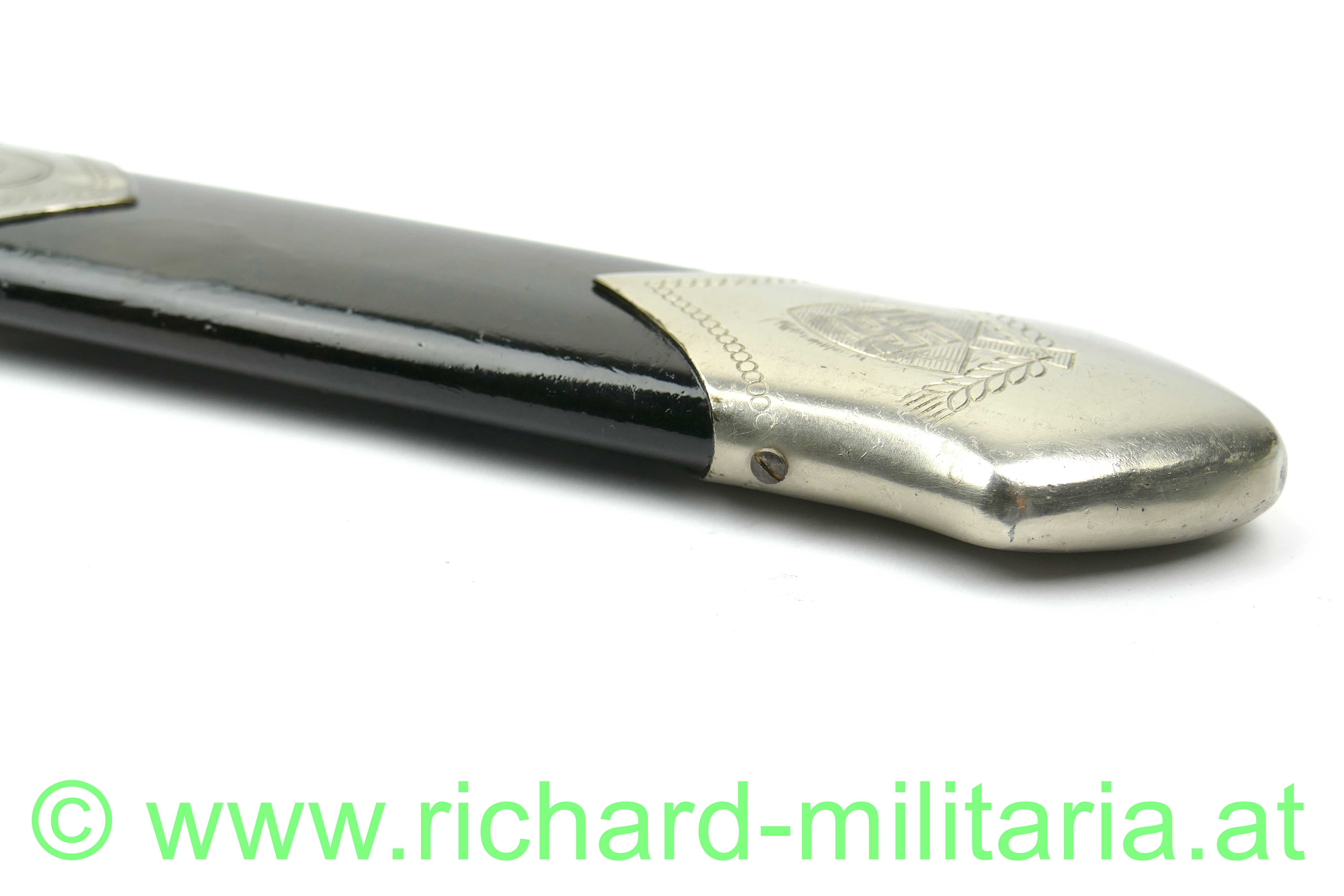 Griffstück aus Eisen vernickelt - leicht flugrostig, originale Eisenscheide - diese neu lackiert; originale Beschläge mit Tragespuren vom Gehänge, Schrauben waren geöffnet.
