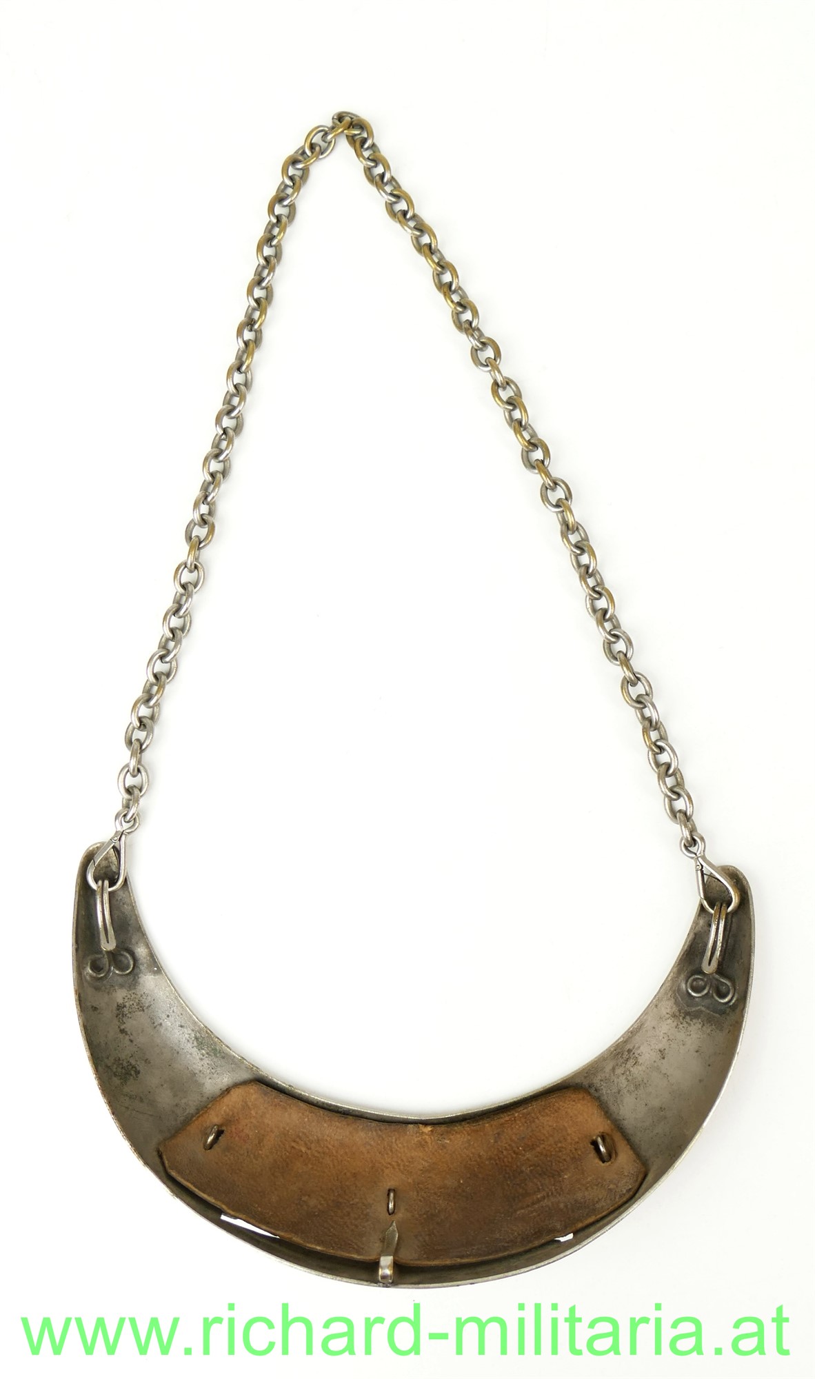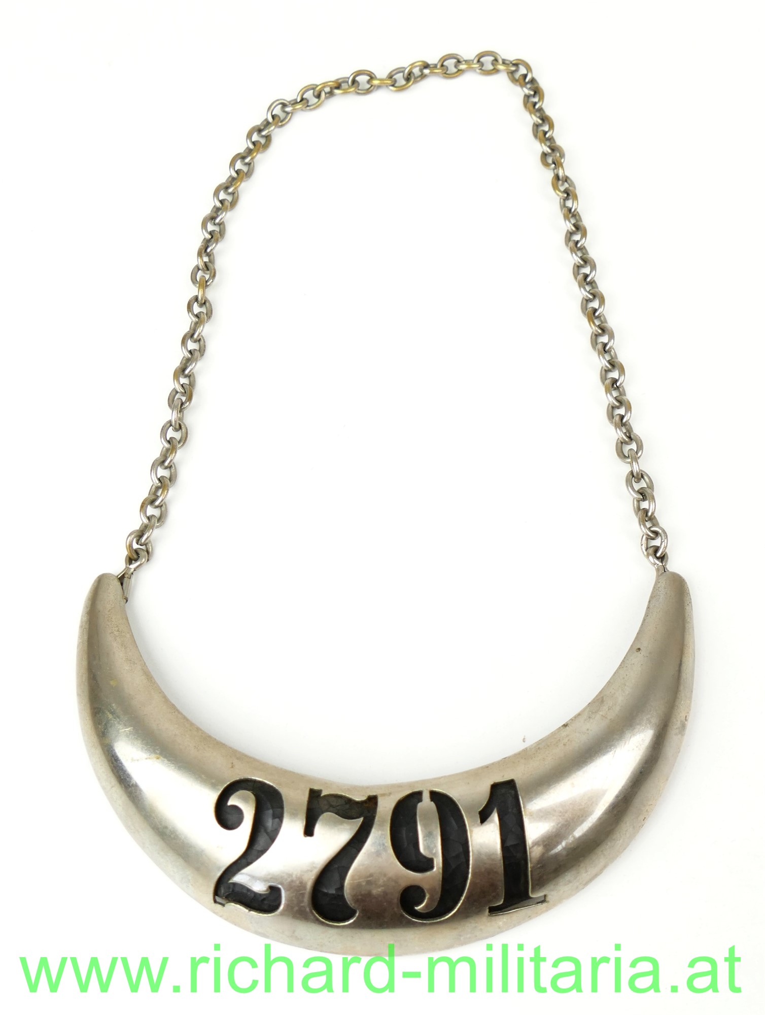 Ringkragen der k.k. Polizei; Tombak vernickelt und mit ausgestanzter Nummer "2791"; auf der Rückseite eingesetztes geschwärztes Leder hinter der Nummer; seitlich 2 Tragehaken für die Tragekette